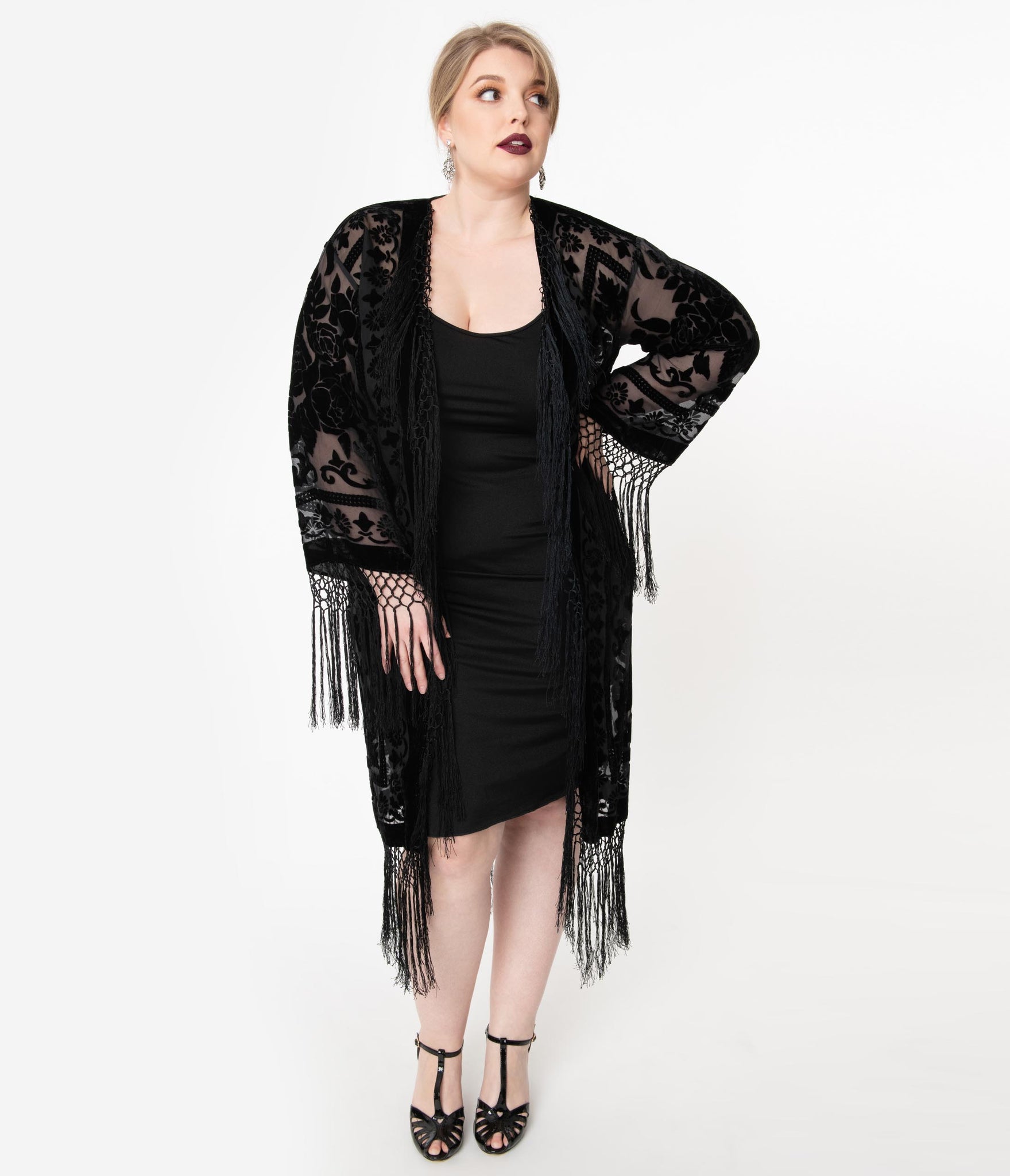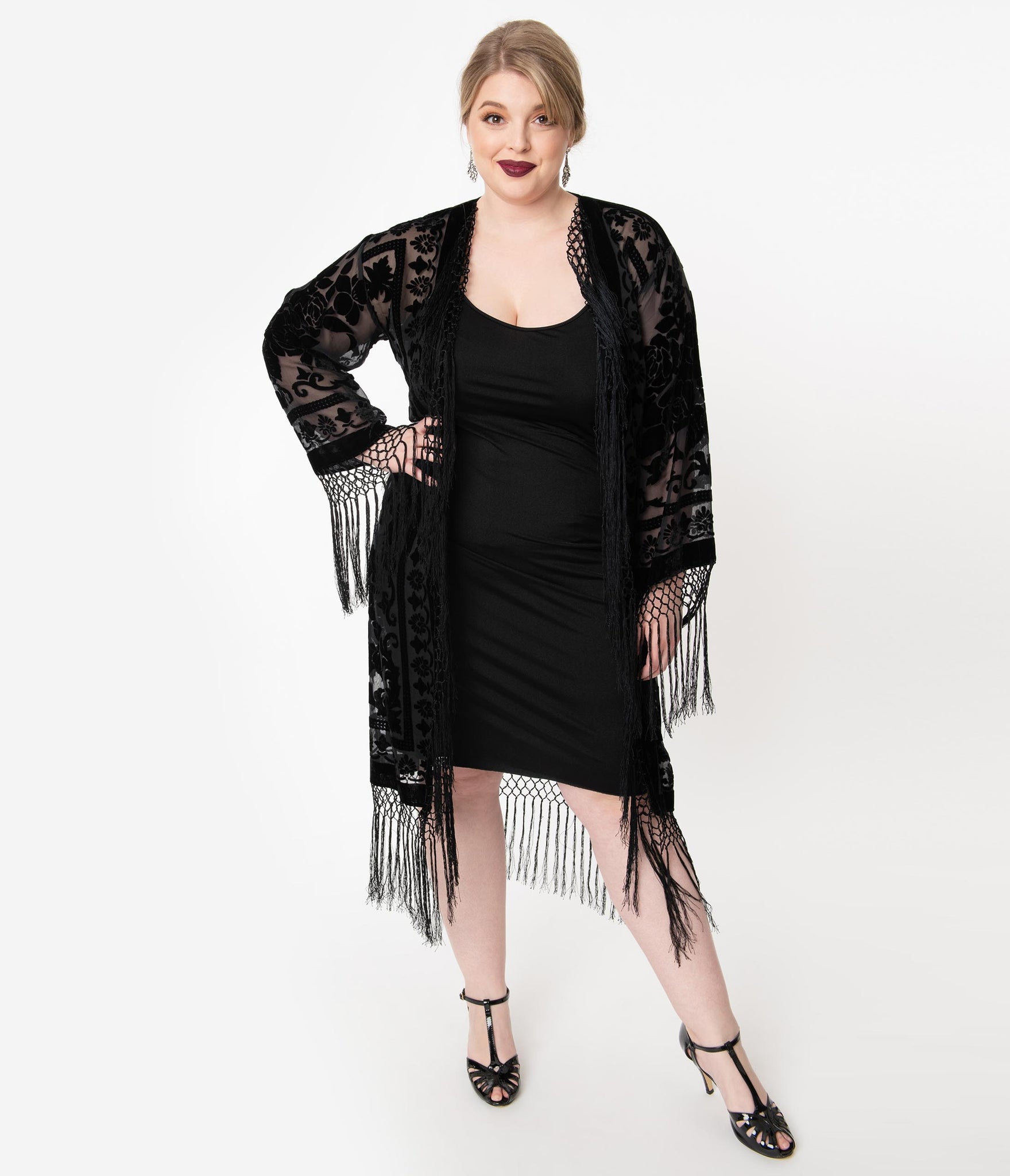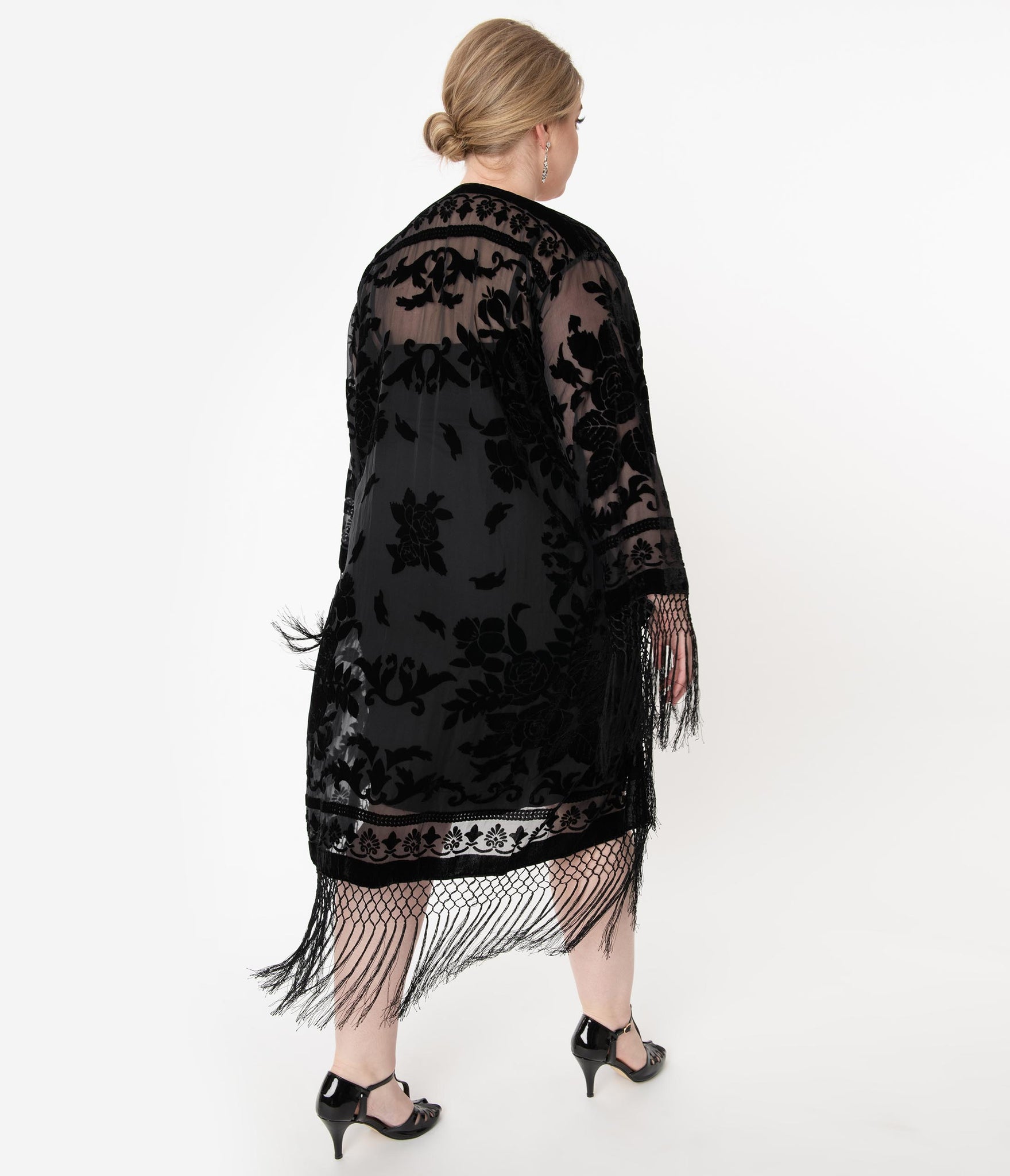 Radiant glamour! This elegant 1920s inspired scarf coat is a gorgeous black Devore velvet with gorgeous deco floral. With graceful long sleeves and diamond lattice working along the hem and cuffs, and subtle tassels throughout. Available while supplies last.