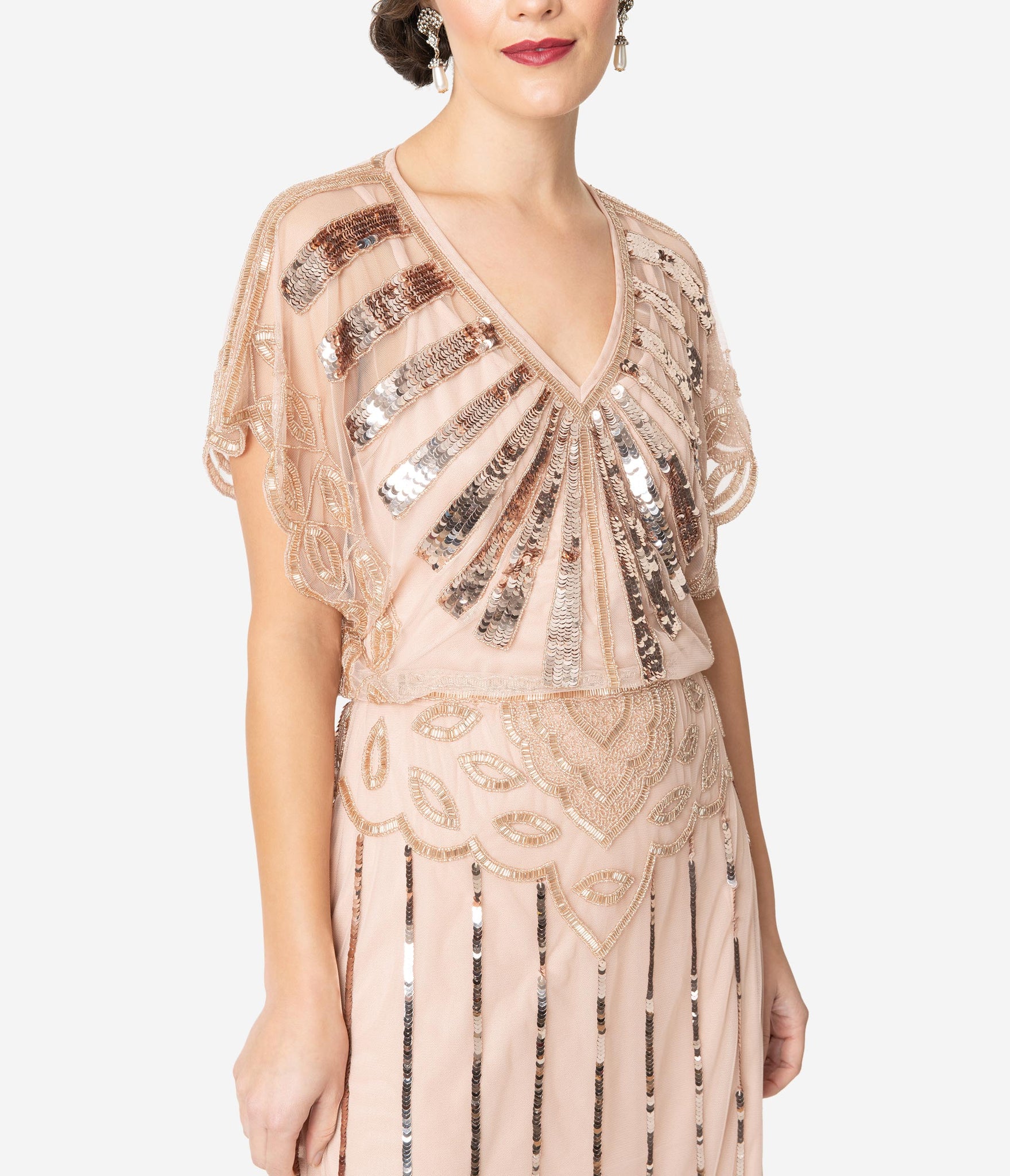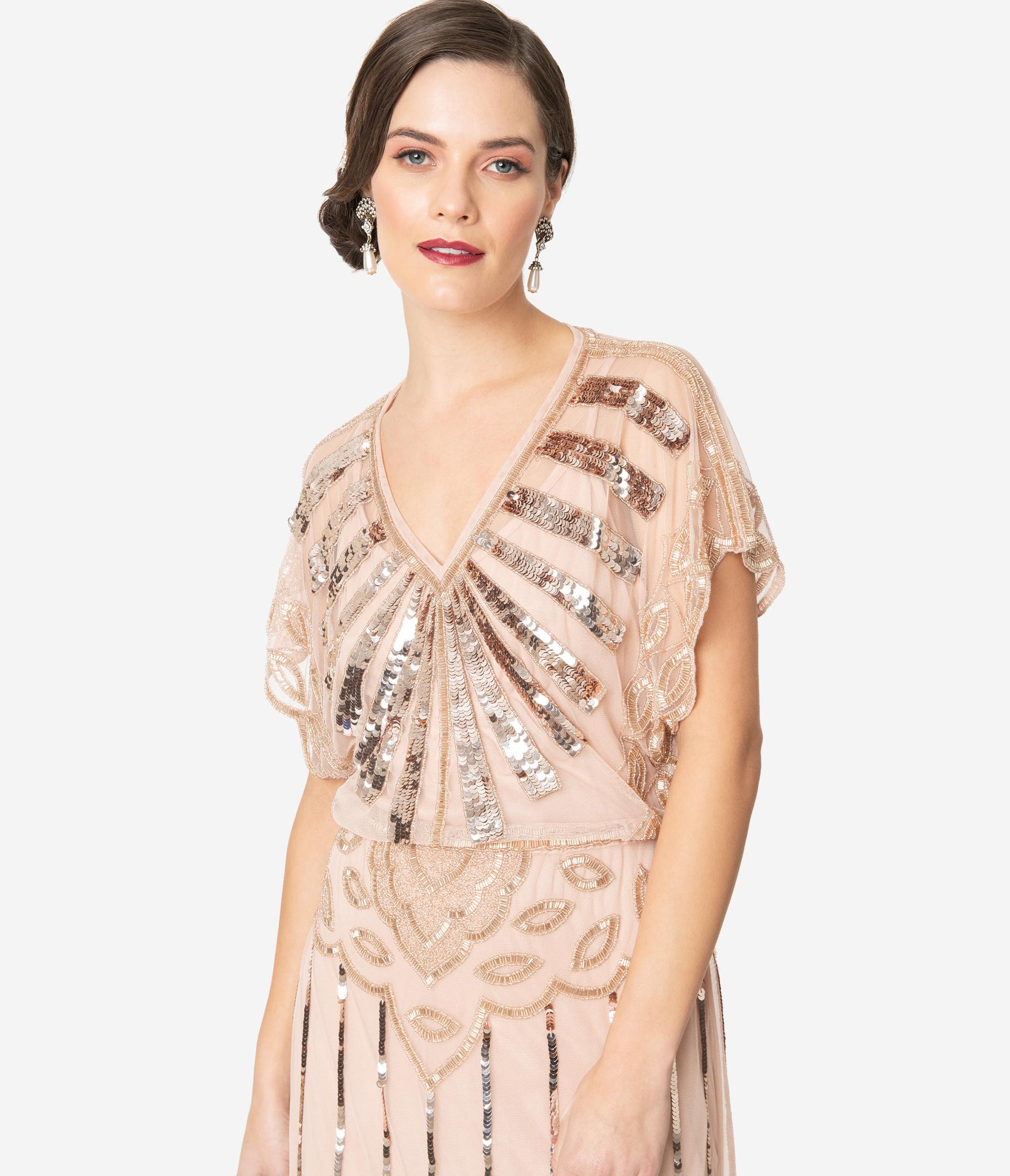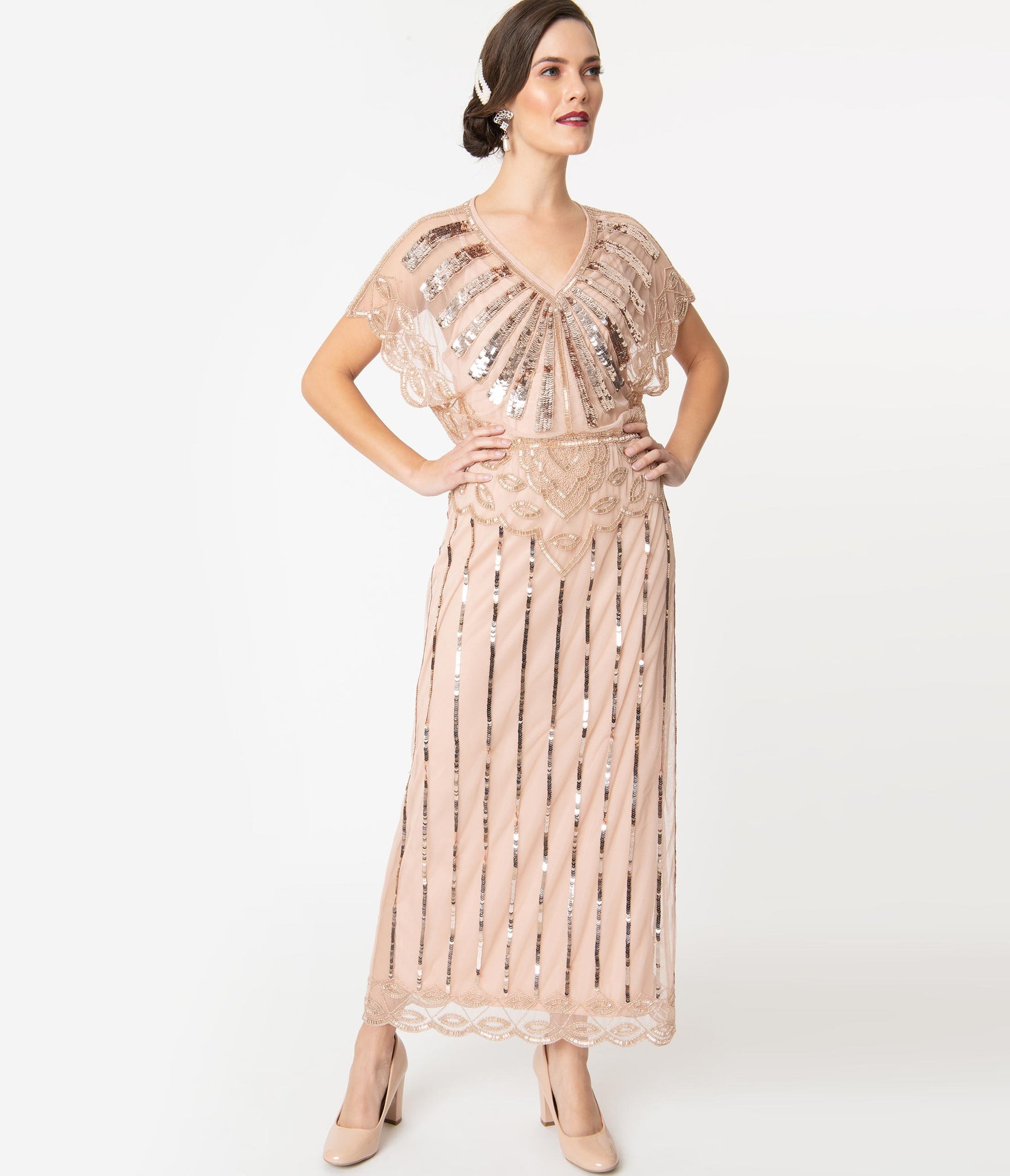 Let us know when you’ve popped your eyes back in! This ornate blush pink flapper dress exudes 1920s enchantment with an intricately beaded mesh, layered over a matching slip. With impressive swaths of deco bursts and teardrops, a classic v-neckline and open cap sleeve design, this vintage maxi dress is a bona fide head turner. Prepare for flapper fabulousness!