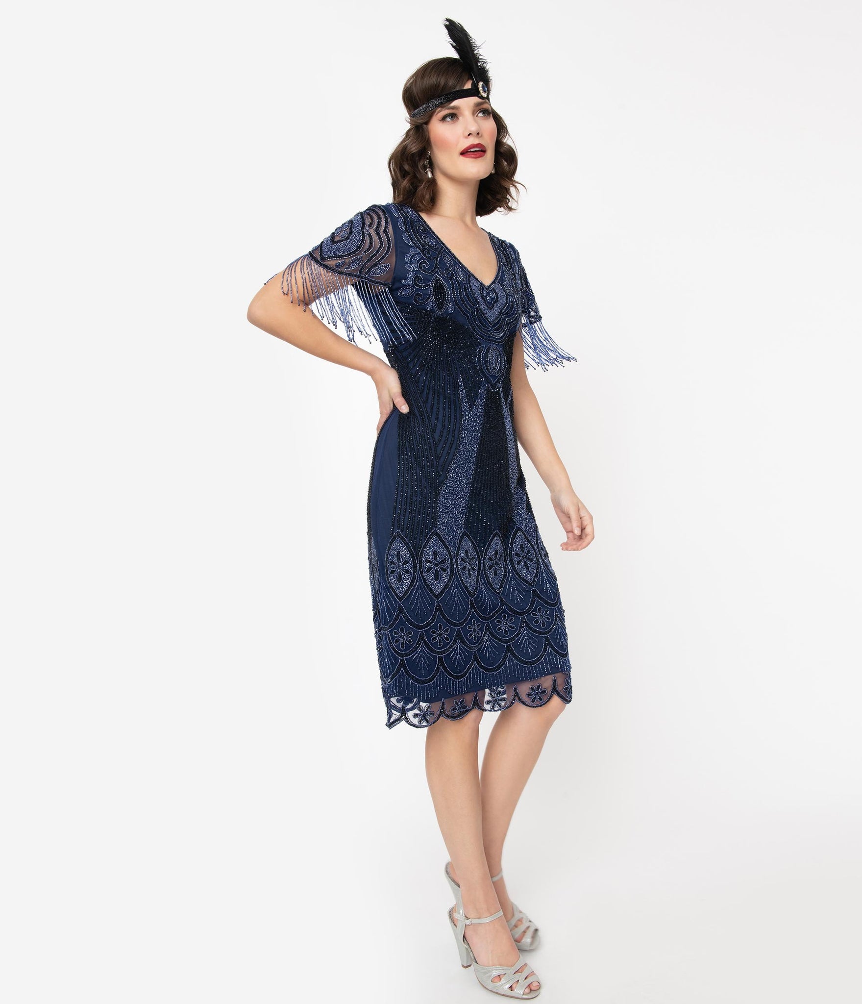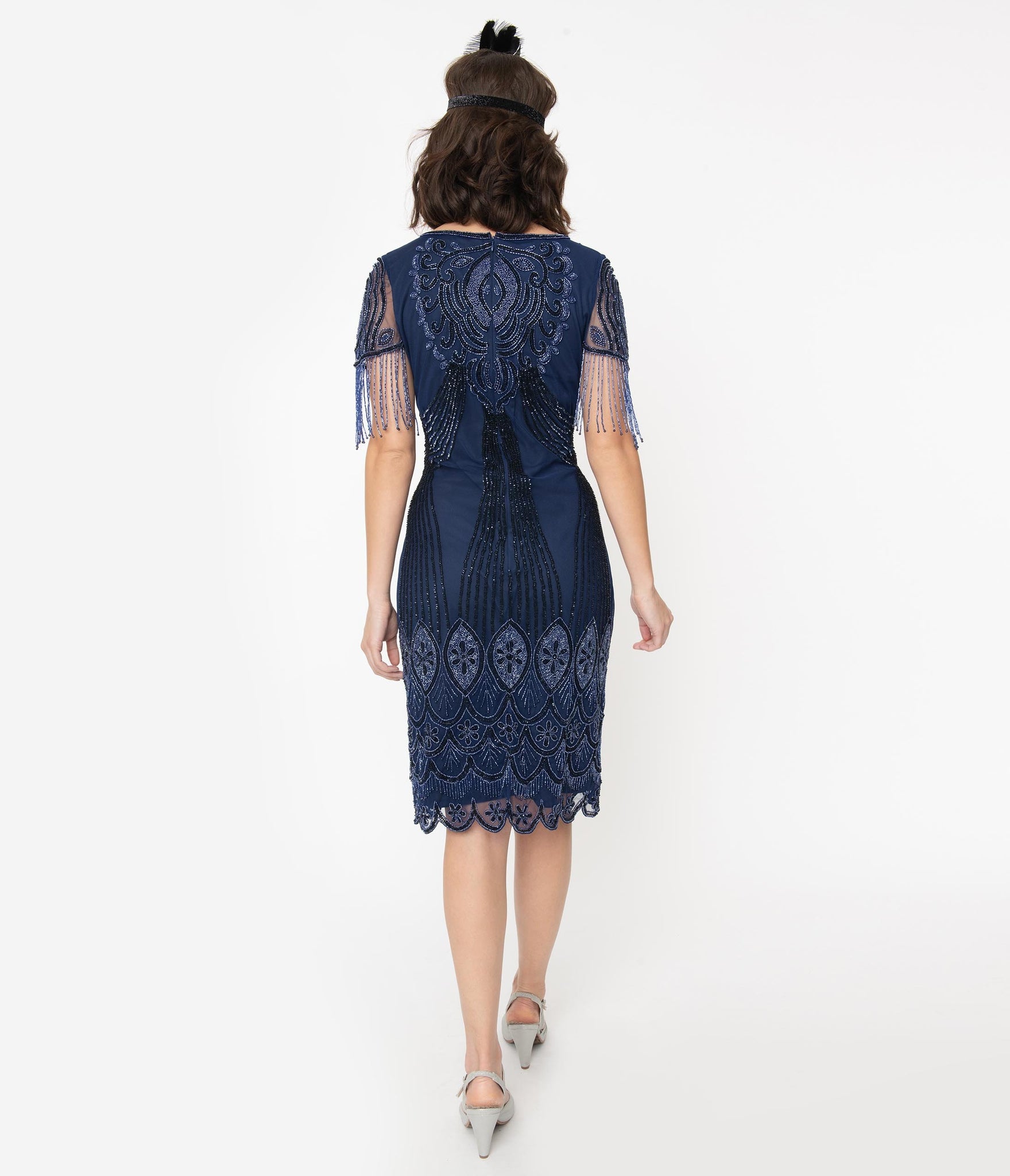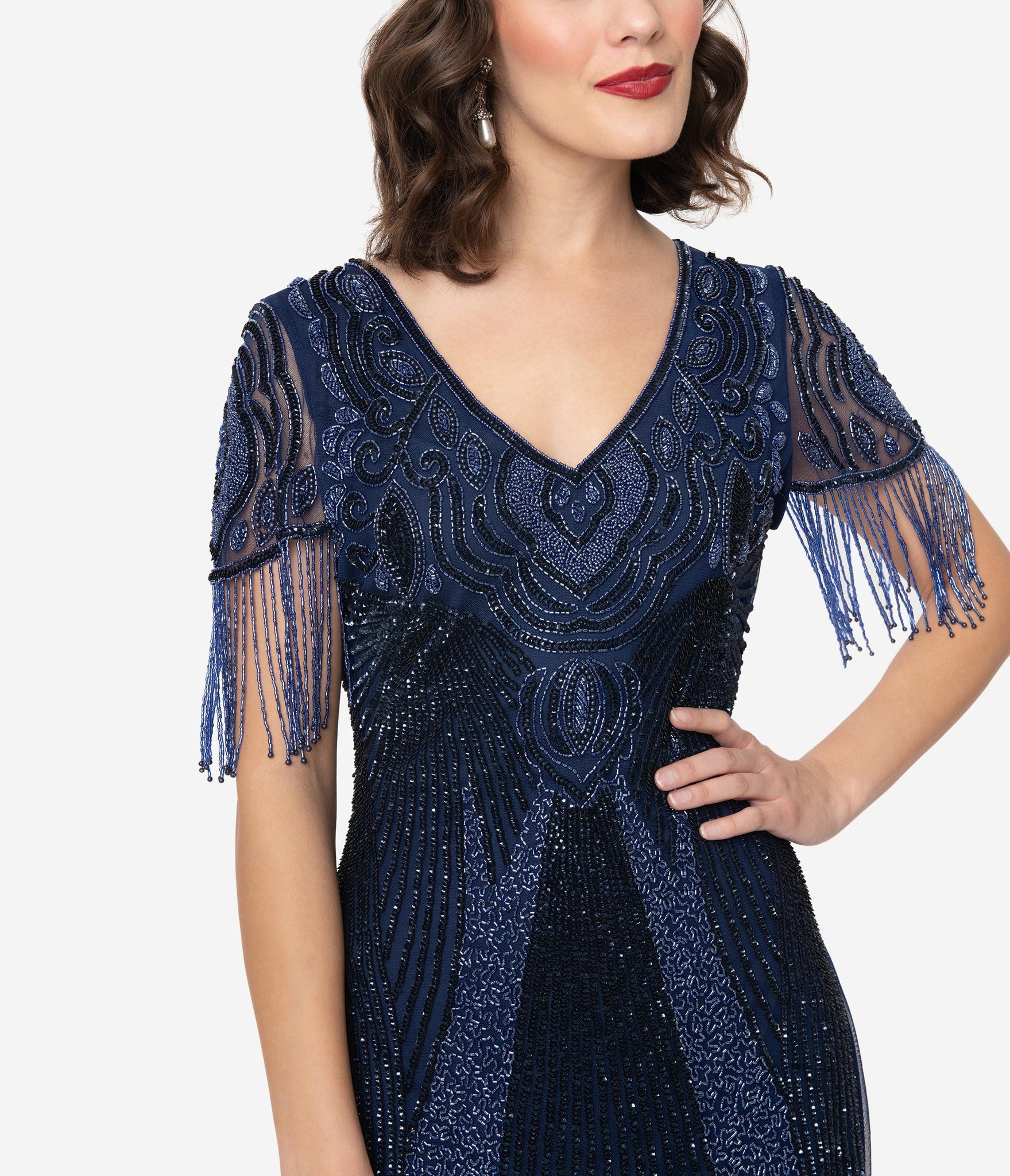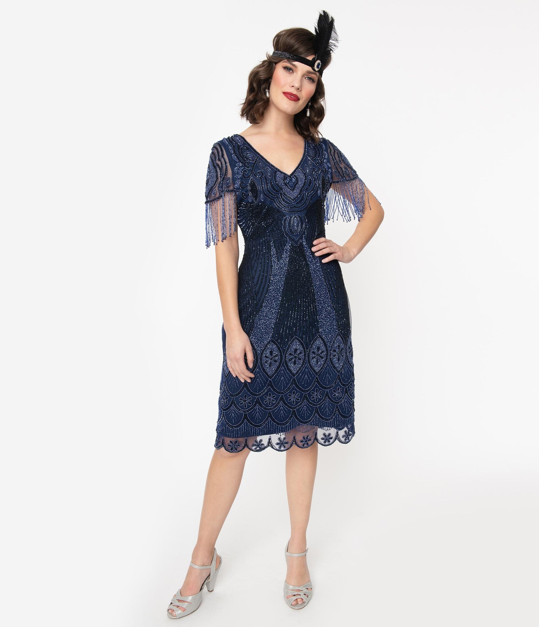Fueled by starlight and gin, dears! A stunning flapper dress for an evening of splendor, the Marta Dress is a 1920s dream with deco navy blue beading and sequins throughout the sheer navy blue mesh. The elegant V-neckline is framed by charming cap sleeves dancing with beaded fringe while the silhouette cascades to a scalloped hem over a navy blue slip. Dance your cares away!