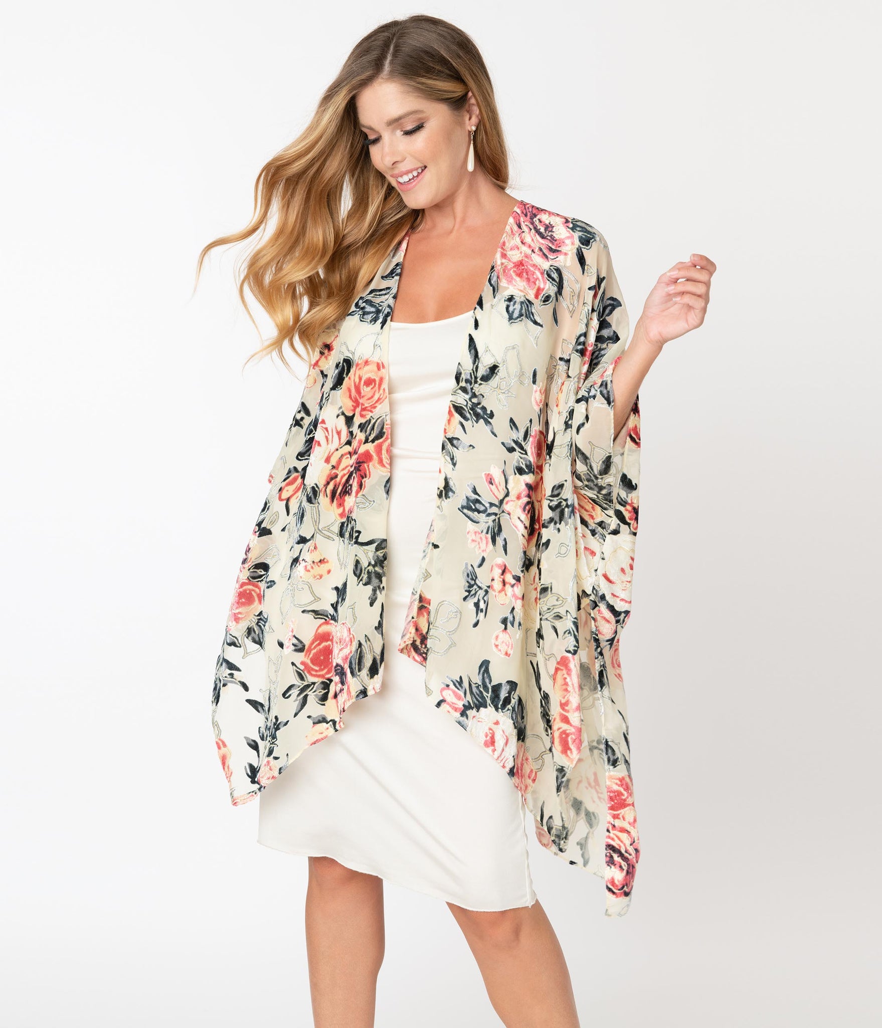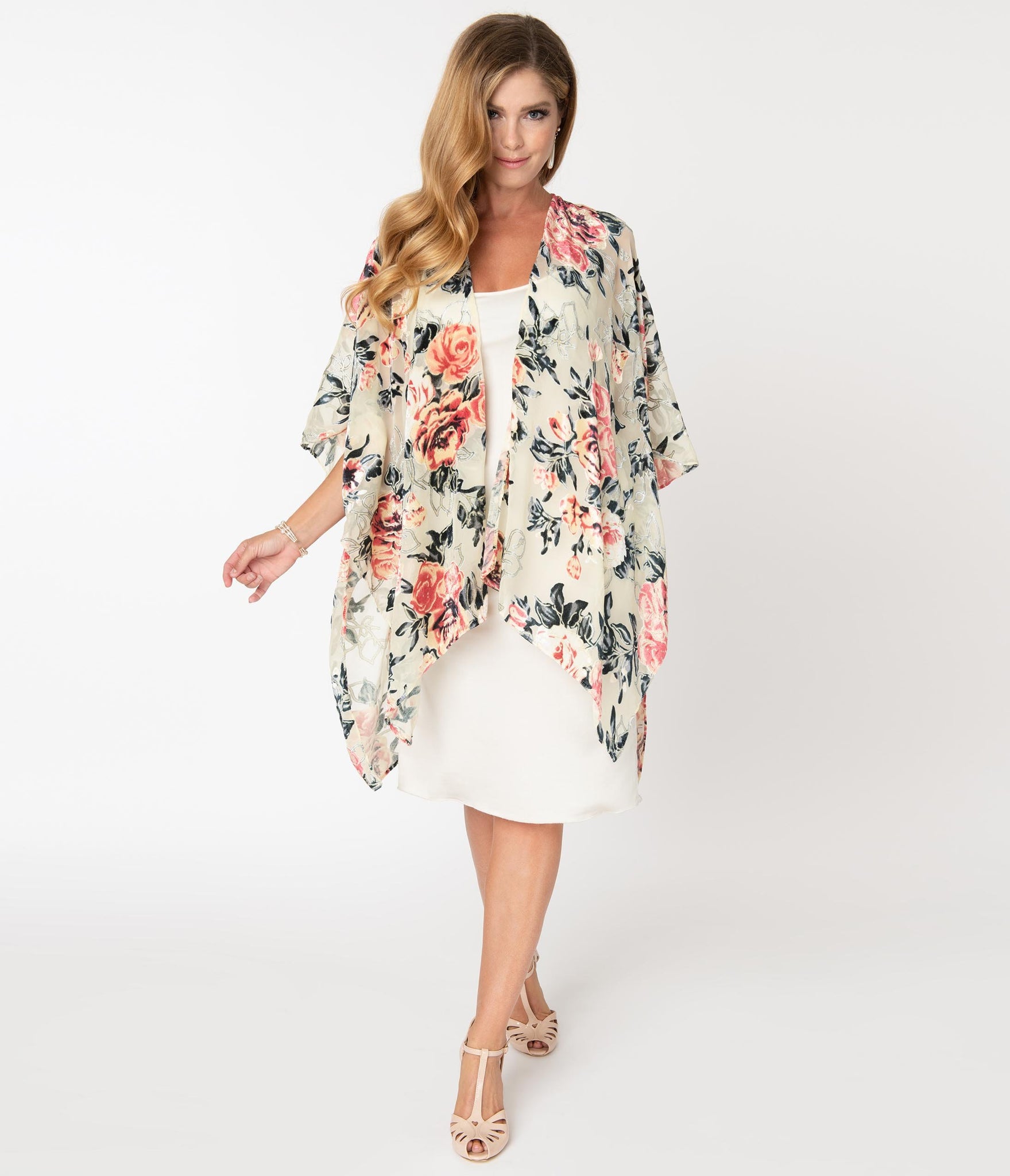 Sweet and delectable, this vintage style kimono is an incredible lightweight confection in a beautiful beige devore velvet that dances with a charming pink floral and metallic threading for a sparkling accent throughout. The open front and open sleeves provide an easy coverup to your jazz era ensemble!