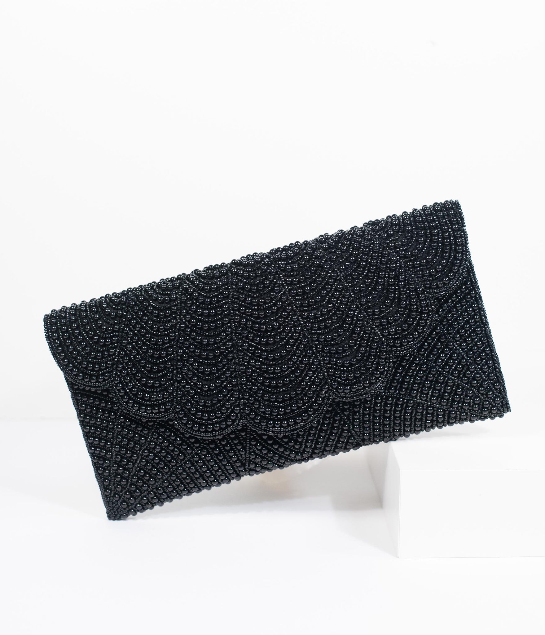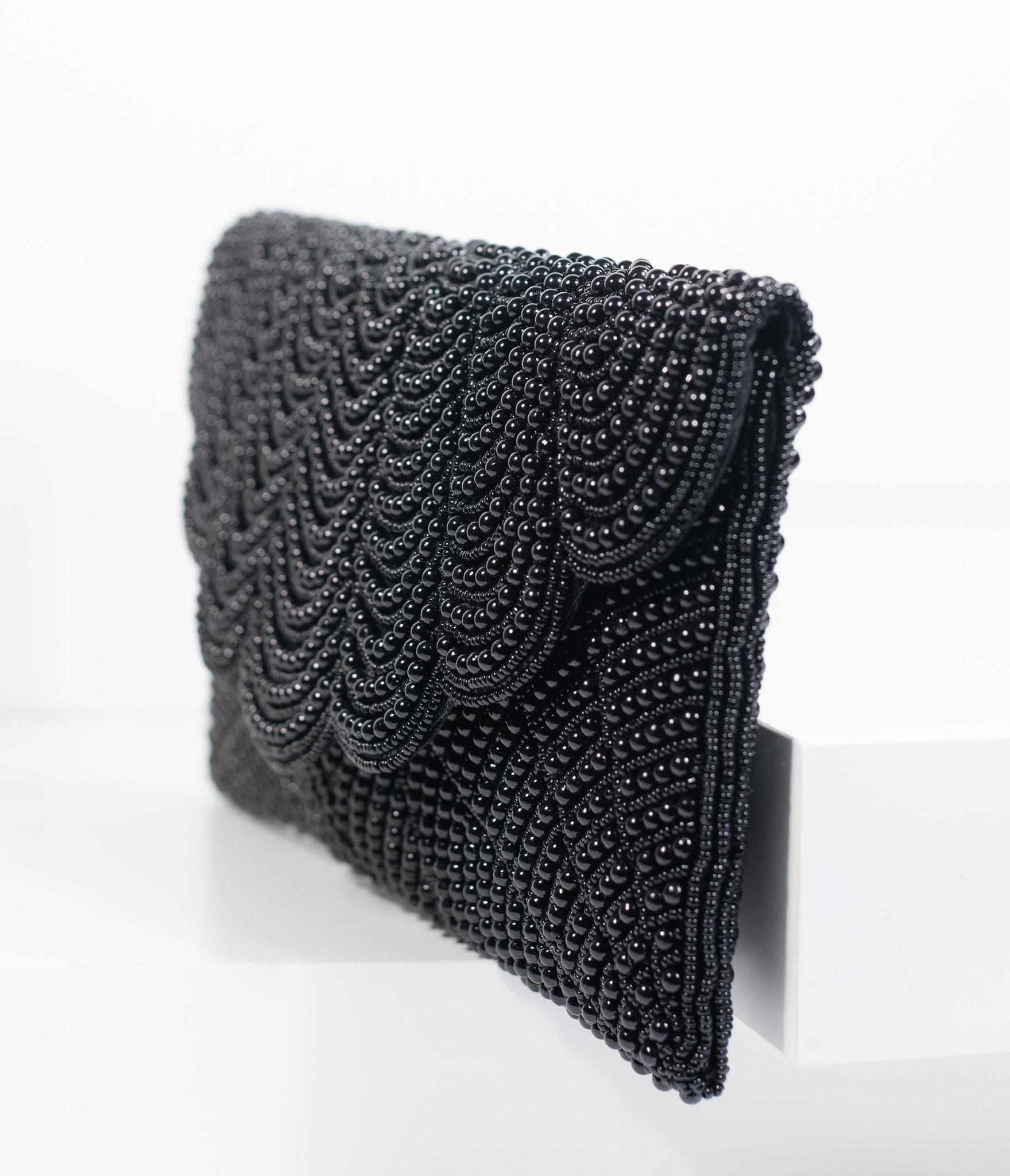 Outfit your glamorous ensemble with a bit of sparkle! This marvelous beaded envelope clutch features a beautiful array of black beaded patterns. The magnetic fold over closure opens to an inner slip pocket and fabric interior. Complete with a thin, removable chain shoulder strap to keep this stunning partner at your side!