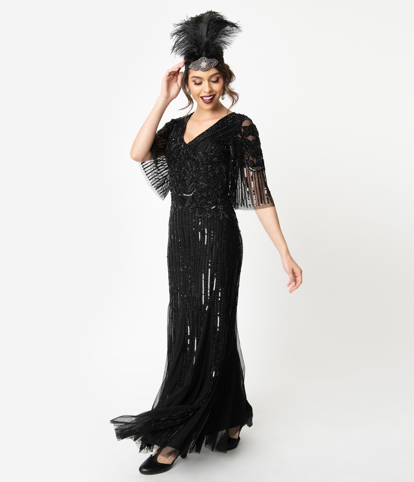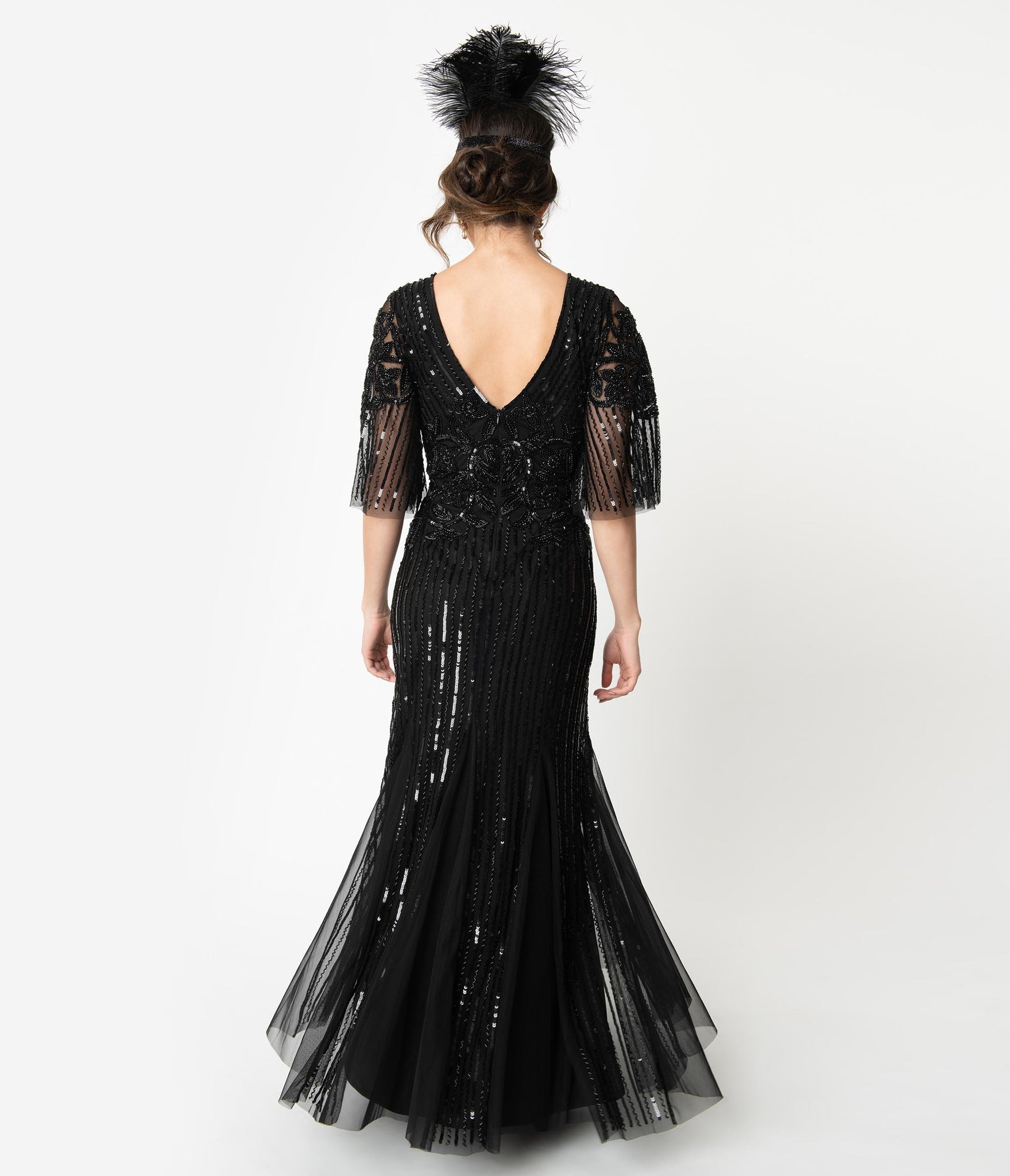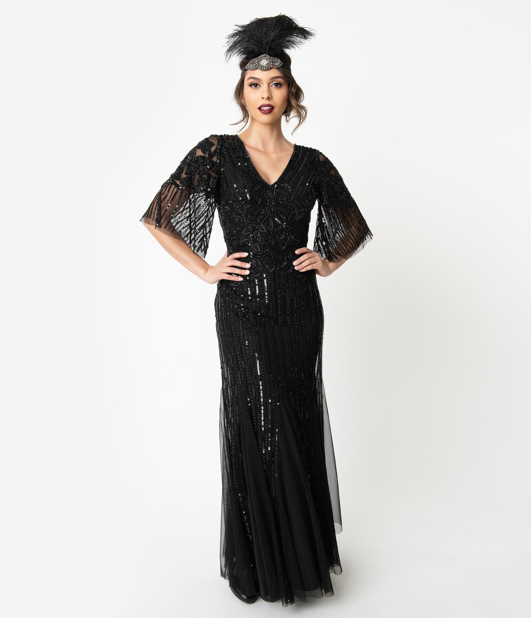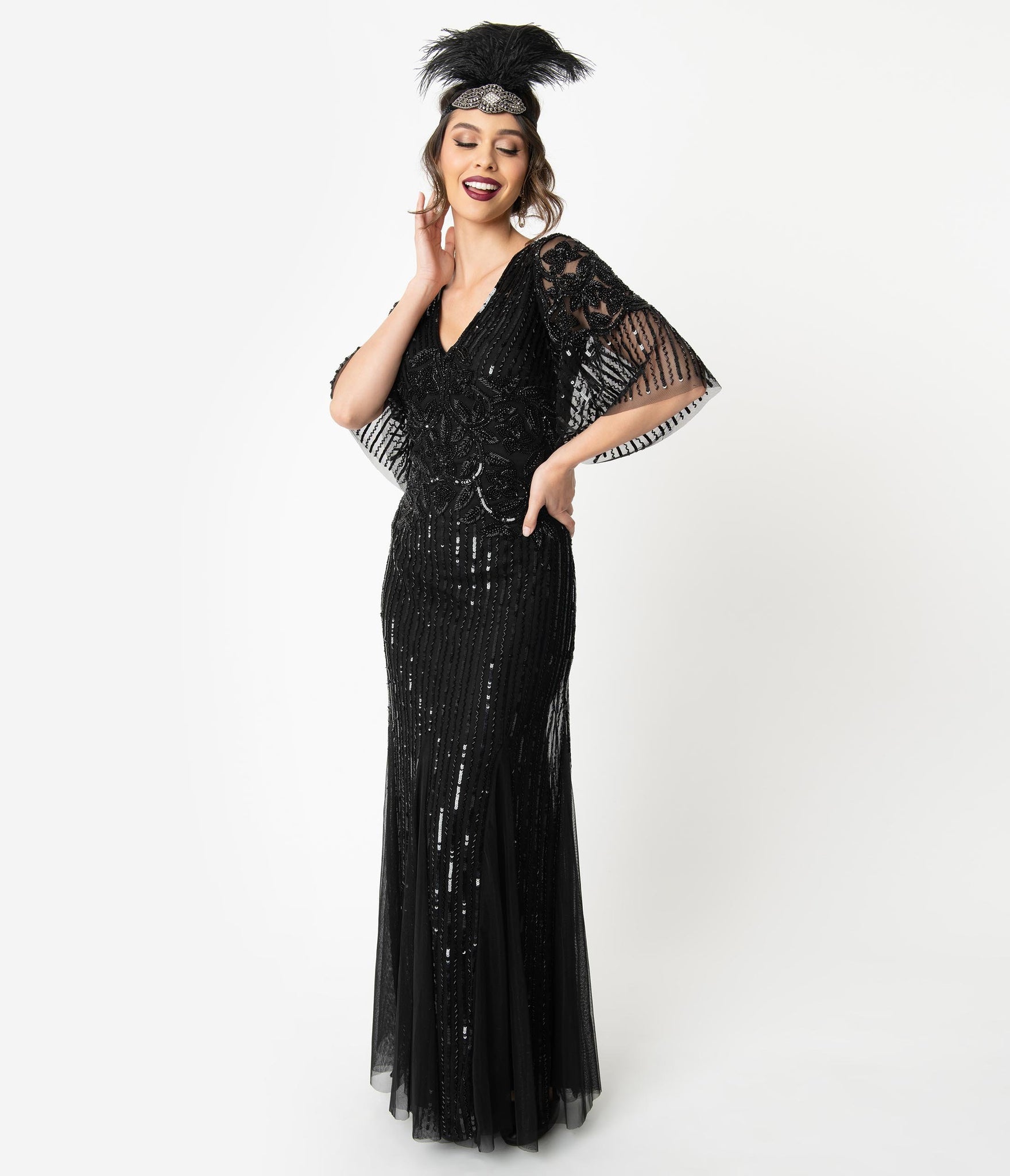 Swept up in the glam, dames! A marvelous maxi cocktail dress in gorgeous flapper inspired styling, this elegant black gown boasts twinkling black beads and sequins swirling through the black mesh overlay while graceful butterfly sleeves frame the sultry V-neckline. Gathered soft tulle hang in delightful godets as the black lining, molded cups, and back zipper keep you comfortable. Shimmy under moonlight!