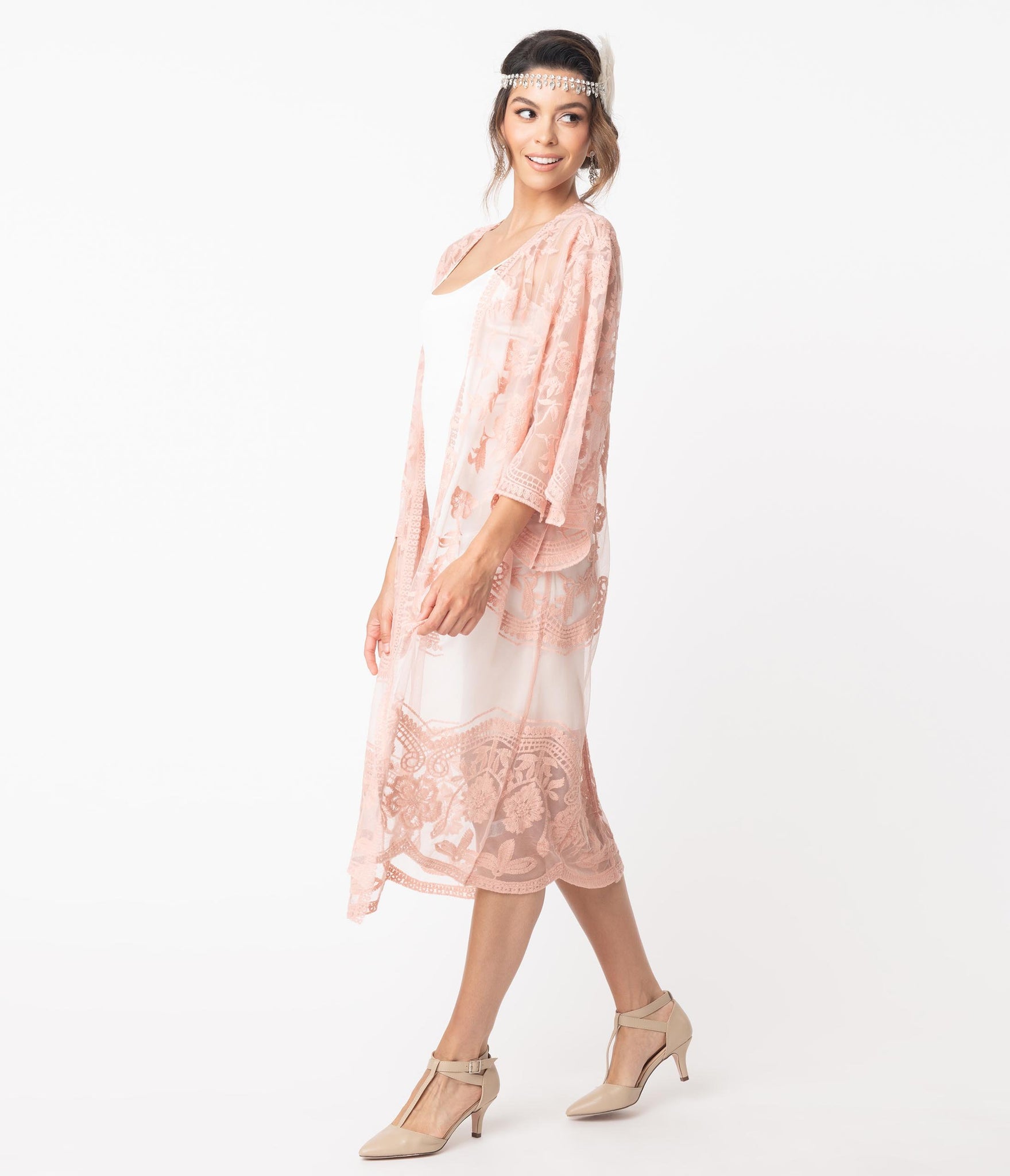 Feminine grace, dolls! A fabulous scarf coat for your flapper ensemble, this sheer piece boasts light pink crochet lace embellishment throughout the long open design. Complete with breezy three-quarter length sleeves, don’t forget to pair with gin, darling!