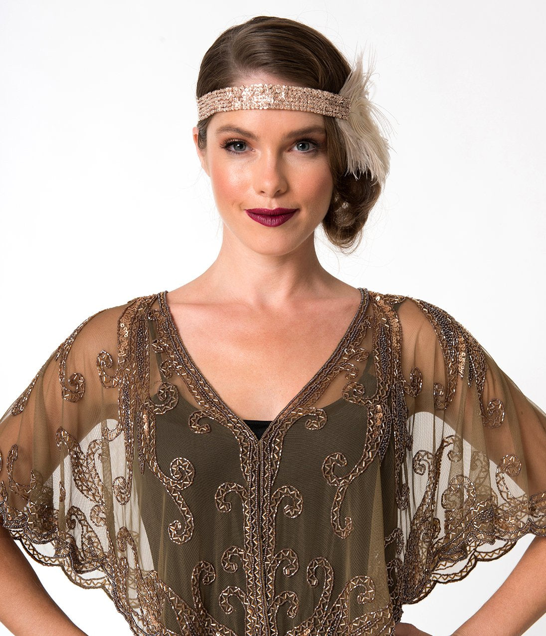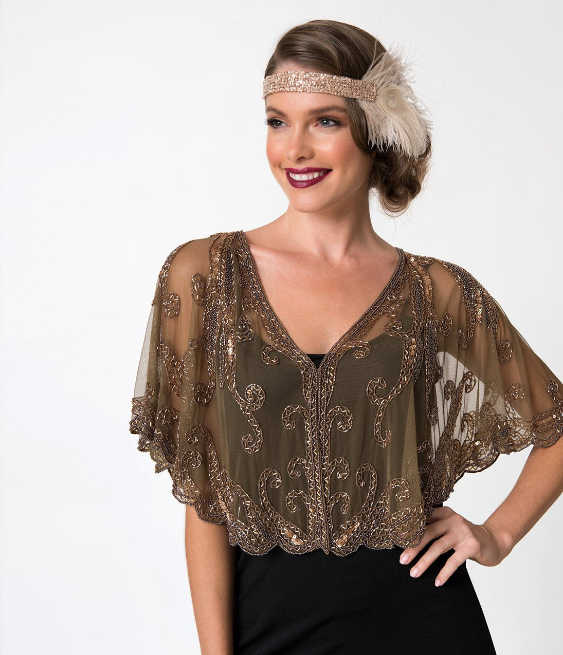 You’re timeless, darling! Surround yourself in radiance with this 1920s inspired silhouette. An elegant soft brown sheer mesh lays delicately over your shoulders while elaborately beaded and sequined dusty rose gold accents flow around your curves. With a beaded scalloped edging and a hook and clasp at the front to keep you secure, you won’t be just making a statement, you’ll be glamorous for many years to come!