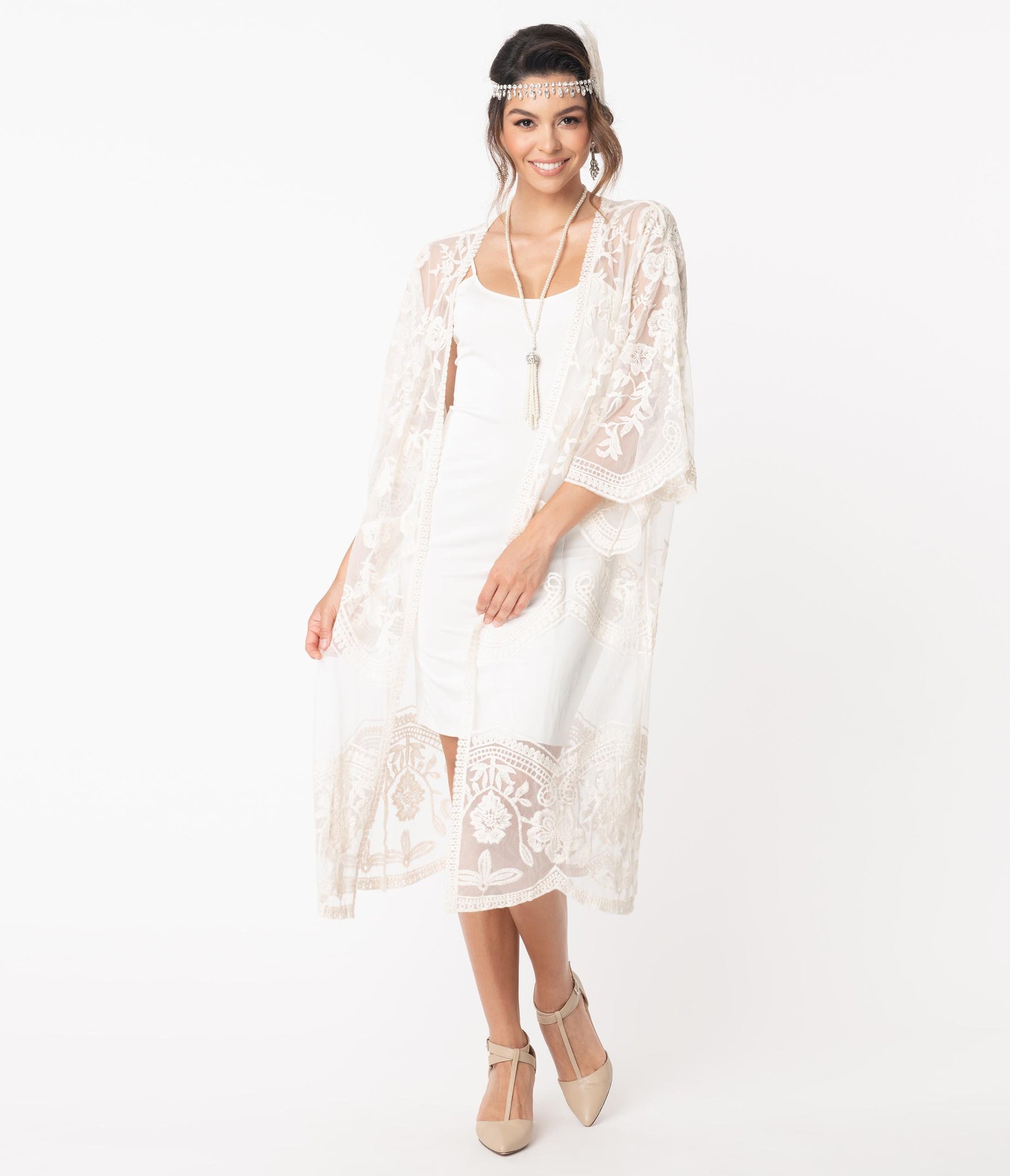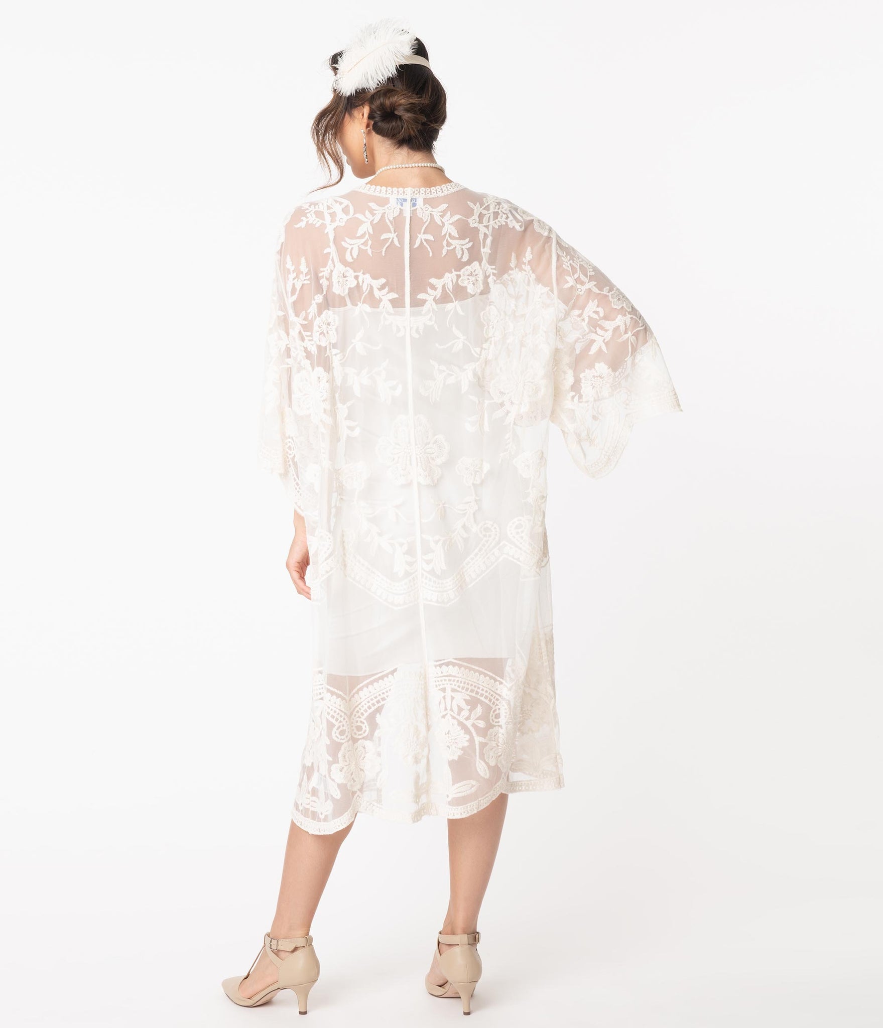 Feminine grace, dolls! A fabulous scarf coat for your flapper ensemble, this sheer piece boasts cream crochet lace embellishment throughout the long open design. Complete with breezy three-quarter length sleeves, don’t forget to pair with gin, darling! Available in sizes S/M-M/L while supplies last.