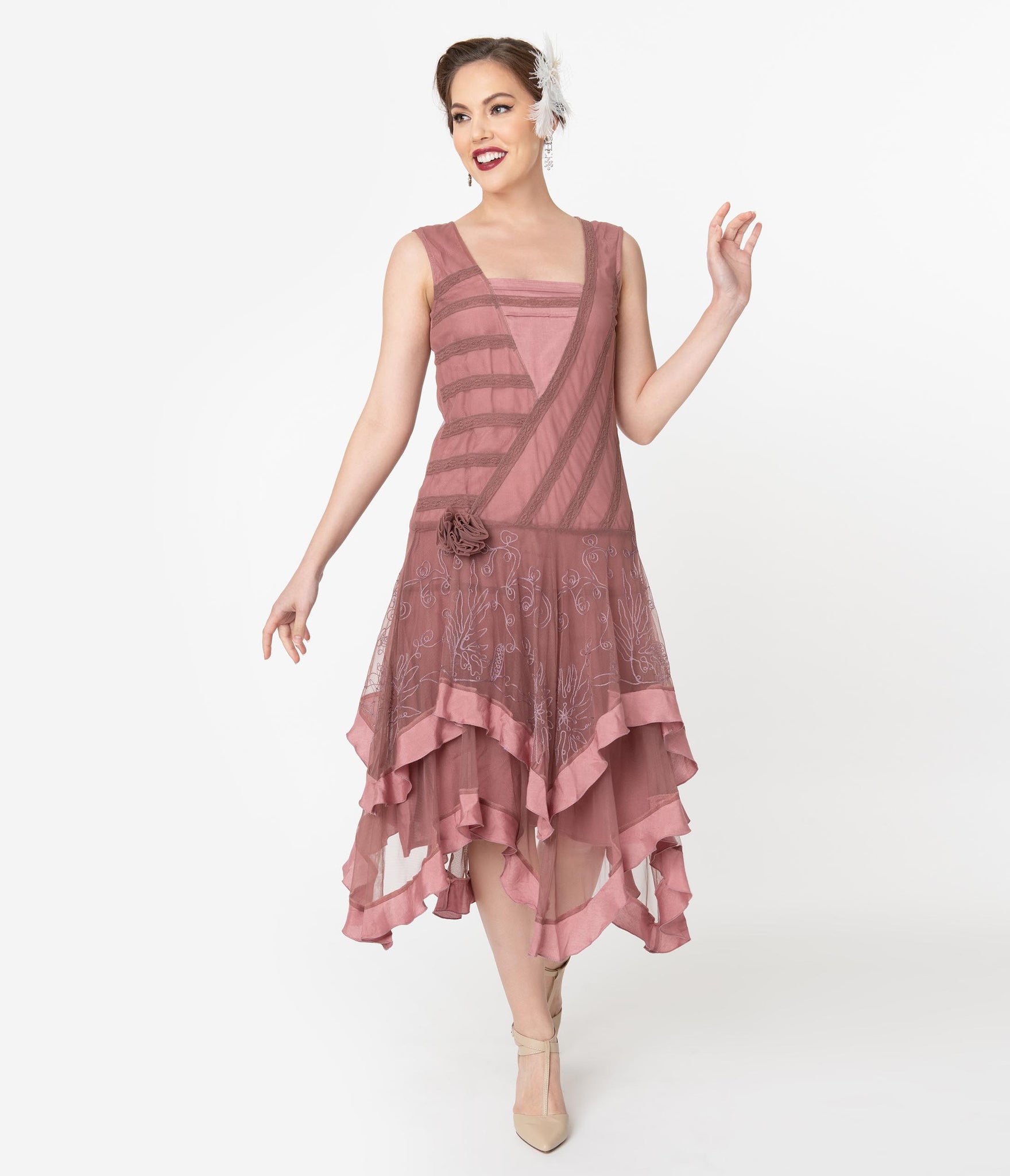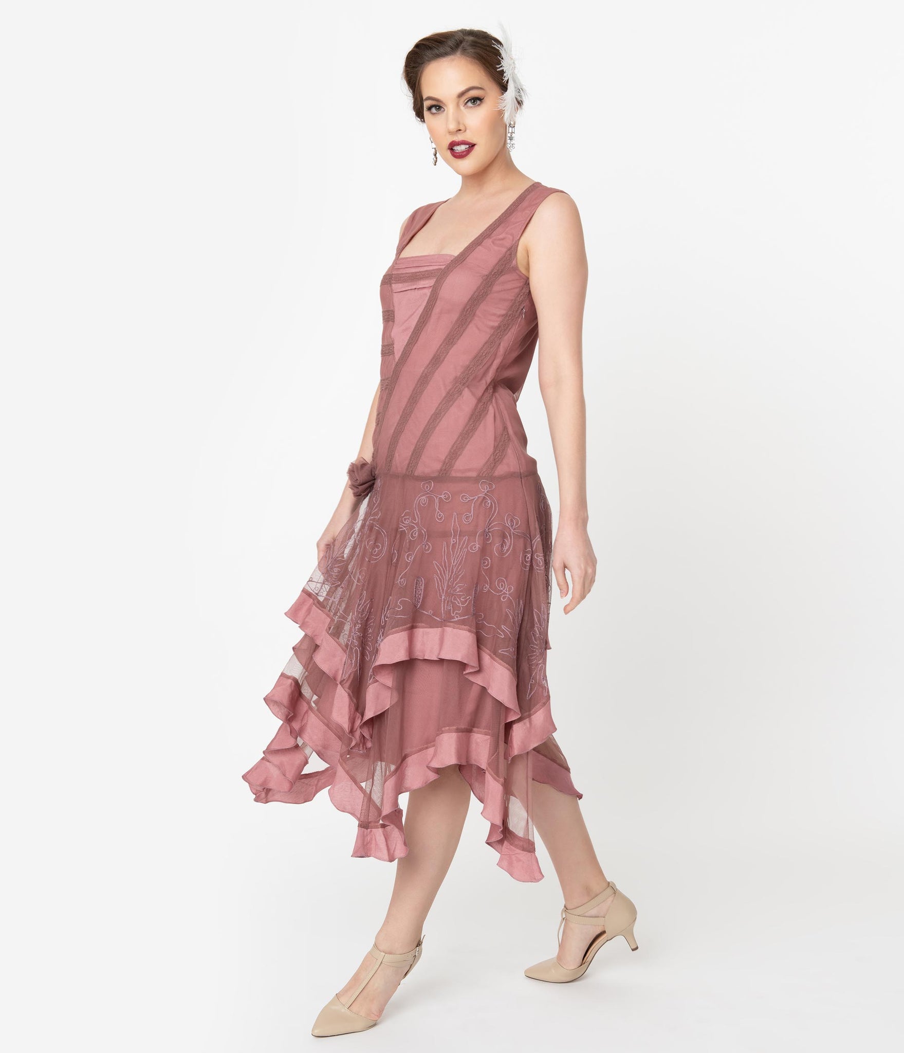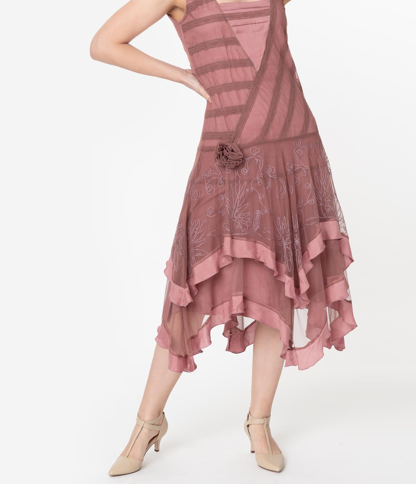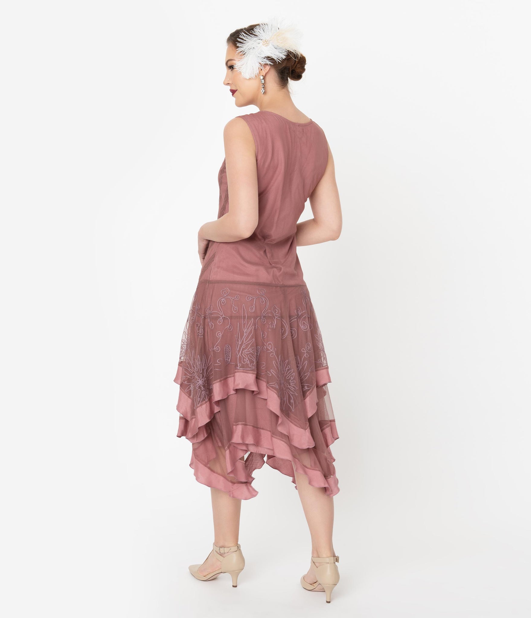 Feminine flapper flare, dames! This divine mauve pink vintage dress features gorgeous 1920s stylings throughout the lightweight mesh layers. The sleeveless design frames a square neckline while the sweeping asymmetrical lace accents cascade to a dropped waist, embellished with a sweet mesh rose. The sophisticated skirt boasts asymmetrical tiers that dance with embroidered embellishments over a soft lining. Complete with a side zipper, channeling the twenties is as easy as one, two, gin!