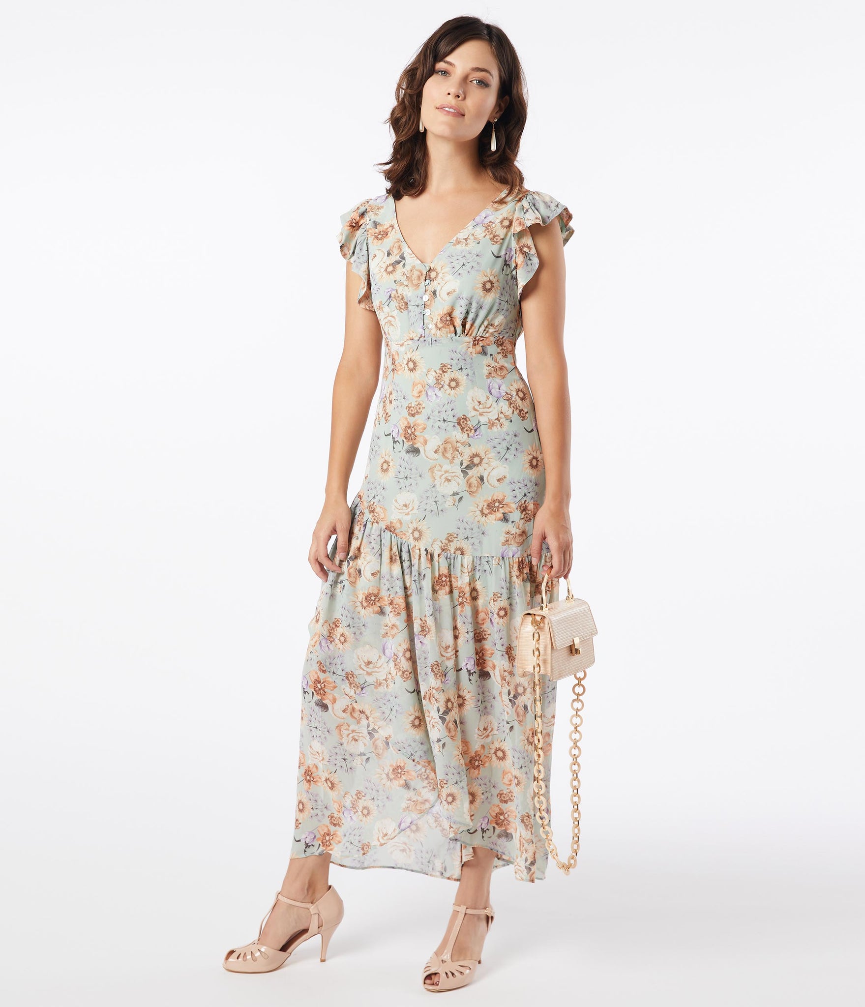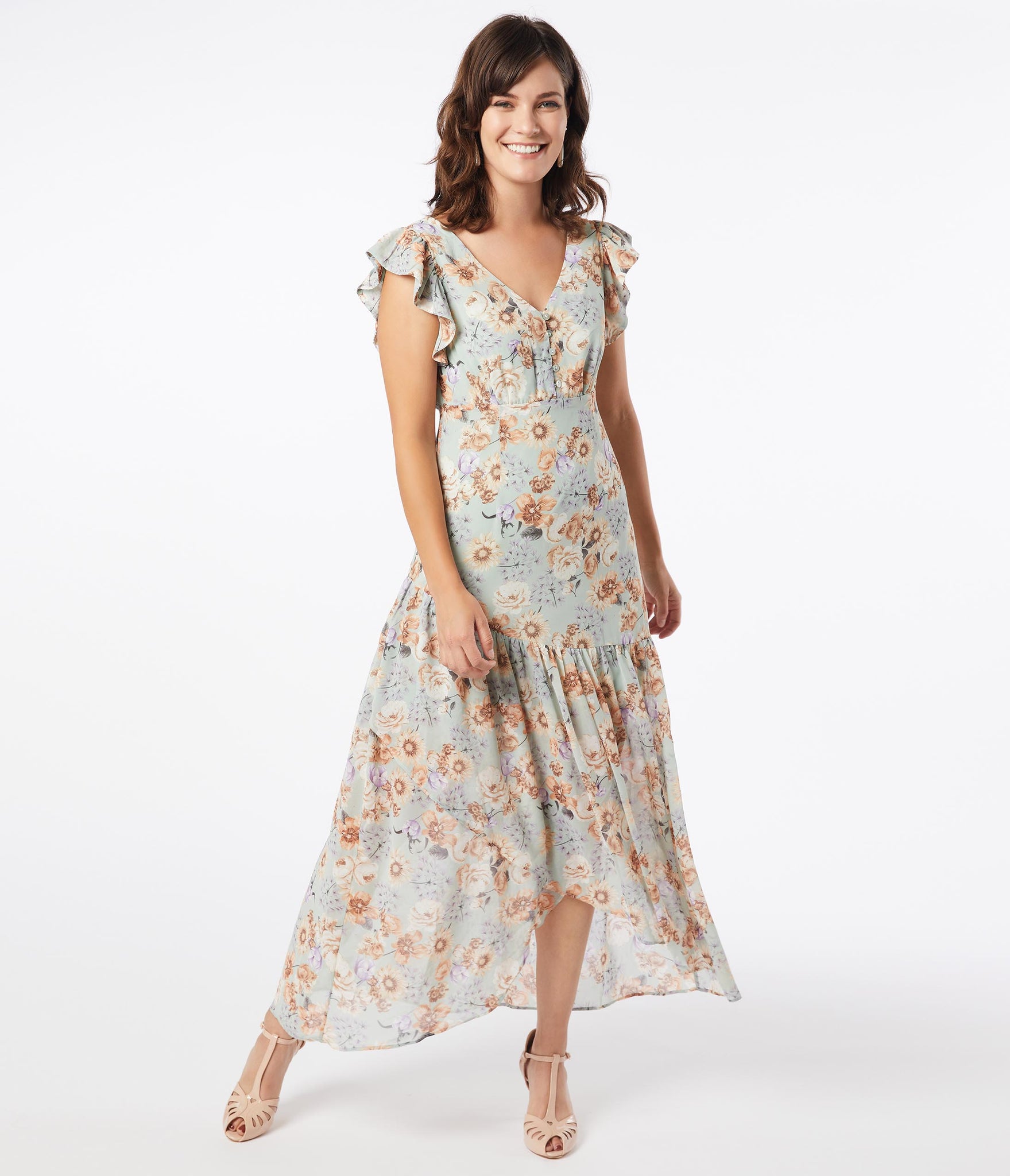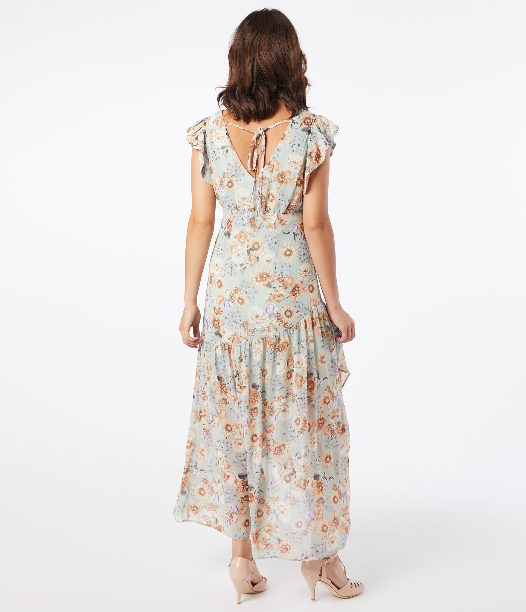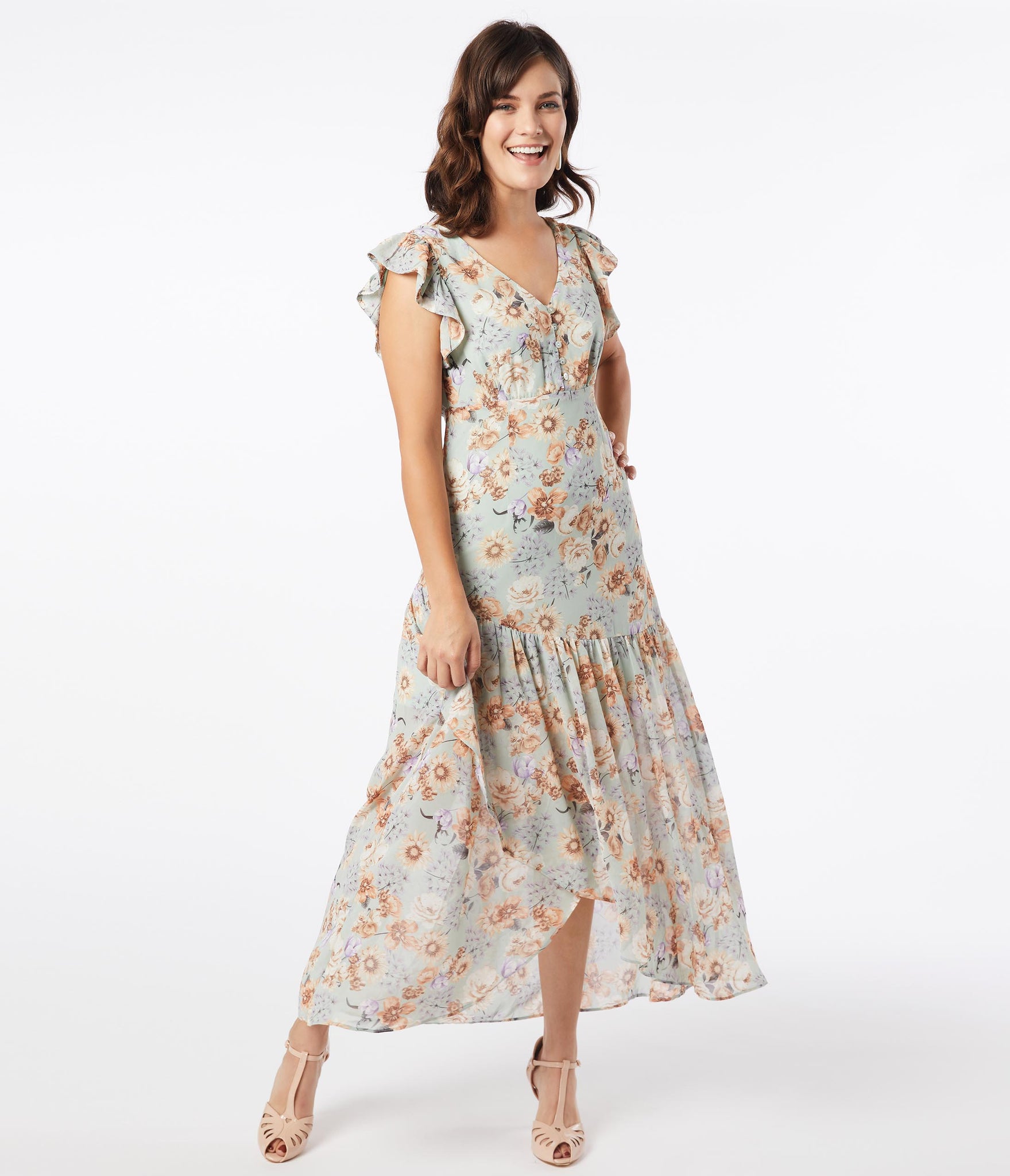 Vintage romance awaits, dears! This dreamy maxi dress is styled in a stunning 1920s day dress silhouette and features a breathtaking floral print throughout the light sage background. The sultry V-neckline is centered by a dainty button up front, leading to a high seamed waistline and framed by sweet ruffled cap sleeves. The paneled waist and back tie flatter your figure while the sweeping skirt is accented with an asymmetrical gathered seam that wraps around your knees!