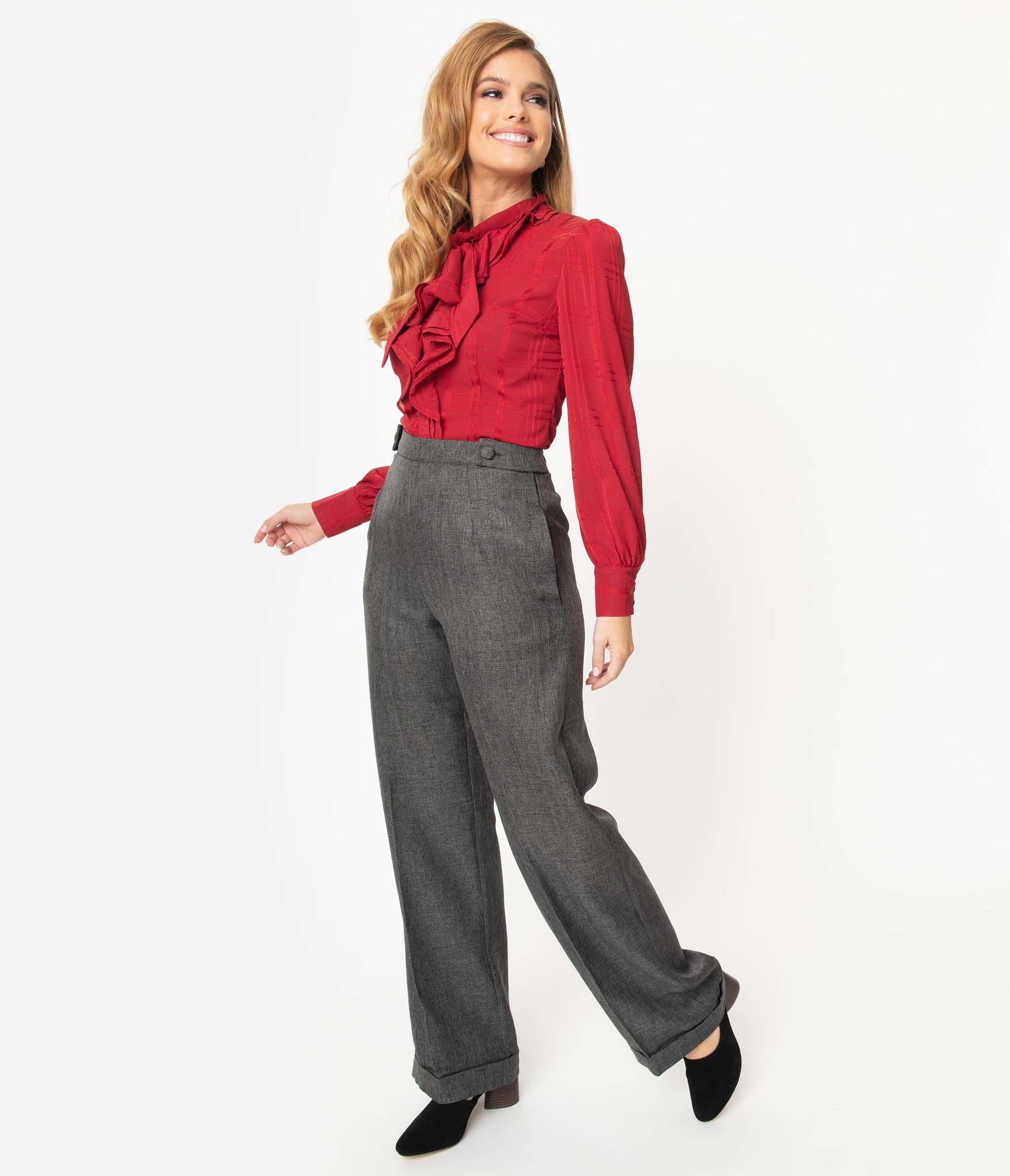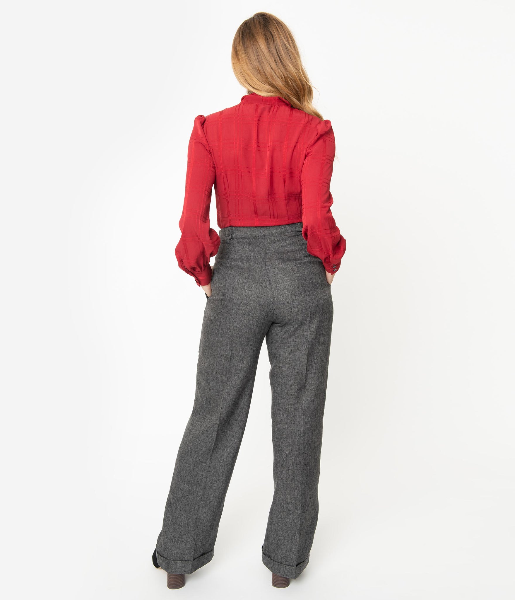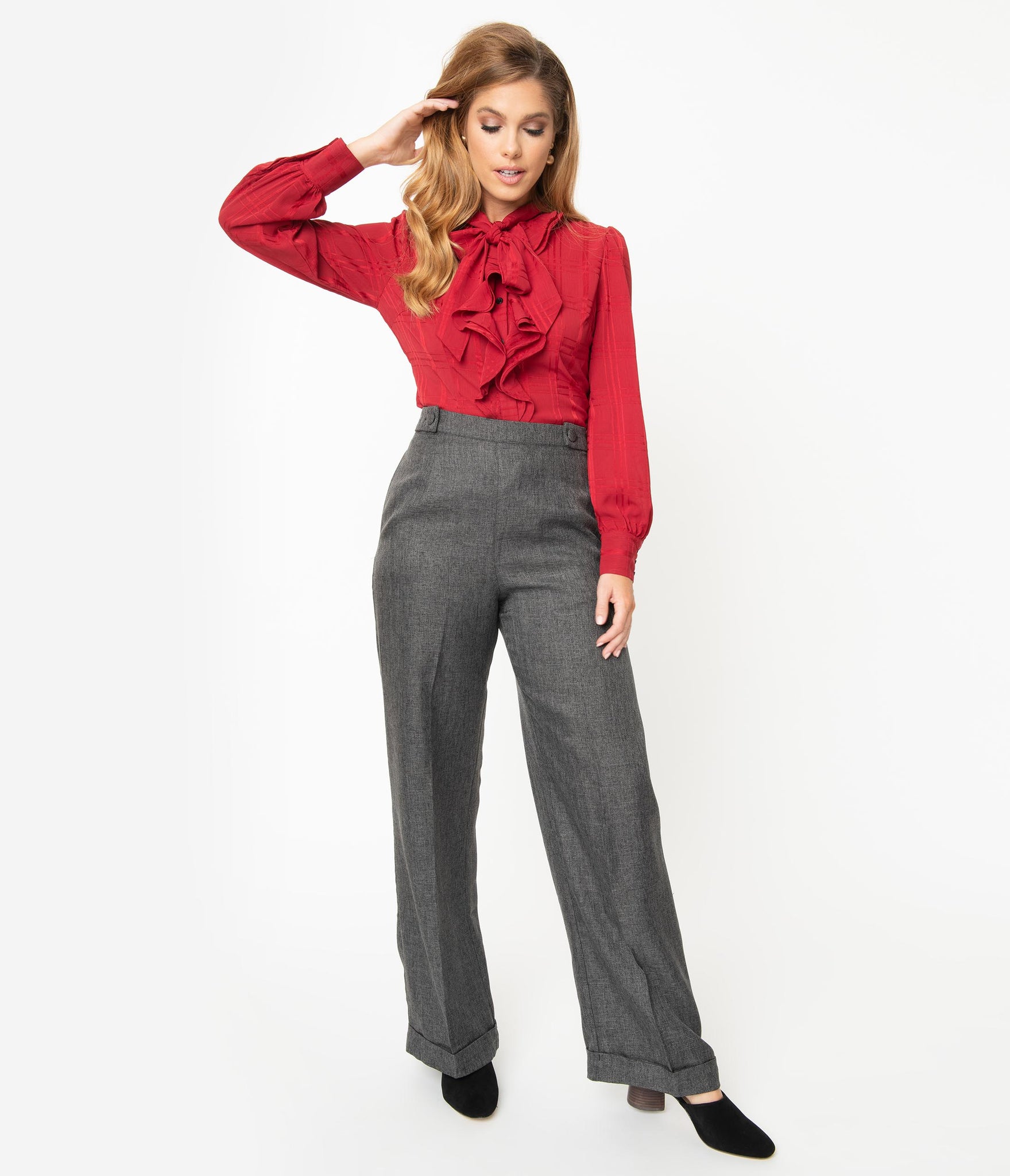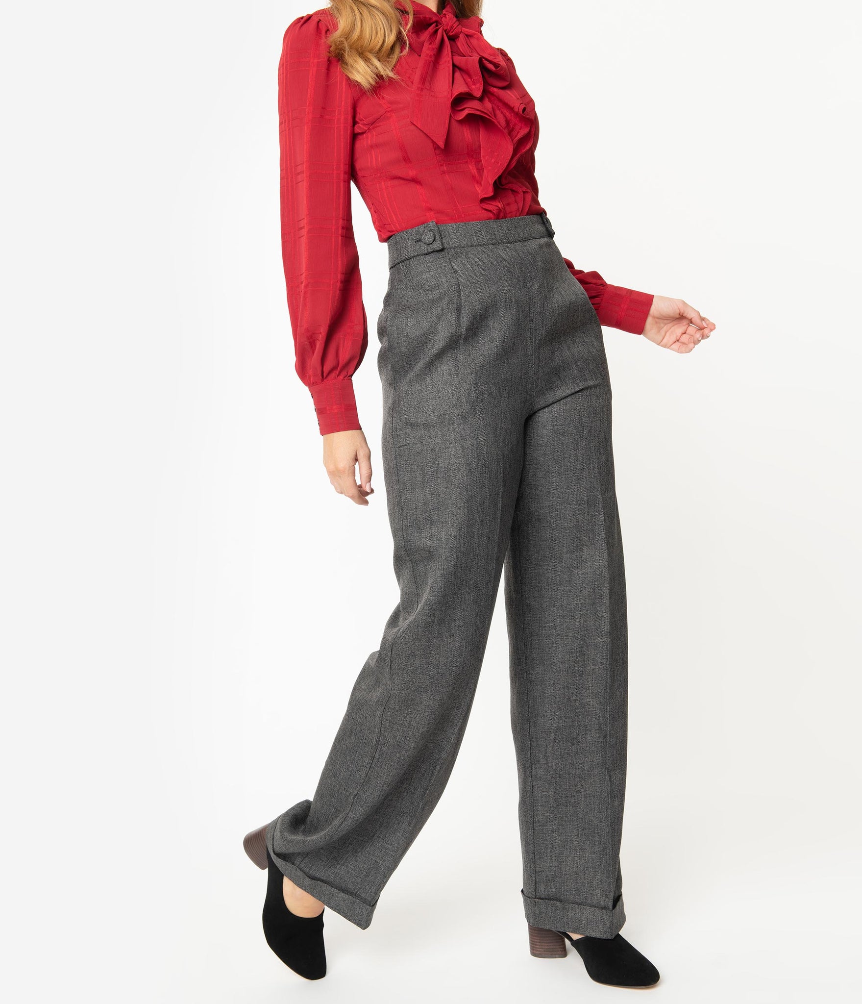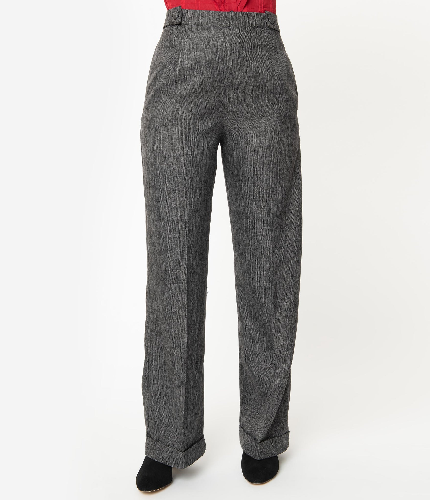 Put on your hot pants, dear! A pair of vintage slacks cast in a fresh 1940s style and complete in a lightweight woven construction that turns heads in a beautiful grey. The cute high waist features a banded retro detail with removable buttoned tabs and a hidden side zipper for a perfect nip. The pressed open pant leg streams into a true retro silhouette, with hidden side pockets. Get your groove on with these sleek slacks whether it’s a semi casual event or simply everyday!