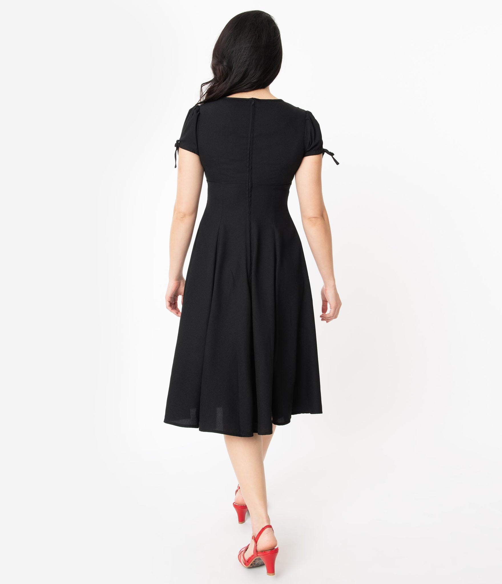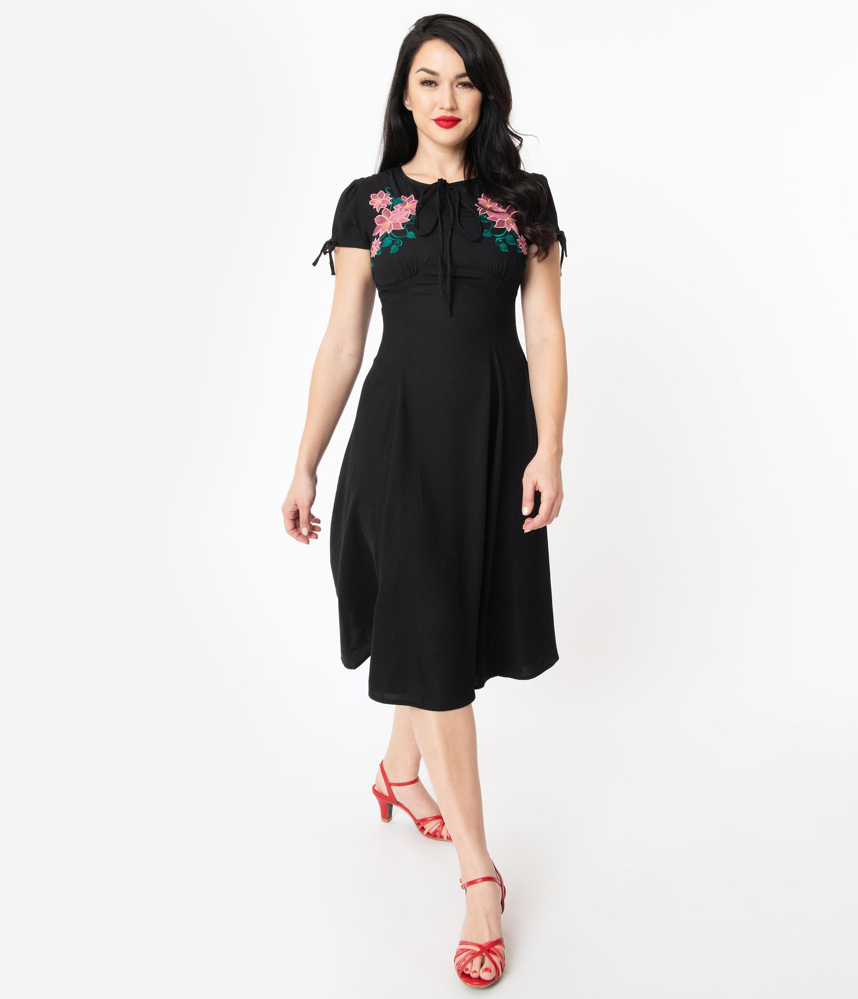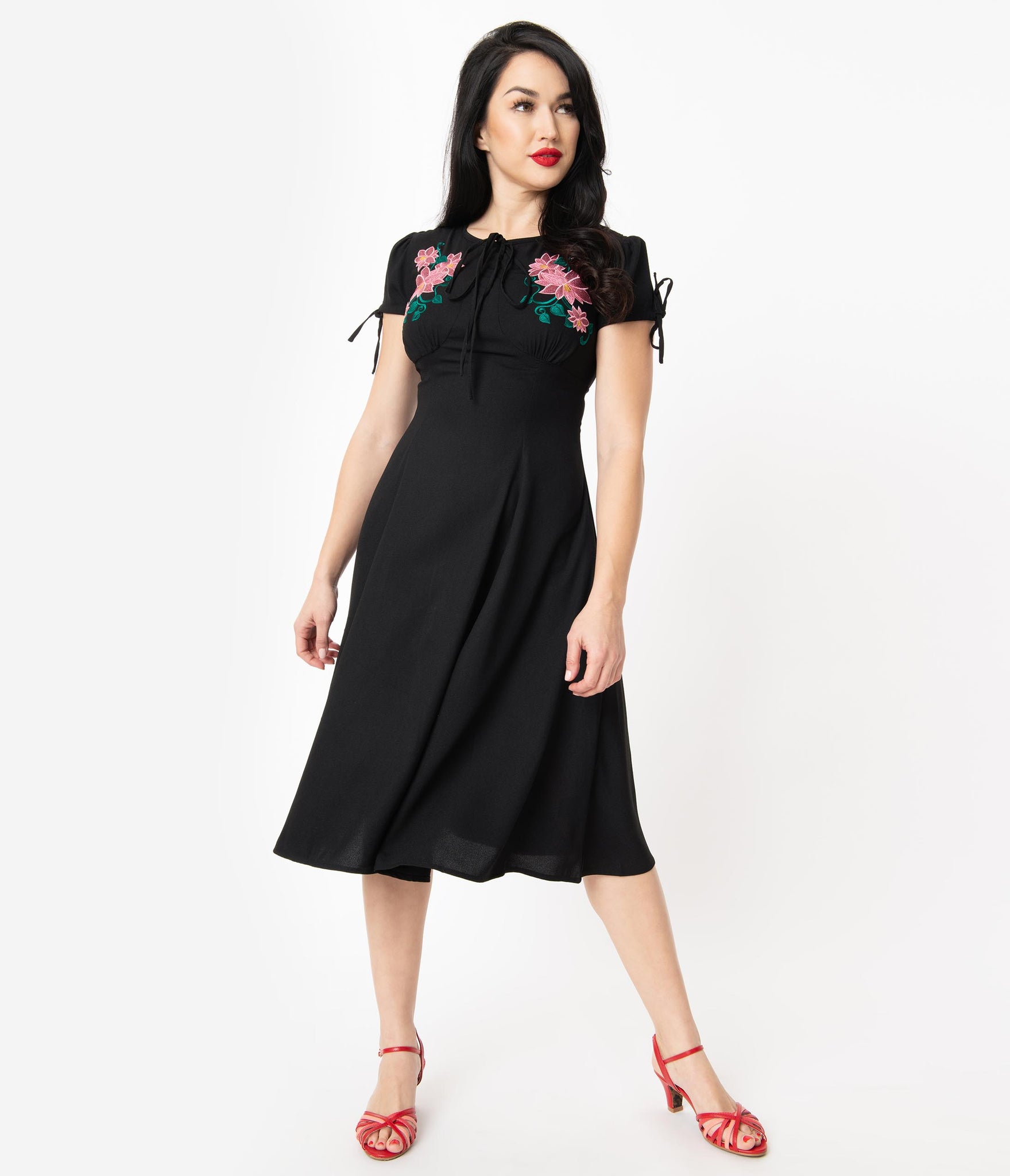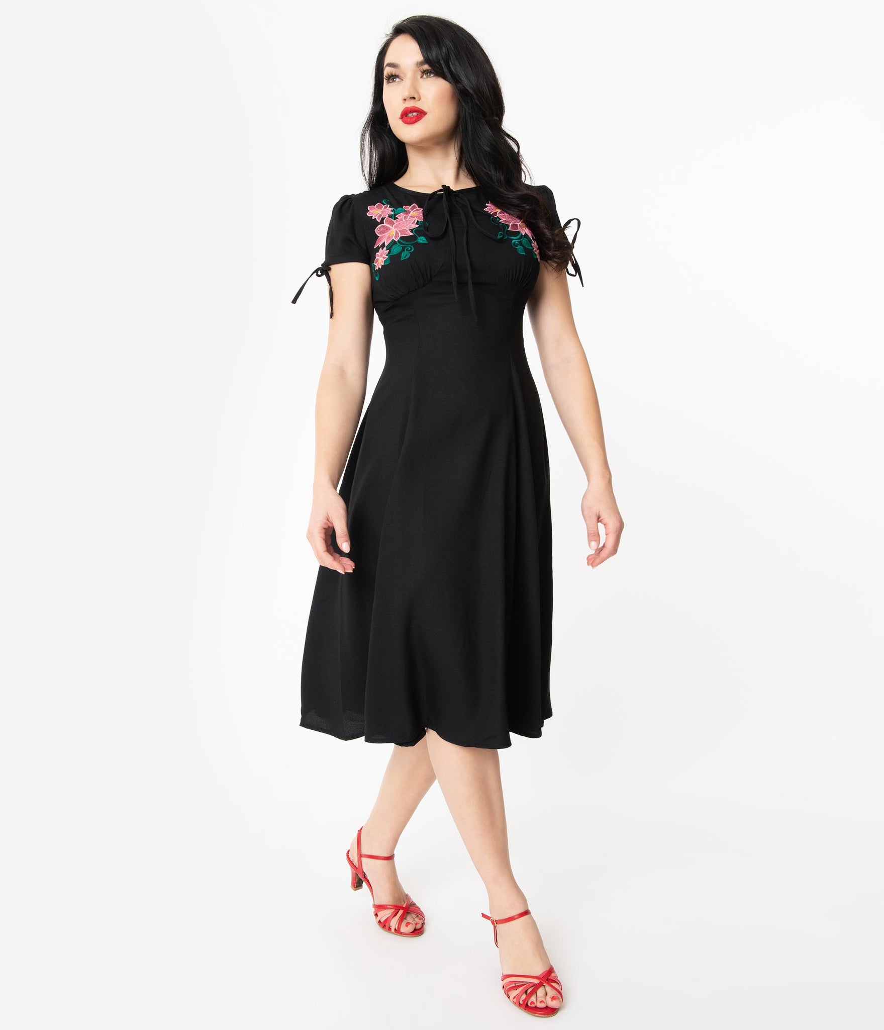 We’re in need of adventure, darling! A superbly enchanting 1940s inspired dress, this divine piece is crafted in a lightweight crepe of a gorgeous black. The vintage styled seamed bodice features subtle bust gathers that provide a lovely fit to flatter your pin-up form. The modest scoop neckline is centered with a self-tie bow while pink and green embroidered floral accents sit on your shoulders for flirtatious charm. The sweet short sleeves are gathered for a dash of pop while drawstring cuffs keep it retro. The paneled waist drops into a dramatic swing skirt that sways to your knees. Outfitted with a back zipper, this dress is sure to make a statement!