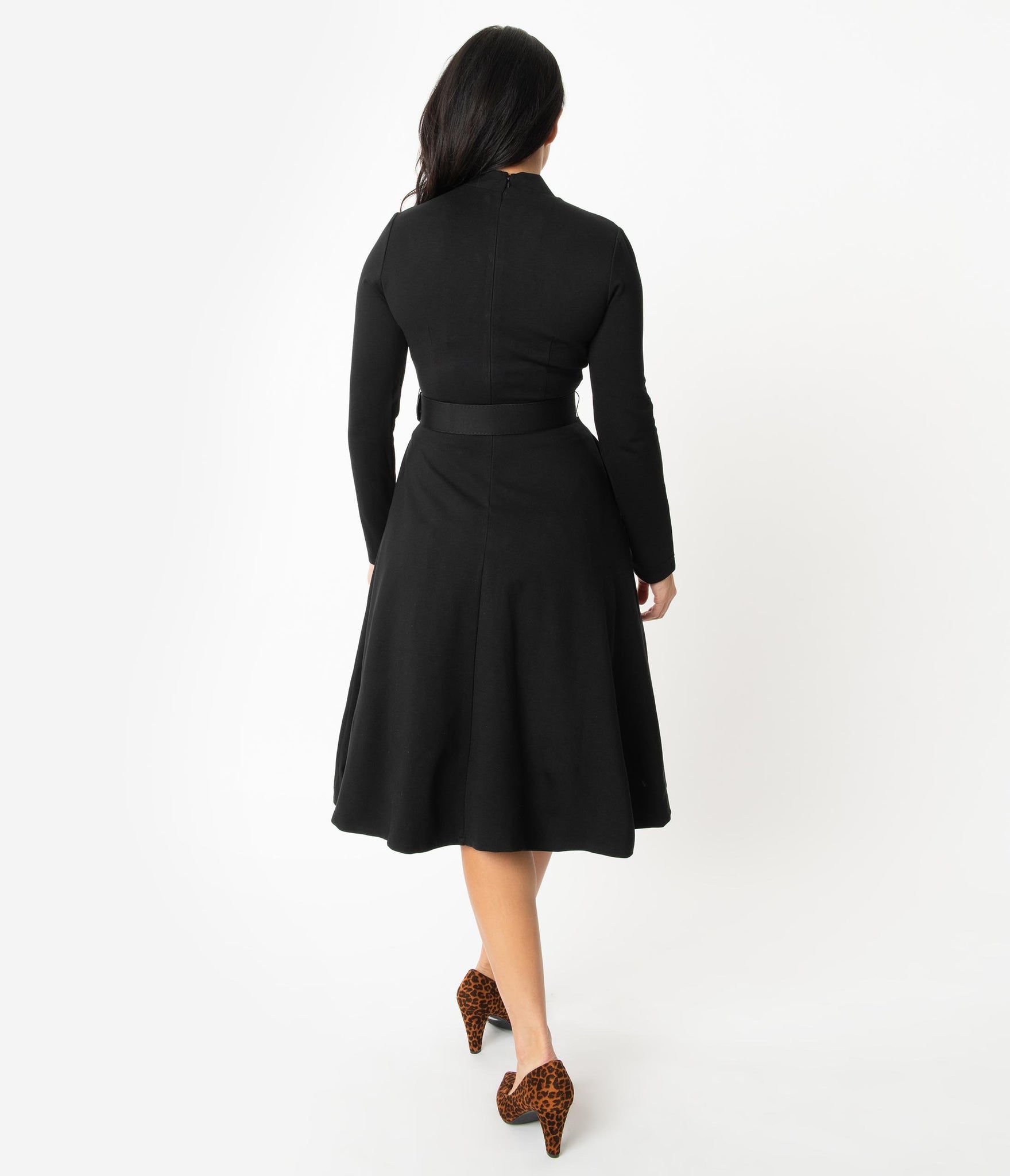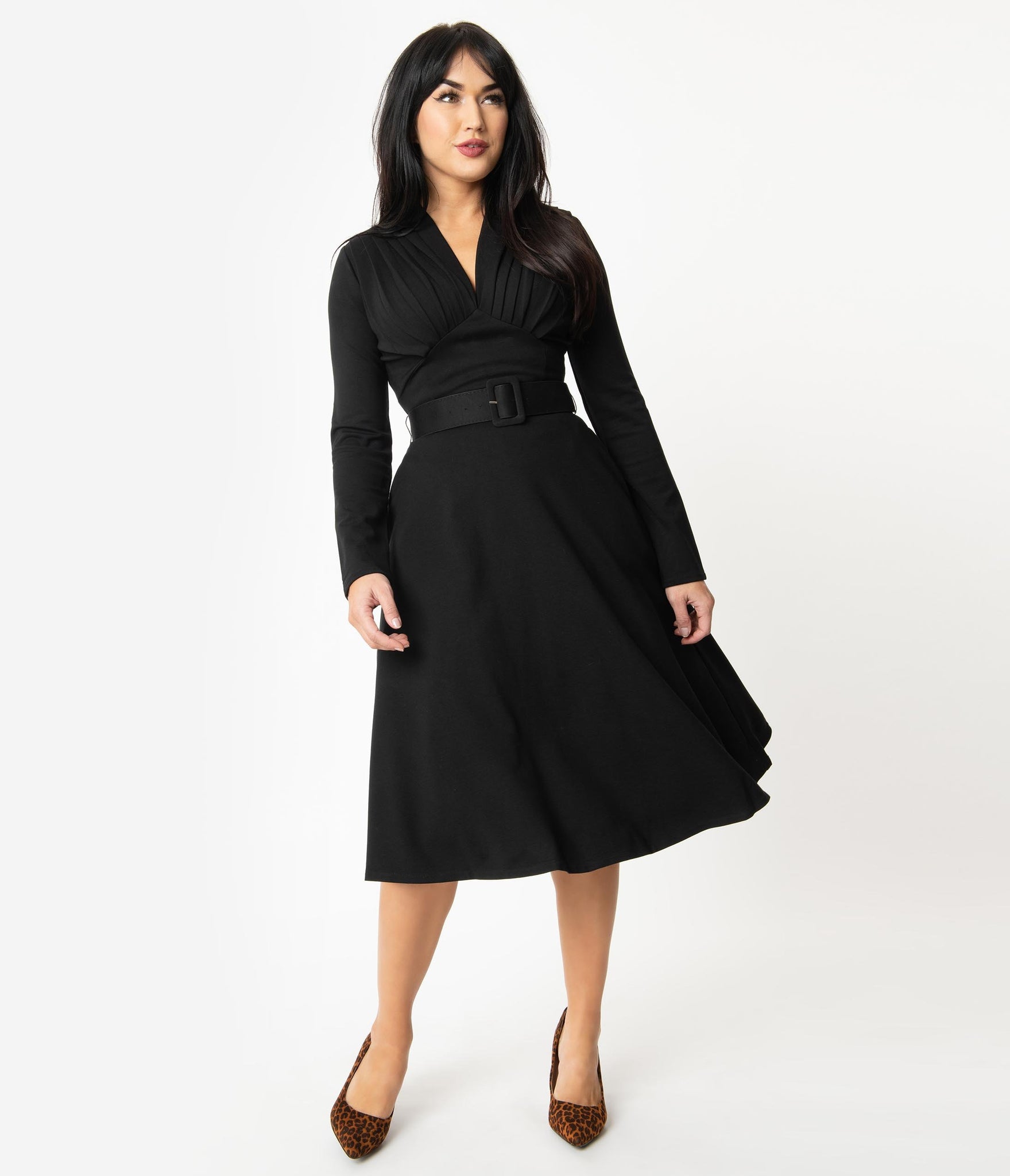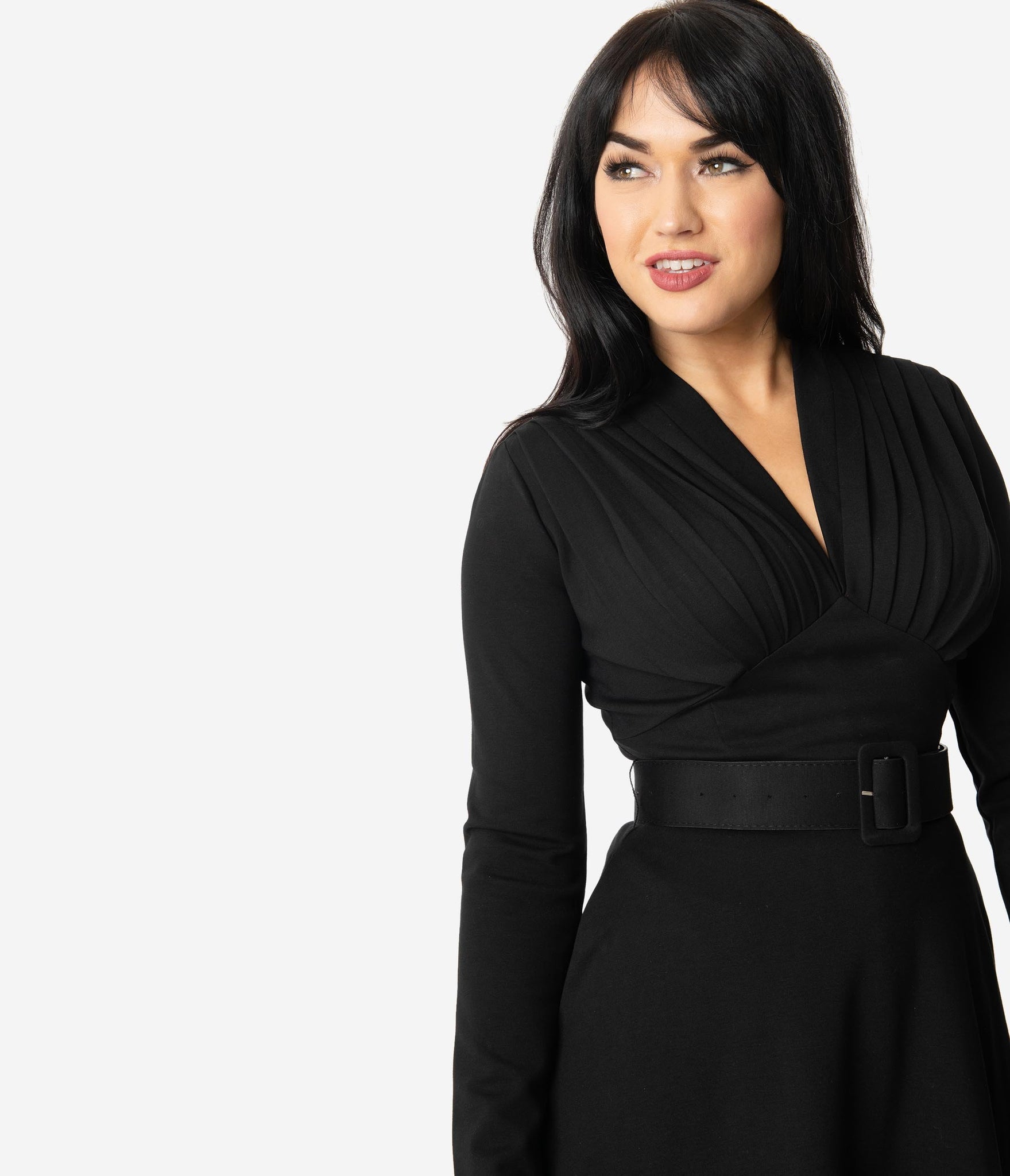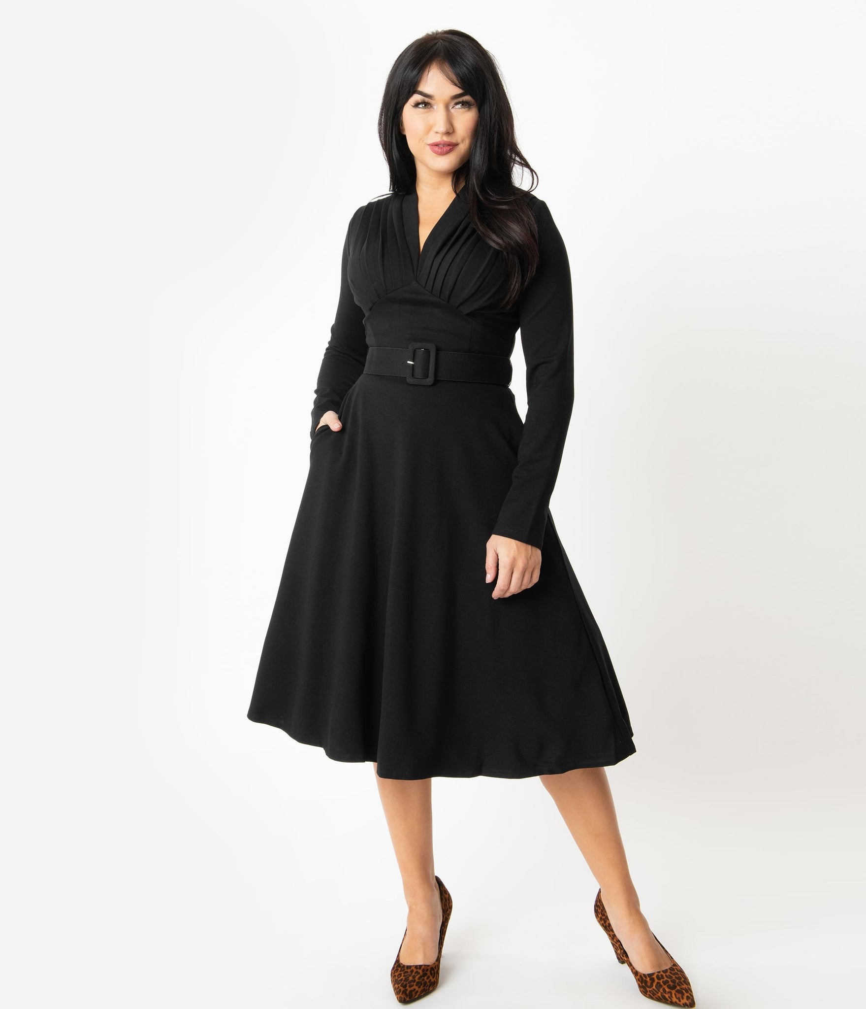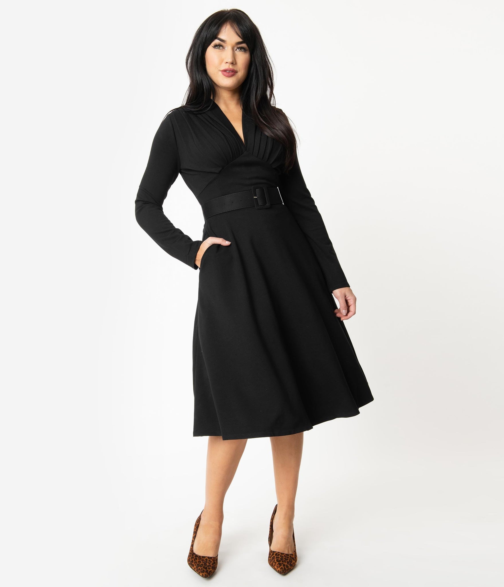 Beauty for every special occasion, gals! This fabulous swing dress is an iconic silhouette of 1940s style, crafted in a heavy black Ponte fabric for classy outings. The slender long sleeves keep you warm and elegant while a striking V-neckline boasts sweet pleats on the bodice for a flattering fit. The pointed and wide waistband slims and elongates your hourglass as the cute belt nips in your figure. The sweeping swing skirt drops to your knees while side pockets provide modern function. Outfitted with a back zipper, it’s a silhouette that never goes out of style!