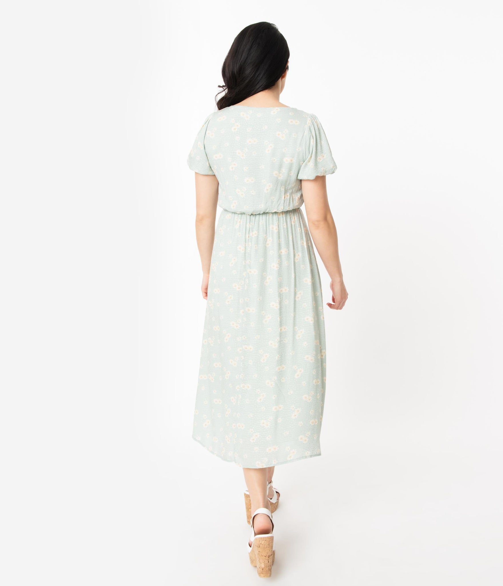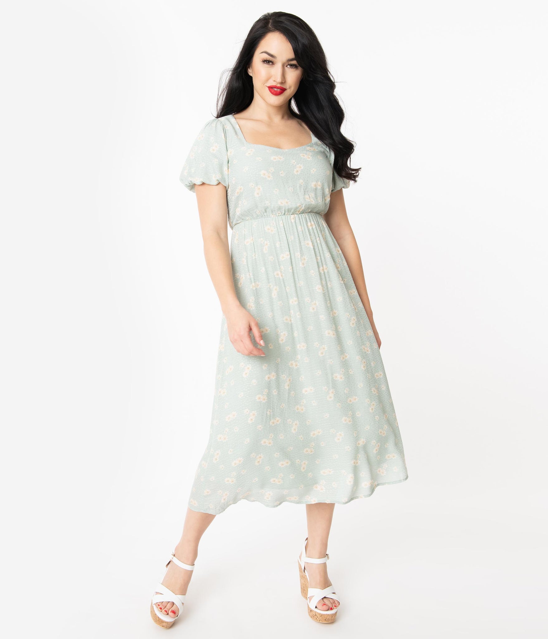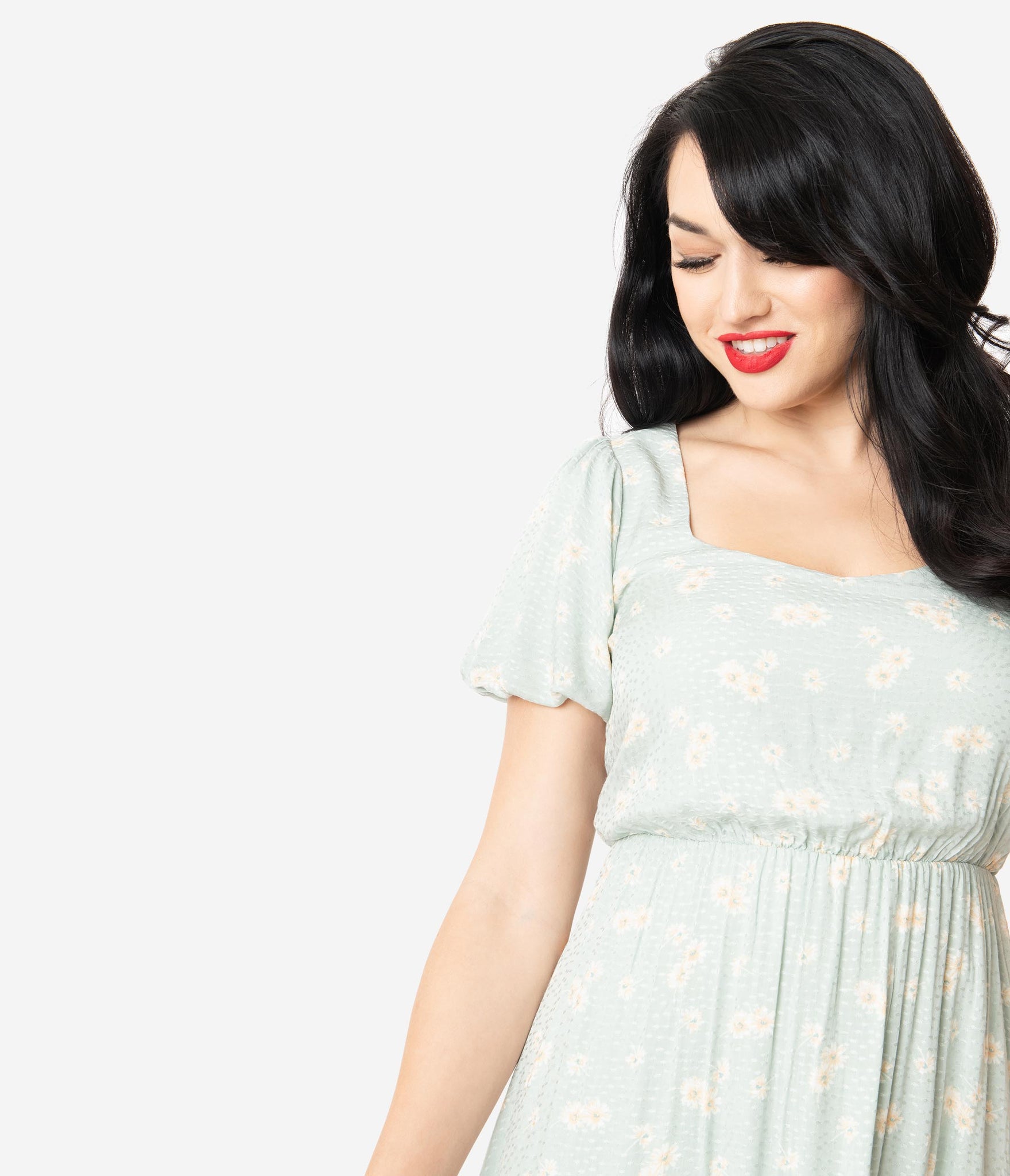 Soft and floral, babe! This beautiful silky mint dress features a delicate pale yellow and cream floral print. A slight shine comes from a subtle spot pattern added in the same color thread as the dress. A short puffed sleeve and elastic at the waist add a feminine shape. A dainty square neckline finishes this piece off perfectly. Ready for an afternoon tea, darling!