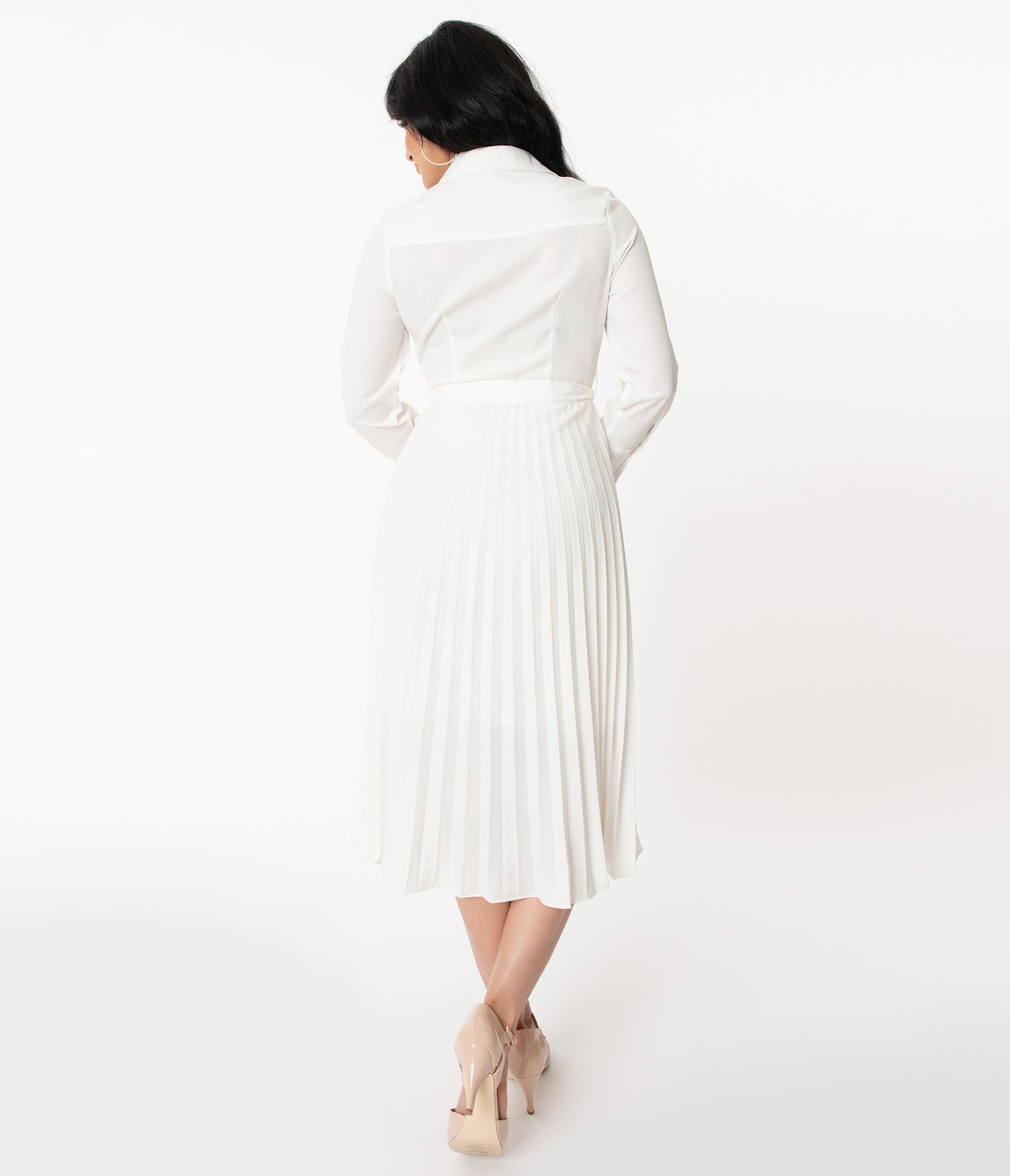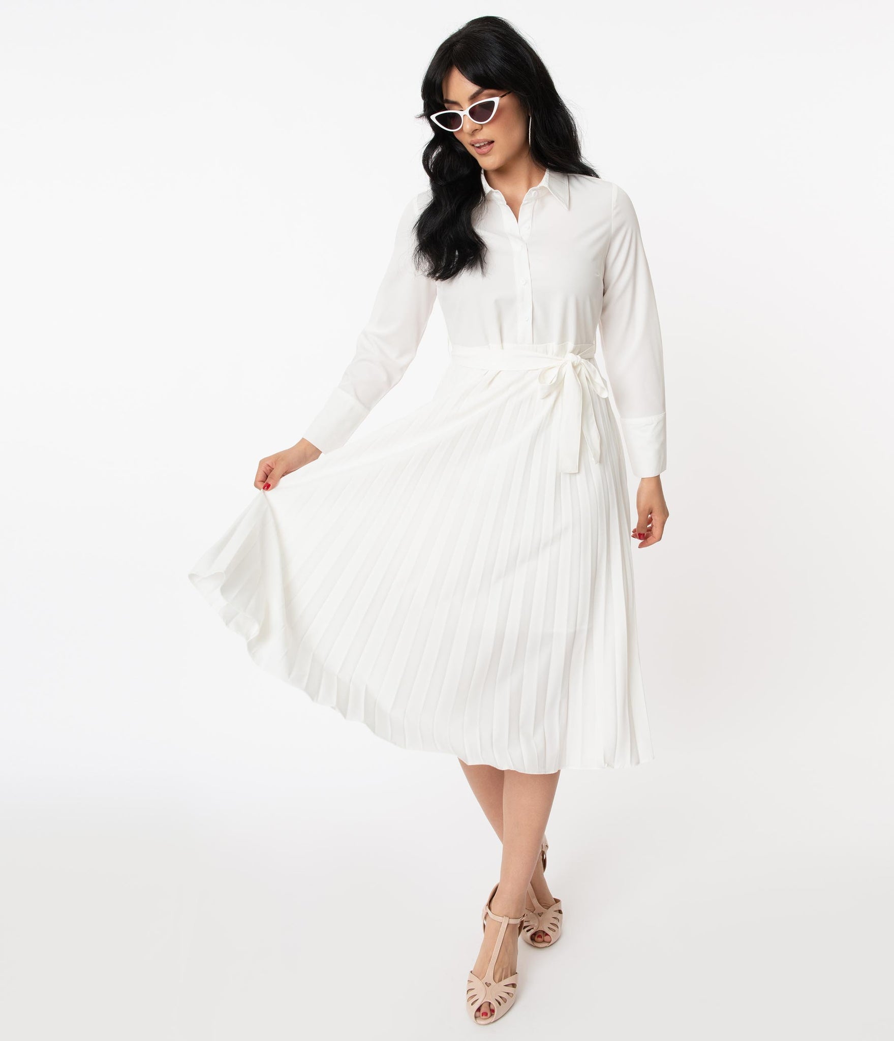 Sweep away those cloudy days, darling! This gorgeous vintage style frock is a modest and sophisticated piece, crafted in a marvelous ivory white woven fabric. The button up bodice leads to a classic collar framed by slender long sleeves that drop into a button cuff while the seamed waist is cinched with a matching sash and side zipper. The sweeping midi skirt is a delight with soft accordion pleats throughout!