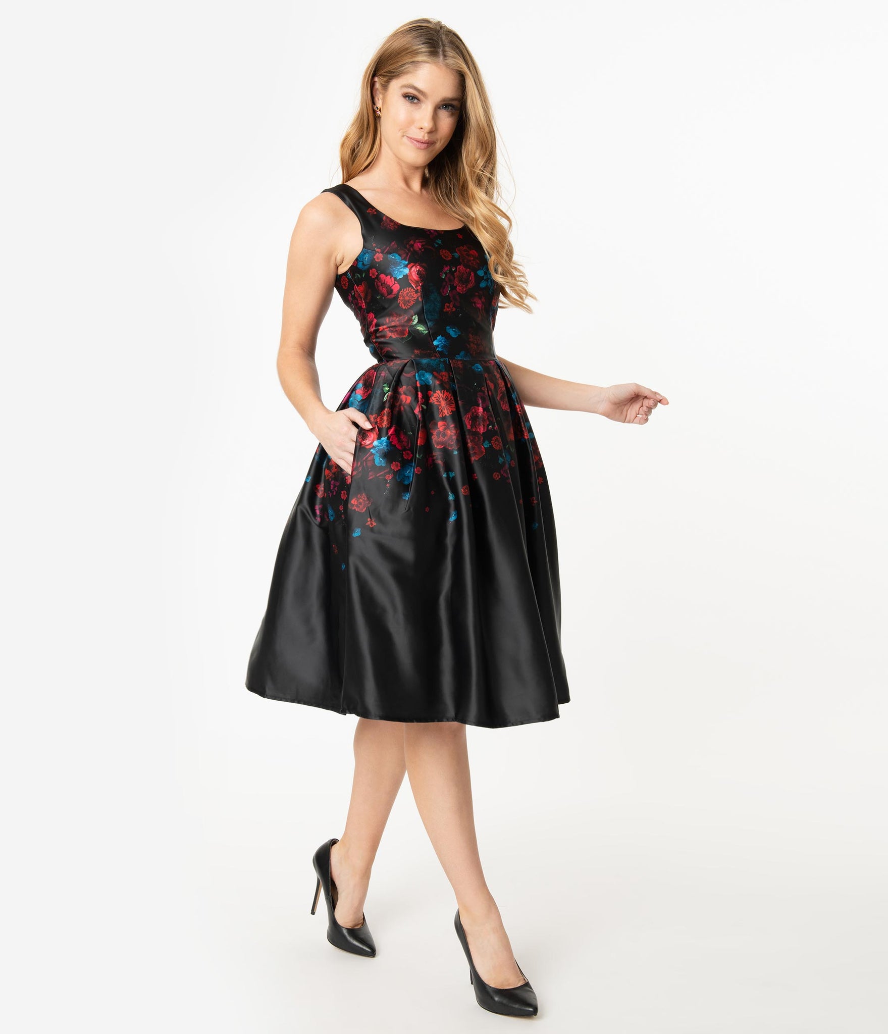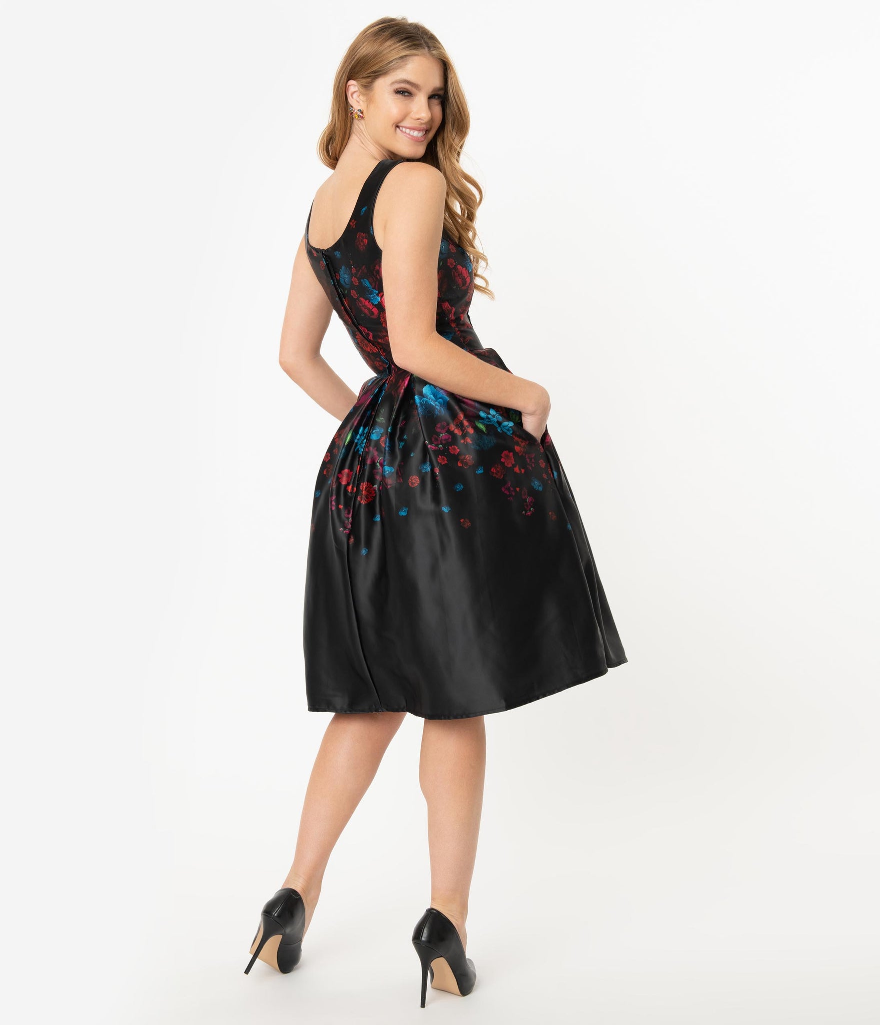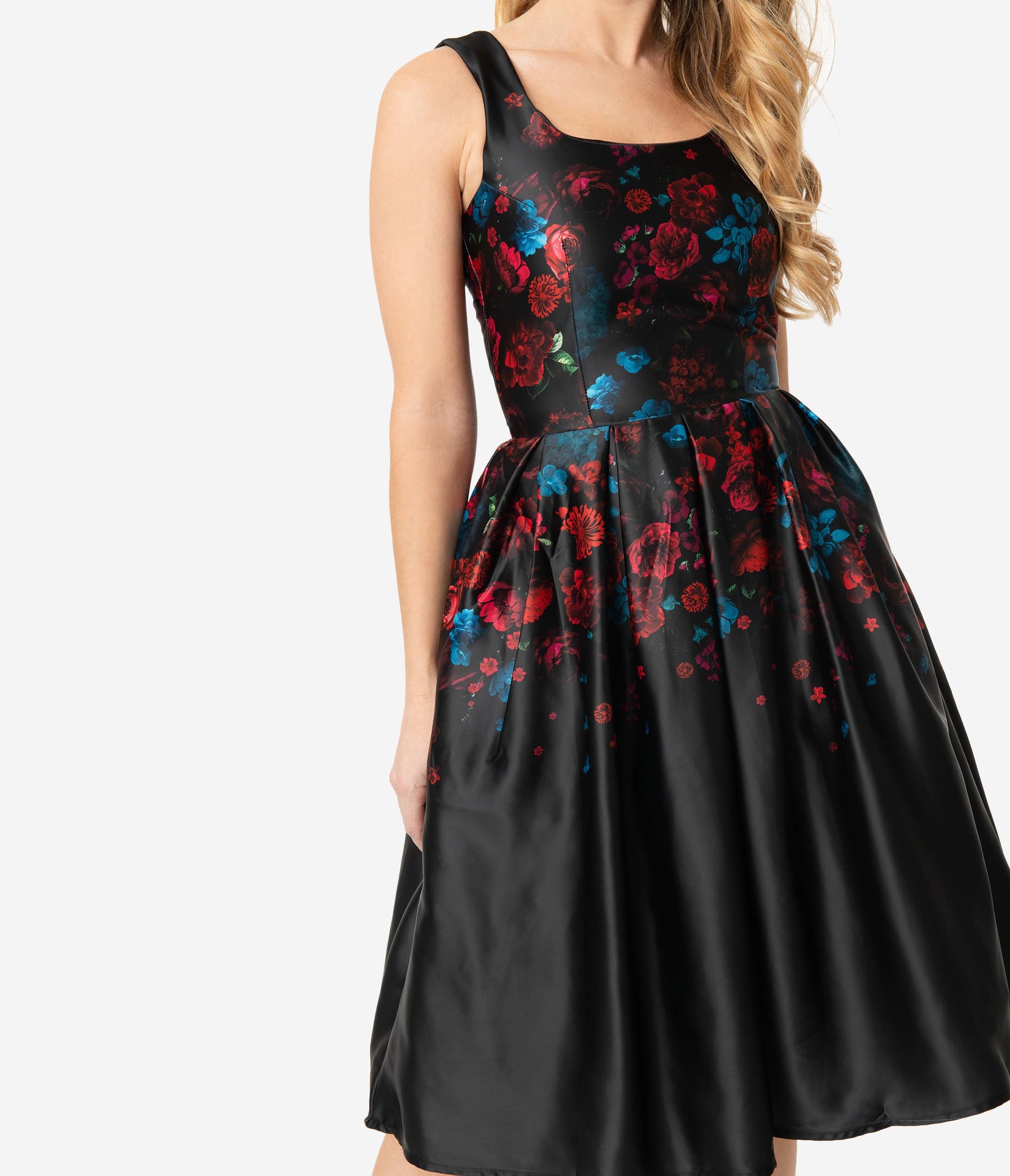 1950s Black & Dark Floral Sleeveless Amanda Swing Dress