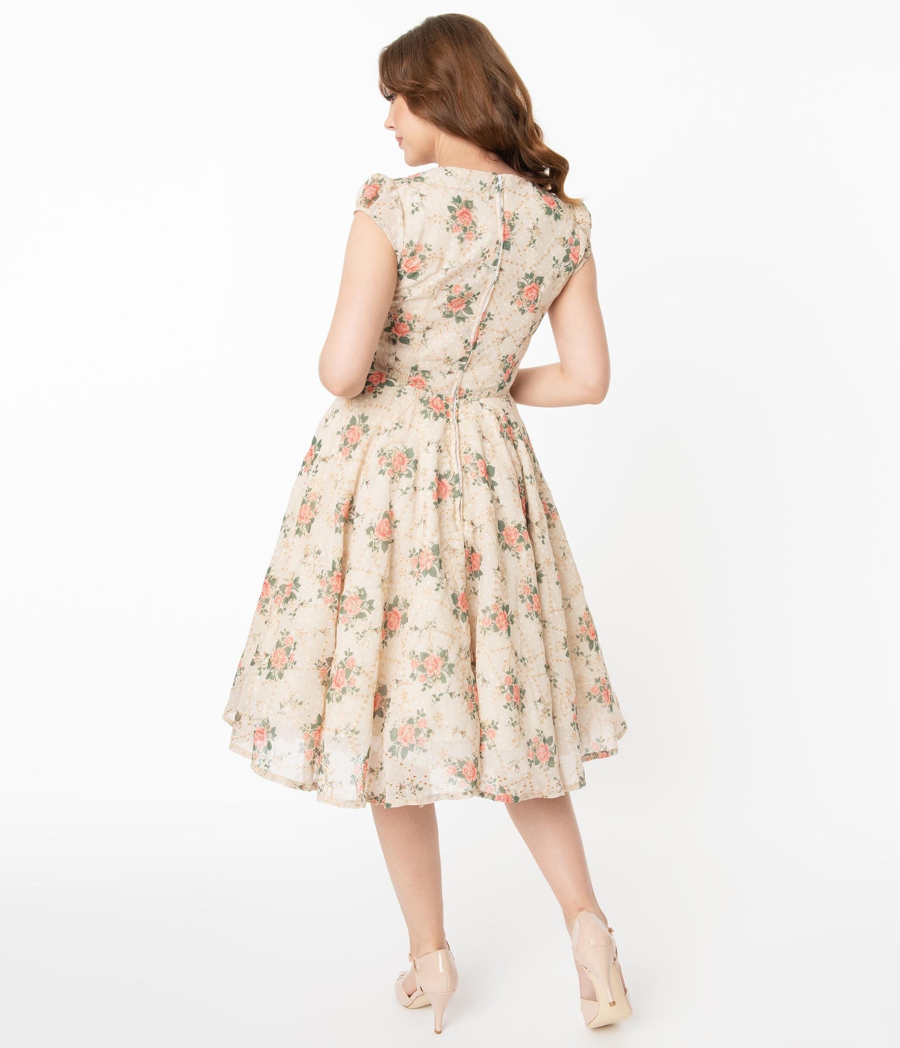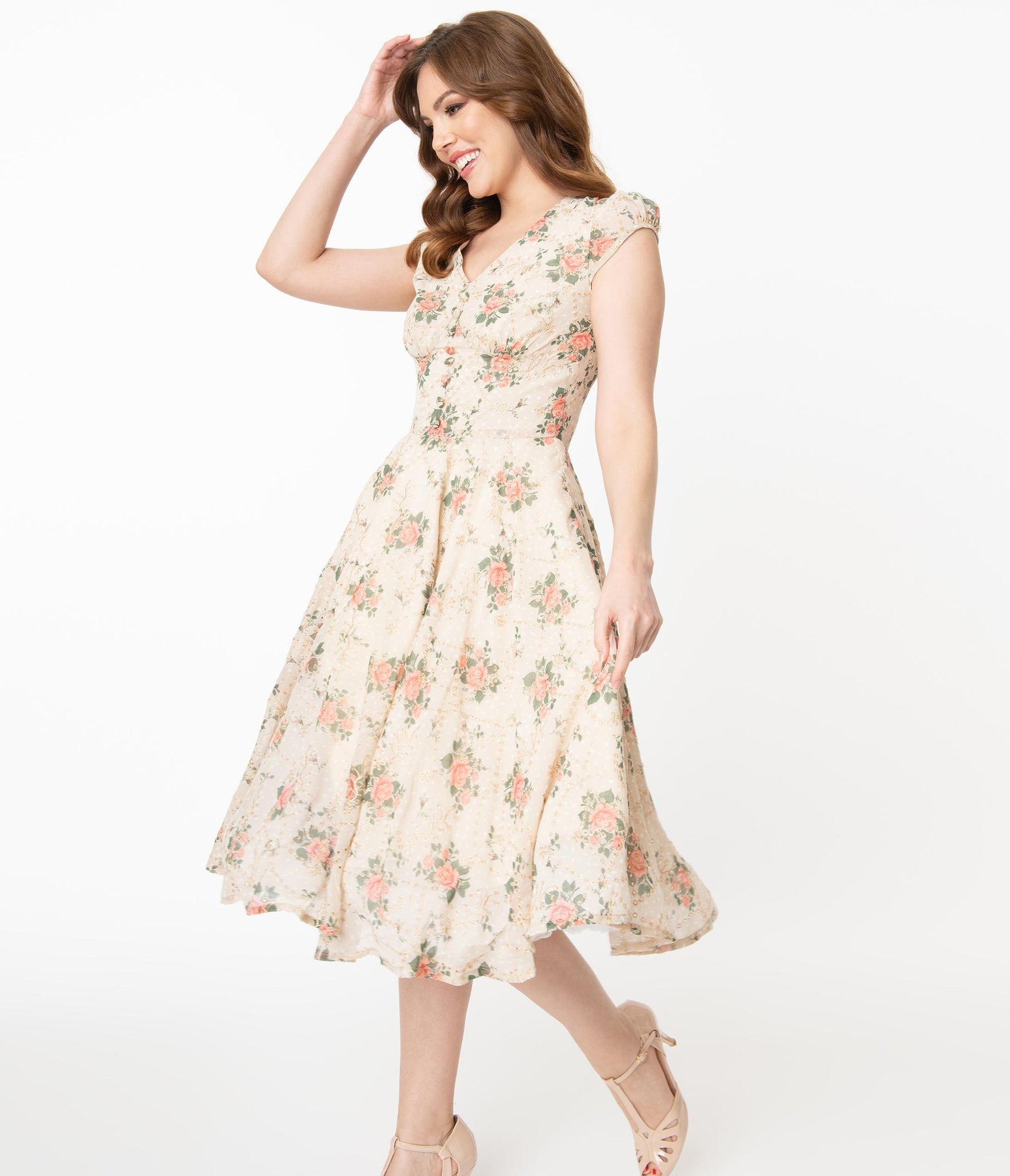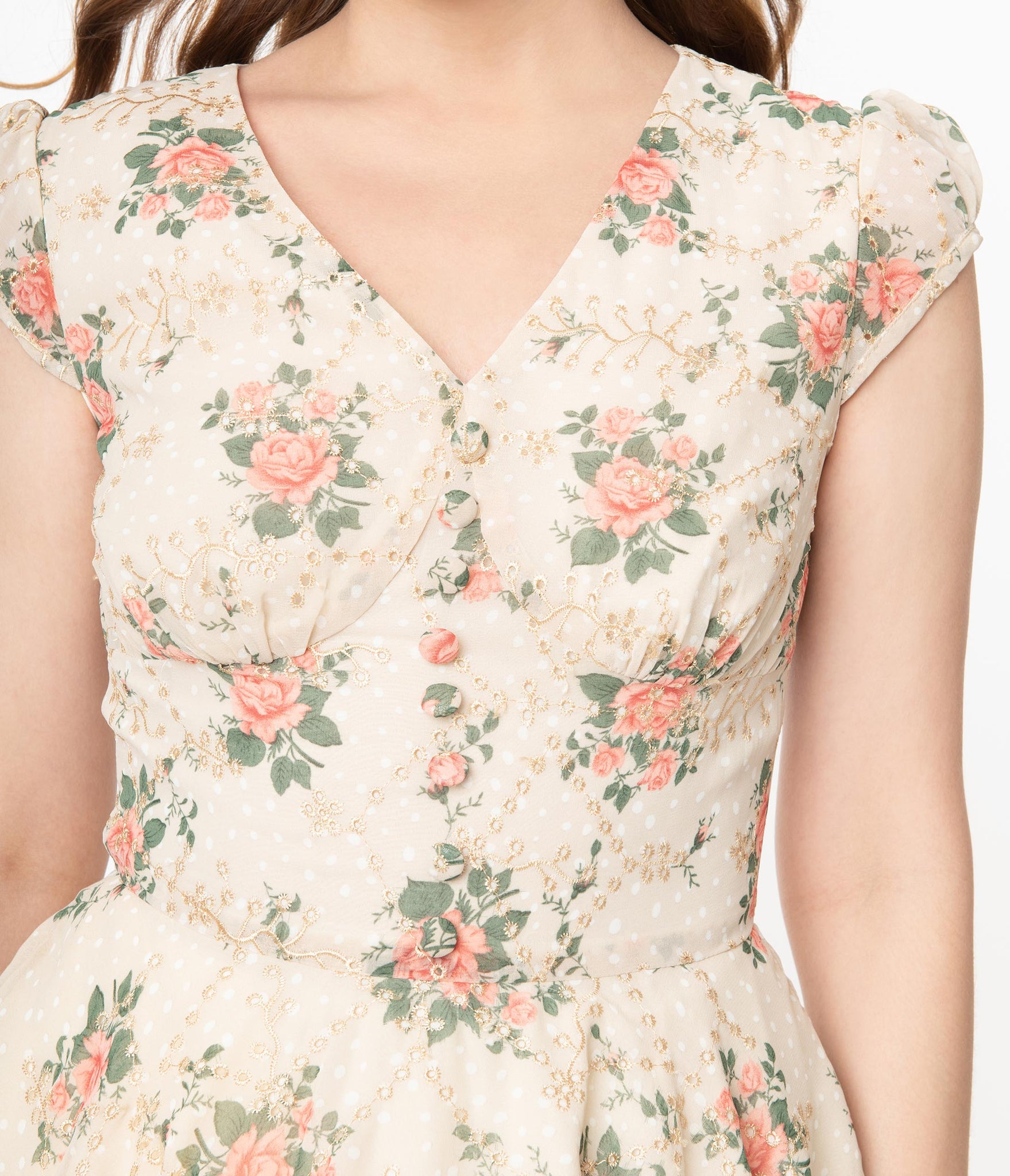 You’re true love awaits, dears! This dreamy frock is a romantic scene in a darling woven blend that dances with pink florals, ivory speckled dots, and golden embroidered eyelets throughout a cream backdrop. The modest V-neckline is centered by faux buttons and framed by cute cap sleeves while the pointed, wide banded waist slims your feminine features. The sweeping swing skirt cascades to your knees while smooth lining provides all day comfort!