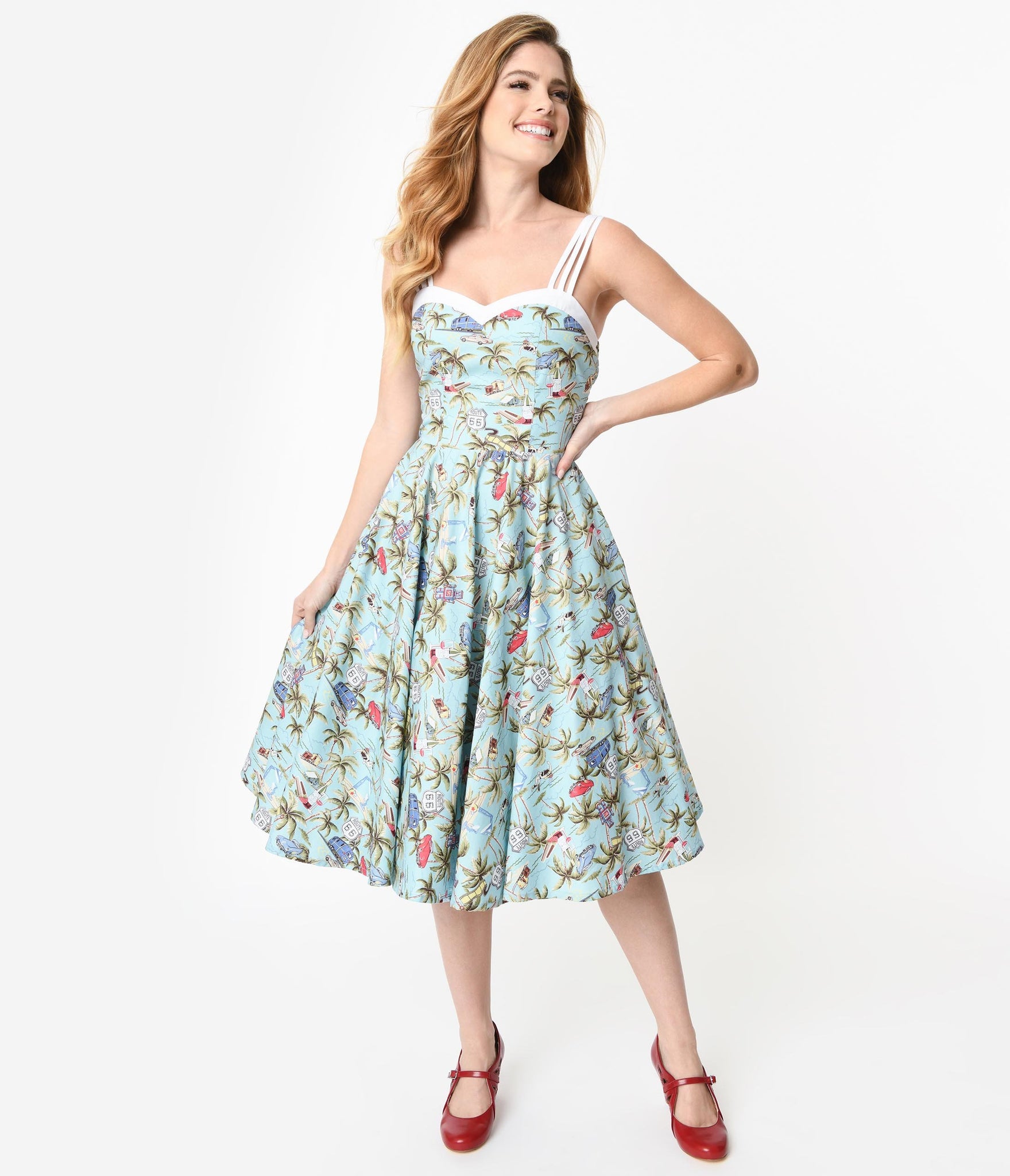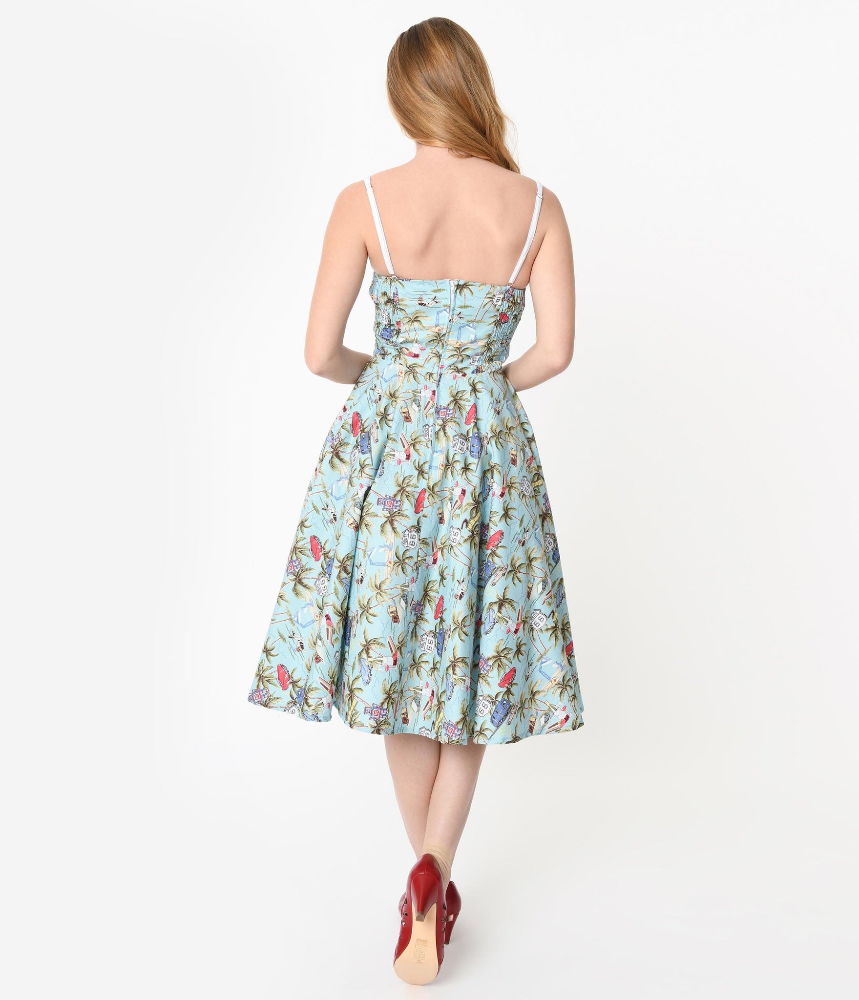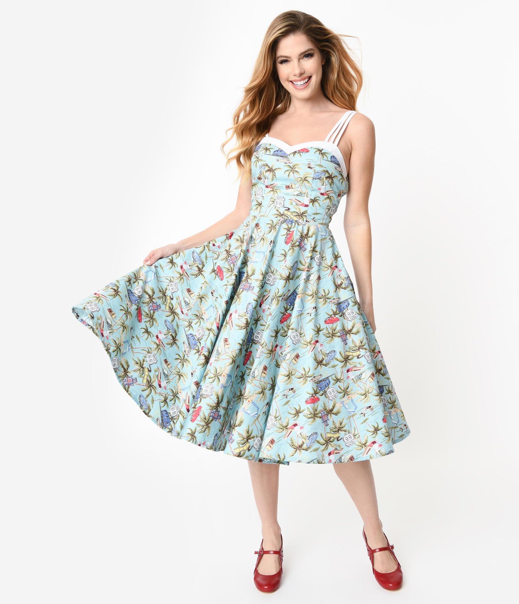 Retro paradise, darling! A sweet mid-century style frock, this adorable silhouette is crafted in lightweight cotton with a sensational print of retro icons and palm trees throughout the light blue backdrop. The princess seamed bodice is secured with adjustable spaghetti straps and crafted with smocked side panels for a flattering fit while the sweetheart neckline is highlighted in white. The seamed waist tops a sweeping swing skirt, outfitted with side pockets for modern fun as the back zipper cinches in your figure!