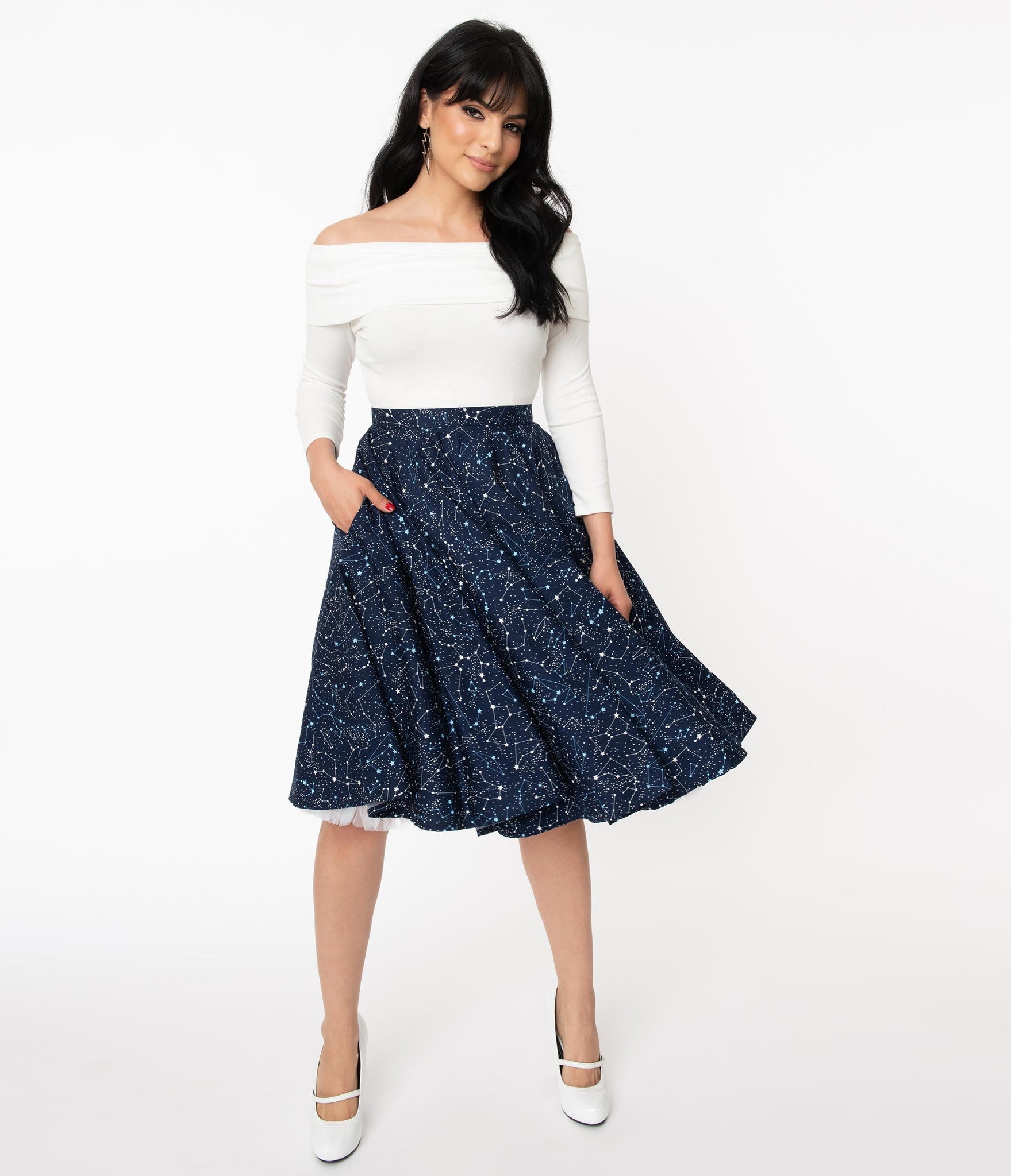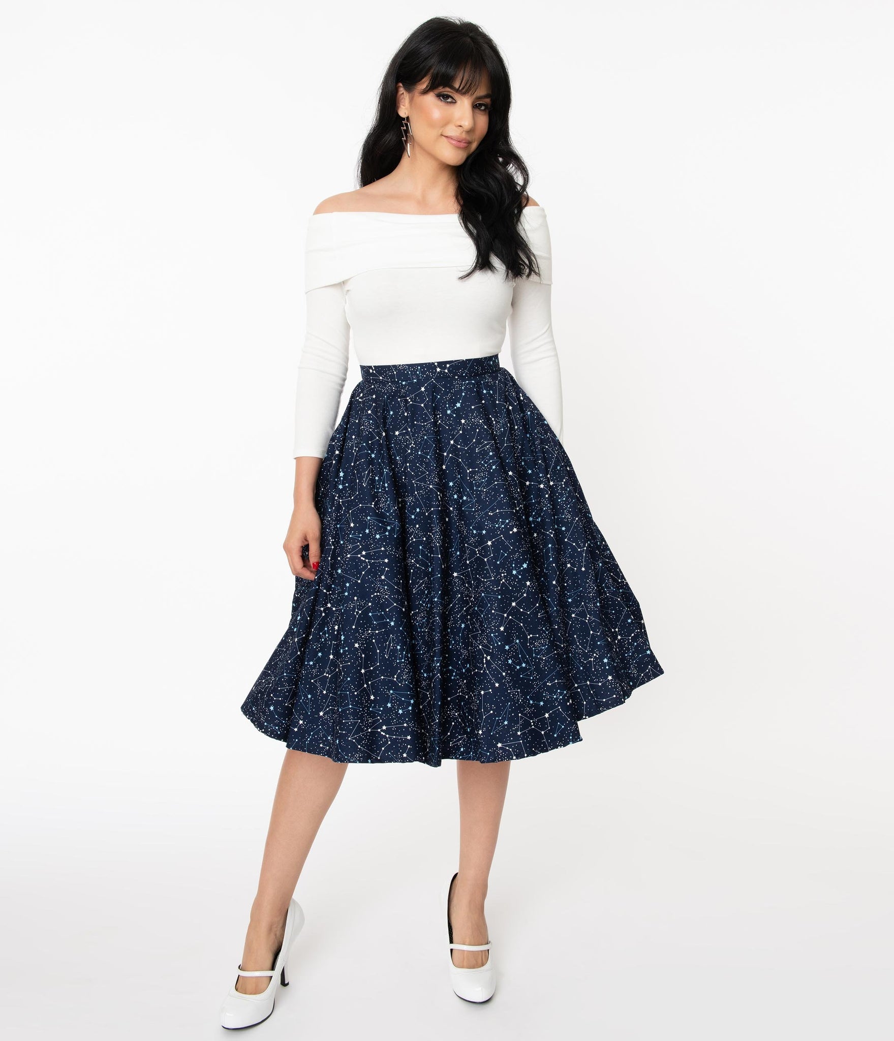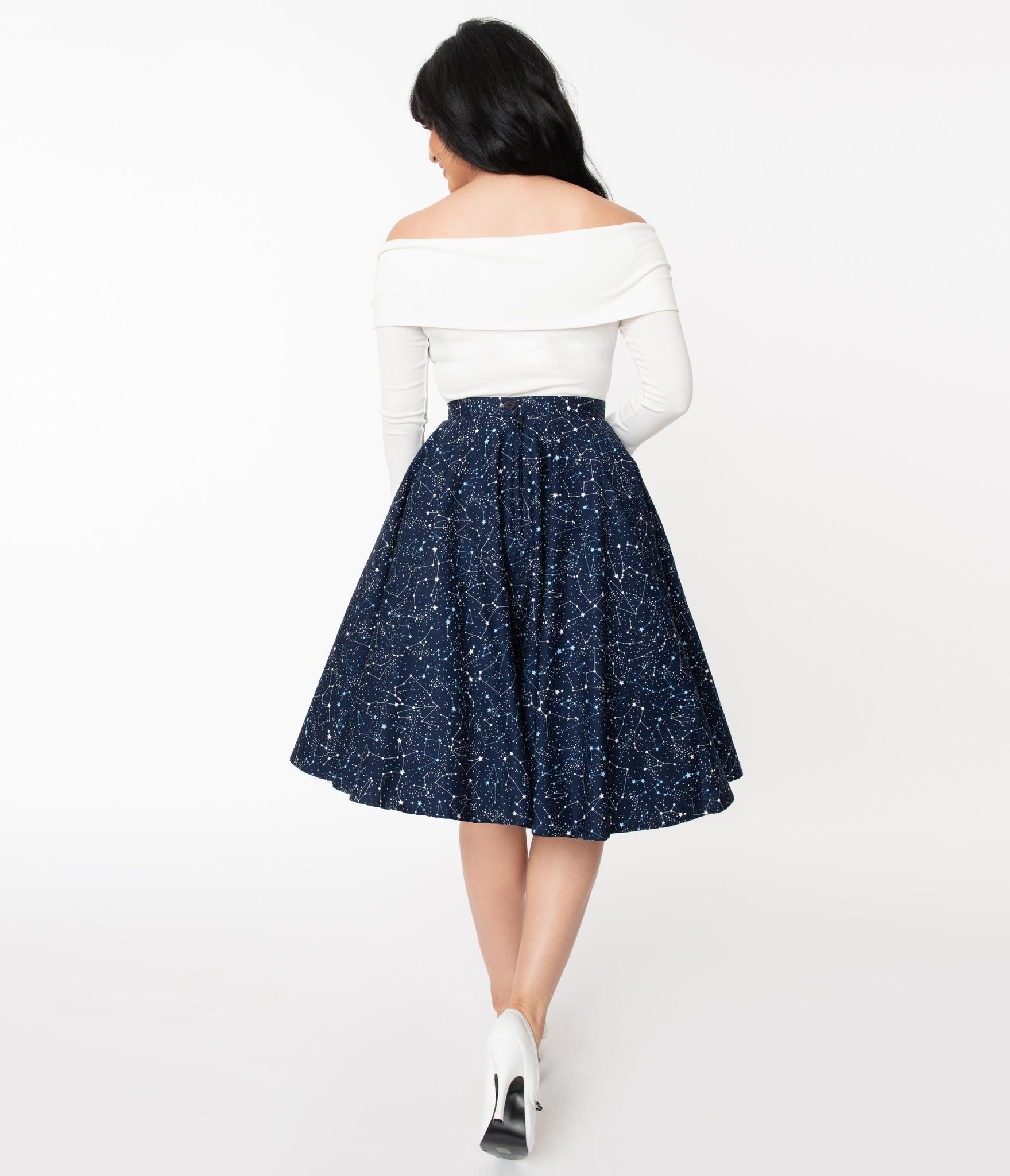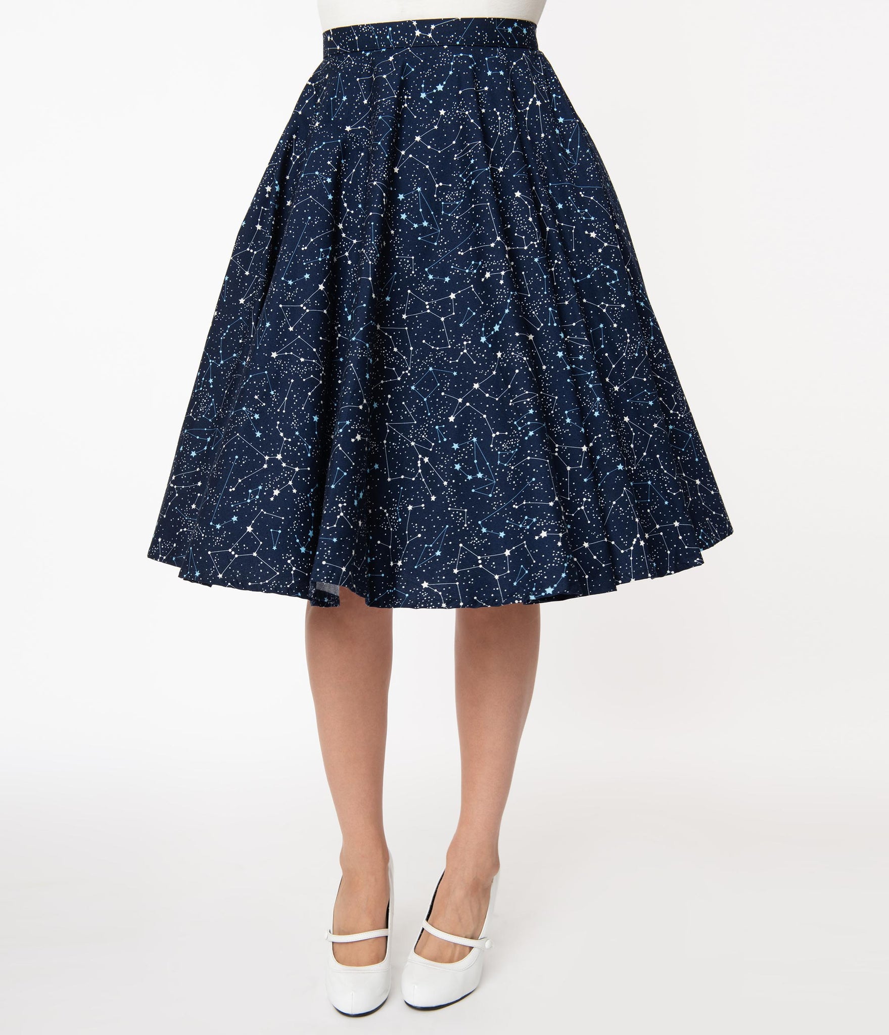 The stars have aligned perfectly, darling! This traditionally cut circle skirt is fashioned from a lightweight navy blue cotton fabric, with a back button and zipper closure. Staying true to a statement that has been written in the stars, all the best skirts have side pockets - and this piece is no exception! Printed with stars and constellations, you can add a fluffy petticoat for some extra volume and get ready to make a wish on the next shooting star!