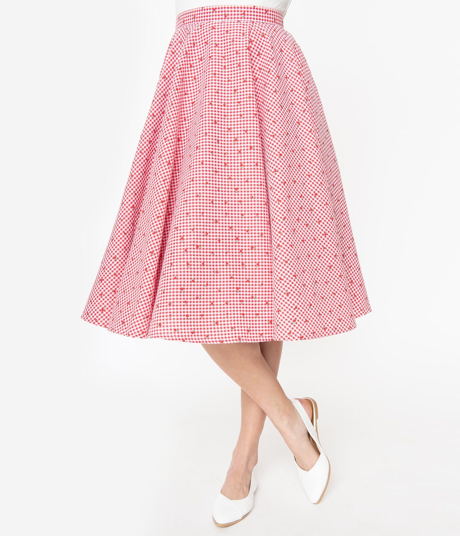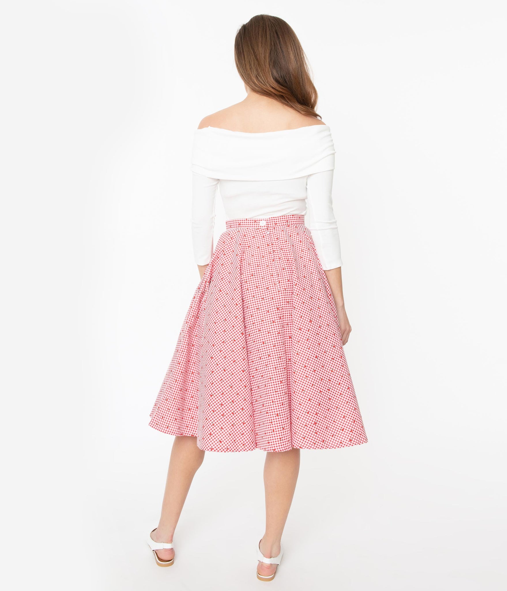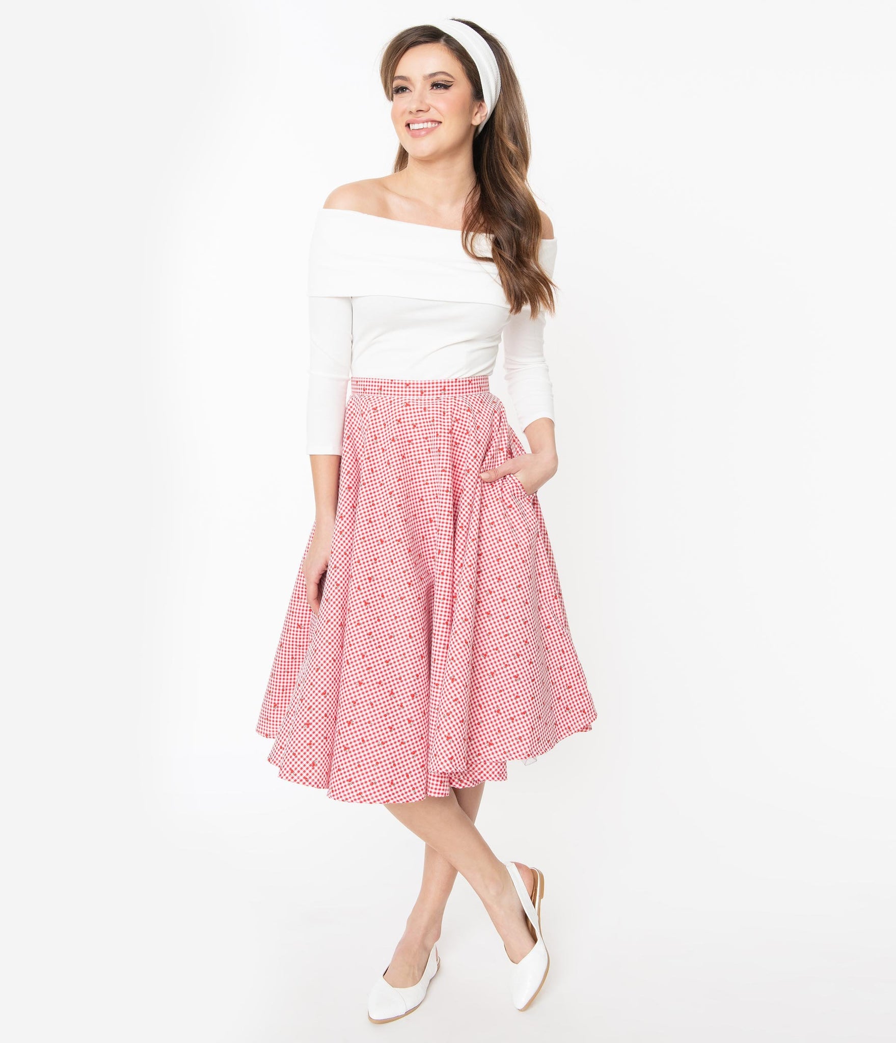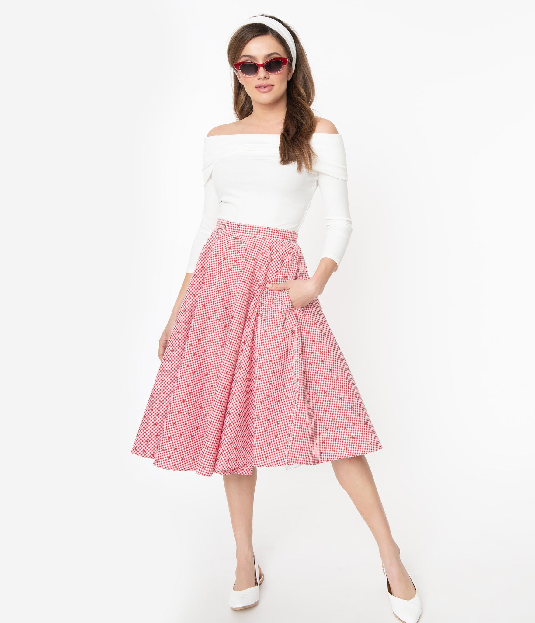A delectable separate for a stylish dame! This tasty swing skirt is designed to cinch at the waist and dance around the hips in a rockabilly red and white gingham that’s stippled with red cherries throughout. Crafted in a lightweight and sturdy woven fabric, this knee length piece can be worn with a crinoline for a little extra flare. Featuring two side pockets and a back zipper below a button closure, this skirt is an excellent addition to your 1950s style!