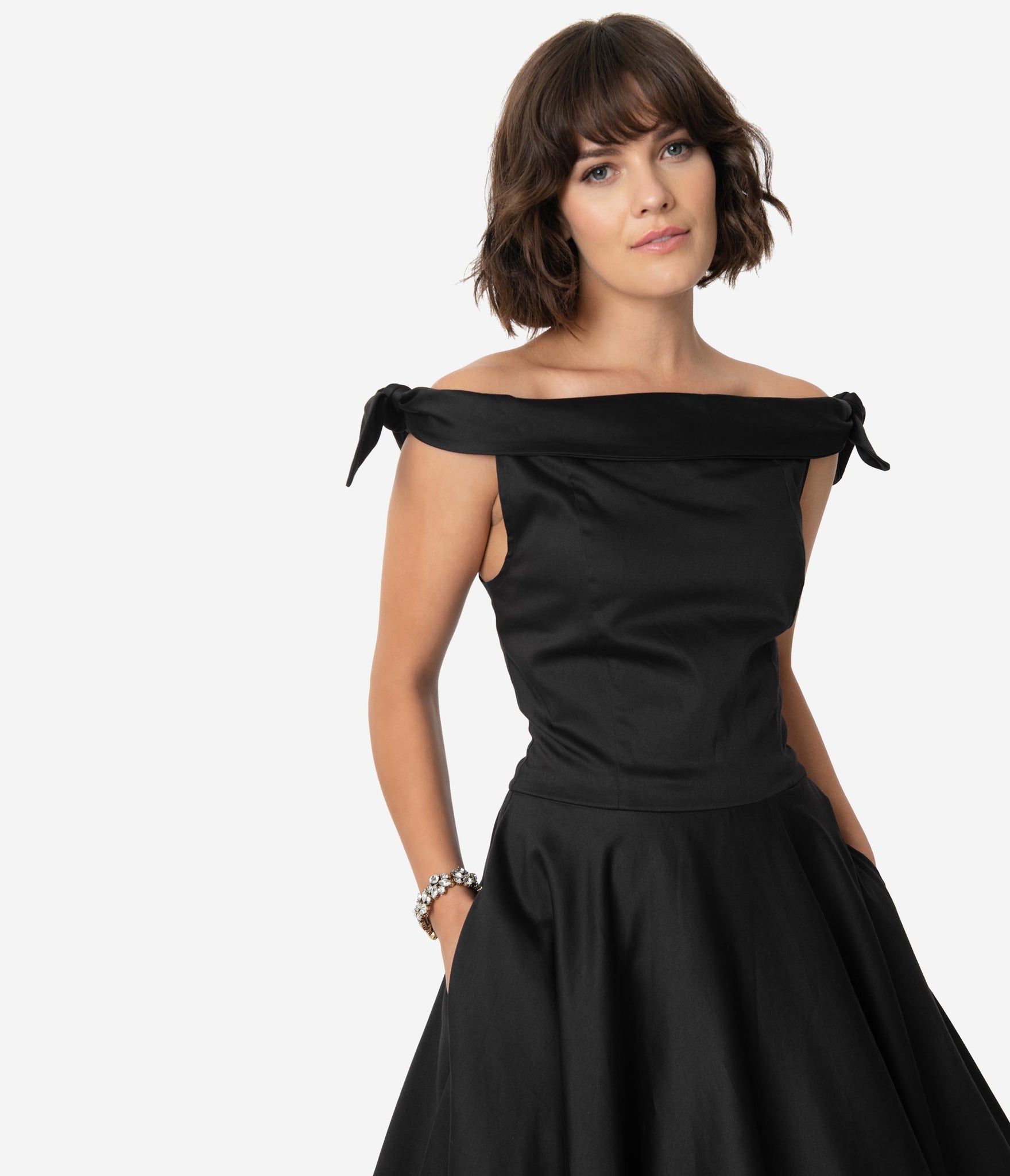 Pearls and diamonds, please! A glamorous black dress in vintage styling, the Mona Dress is a glamorous frock in a marvelous cotton blend. The princess seamed bodice boasts a dramatic off the shoulder fold over neckline that secures with an elastic band and is embellished with darling self tie shoulder bows. The seamed waist tops a sweeping swing skirt, outfitted with side pockets, and cascading to a straight hem at the knee. Complete with a back zipper, it’s a vintage dream!