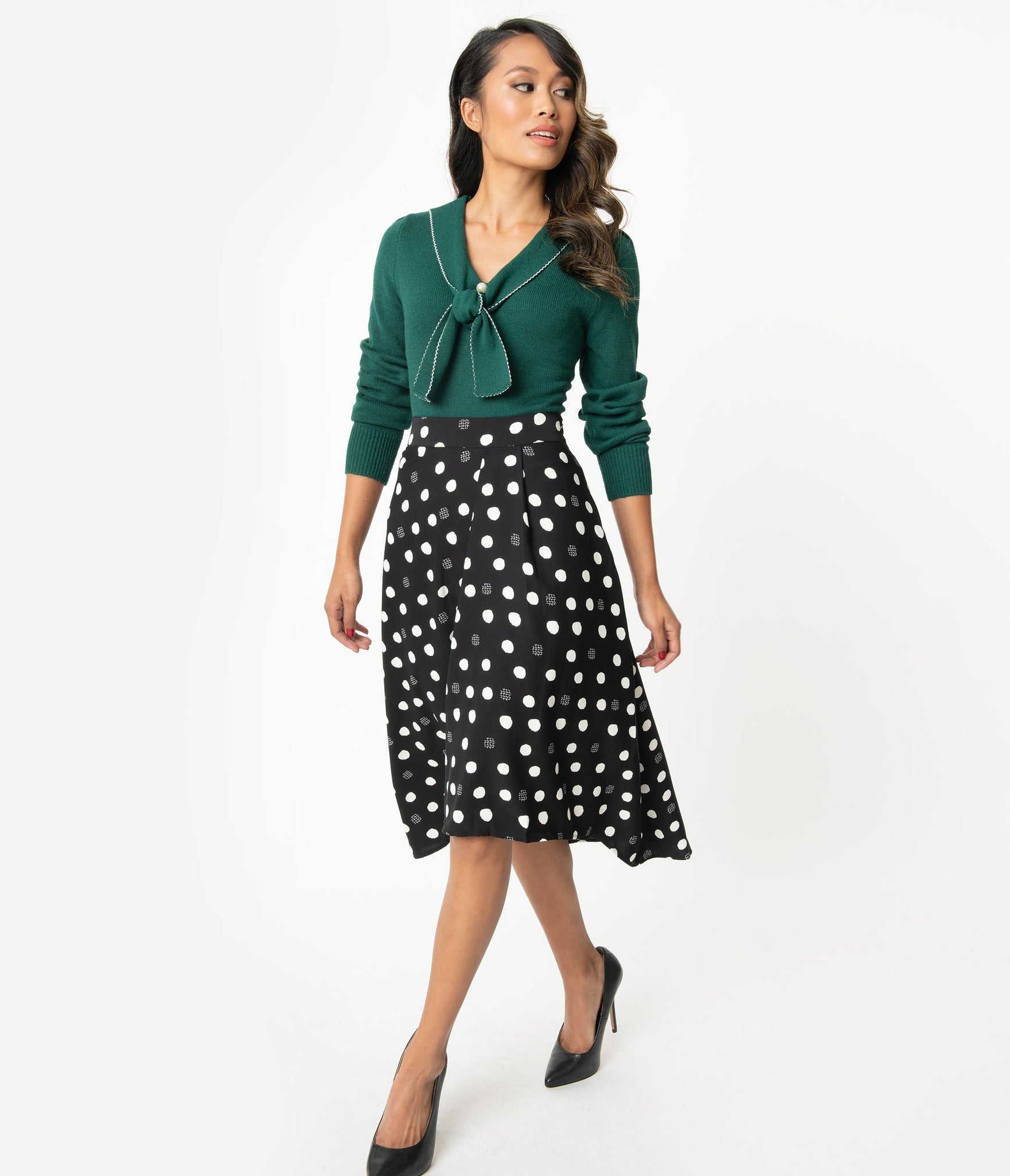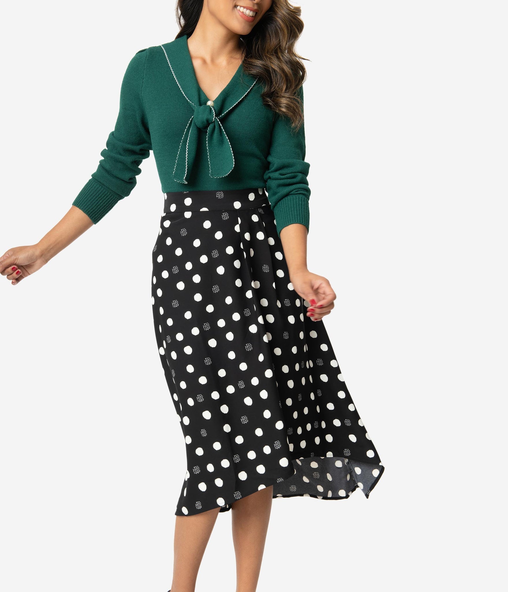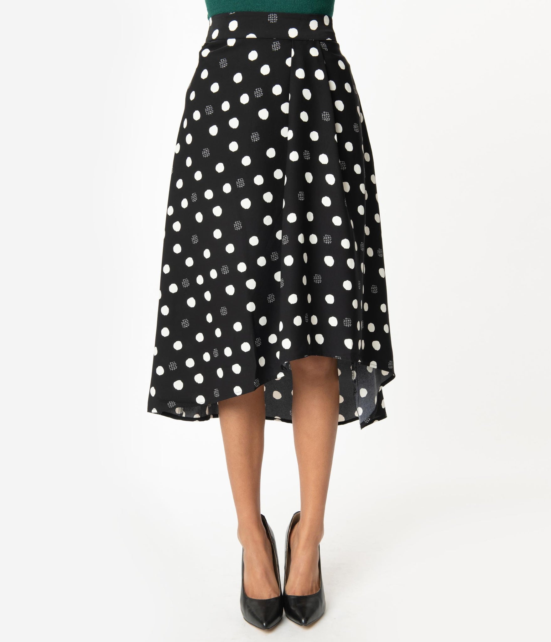 Dance the night away in this swinging polka dot skirt! This retro style swing skirt sits at the natural waist to accentuate your figure. The high low design adds a little extra jazz while the back zipper & hook add functionality. You'll never want to stop swinging around in this lightweight skirt.
