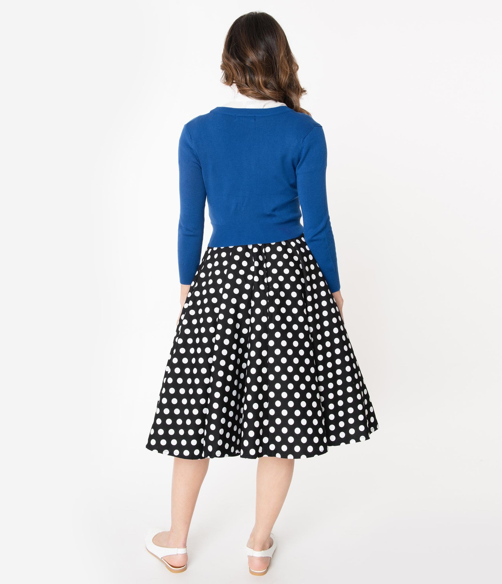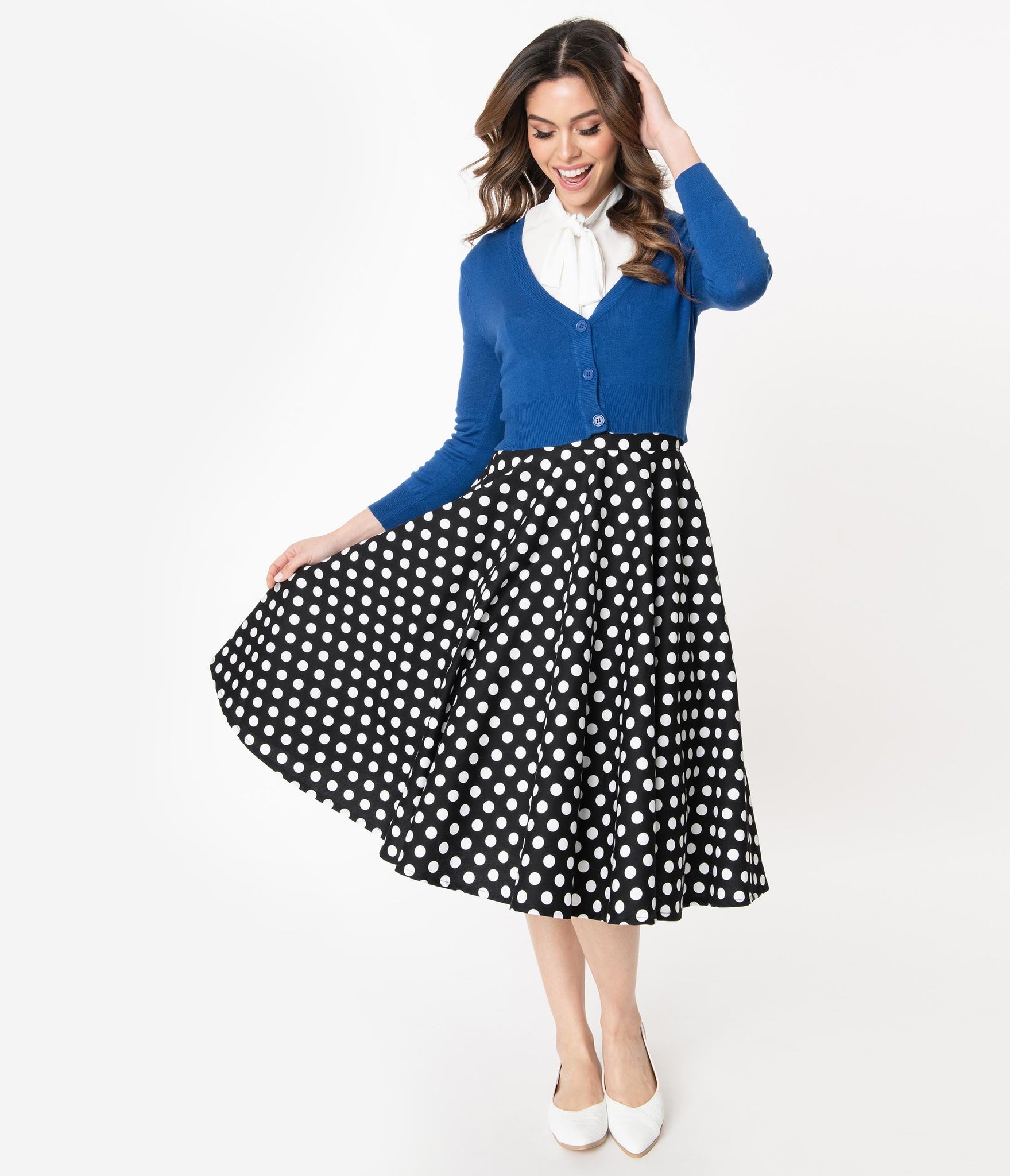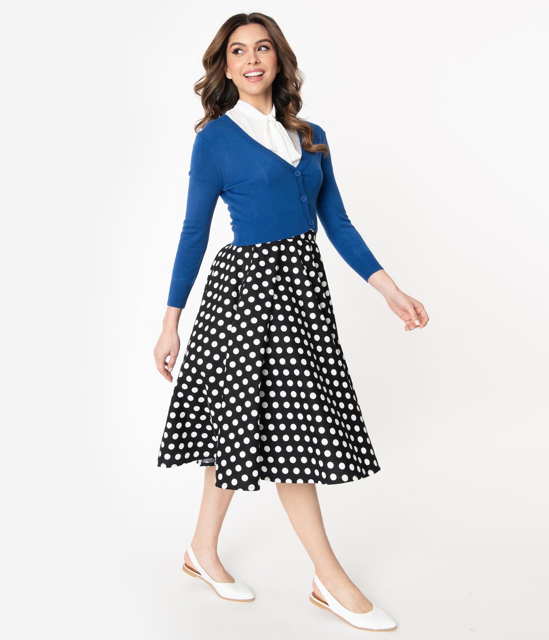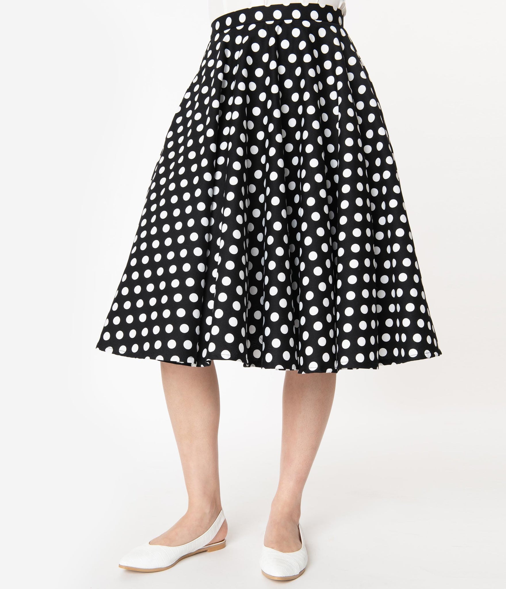 A vintage classic for a stylish dame! This adorable swing skirt is designed to cinch at the waist and dance around the hips while thrilling white polka dots dance throughout the black backdrop. Crafted in a lightweight and sturdy cotton, this knee length piece can be worn with a crinoline for a little extra flare. Featuring two side pockets and a back zipper below a button closure, this skirt is an excellent addition to your 1950s style!