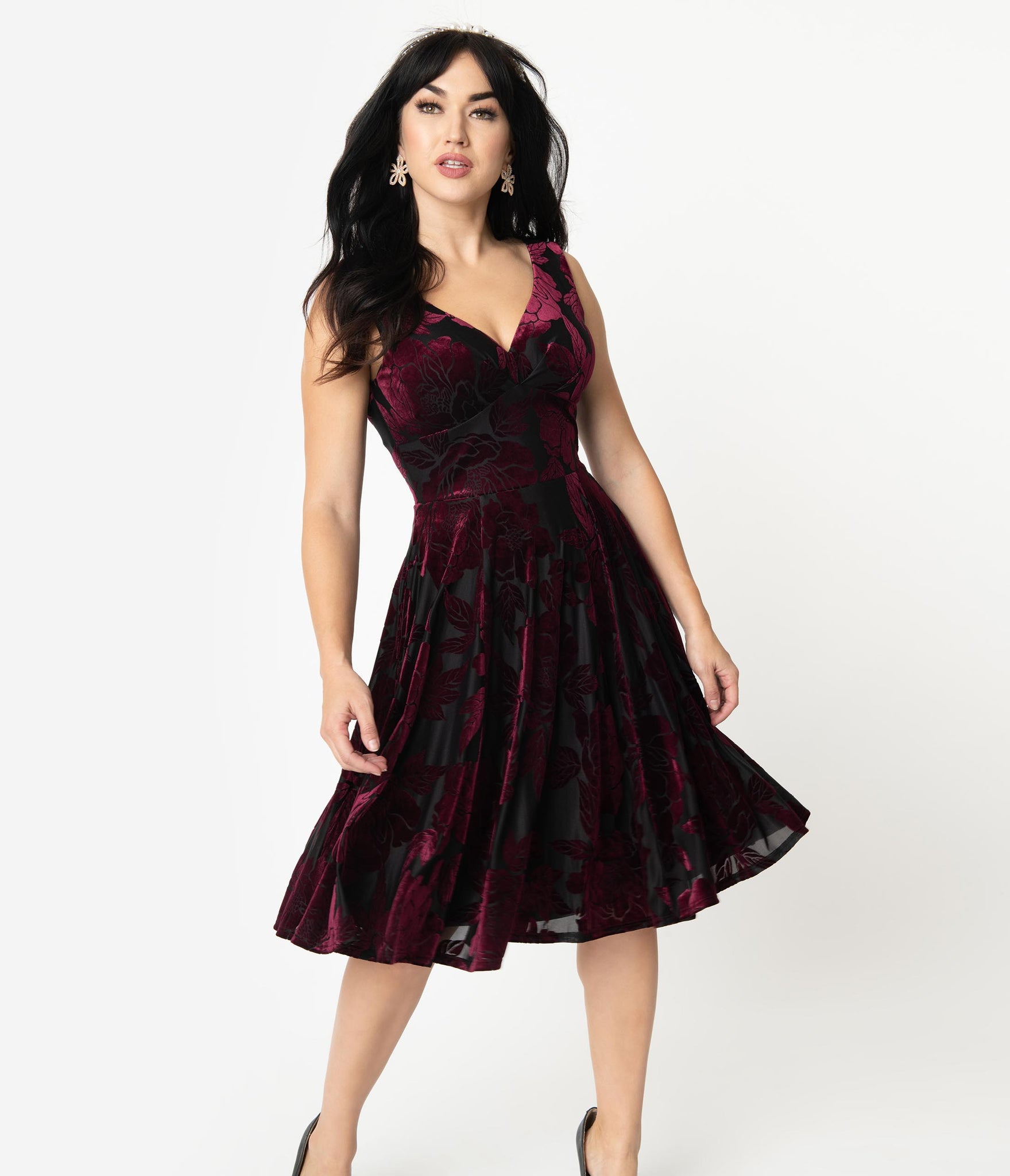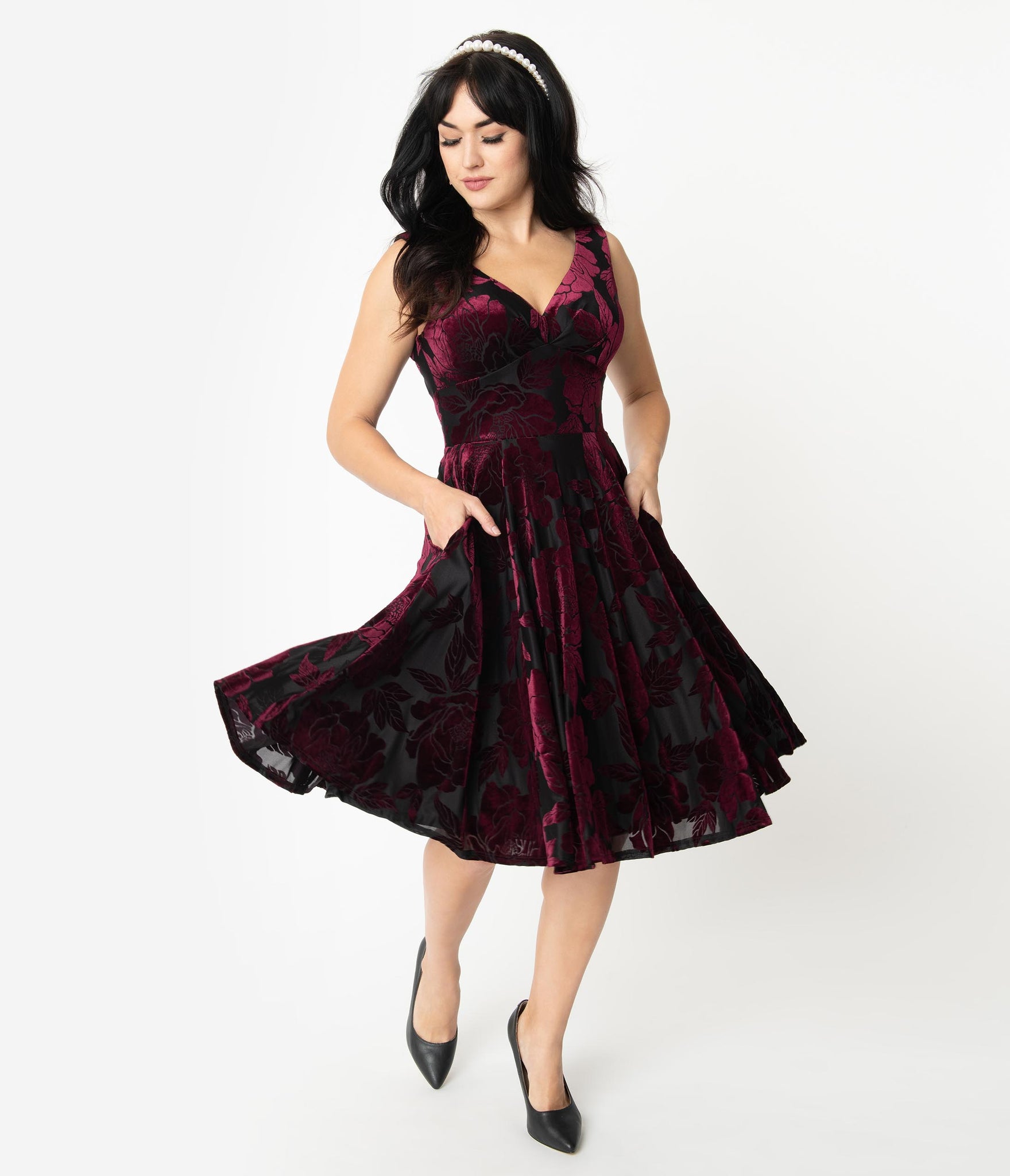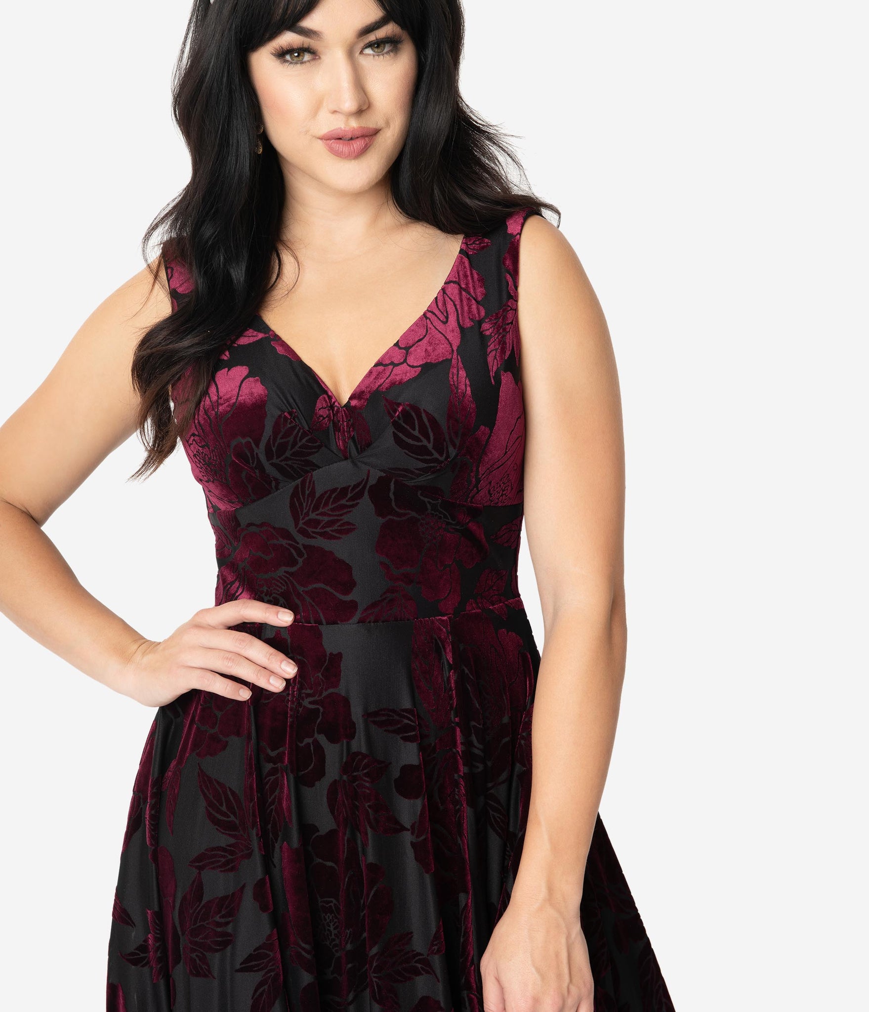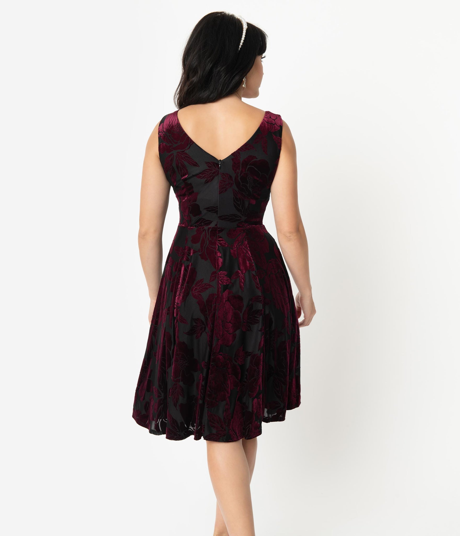 Bewitching in velvet, darlings! This sleeveless stunner is cast in a fabulous black mesh and boasts a beautiful array of wine purple florals in a striking Devore velvet. Crafted with a dash of stretch to fit flawless to your favorite curves, this feminine flare boasts a sultry v-neckline outfitted with subtle bust pleats that meet a slimming wide pointed banded waistline. The ravishing swing skirt flutters to the knees over black knit lining, outfitted with side pockets for fabulous function, while a sly back zipper and the retro silhouette create a breathtaking canvas!