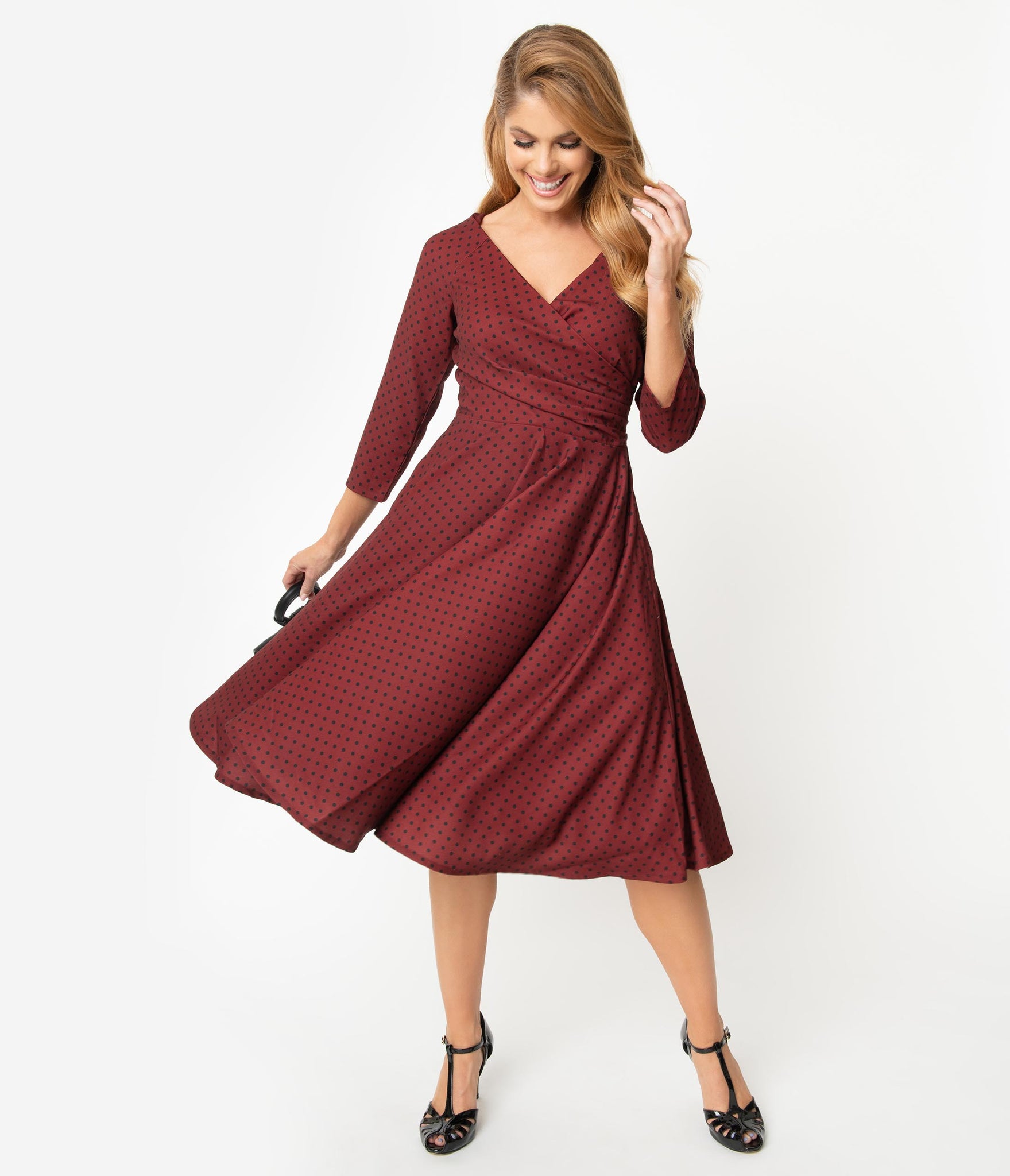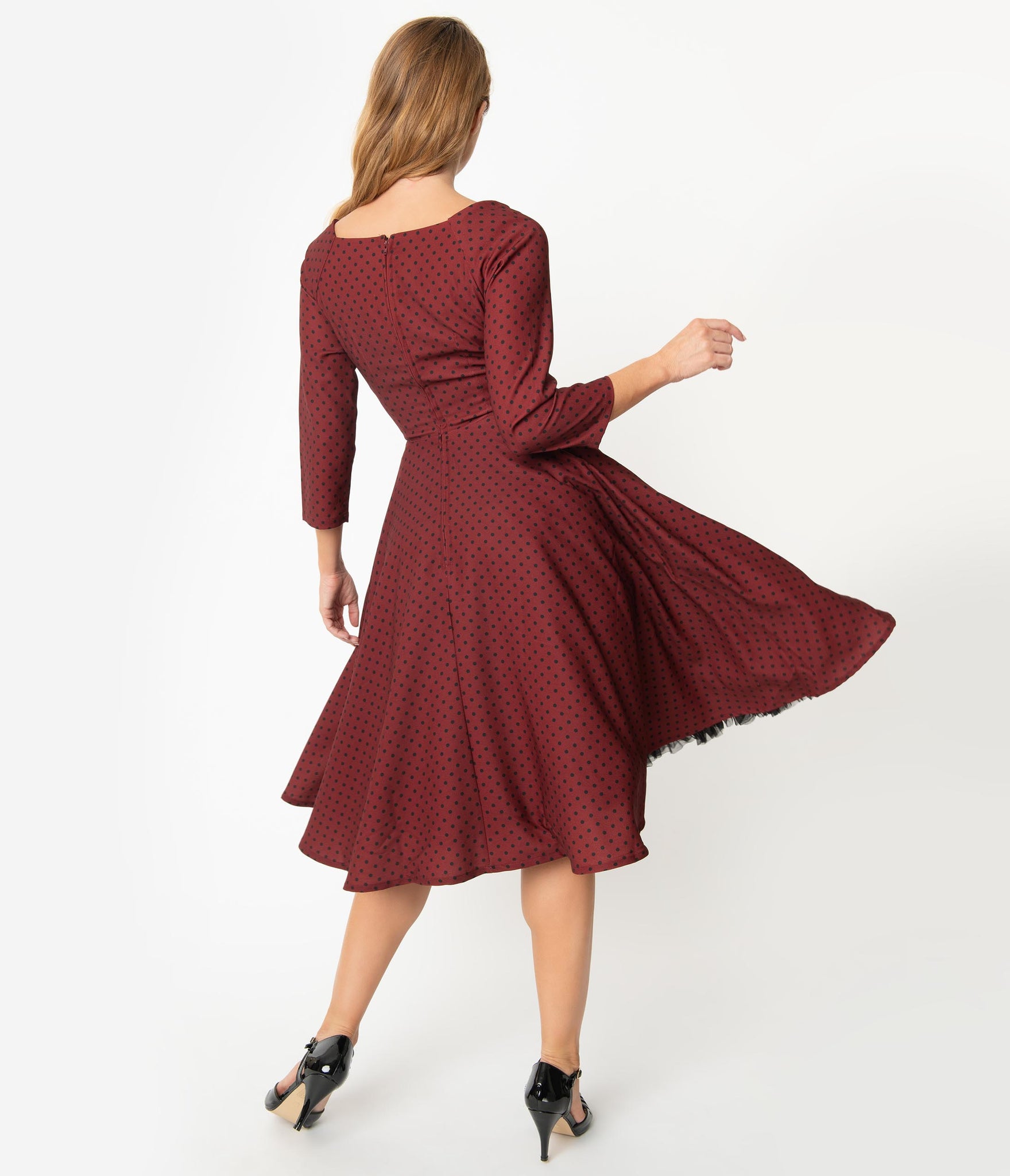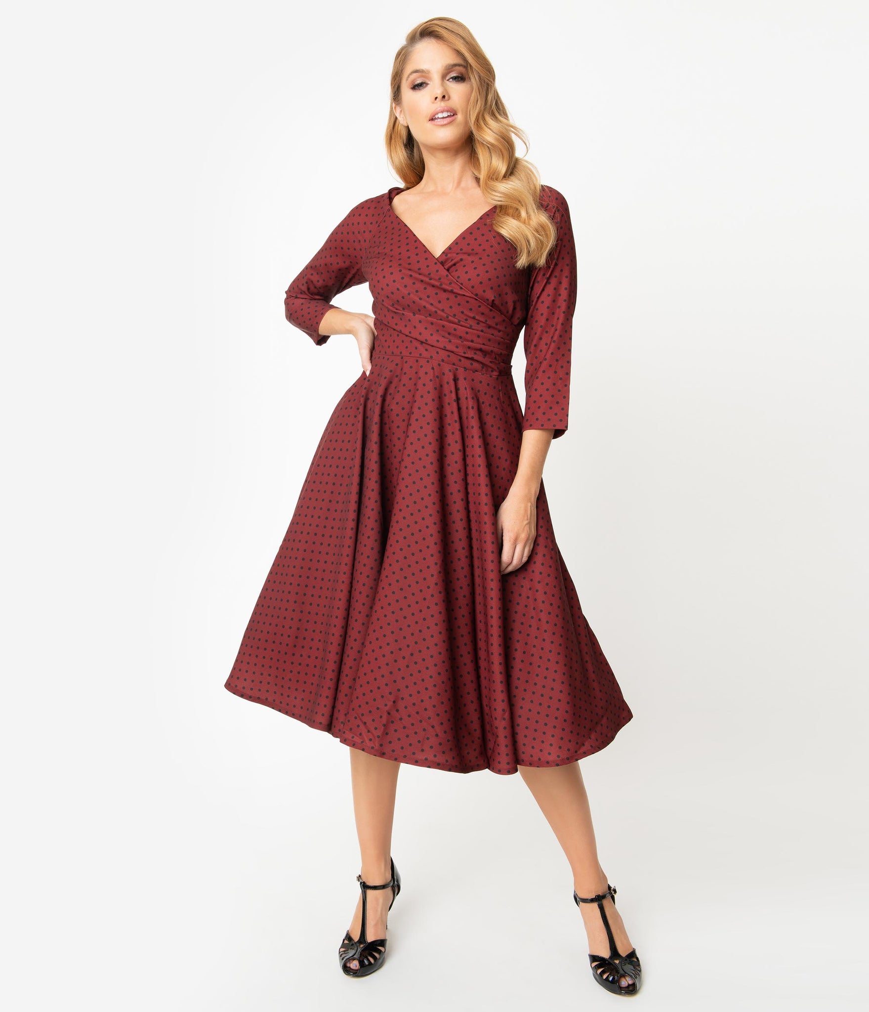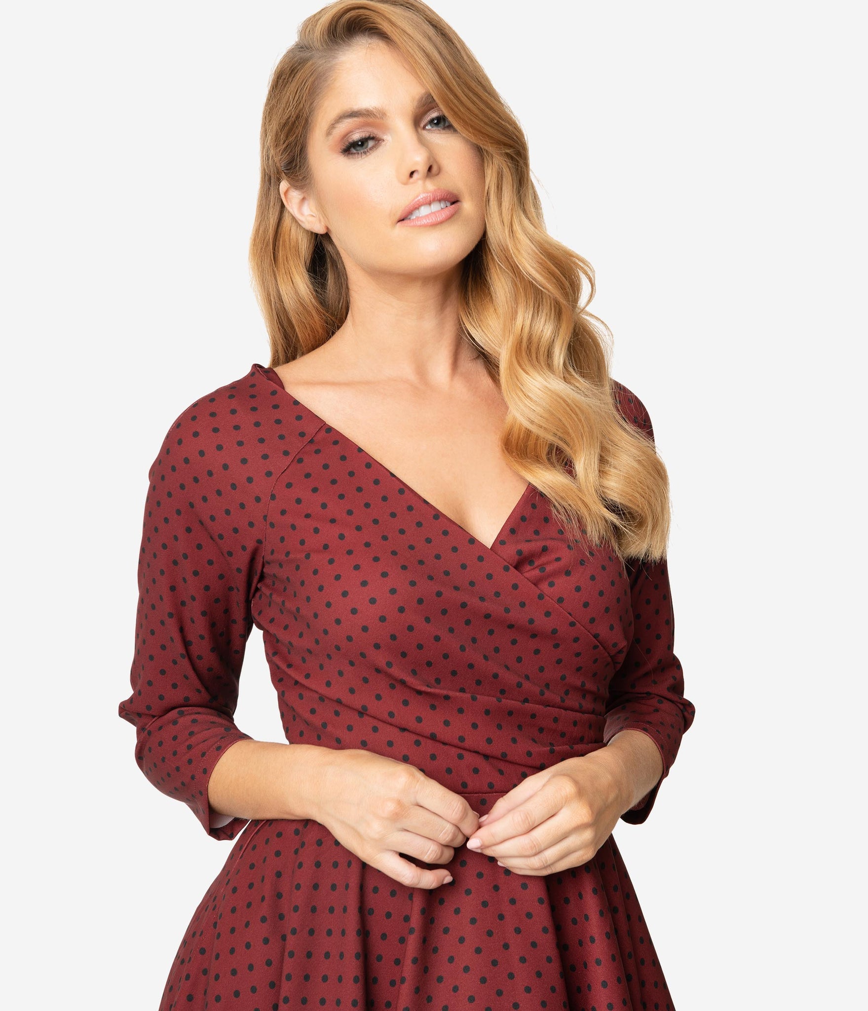 We flock to dots, gals! A gorgeous silhouette for a vintage diva, this ravishing mid-century frock features black polka dots through the burgundy red woven fabric. The sultry surplice neckline is framed by sweet three-quarter length raglan sleeves as the seamed waist is nipped in with a back zipper for a flattering fit. The sweeping swing skirt cascades past the knees, outfitted with side pockets for modern function. It’s absolutely divine!