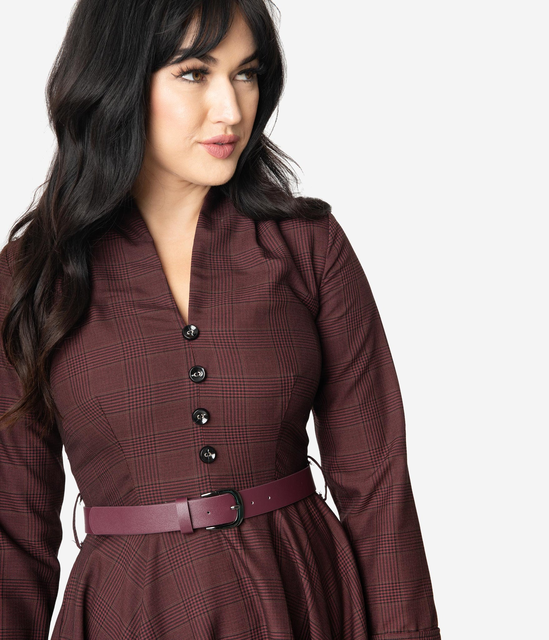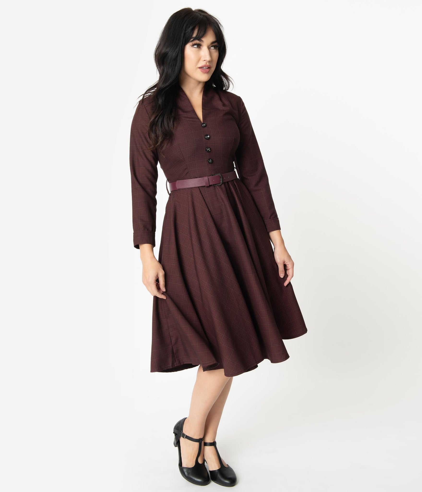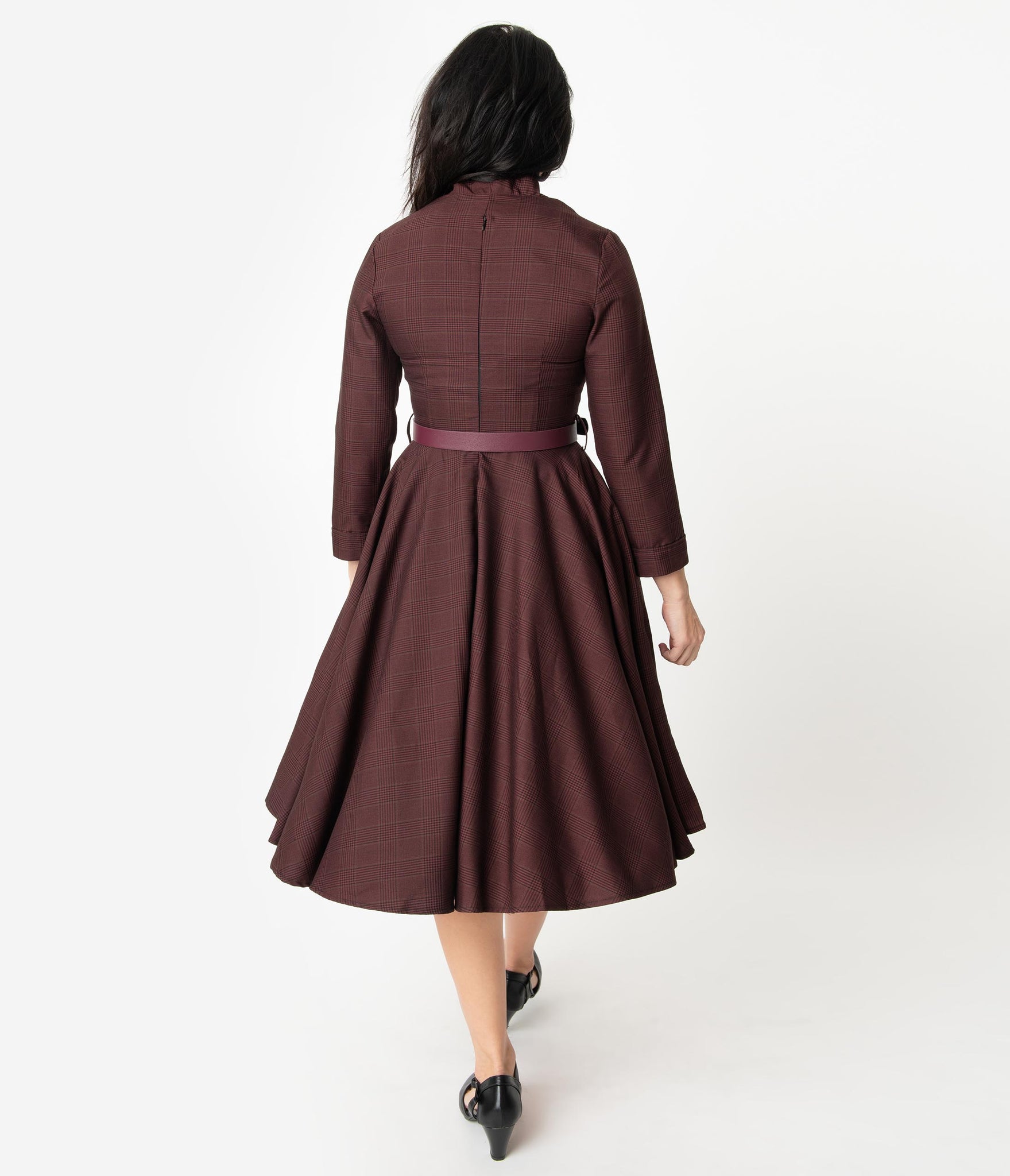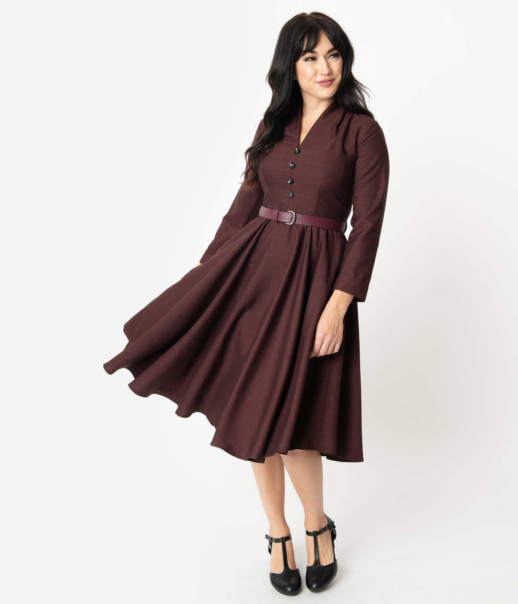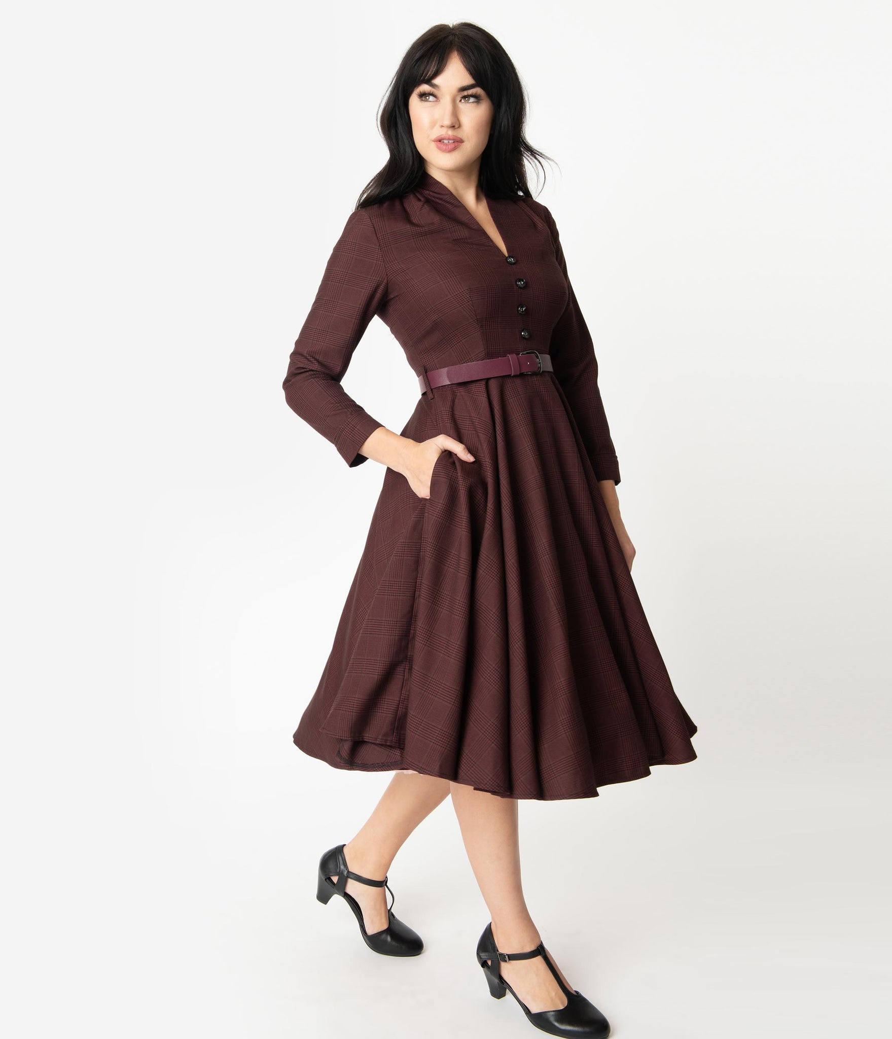 Place your bets, gals! This gorgeous swing dress is a marvelous midcentury maven crafted in a sturdy woven blend that exudes class with it’s dark burgundy glen check pattern throughout. The darted bodice features a faux button up front and a modest V-neckline for delightful vintage accents while the slender long sleeves keep you workplace casual. The seamed waist is nipped in with a leatherette belt as the swinging skirt sweeps to your knees, complete with side pockets for modern function. Outfitted with a mid back zipper, it’s a winner!