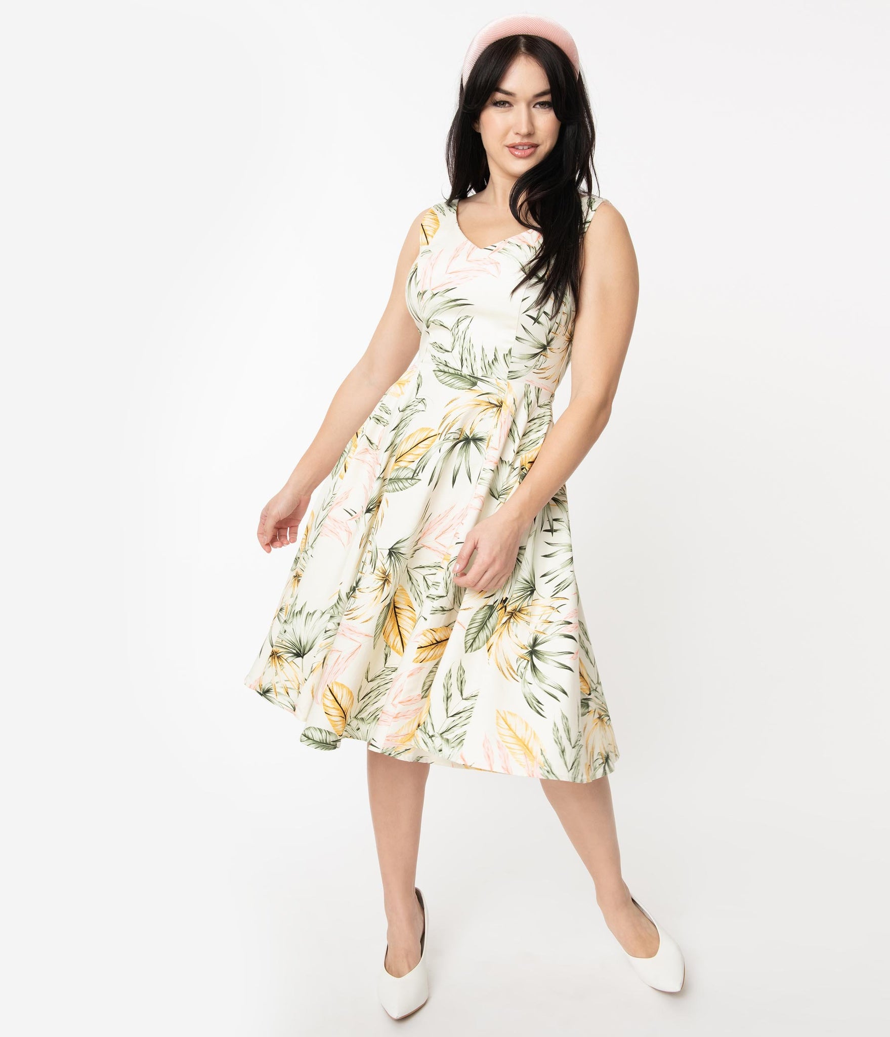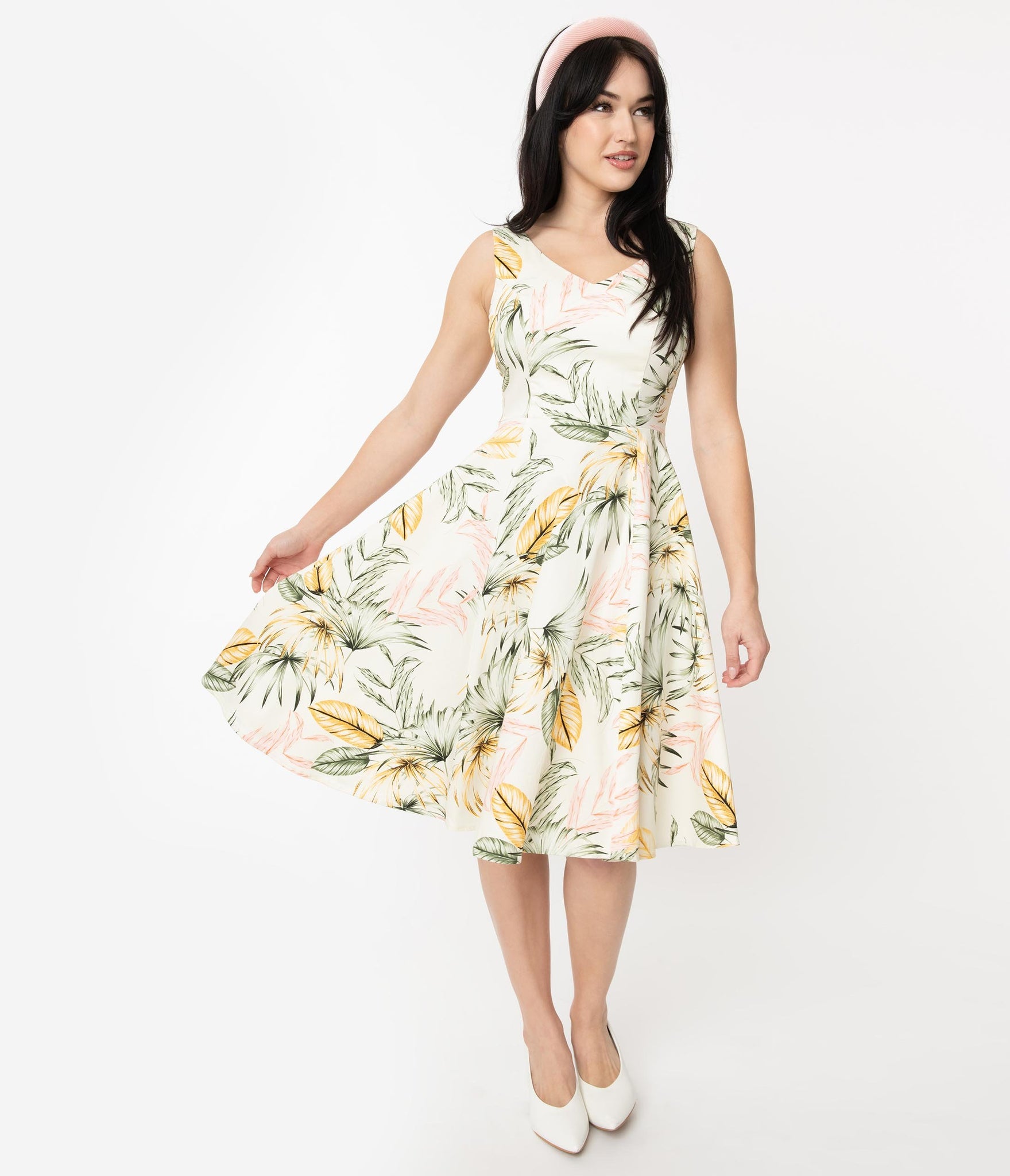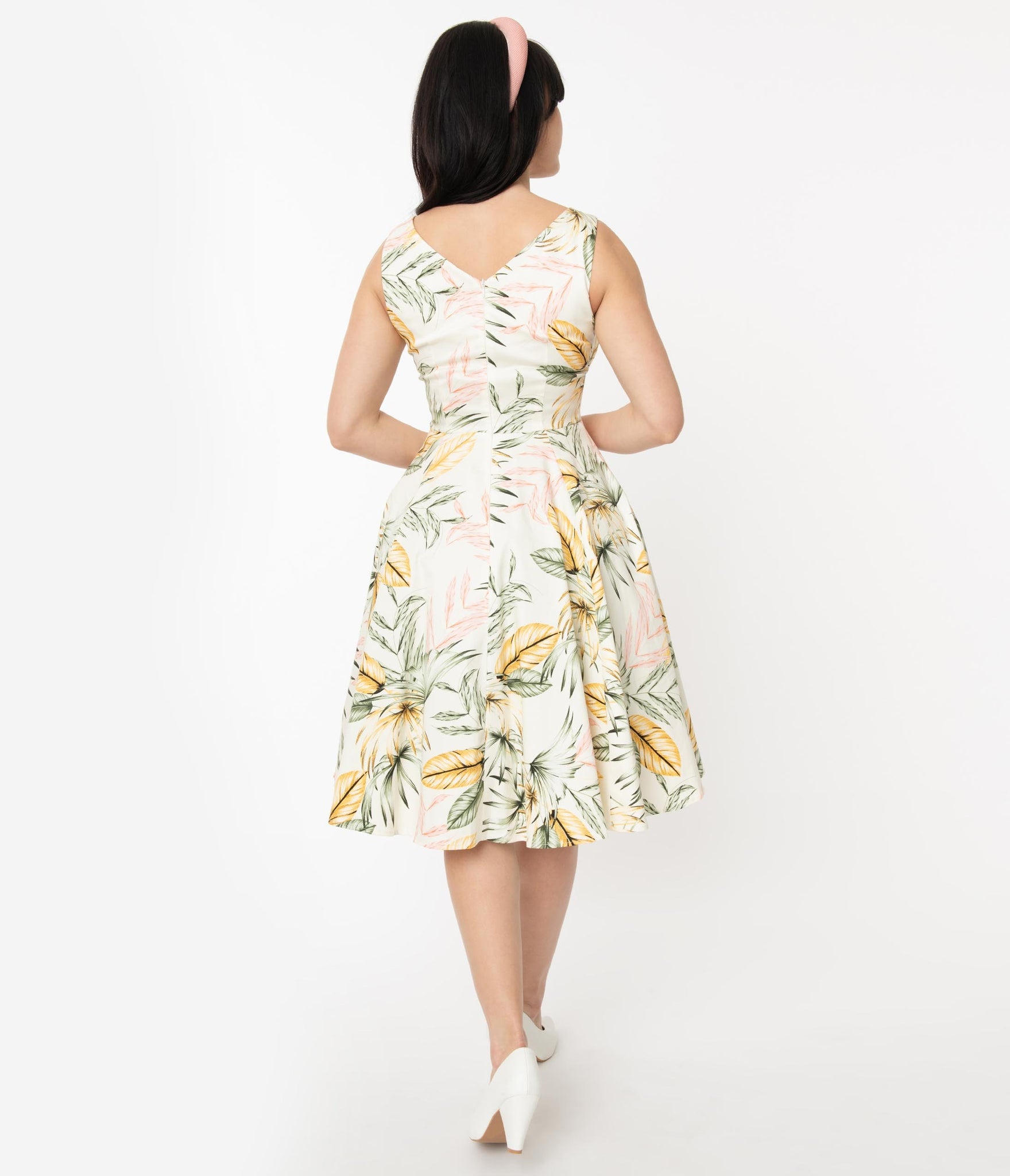 The perfect accessory is a tropical scene! Cast in a fabulous cotton stretch and boasting a bountiful array of palm fronds in green, yellow, and pink set against a cream backdrop, this vintage style swing dress is made to wonderfully accentuate your form. With a ravishing sleeveless design, the darted bodice features an iconic V-neckline for flirtatious form while the seamed waist centers your hourglass shape. The mid-century swing skirt cascades beautifully around your curves to a straight hem at your knees while side pockets keep your essentials close at hand. Outfitted with a back zipper to nip in your figure, it’s a darling essential for tiki divas!