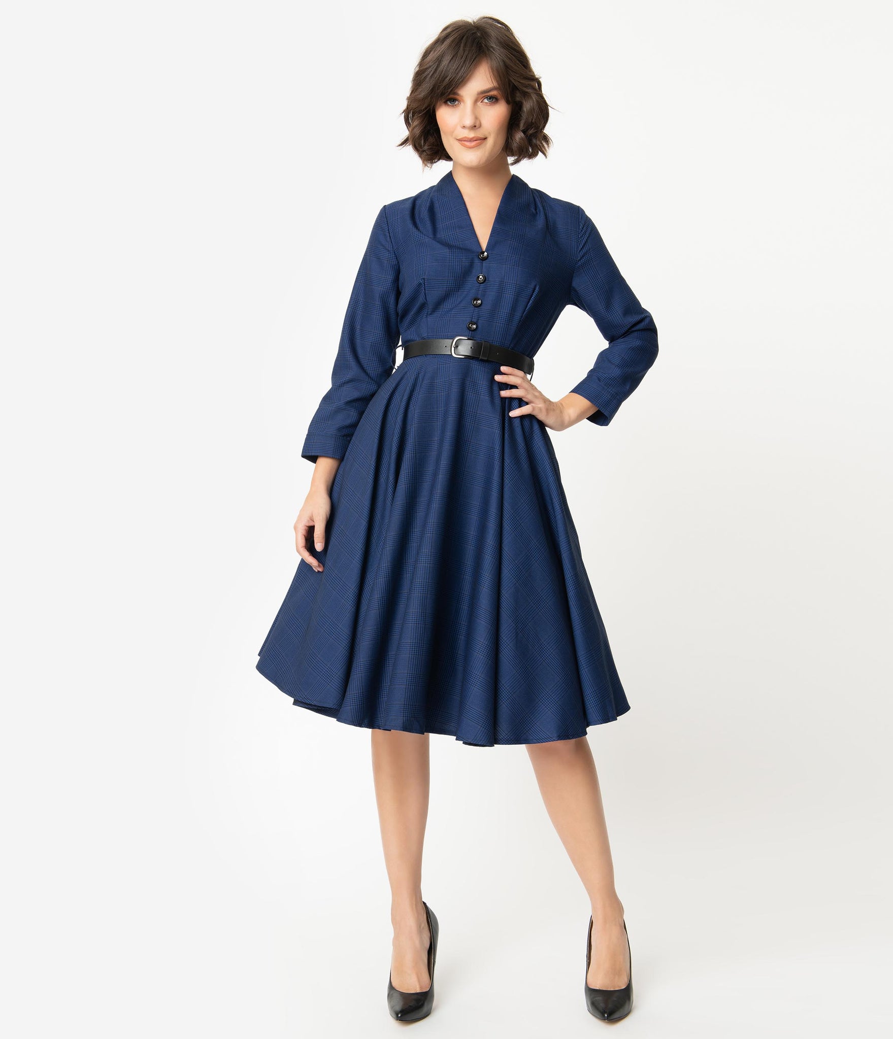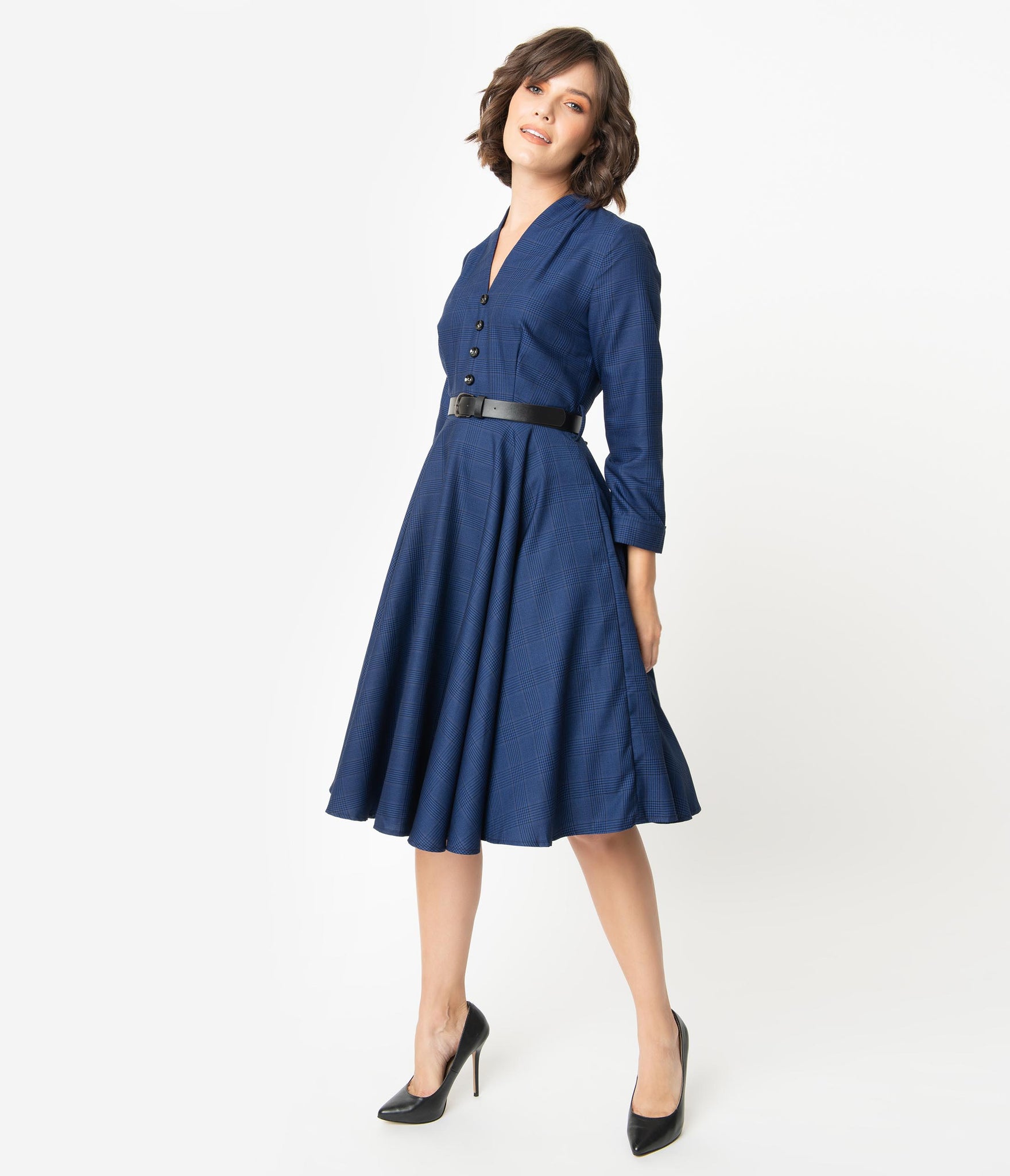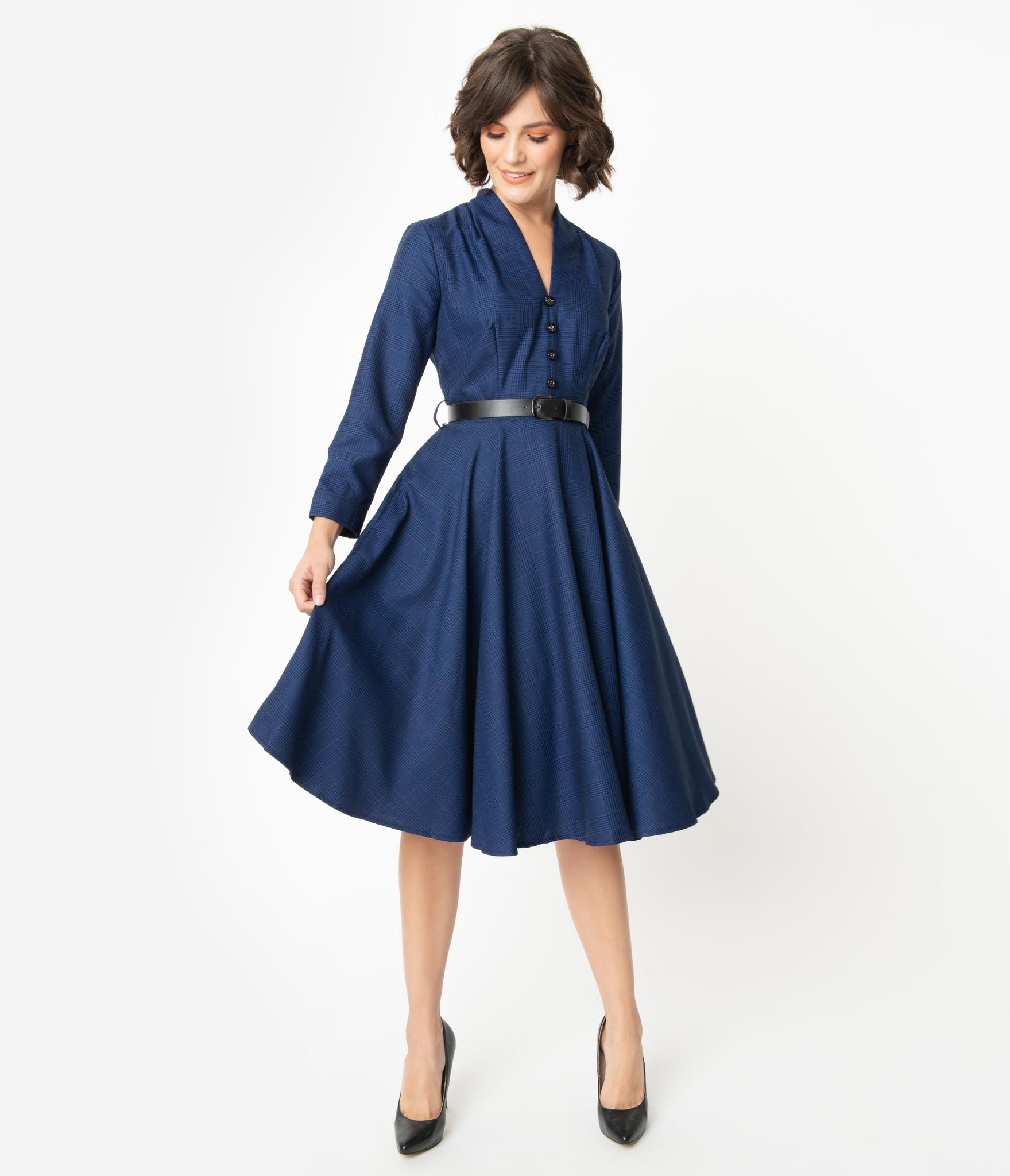 Place your bets, gals! This gorgeous swing dress is a marvelous midcentury maven crafted in a sturdy woven blend that exudes class with it’s navy blue glen check pattern throughout. The darted bodice features a faux button up front and a modest V-neckline for delightful vintage accents while the slender long sleeves keep you workplace casual. The seamed waist is nipped in with a leatherette belt as the swinging skirt sweeps to your knees, complete with side pockets for modern function. Outfitted with a mid back zipper, it’s a winner!