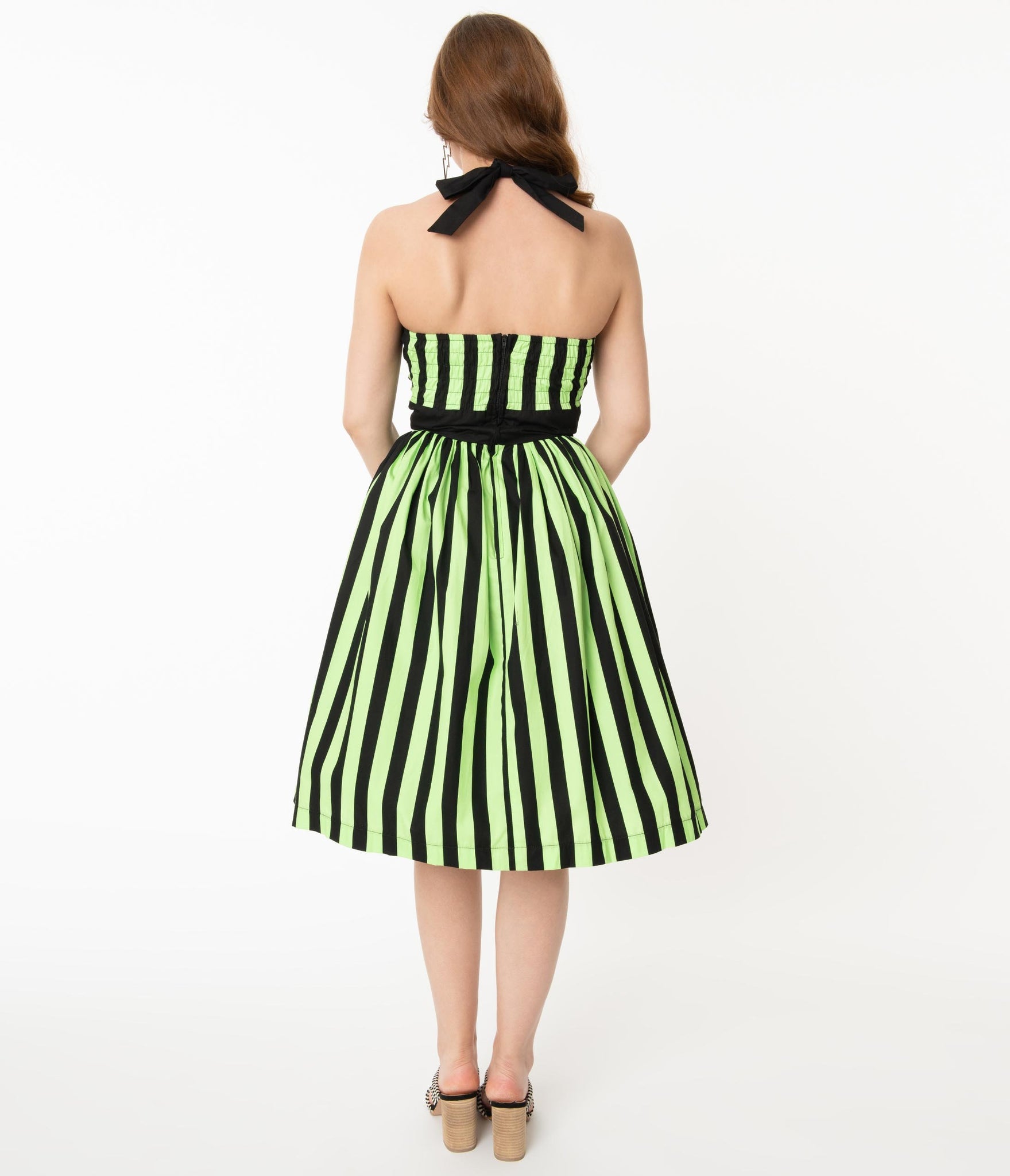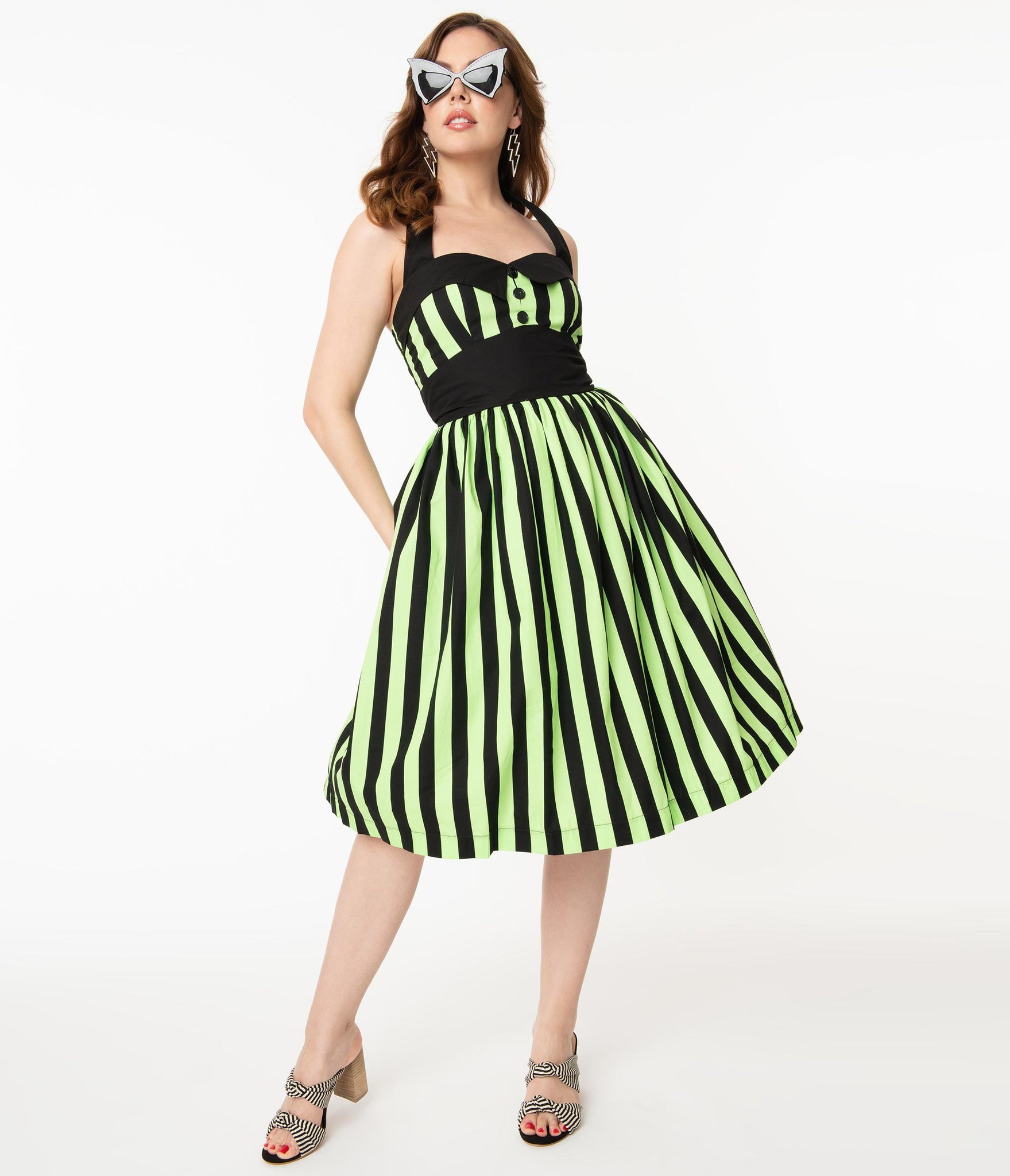 A darling component for your spells, doll! Meant for a fabulous charmer, this hypnotizing silhouette is crafted in a marvelous cotton and boasts neon green and black stripes throughout. The darted bodice features a folded neckline and faux buttons for a dash of retro style while a self tie halter and a back smocked panel lend a flattering fit. The wide banded waist is cinched with a back zipper as the gathered swing skirt drops to your knees, complete with side pockets for functional fun!