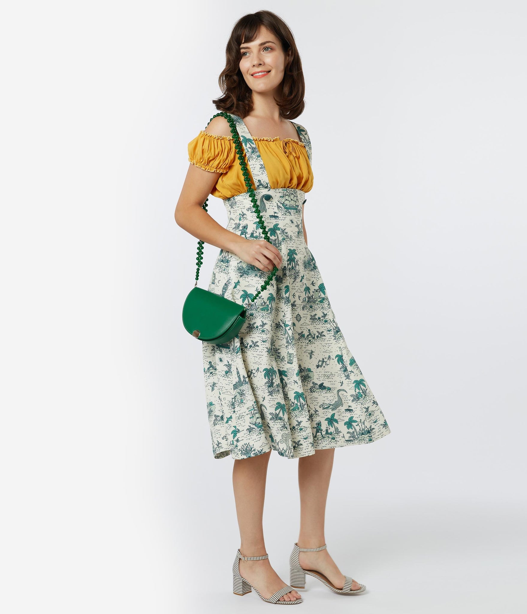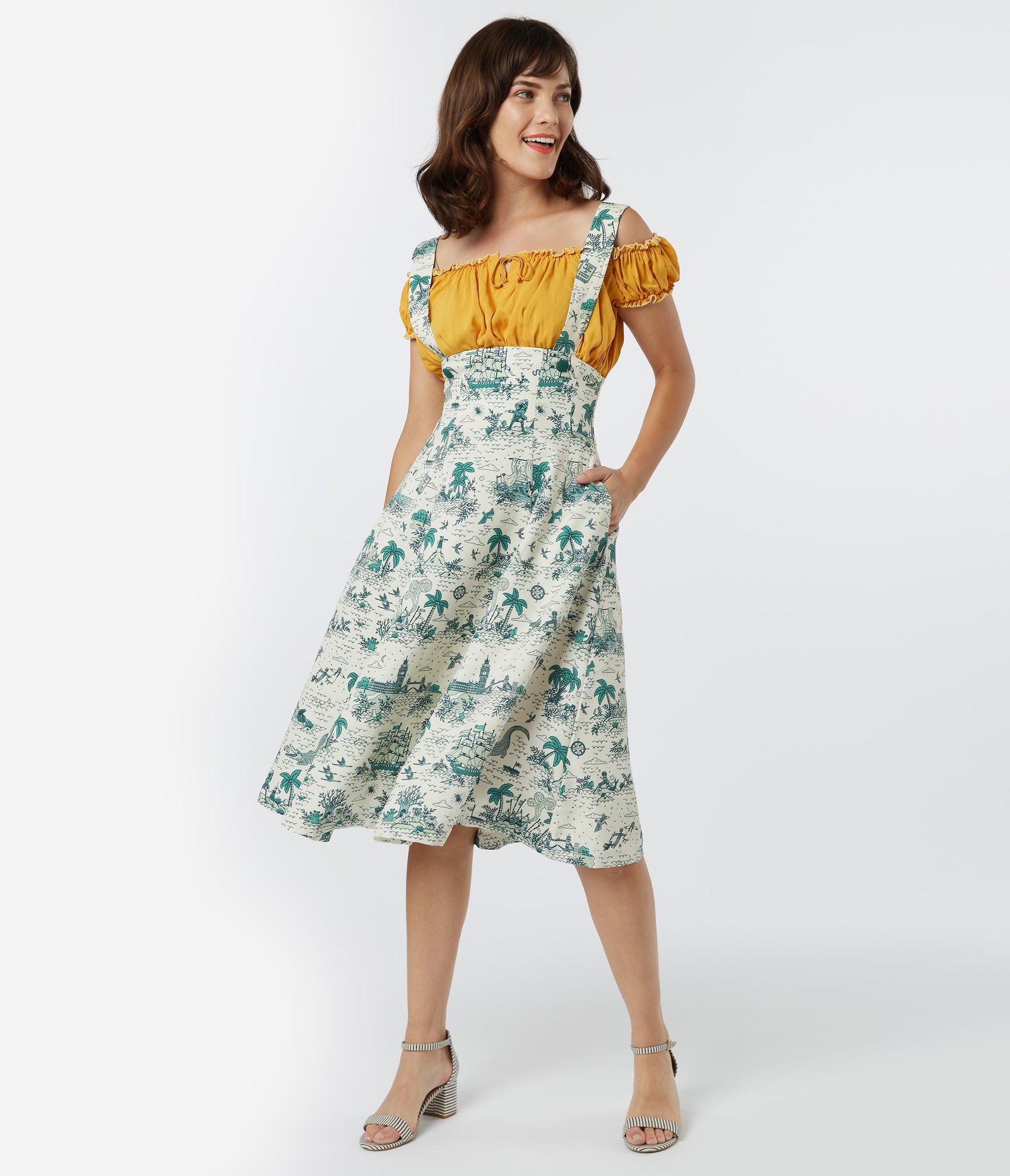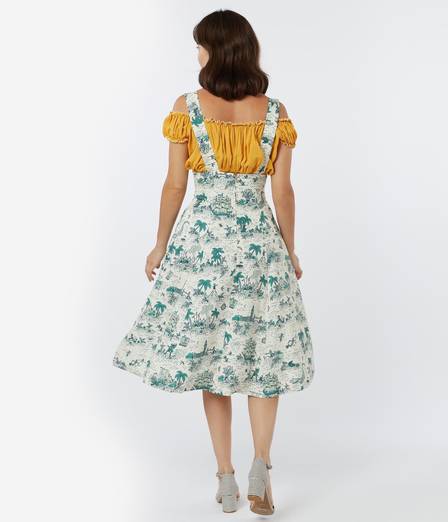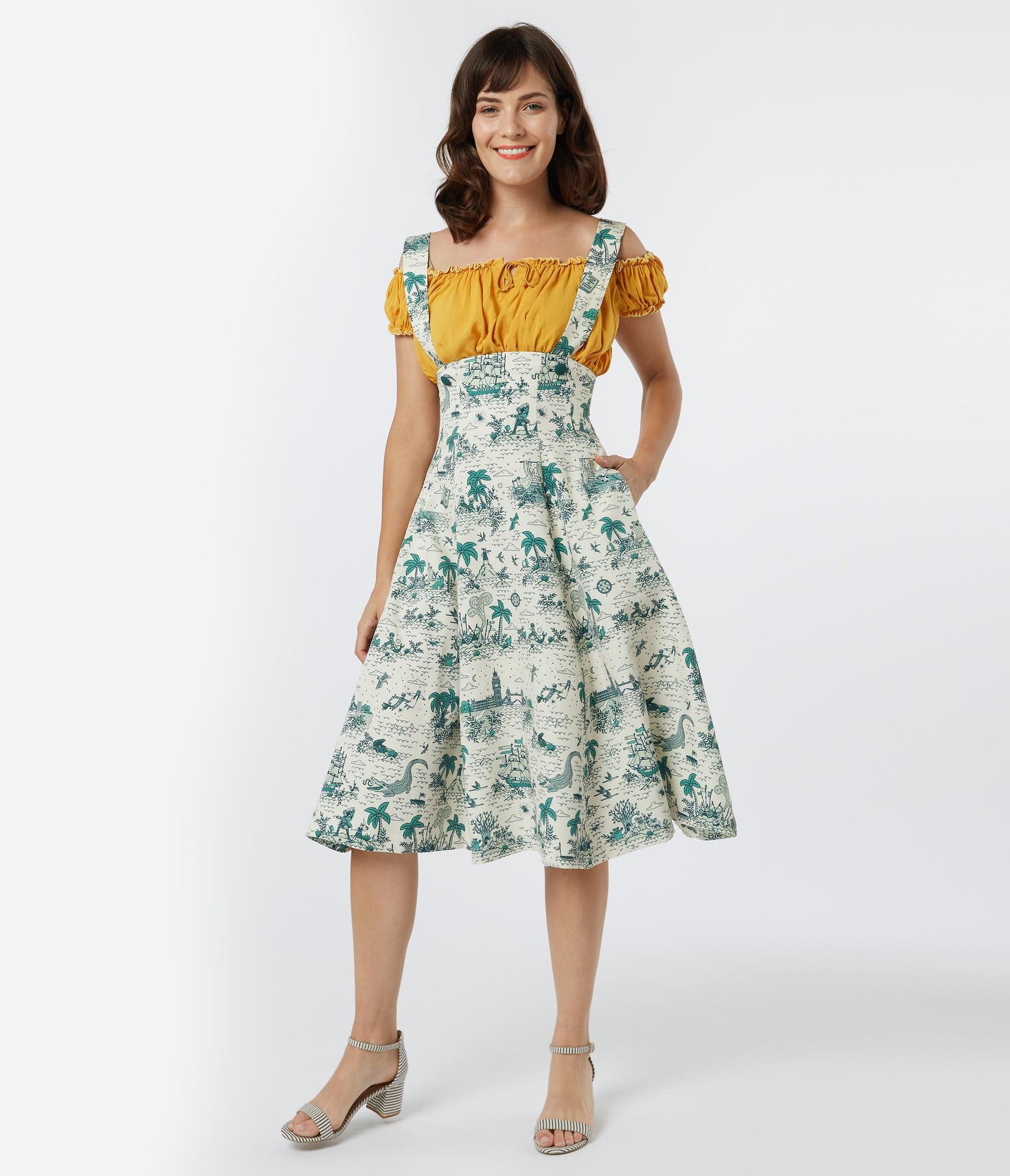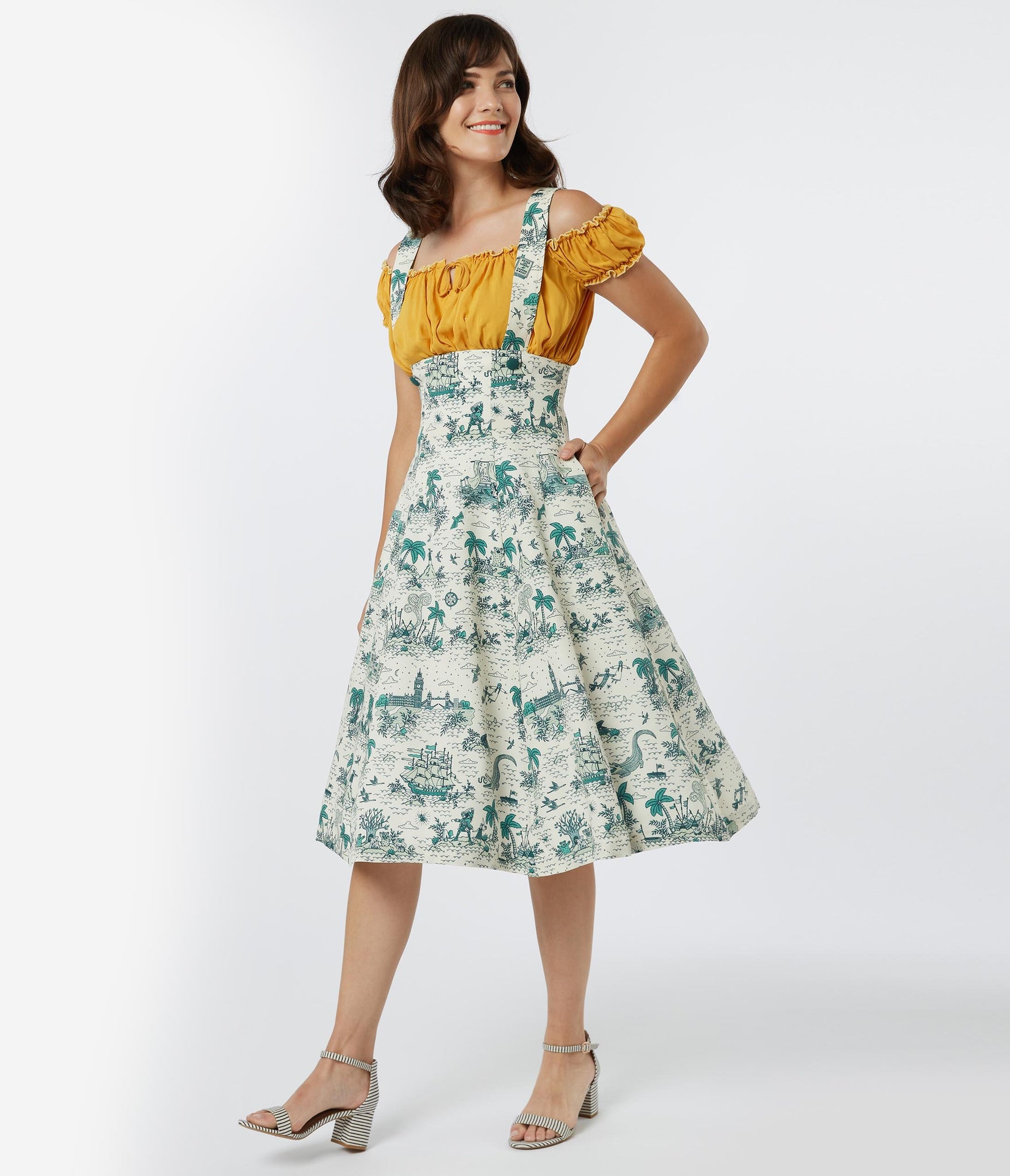 Faith, trust, and pixie dust! Set sail on a new adventure in this playful separate from Tatyana. Boasting a beautiful print inspired by F. D. Bedford’s illustrations in J. M. Barrie’s 1911 novel ‘Peter and Wendy’ the sweeping swing style is secured with suspender straps while a back zipper nips in the seamed and paneled silhouette. We’ll never grow up!