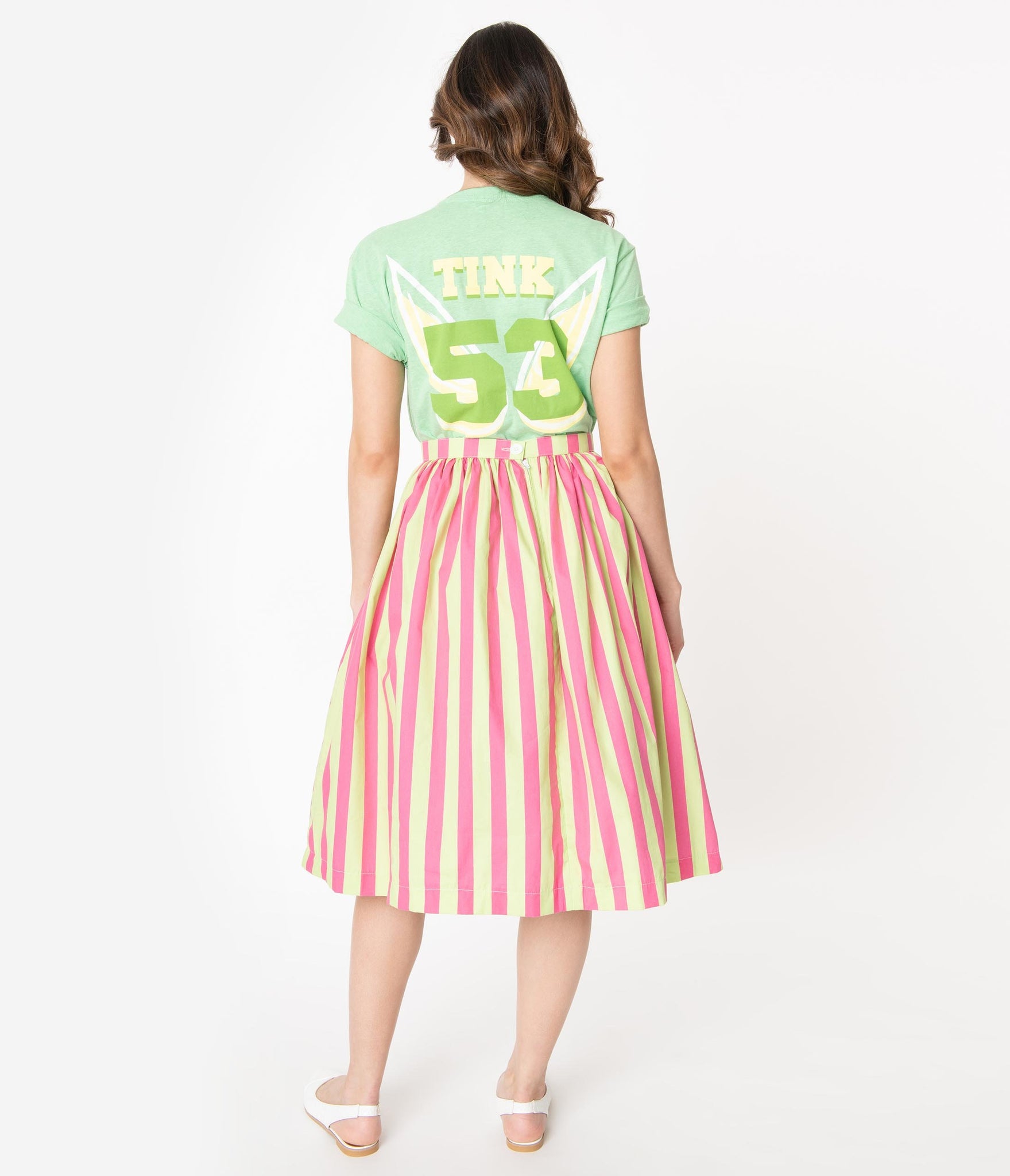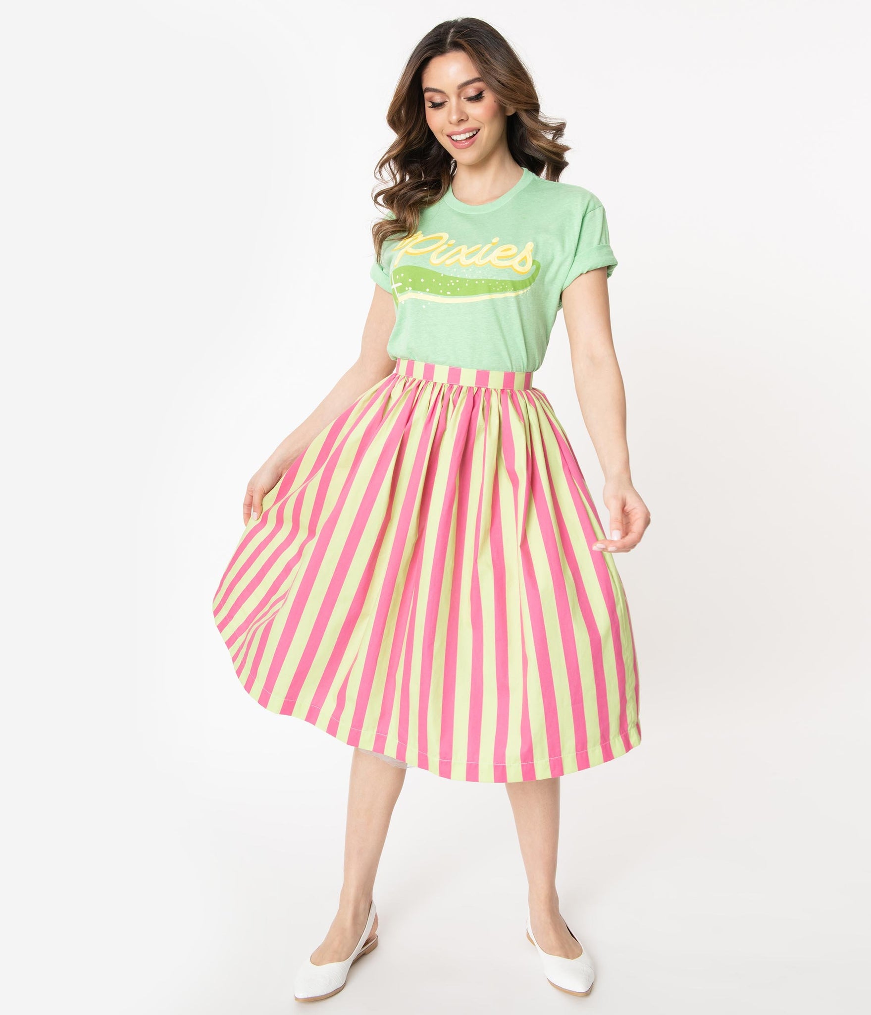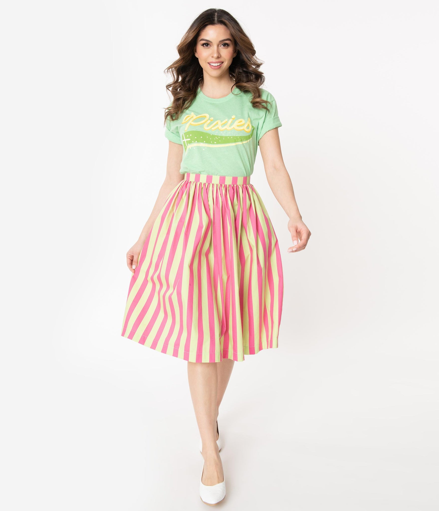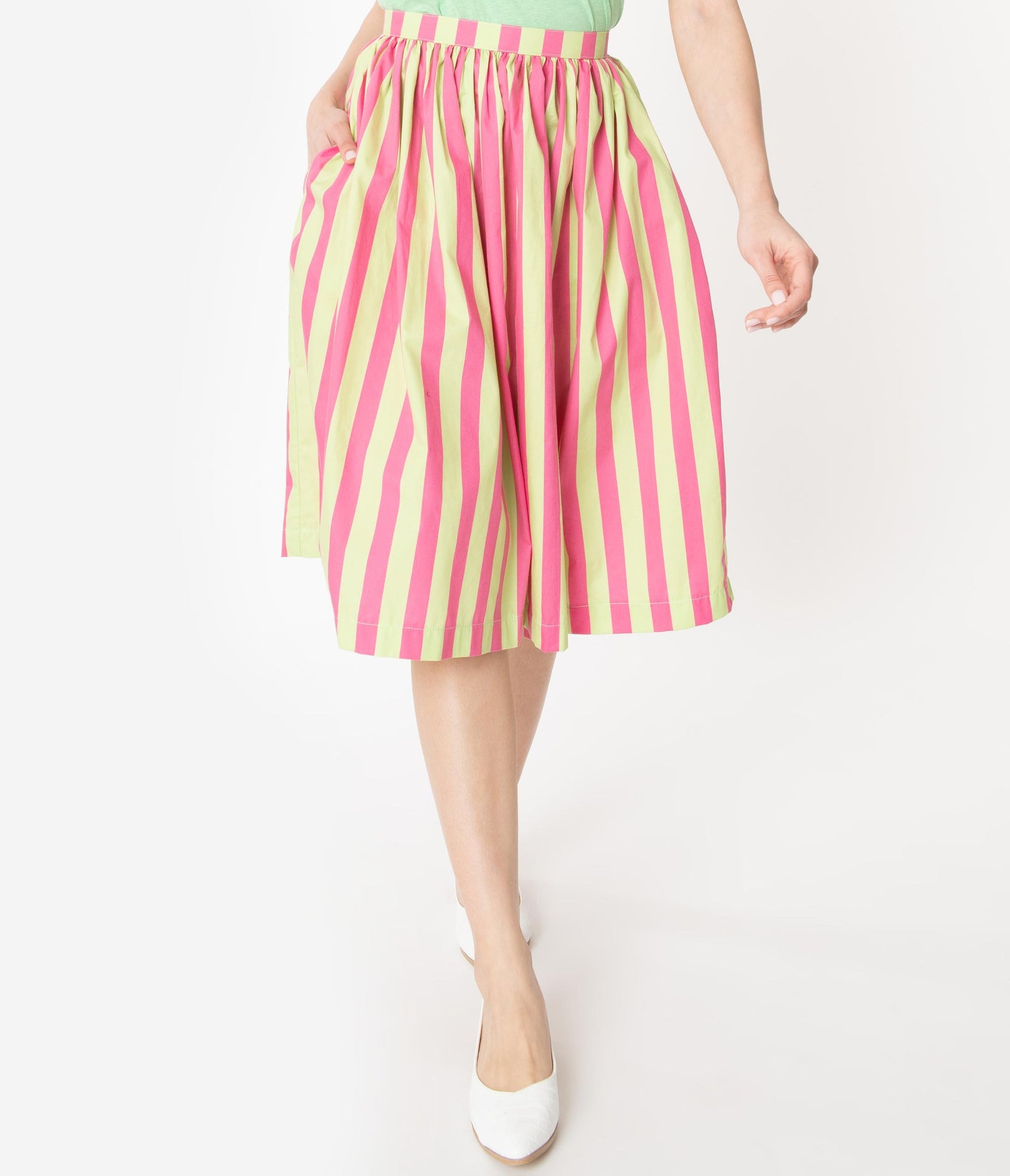 An eye-catching classic for a stylish dame! This sweet swing skirt is designed to cinch at the waist and dance around the hips in subtle gathers while thrilling mint green and pink stripes run through the silhouette. Crafted in a lightweight and sturdy cotton, this knee length piece can be worn with a crinoline for a little extra flare. Featuring two side pockets and a back zipper below a button closure, this skirt is an excellent addition to your 1950s style!