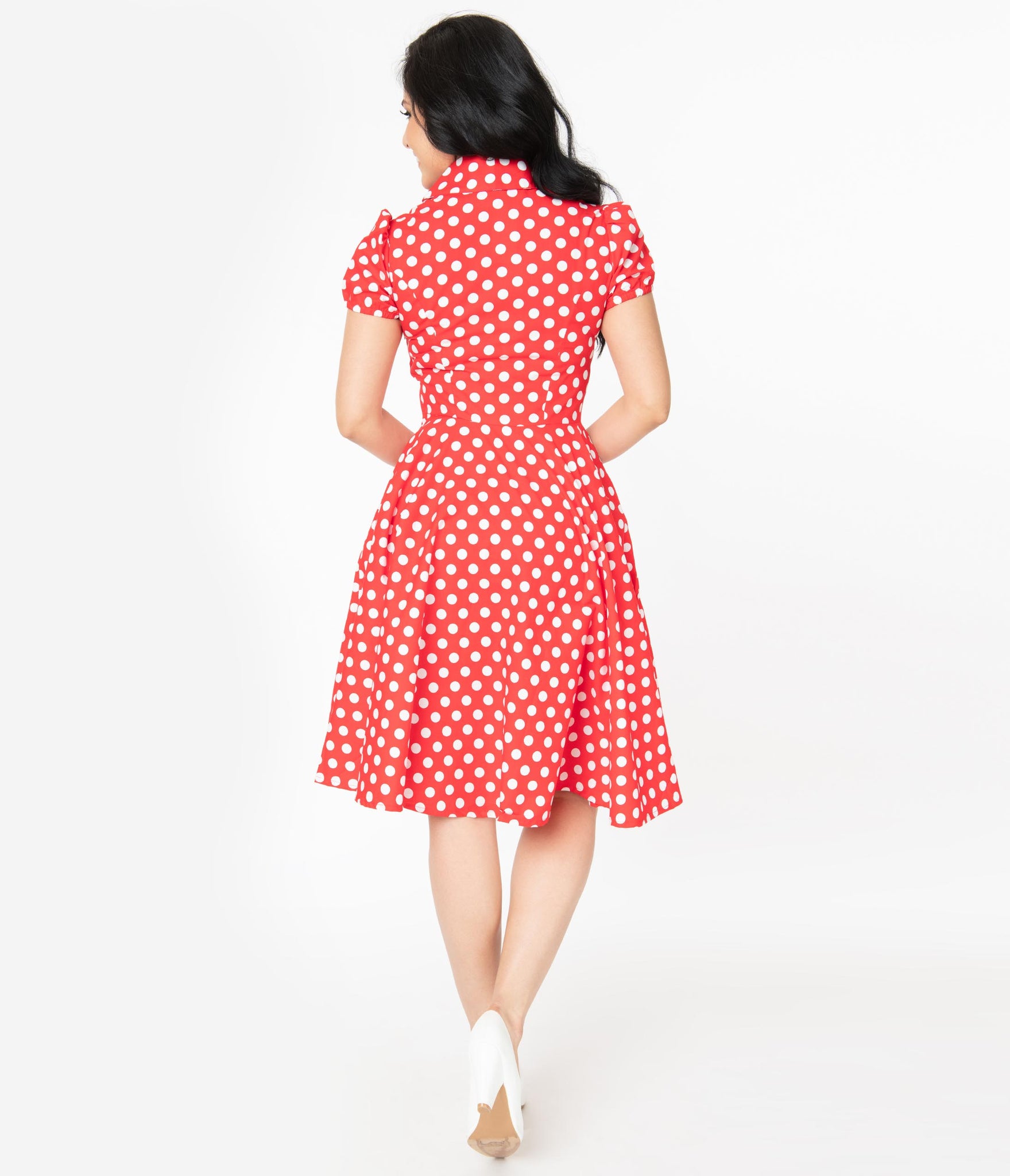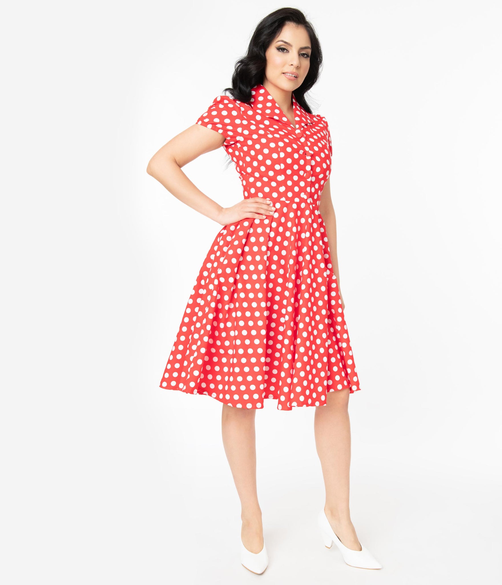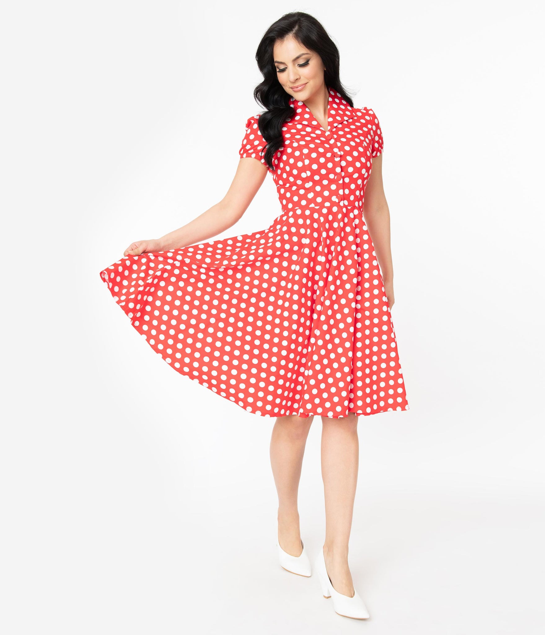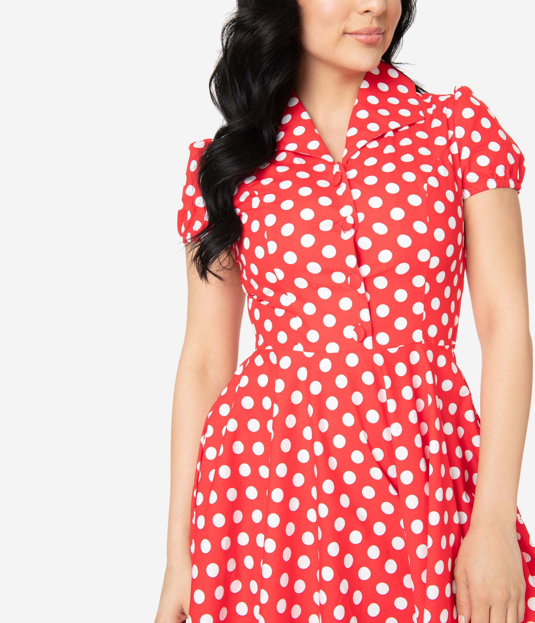 Add some fun to your wardrobe! This gorgeous swing dress is fashioned in a cotton woven fabric and features a brilliant red with white polka dots throughout the mid-century design. Short sleeves have elasticized cuffs that stay in place all day, while the front button closure and side zipper nip in your figure. The 1950s inspired silhouette is created with seams along the fitted bodice as a high waistline design that gives you the popular hourglass shape. Outfitted with functional side pockets for a truly adorable look!