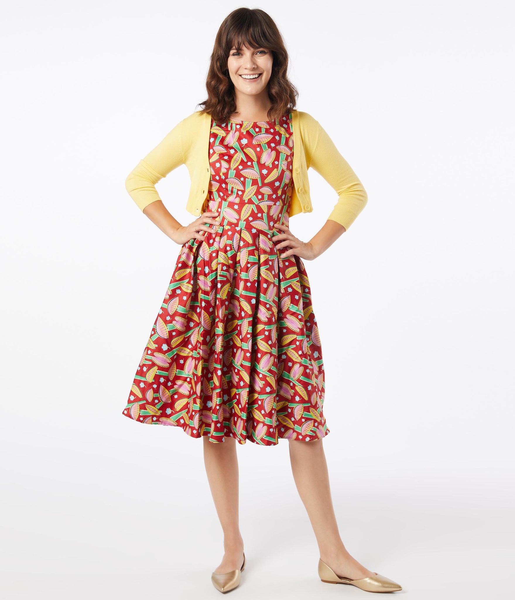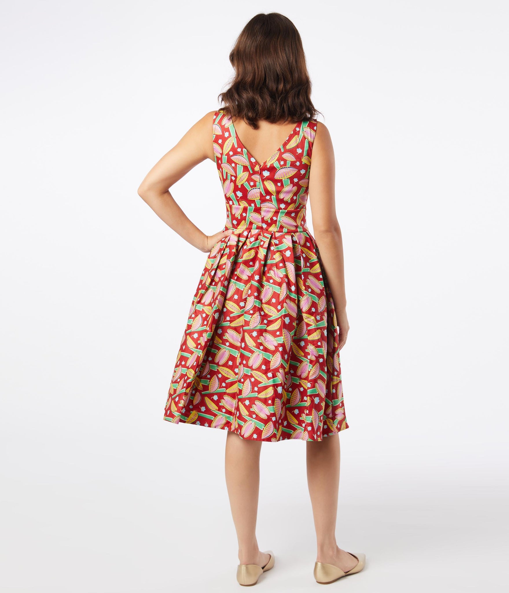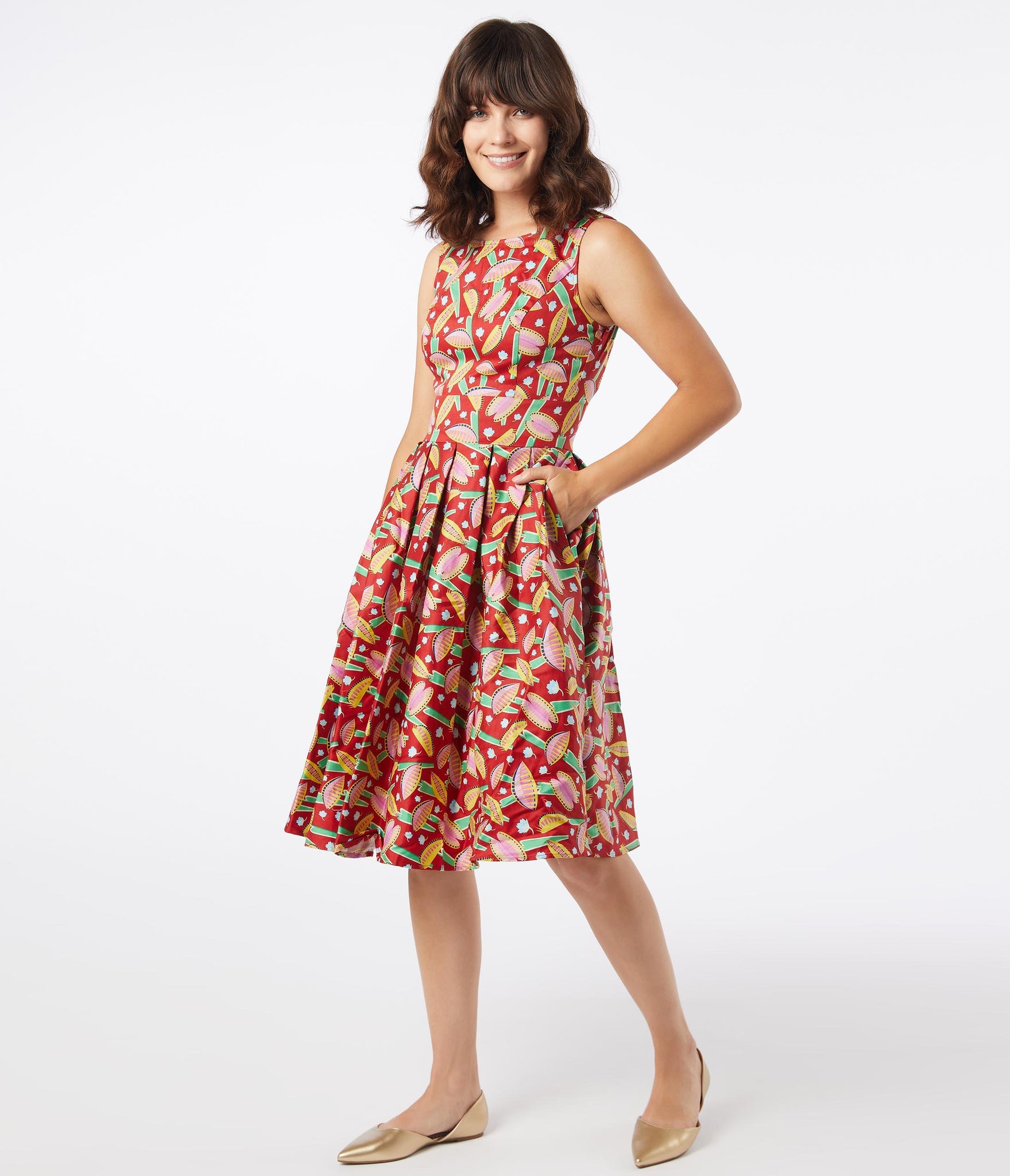 Don’t forget to feed them, darlings! This marvelous mid-century maneater features a bright print of Venus fly traps in stunning colors of red, yellow, pink, and green throughout the sweet swing silhouette. Crafted in a fabulous cotton, the sleeveless design tops a wide banded waist, cinched with a back zipper for a flattering figure. The deadly swing skirt boasts darling pleats and hidden side pockets to stow away your catch!