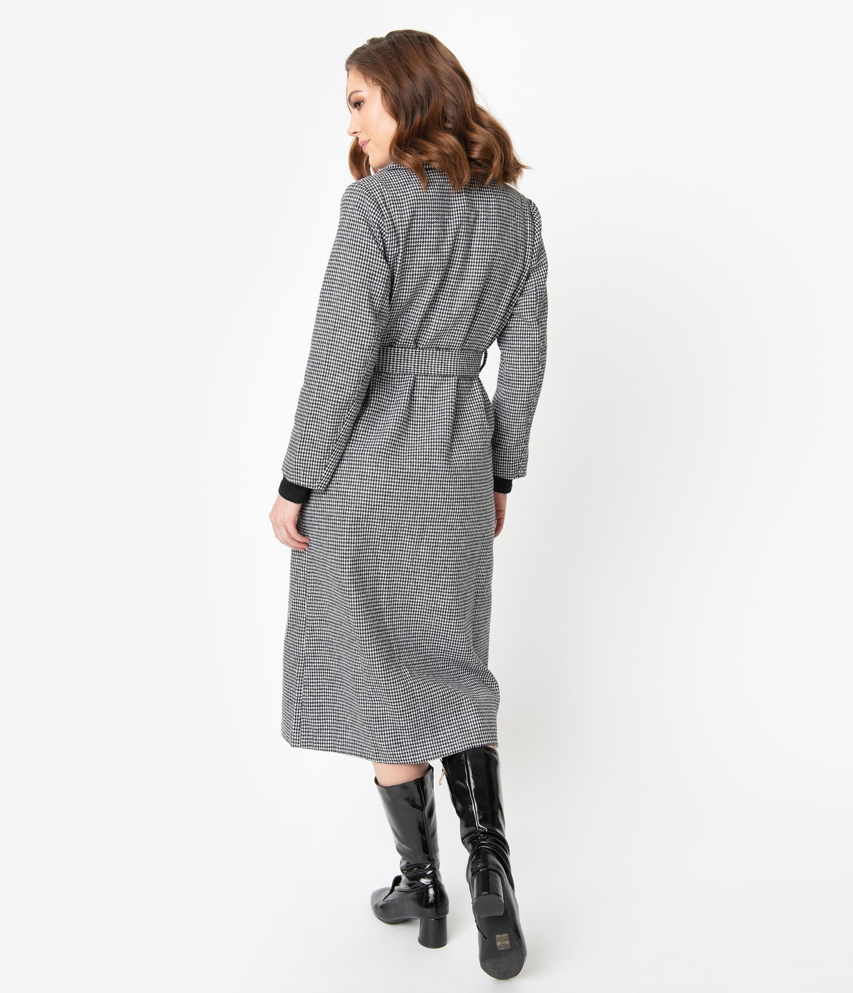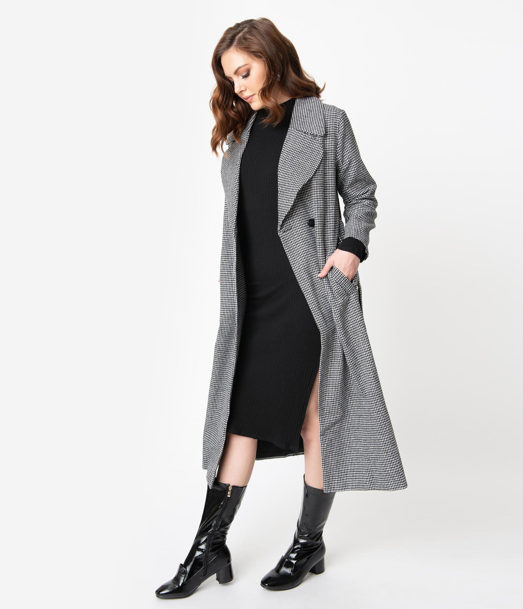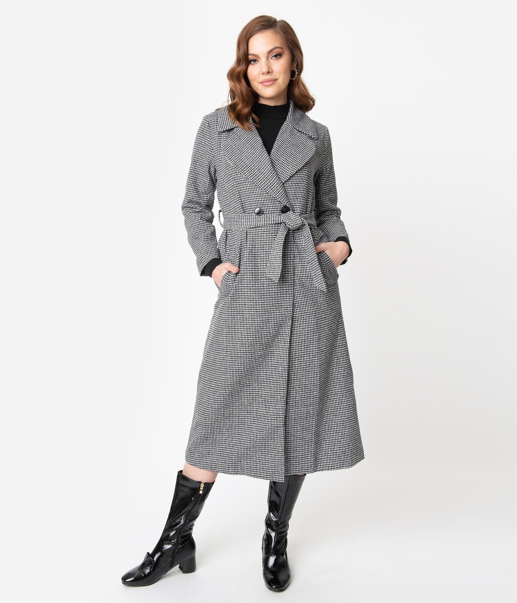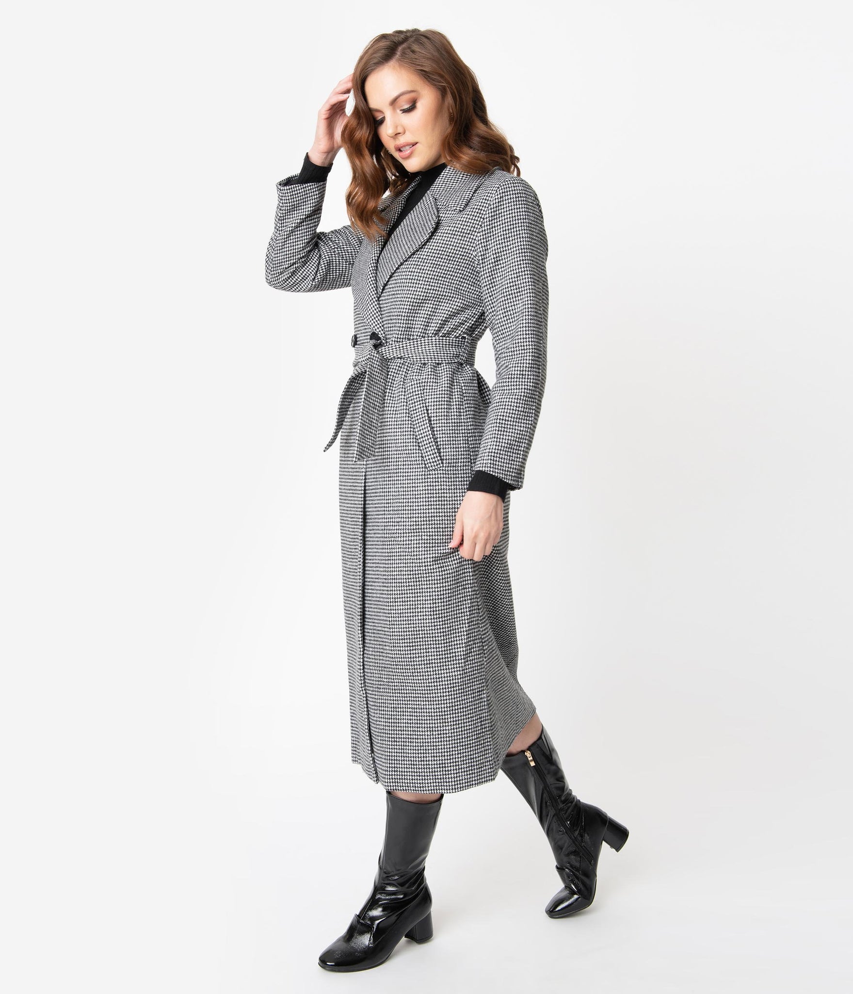 The center of style, ladies! This gorgeous long coat is crafted in a soft woven fabric that boasts a dazzling black and white houndstooth pattern throughout. The wide and notched lapel frames your visage while slender long sleeves provide coverage from those autumn breezes. A button center and matching sash nips in your figure as the flowing long skirt drops past your knees, complete with side pockets for modern function. Fully lined to keep you comfortable and warm, it’s a coat to match your attitude!