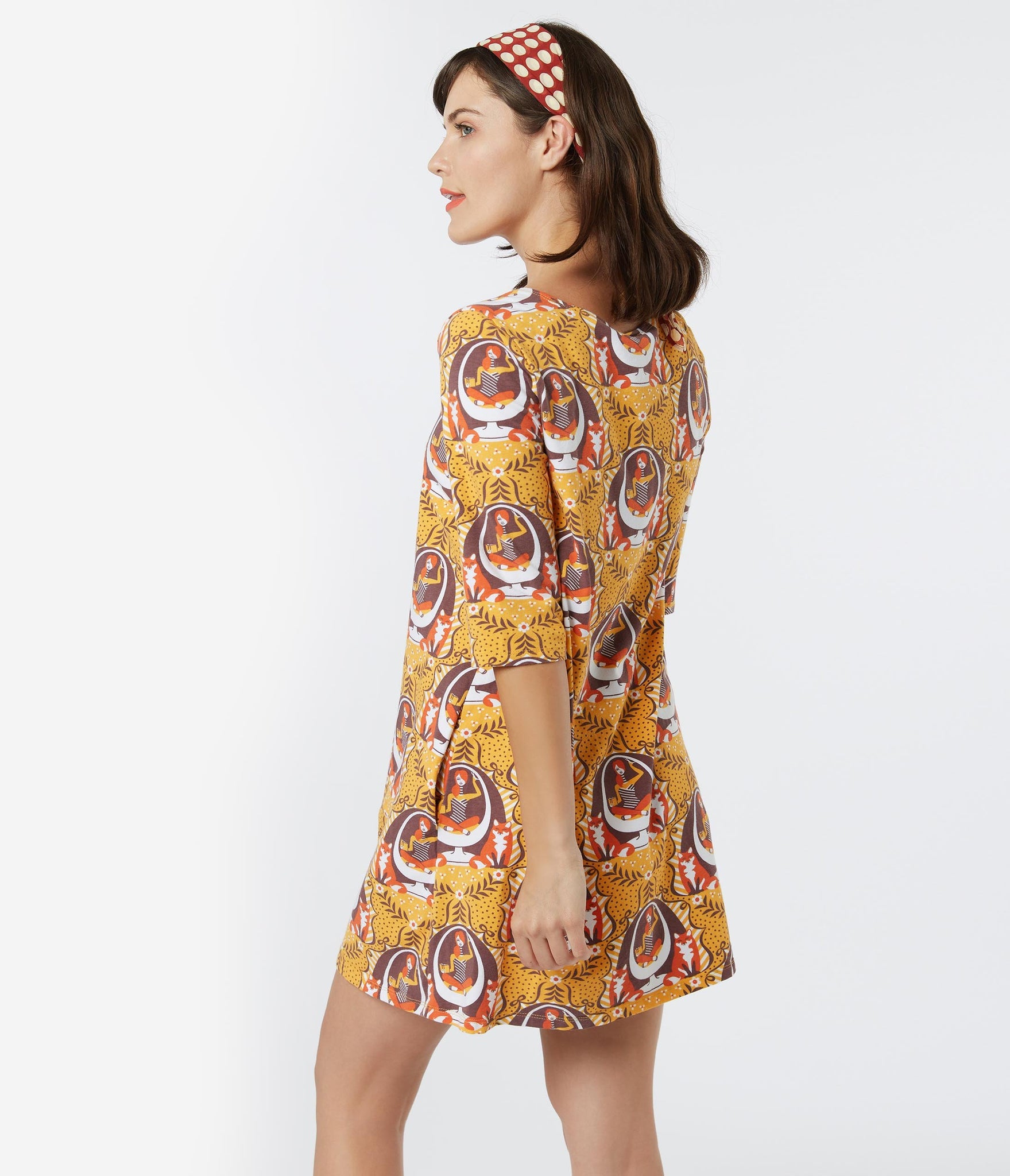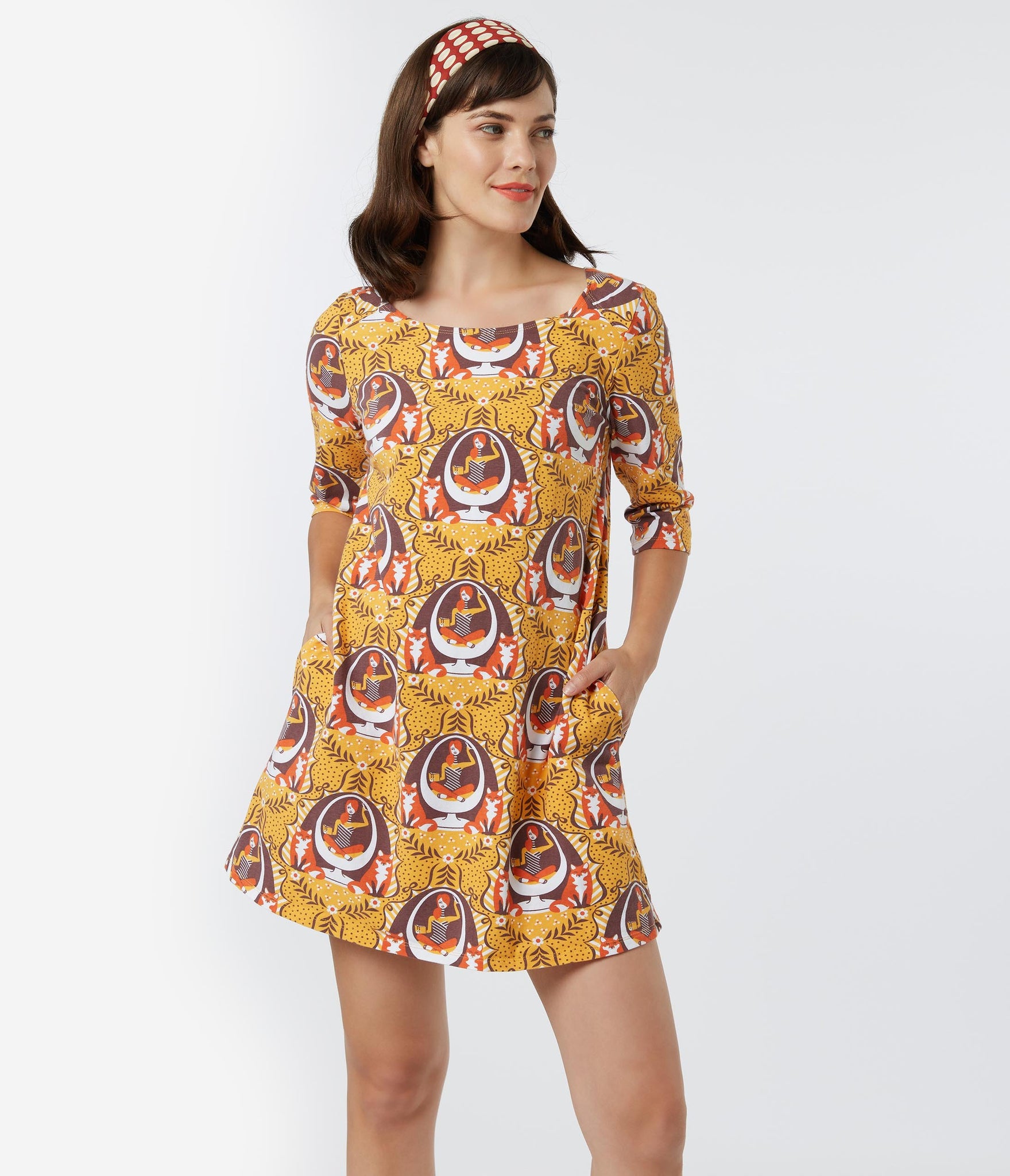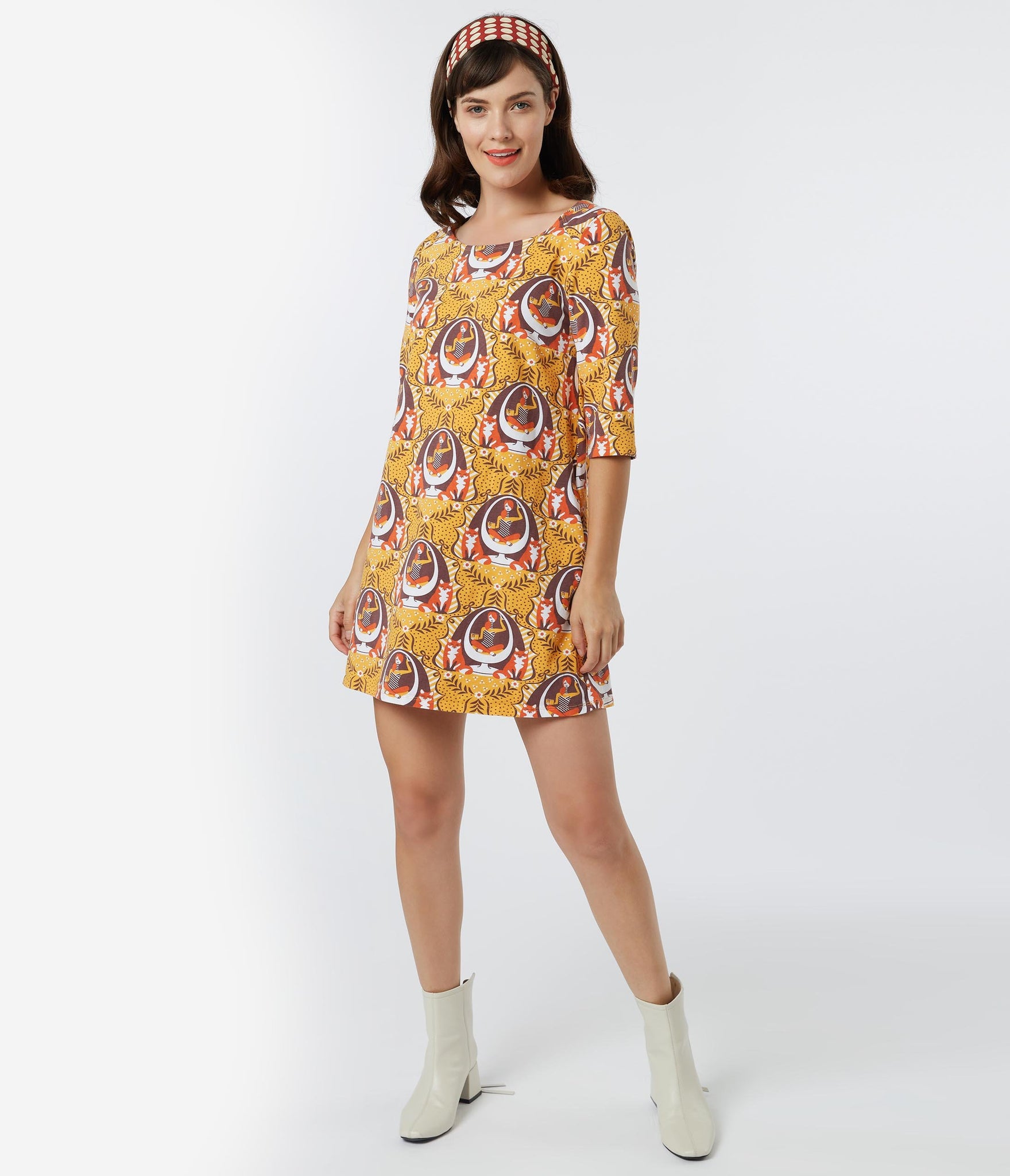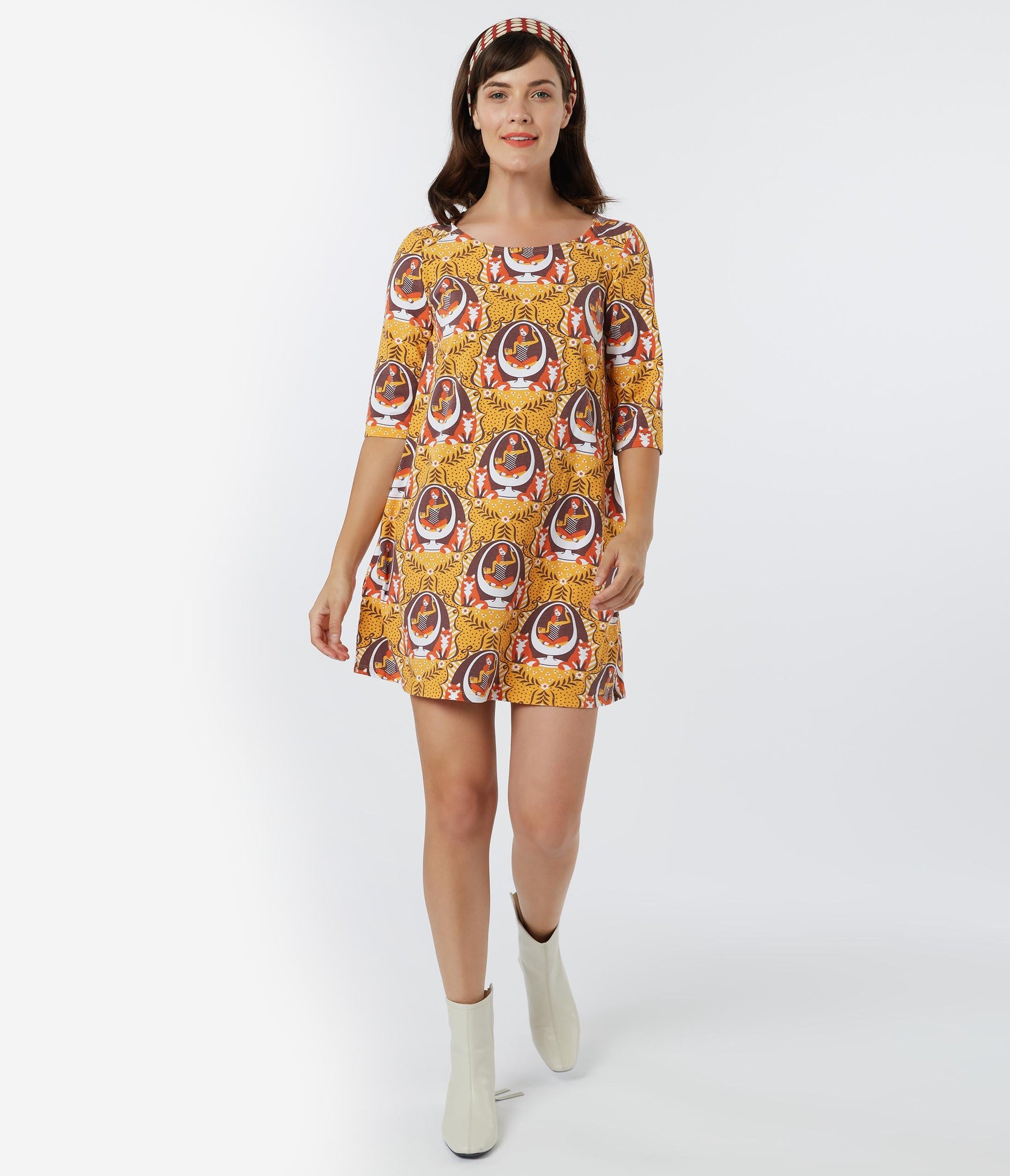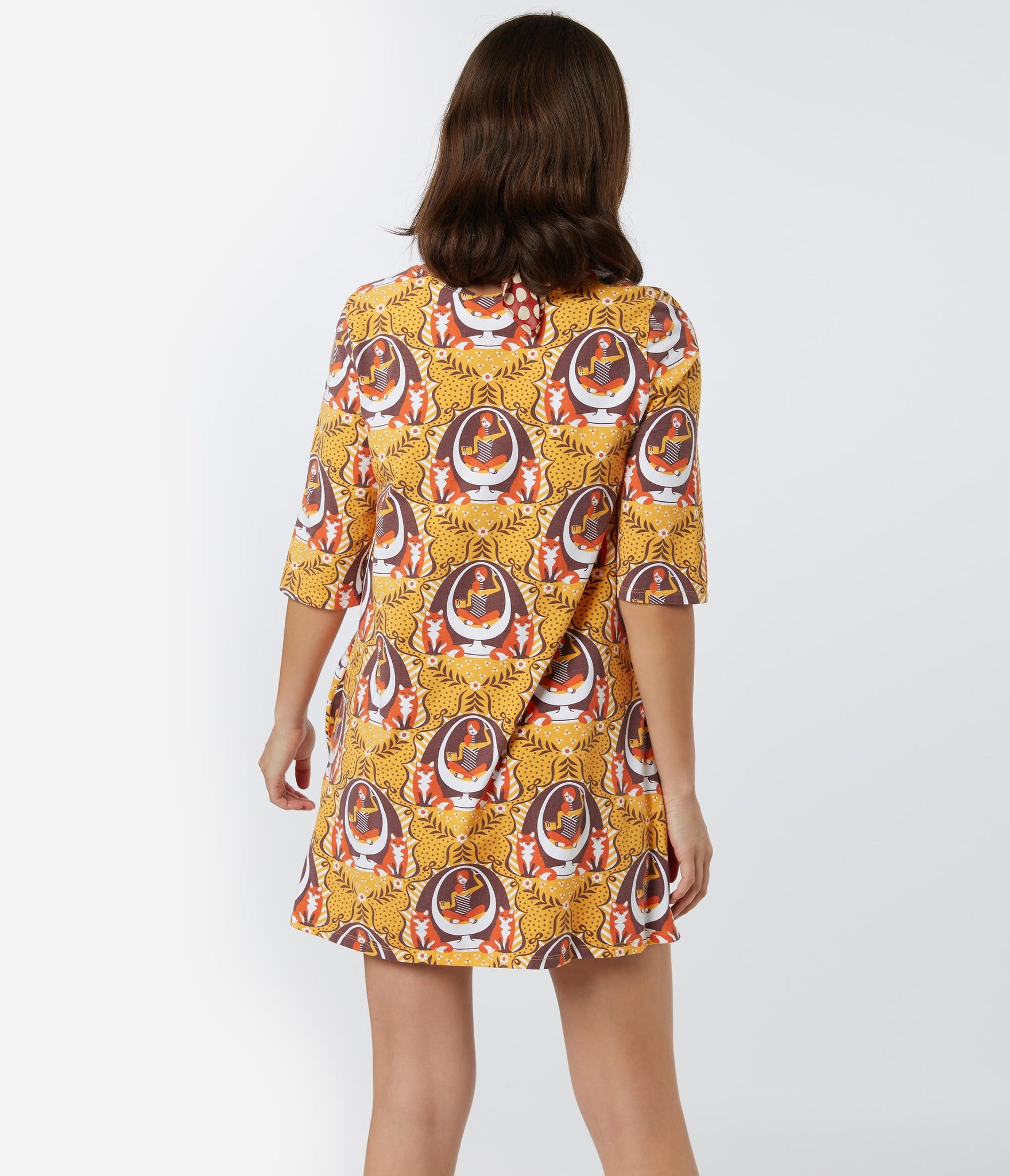 Make your throne retro, dames! This sassy tunic dress is crafted in a fabulous cotton knit and boasts a sensational print of a lass in her egg chair, surrounded by foxes and beautiful filigree. The wide open scoop neckline is framed by sweet half sleeves while the relaxed form drops into a straight hemline that dances high above the knees, outfitted with pockets for modern form!