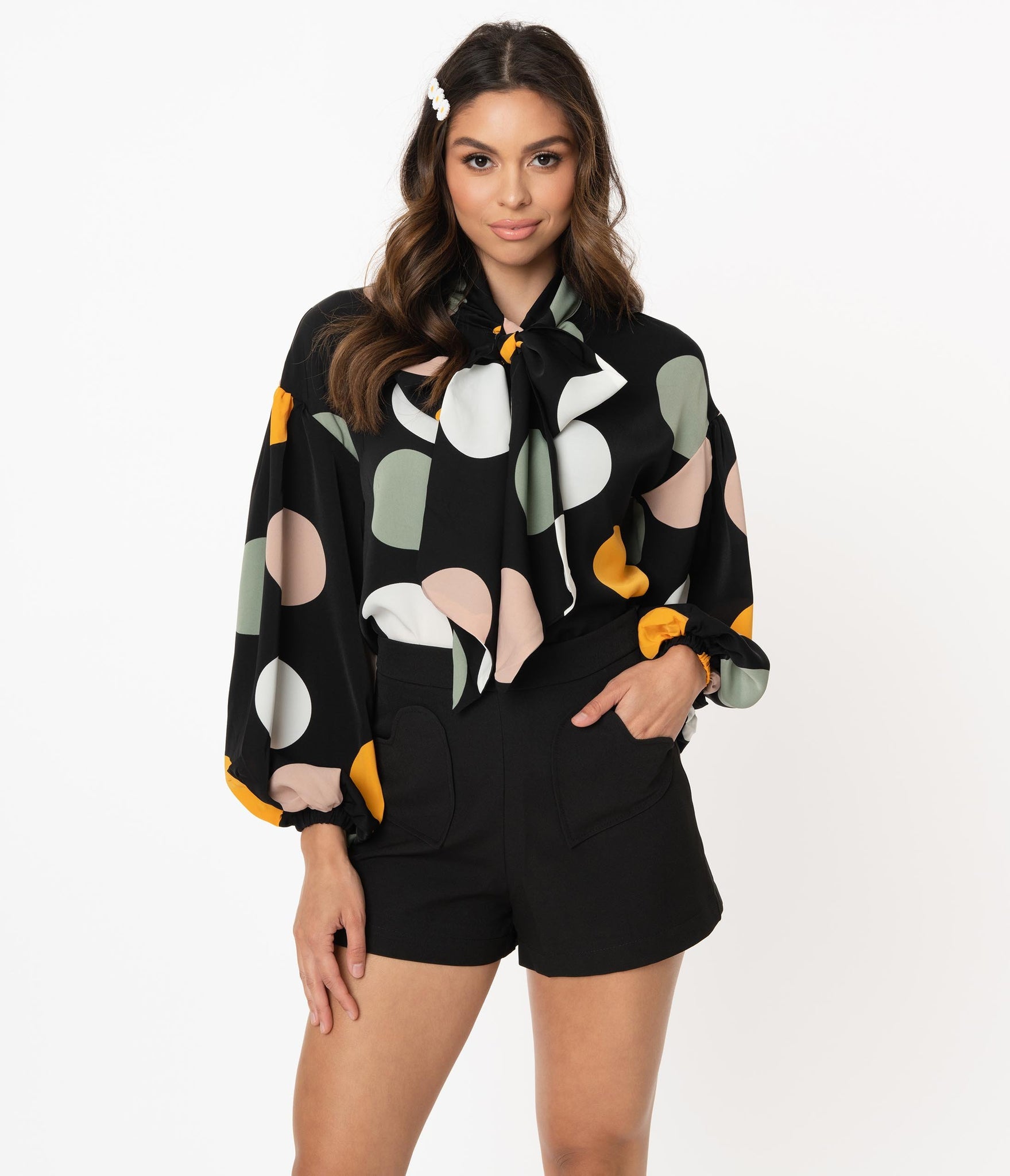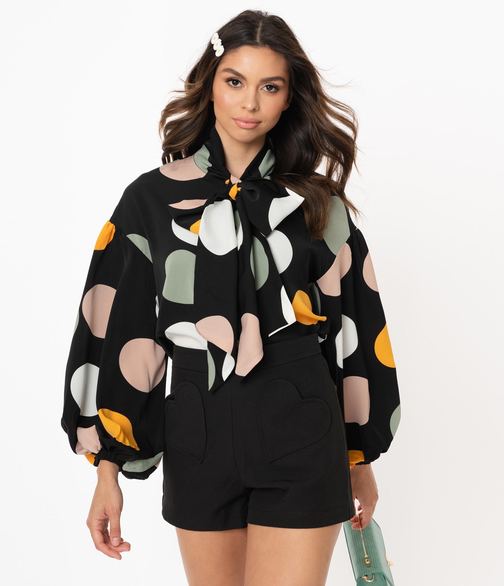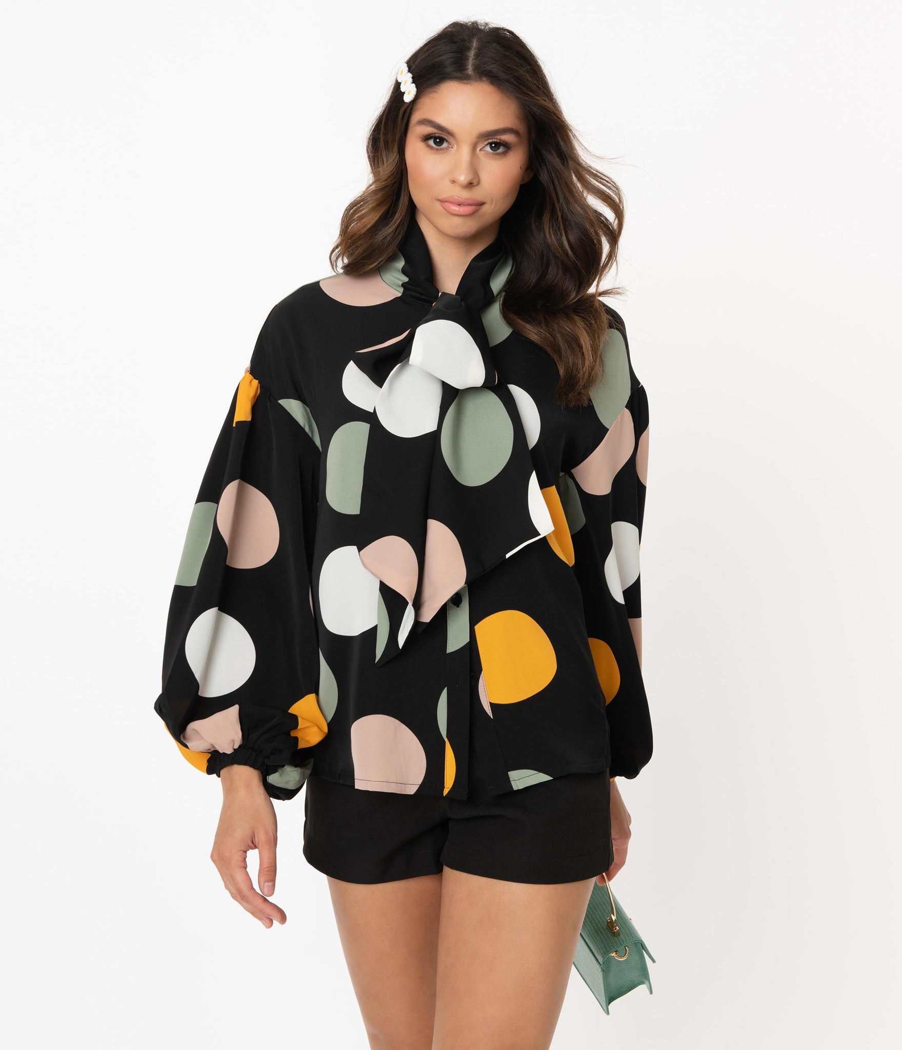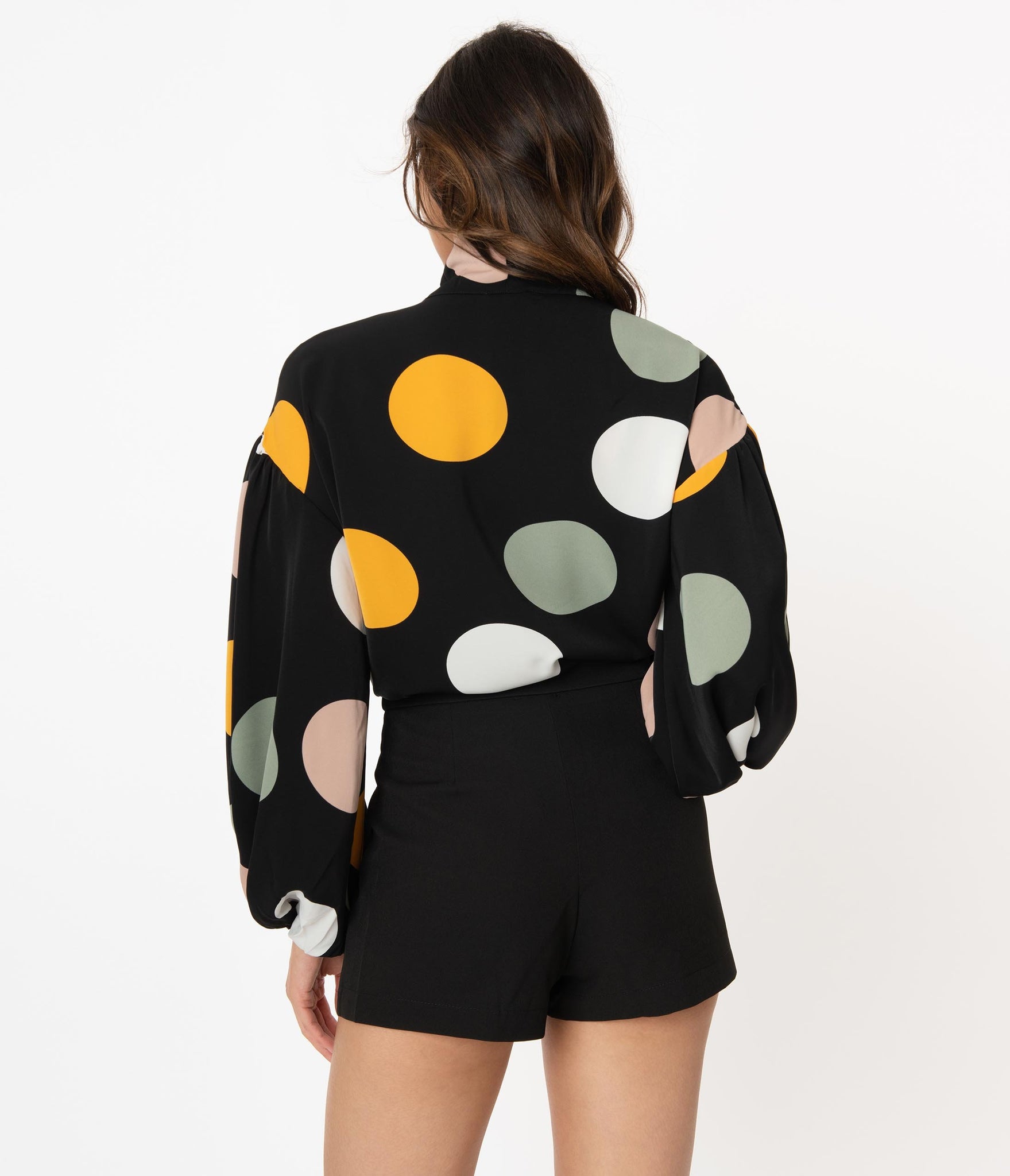 Get going, dolls! This retro blouse is crafted in a gorgeous woven fabric that grooves with large polka dots in orange, pink, mint, and ivory throughout a black backdrop.The button up front leads to a delightful self tie neck bow while the fabulous long sleeves feature a billowing breezy design, cinched with an elastic cuffs!