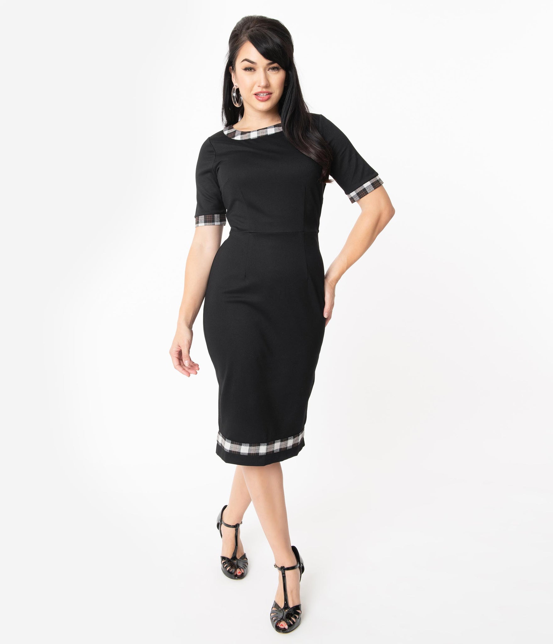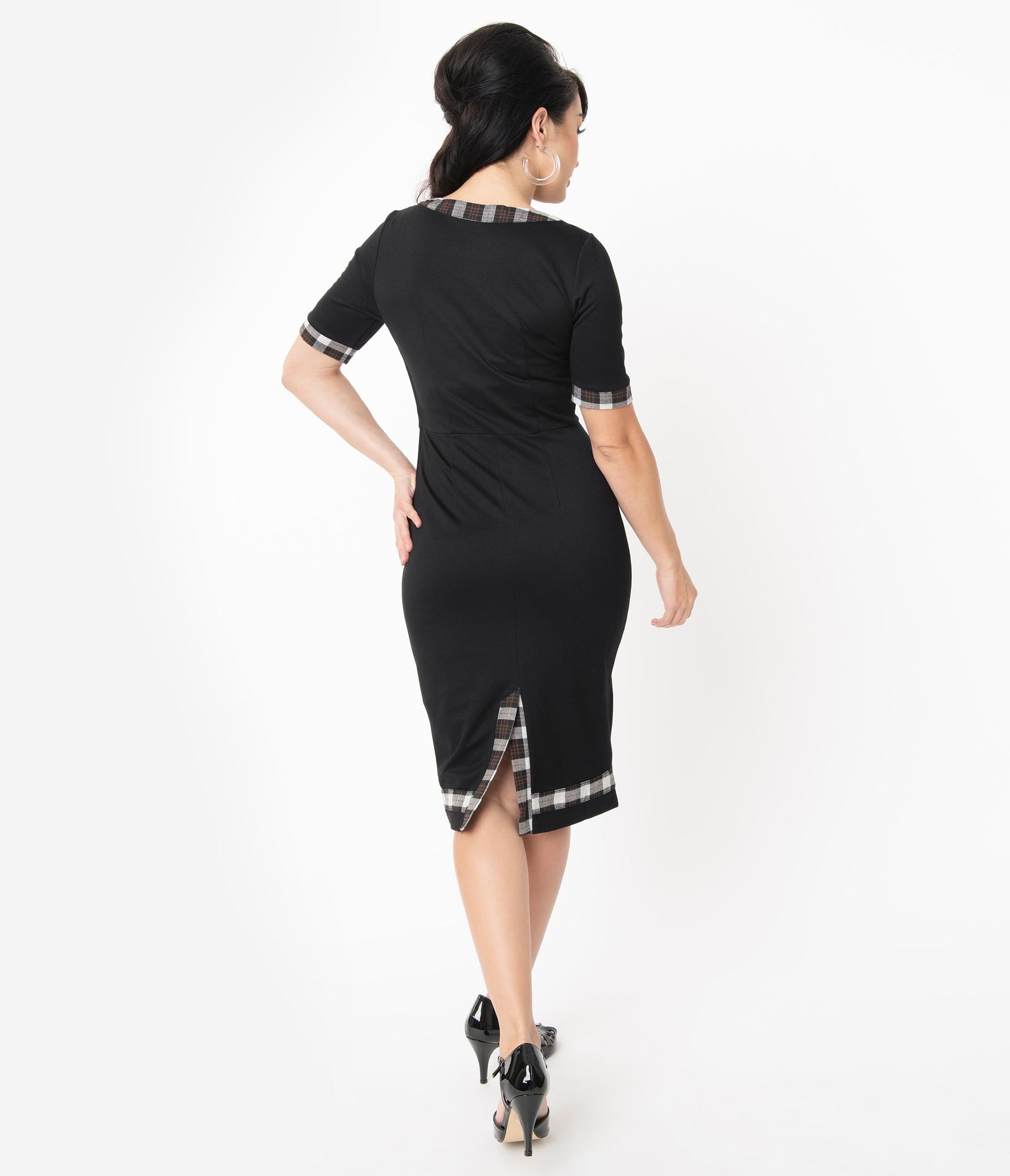You make a fabulous impression, dears! Flatter your silhouette in this chic black wiggle dress, crafted in a sturdy stretch blend that hugs your curves for a fabulous femme fatale figure. Enchanting grey and brown plaid accents highlight the modest scoop neckline and dance on the cuffs of the short sleeves while providing a border on the pencil skirt. The darted bodice and seamed waist provides a marvelous fit while the skirt drops to your knees, complete with a back vent for marvelous movement. Outfitted with a side zipper, you’re all poise and character!