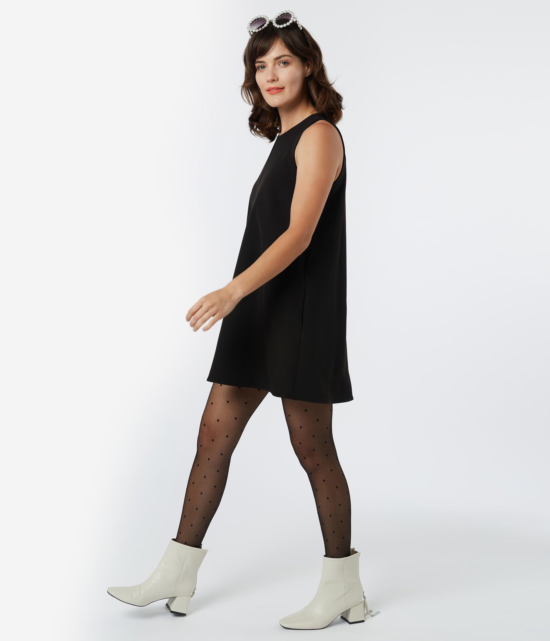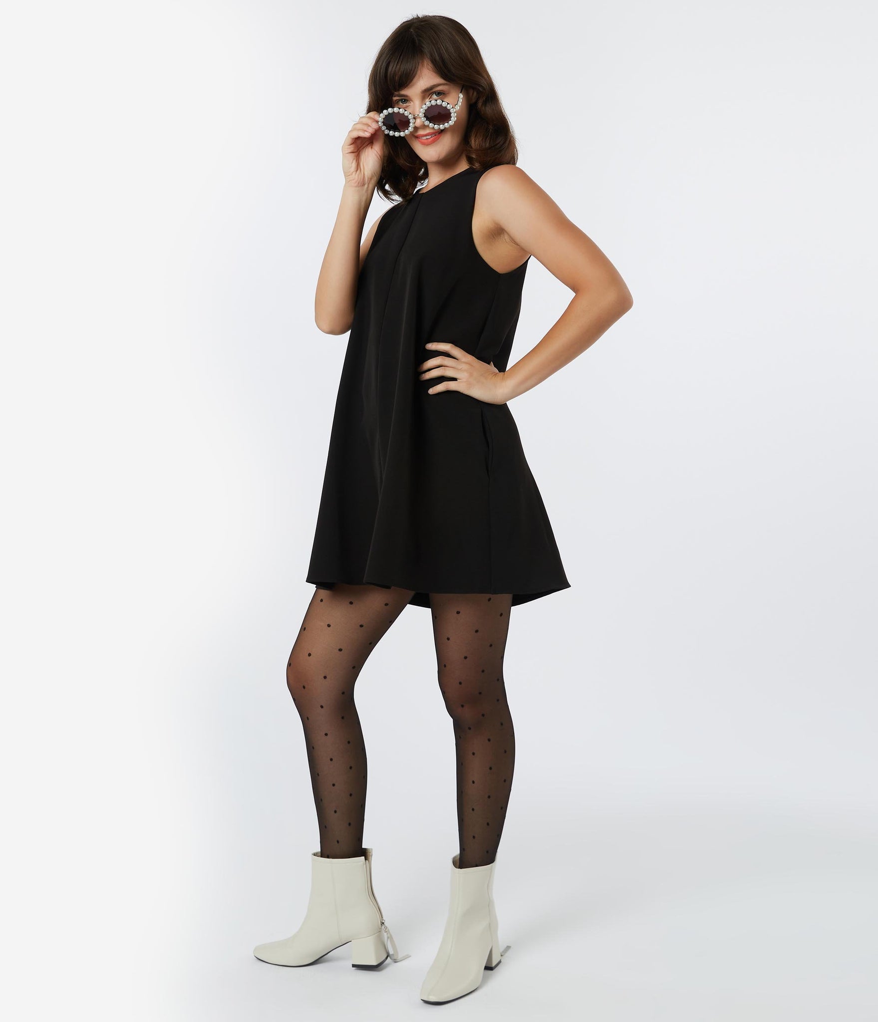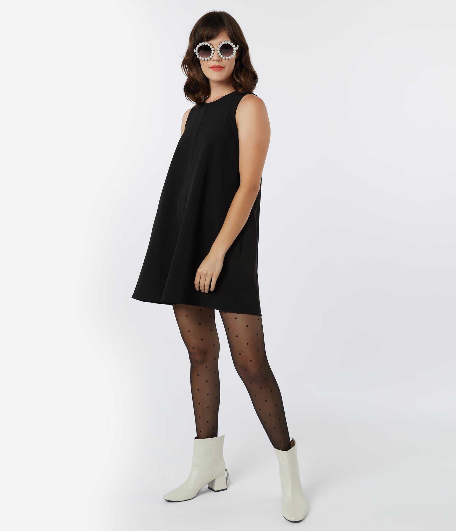 Radiate some retro love, dames! A groovy staple for your fabulous form, this eye-catching shift dress is crafted in a breezy woven fabric and dazzles in an elegant black. The modest neckline is secured with a button back keyhole while the sleeveless design shows off your shoulders. The relaxed silhouette drops to straight hem above the knees while hidden side pockets keep your essentials close at hand!