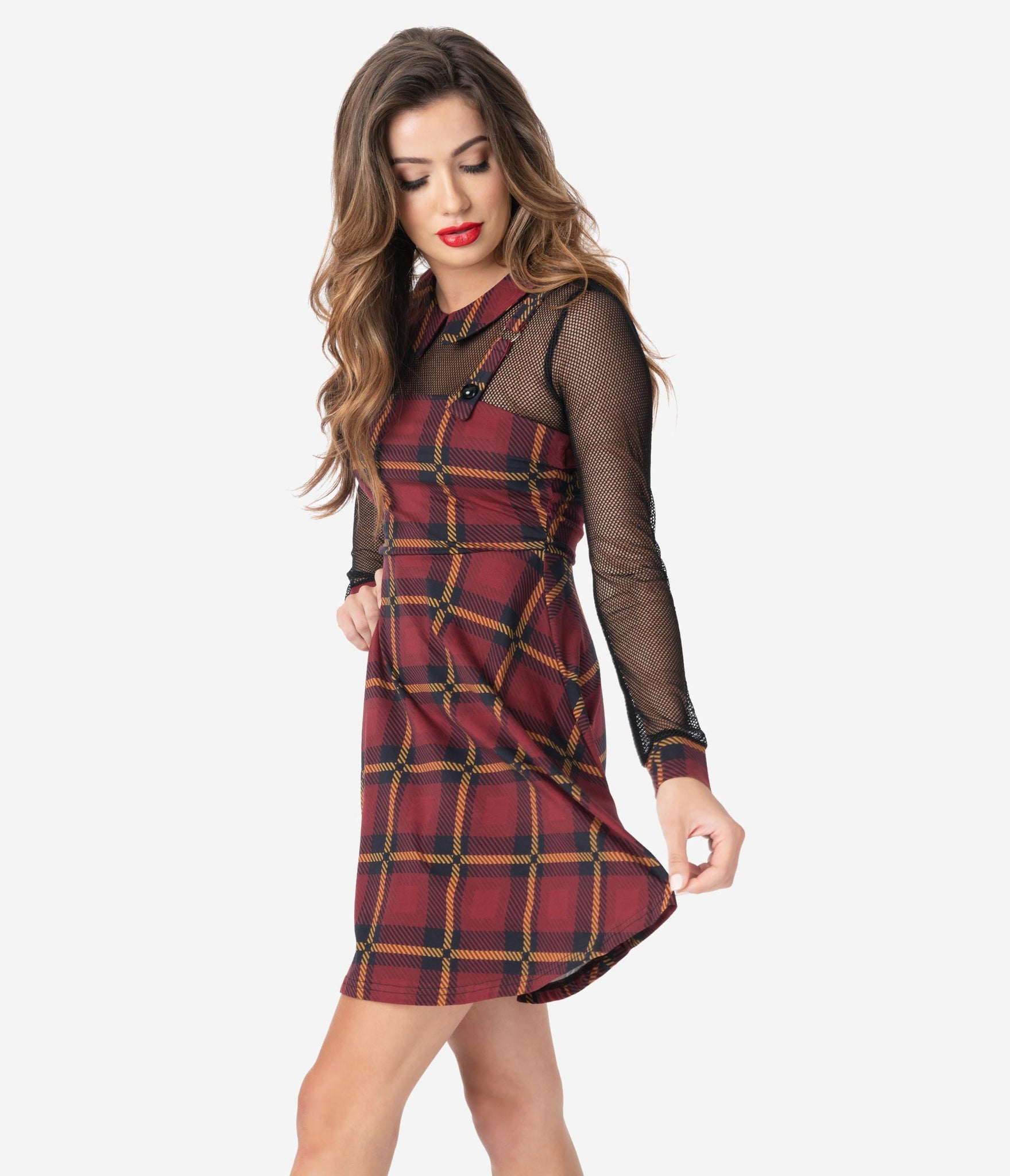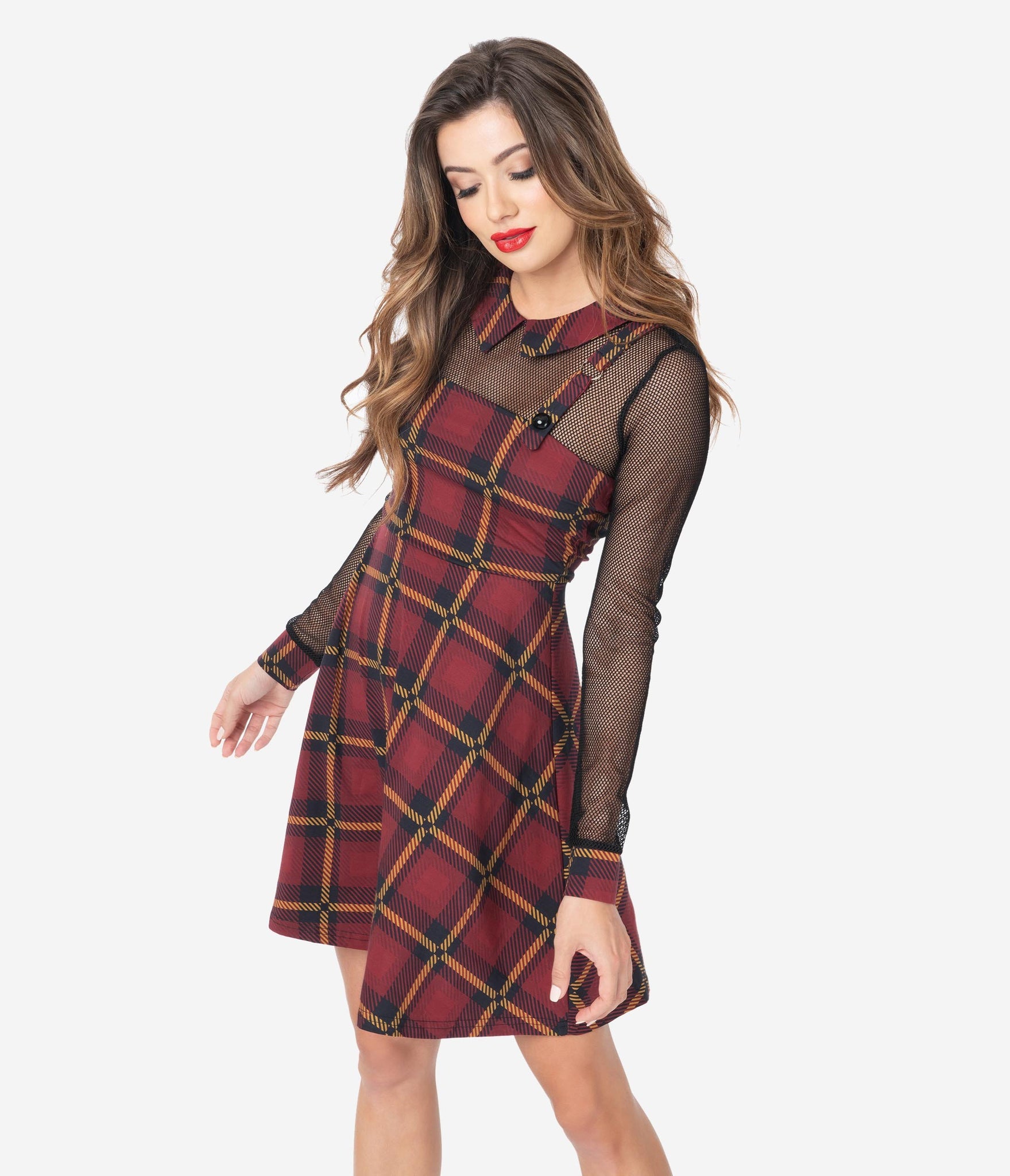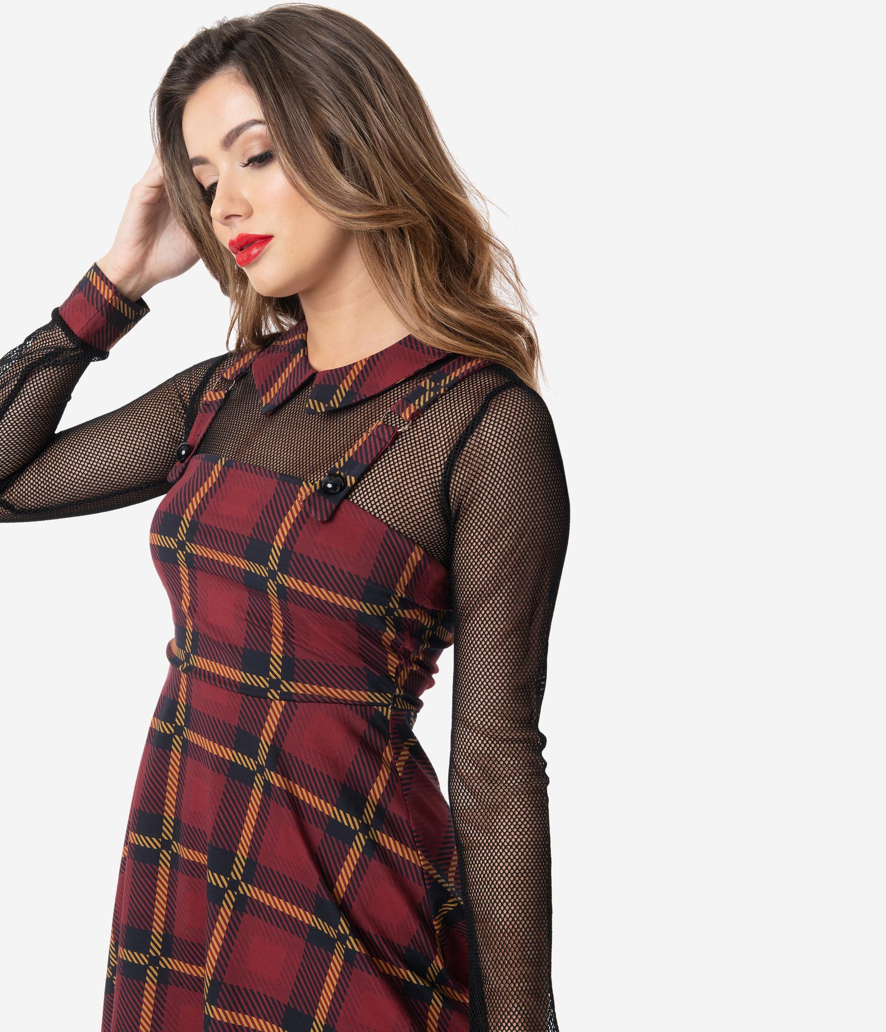 Set yourself apart, gals! Chic with an edge, this adorable flare dress is crafted in a woven stretch fabric and dazzles with a fabulous burgundy red plaid pattern throughout. The ravishing black mesh is topped by a tartan notched collar and secured in the back with a button keyhole as the sleek long sleeve drop to tartan cuffs. The cute bodice boasts button fascinator straps while the seamed waist tops an adorable skater skirt that drops to a straight hem above the knees. Step into the night and pursue adventure!