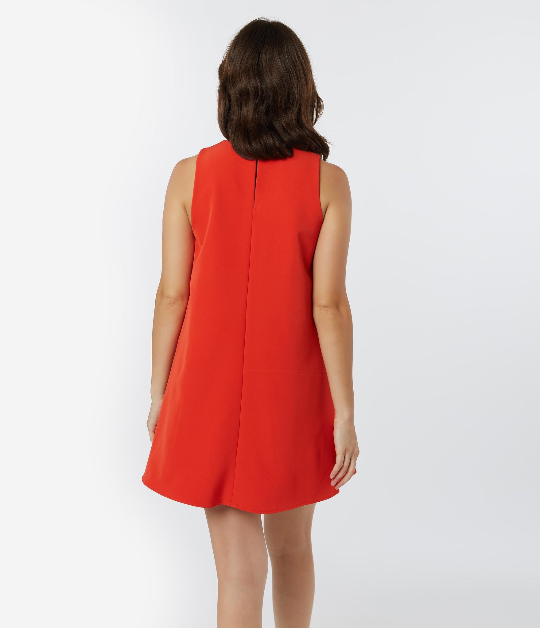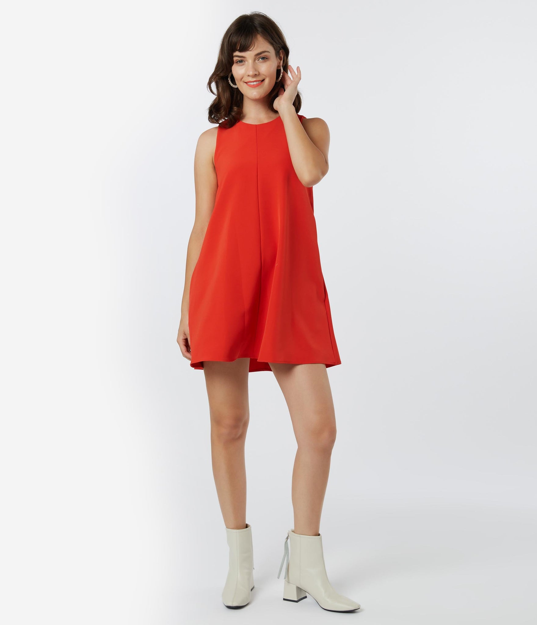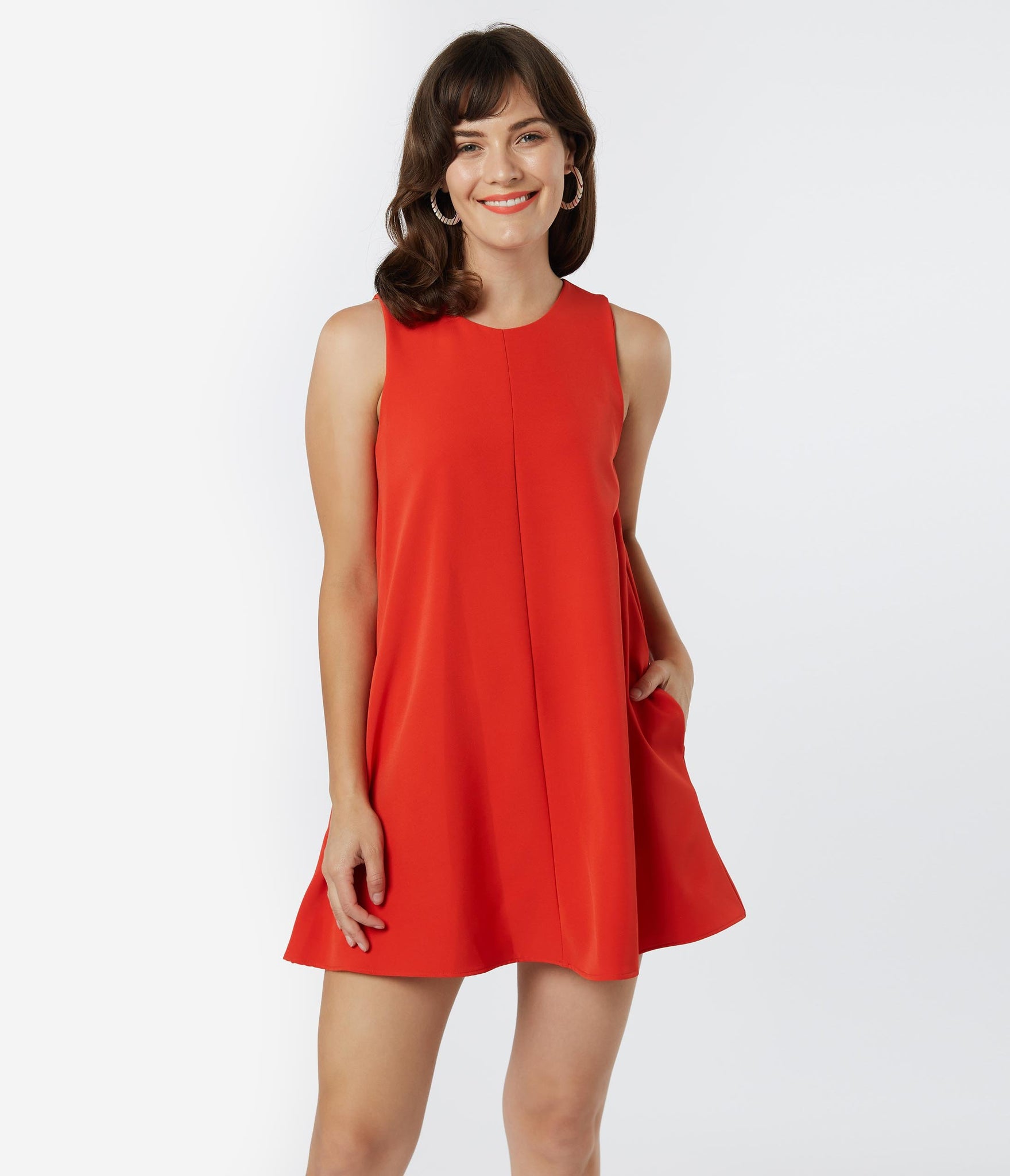 Radiate some retro love, dames! A groovy staple for your fabulous form, this eye-catching shift dress is crafted in a breezy woven fabric and dazzles in a sensational burnt orange. The modest neckline is secured with a button back keyhole while the sleeveless design shows off your shoulders. The relaxed silhouette drops to straight hem above the knees while hidden side pockets keep your essentials close at hand!