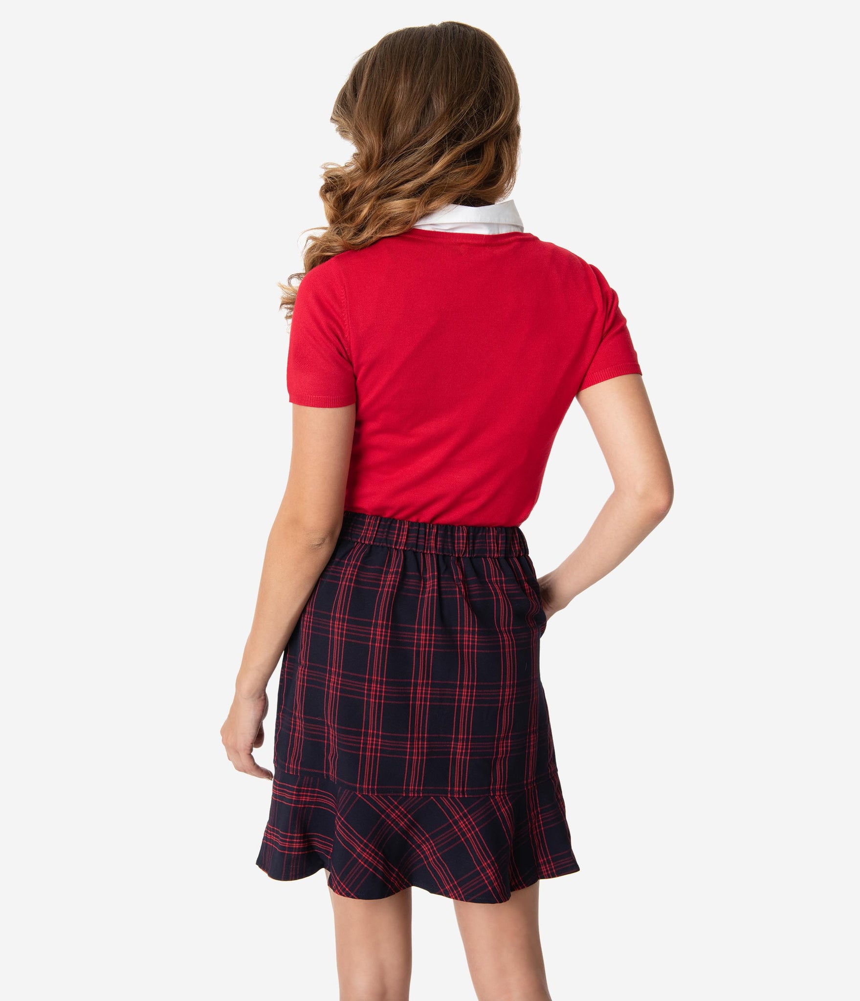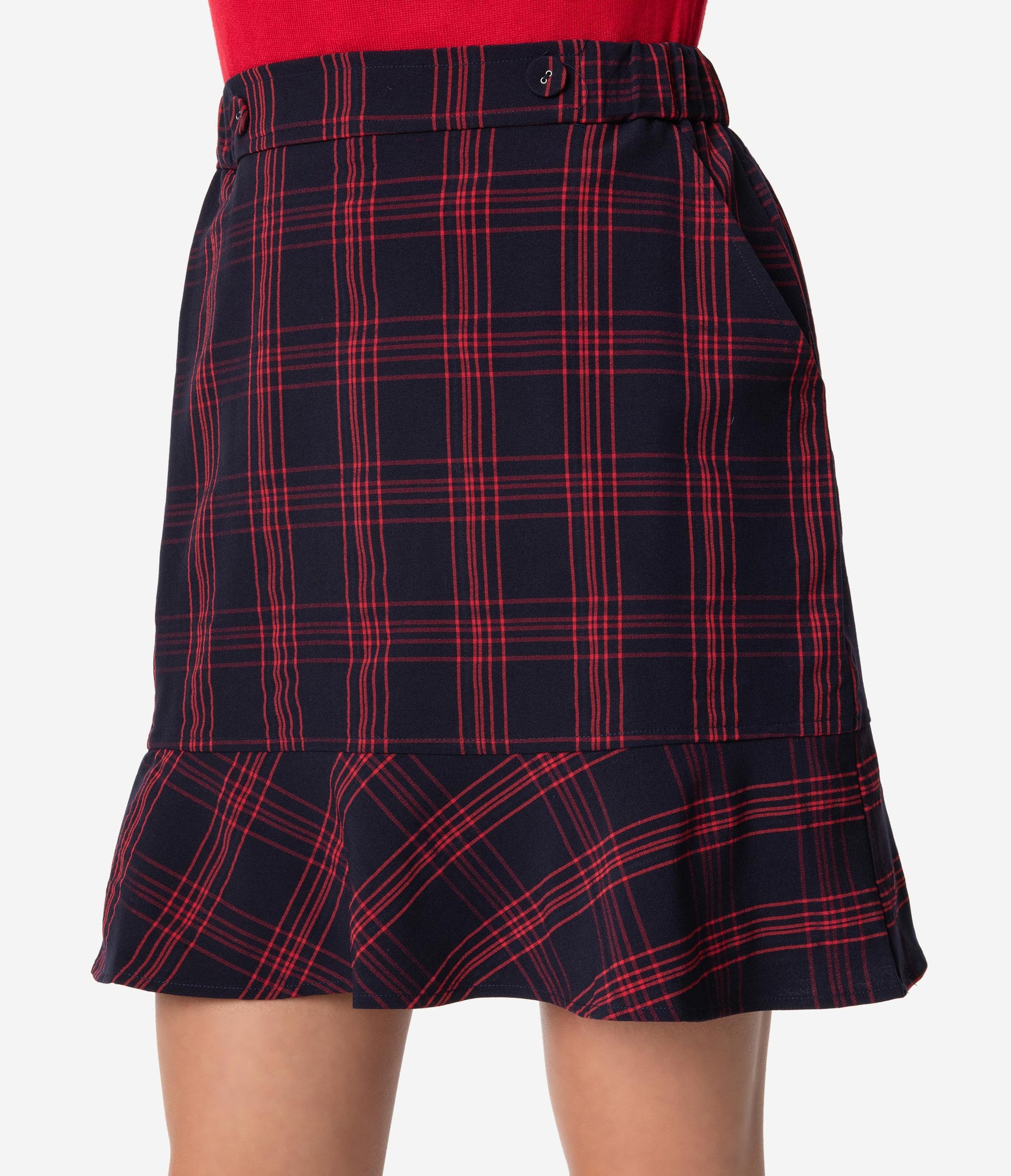 Excuse us while we gather attention, dears! A stylish mini skirt for a trendy dame, this sturdy woven wonder boasts a charming plaid pattern in navy blue and red. The banded waist is nipped in with elastic as dainty faux button lend a dash of vintage embellishment and side pockets provide modern function. Complete with a sweet ruffle border that dances high above the knees, it’s a smart separate!