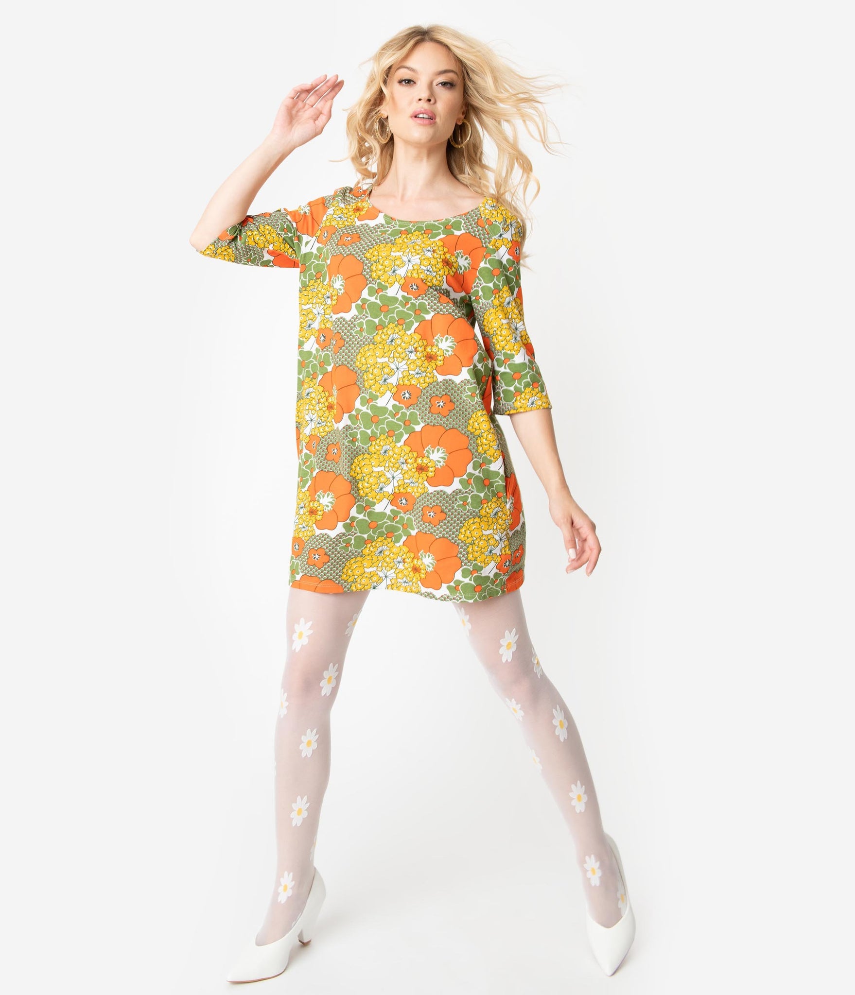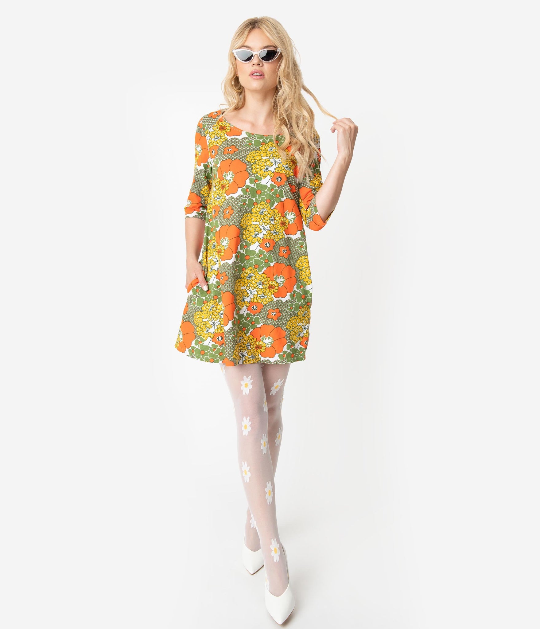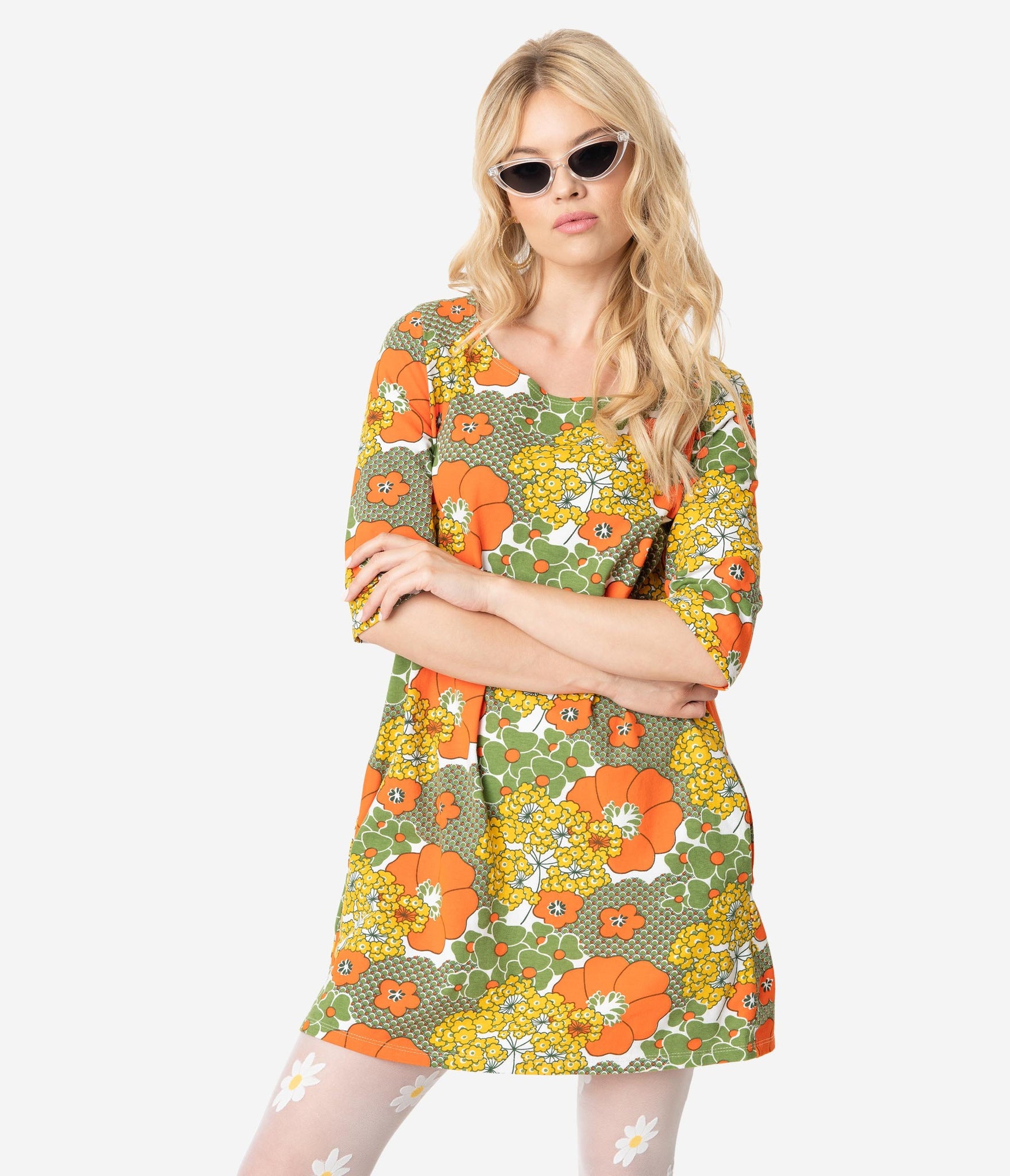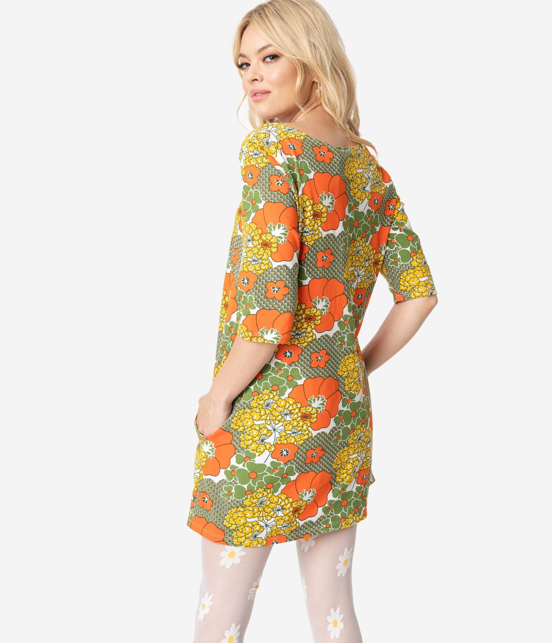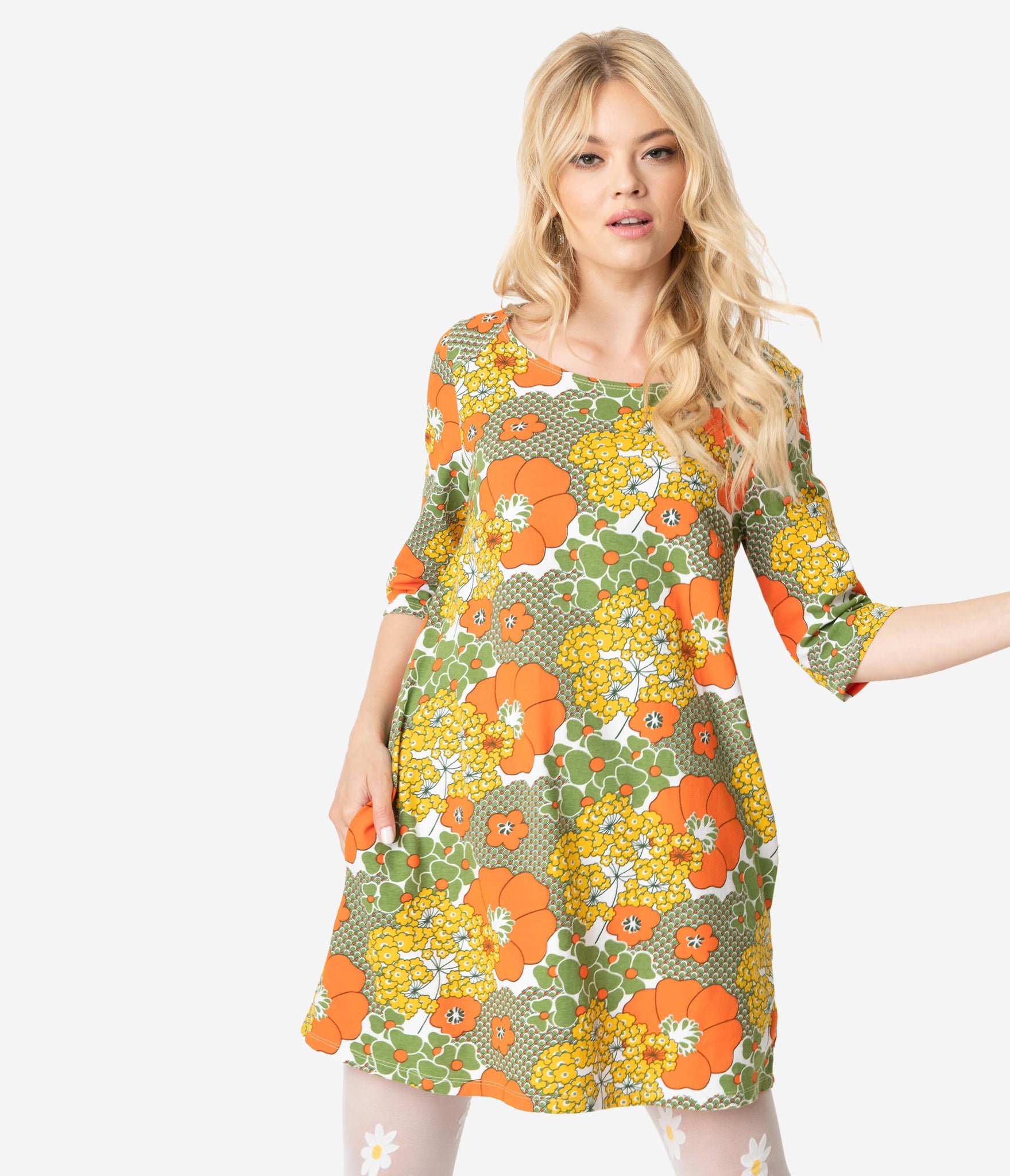Get ready for retro daydreaming, dames! With a stunning 1960s silhouette, this casual tunic dress is crafted in a fabulous cotton stretch and boasts a beautiful print of orange, yellow and olive green florals blooming across your groovy figure. The modest scoop neckline on this floral retro dress is framed by chic three-quarter length sleeves while the darted bodice provides a dash of form as the relaxed design drops into a flirtatious flare. This retro tunic dress is also outfitted with hidden side pockets for modern function. Go get ‘em!
