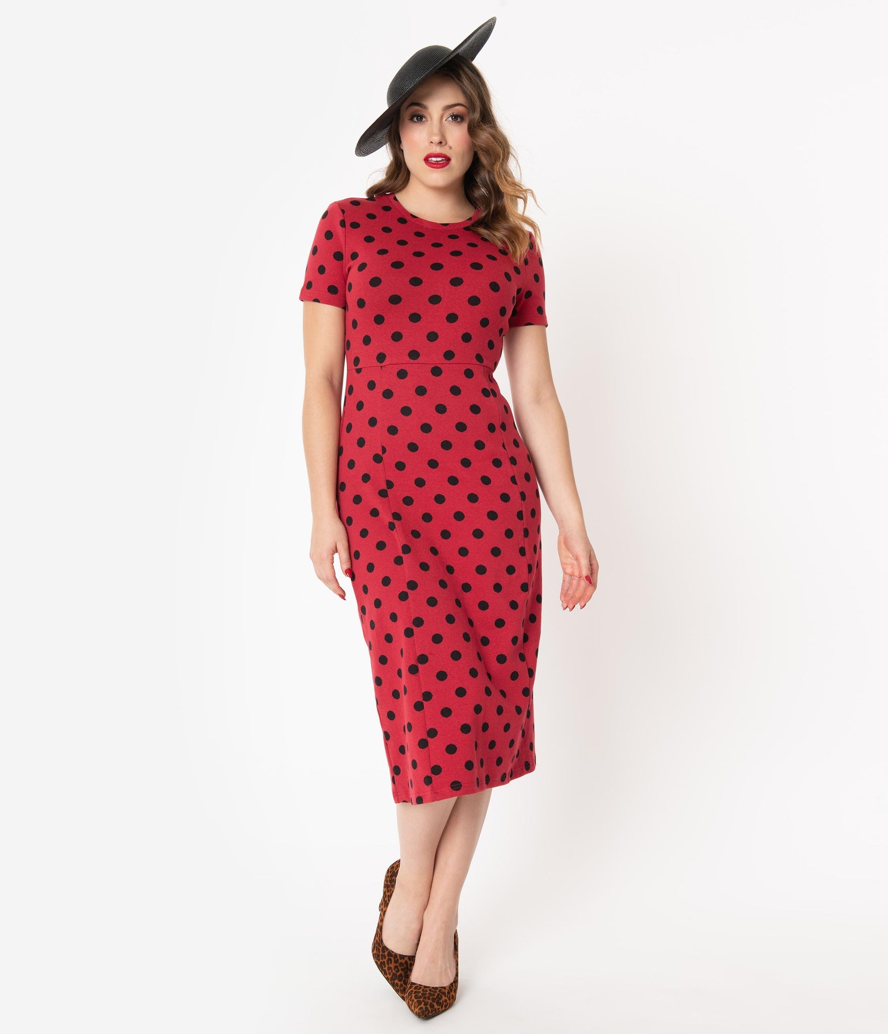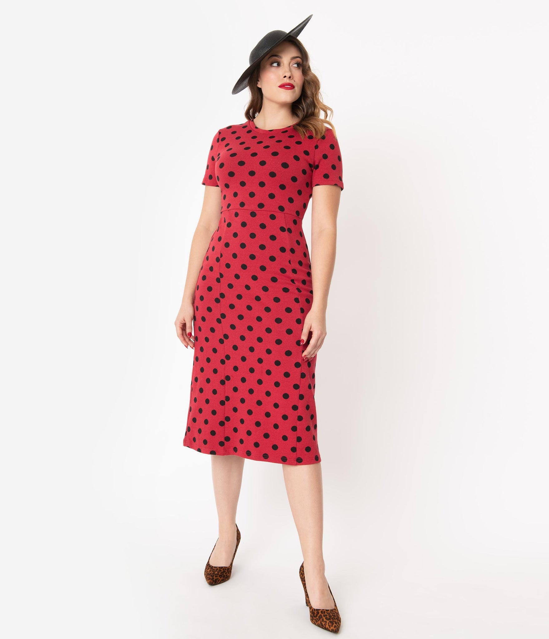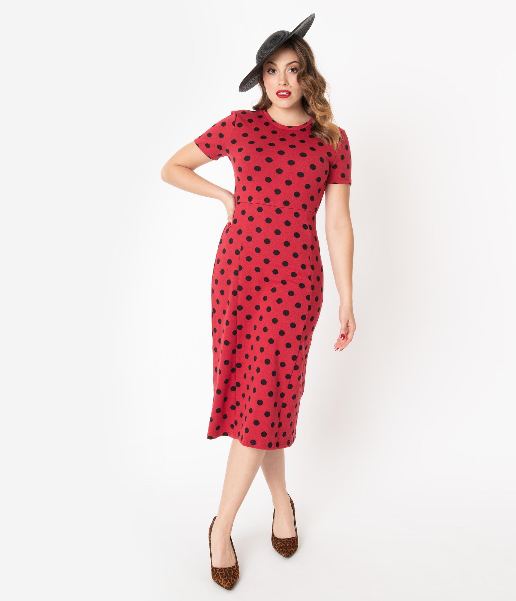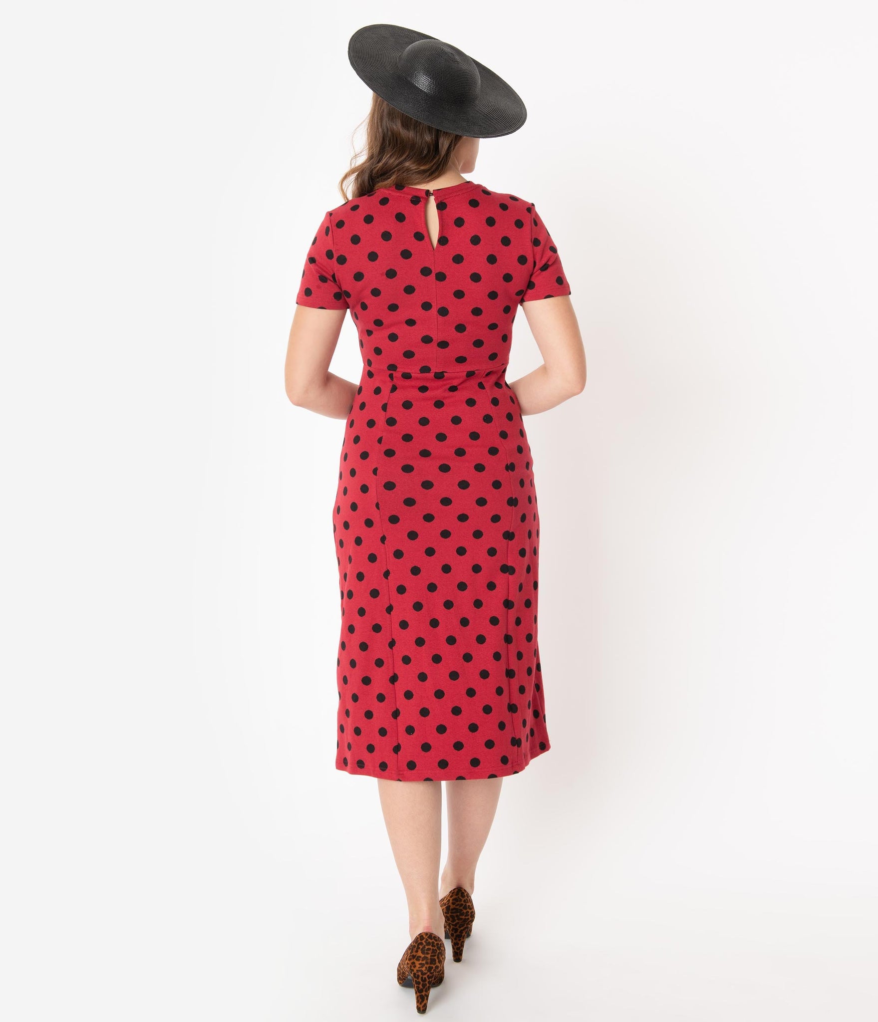 You should come with a warning sign, darling! This ravishing retro dress is crafted in a soft cotton knit blend that hugs your curves for a ruthless silhouette. Boasting black polka dots through the rockabilly red backdrop, the modest scoop neckline is secured in the back with a button keyhole, framed by sweet short sleeves. The seamed waist centers your form while the fitted skirt drops into a subtle A-line flare for marvelous movement. Pin-up perfection!