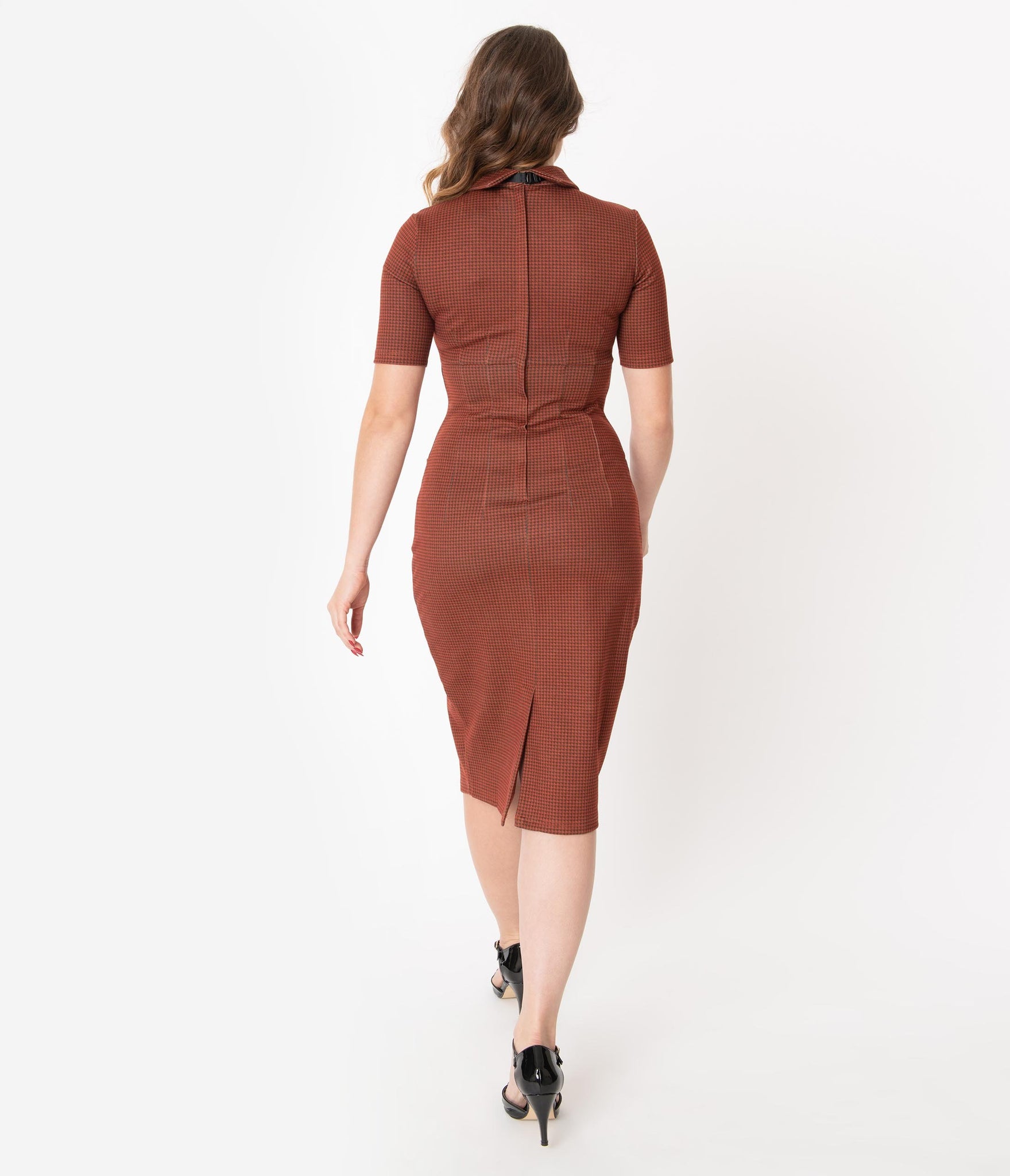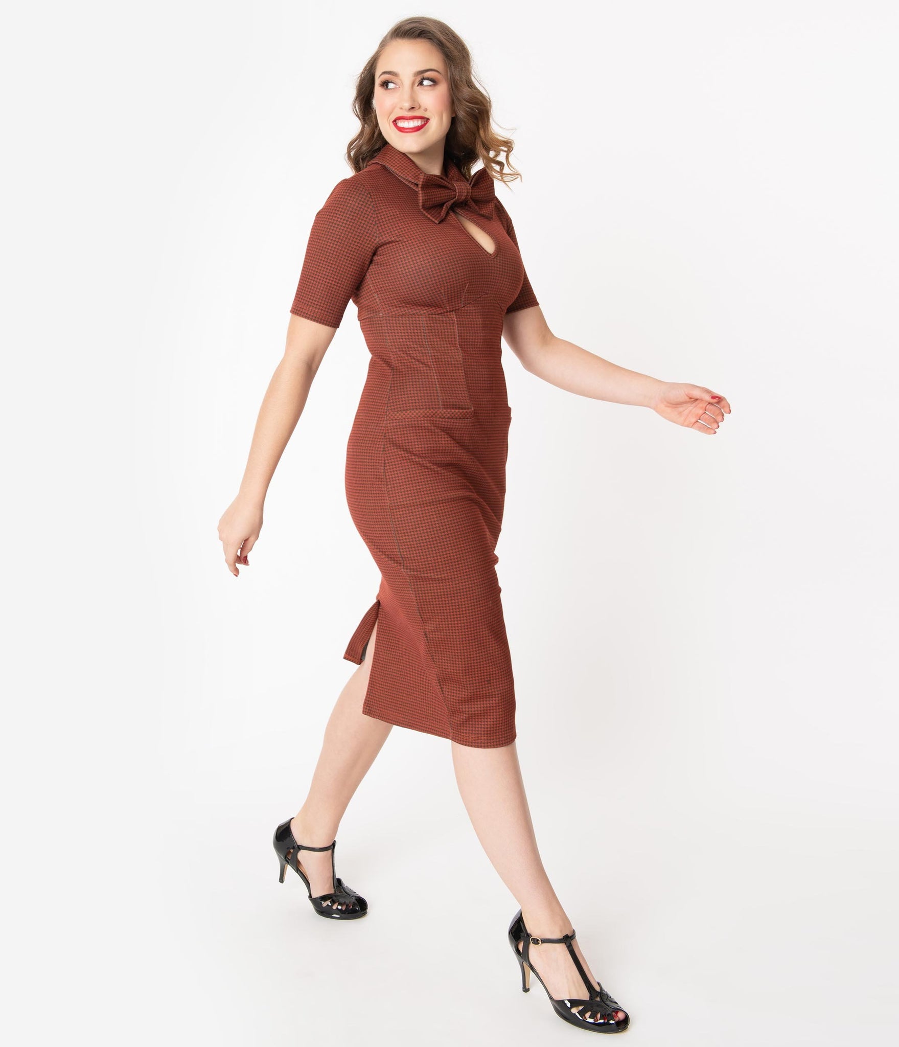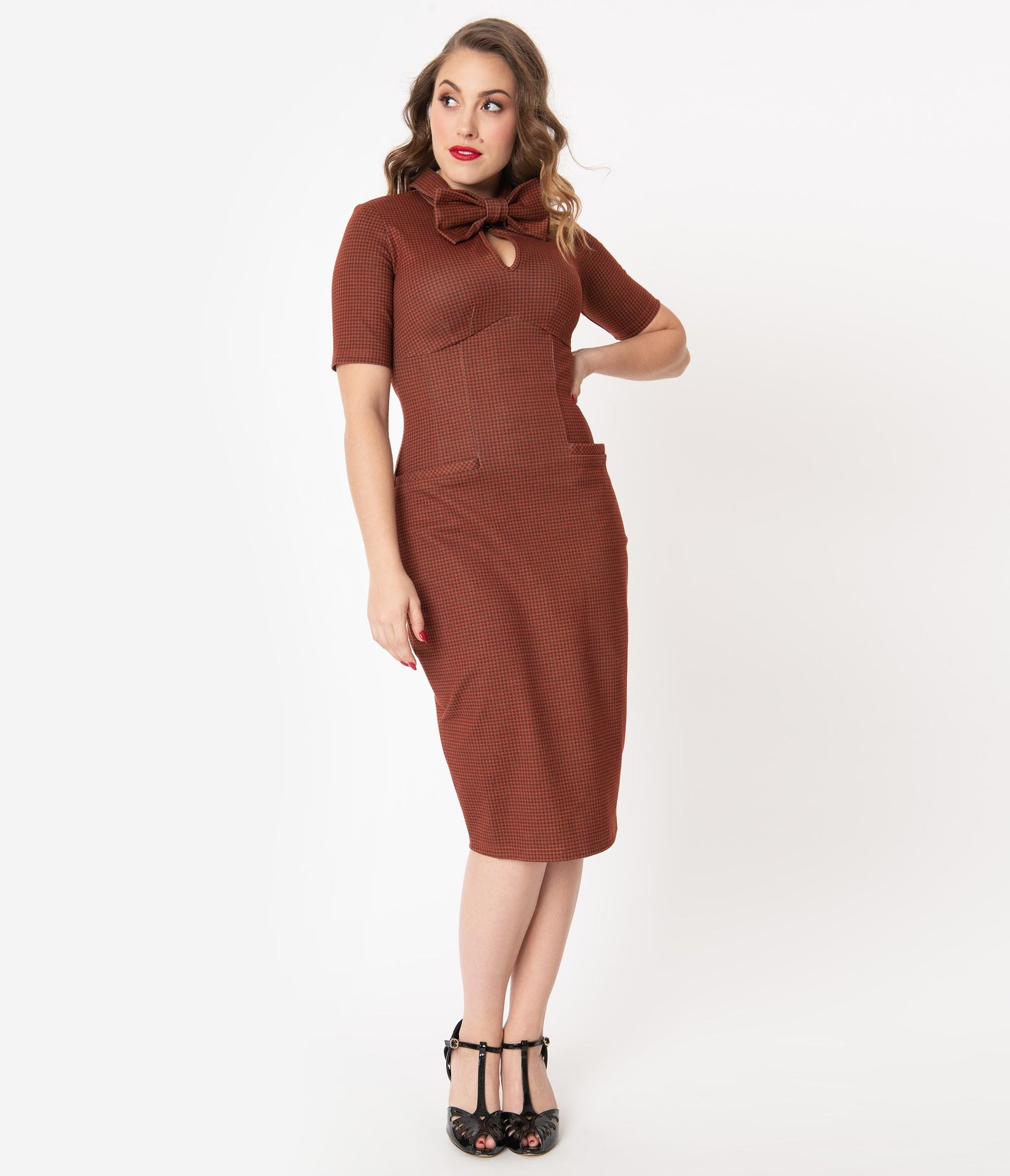 Make their hearts ache, dames! A ravishing wiggle dress from Tatyana, this marvelous pencil silhouette is crafted in a soft woven blend that hugs your favorite assets while keeping you comfortable with a fabulous stretch. The darted bodice is centered by a flirtatious button keyhole while a removable and adjustable bow tie adds vintage accent to your ensemble. Boasting a pointed empire seamed waist and sweet short sleeves, your sultry silhouette will cause a scene with the sensational pencil skirt, outfitted with side pockets for modern function. Complete with a back zipper and kick vent, it’s simply natural!