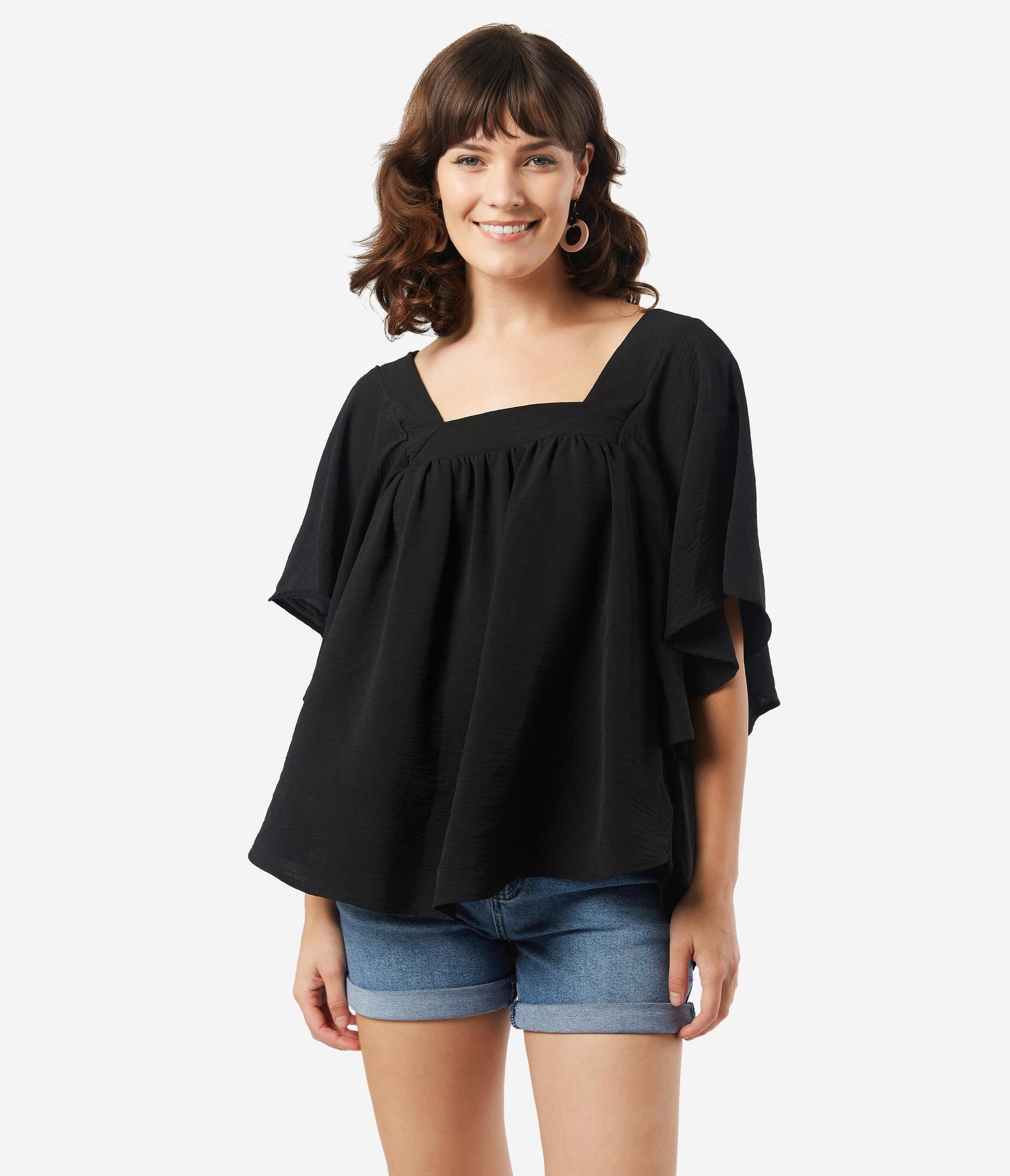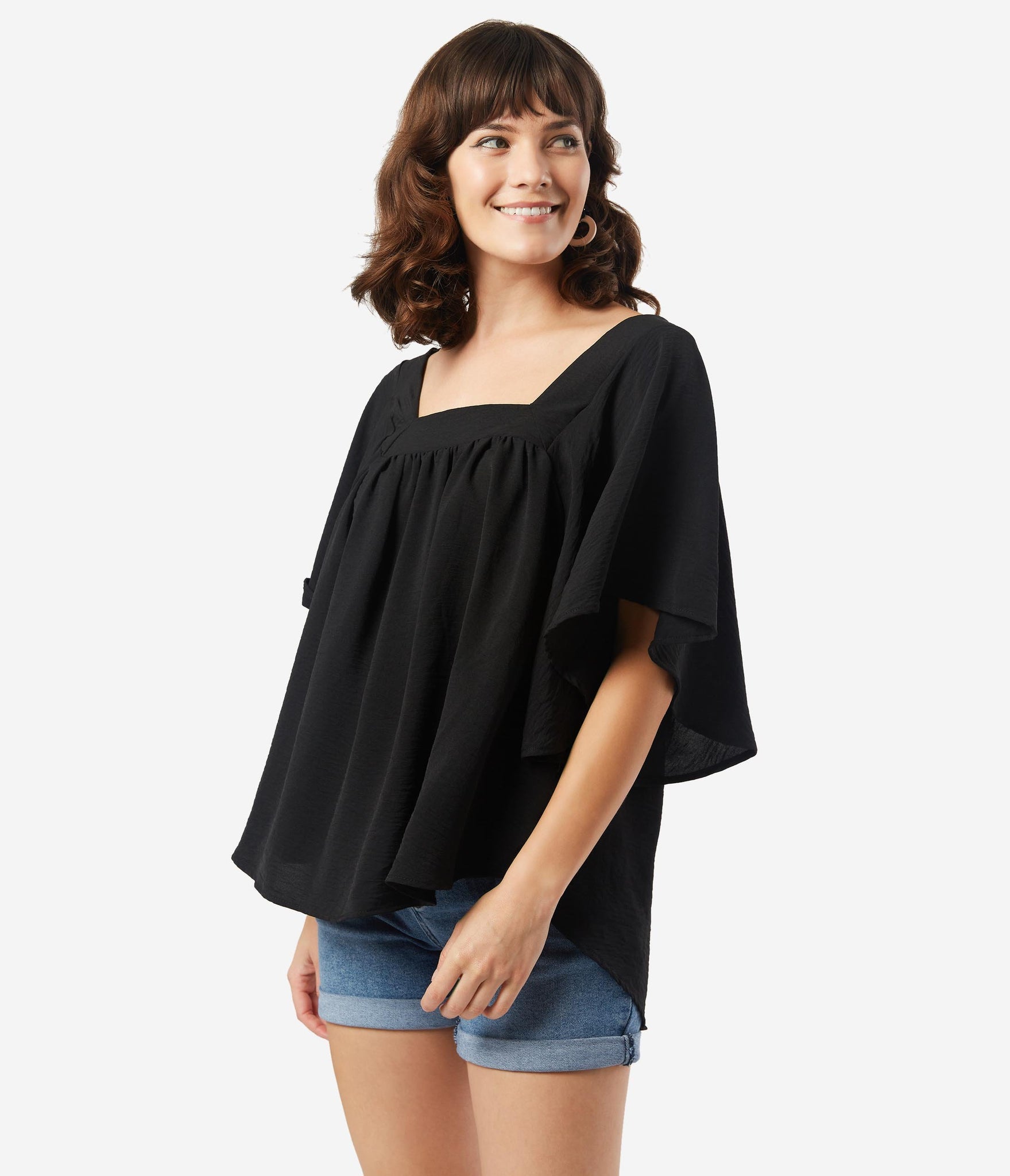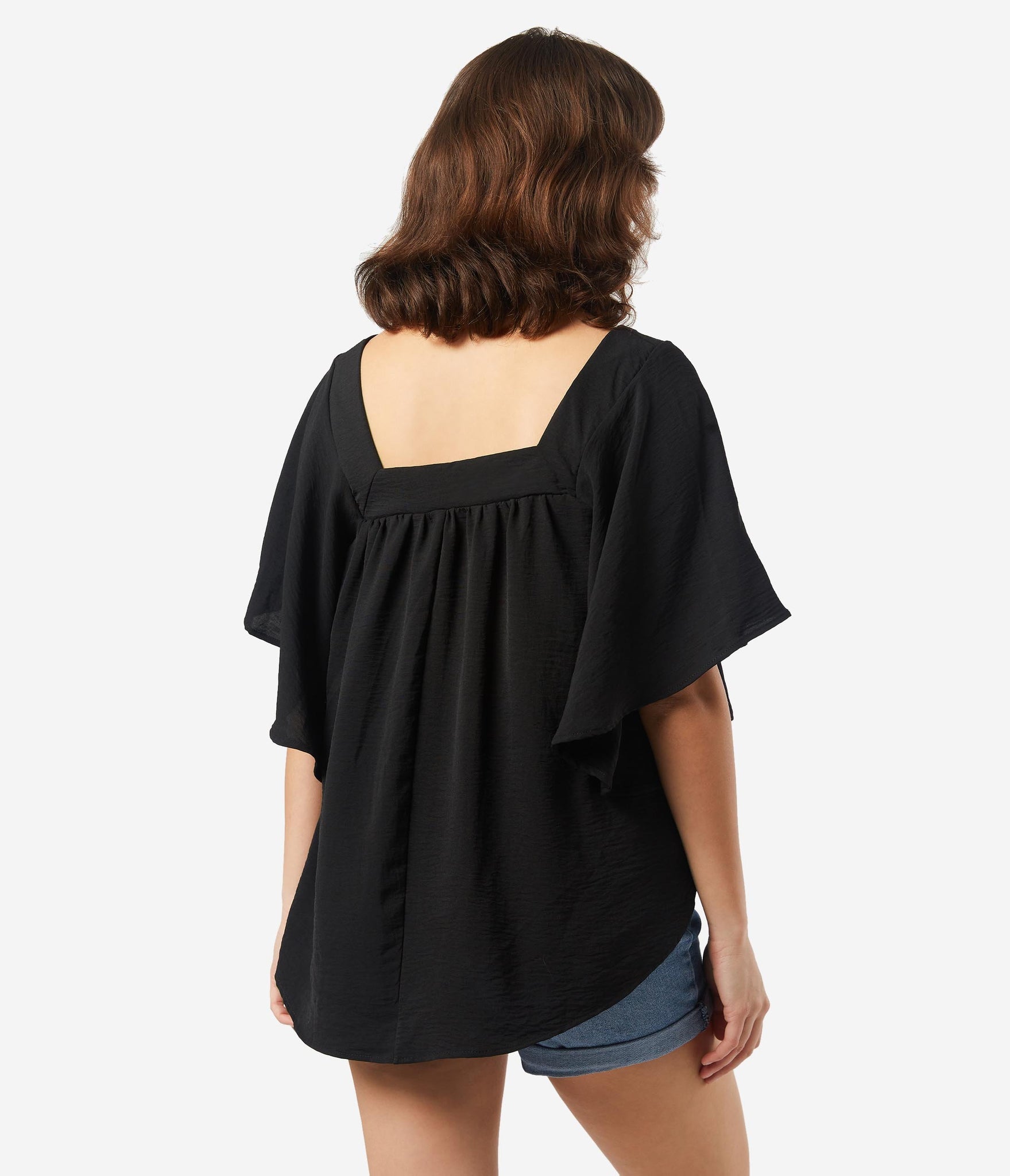 Boho chic! This fabulous casual blouse is crafted in solid black and features breezy butterfly sleeves. The square banded neckline tops the relaxed and flowing design, meant for a free spirit!