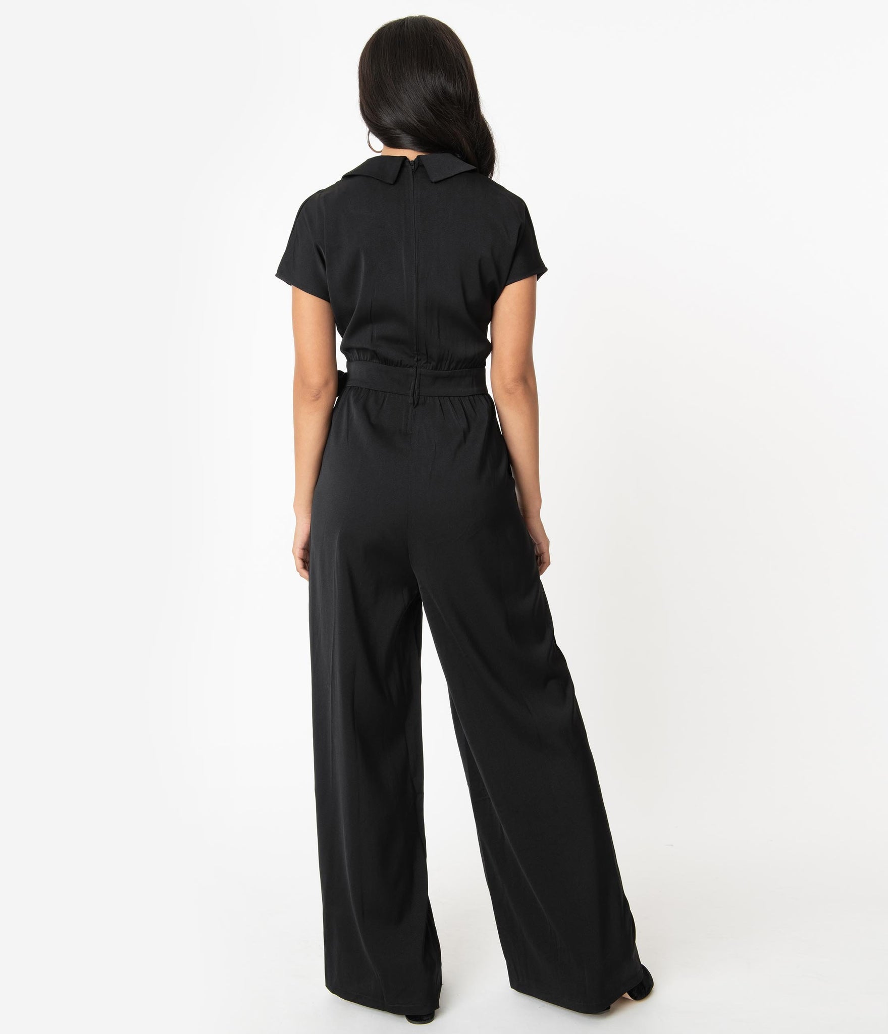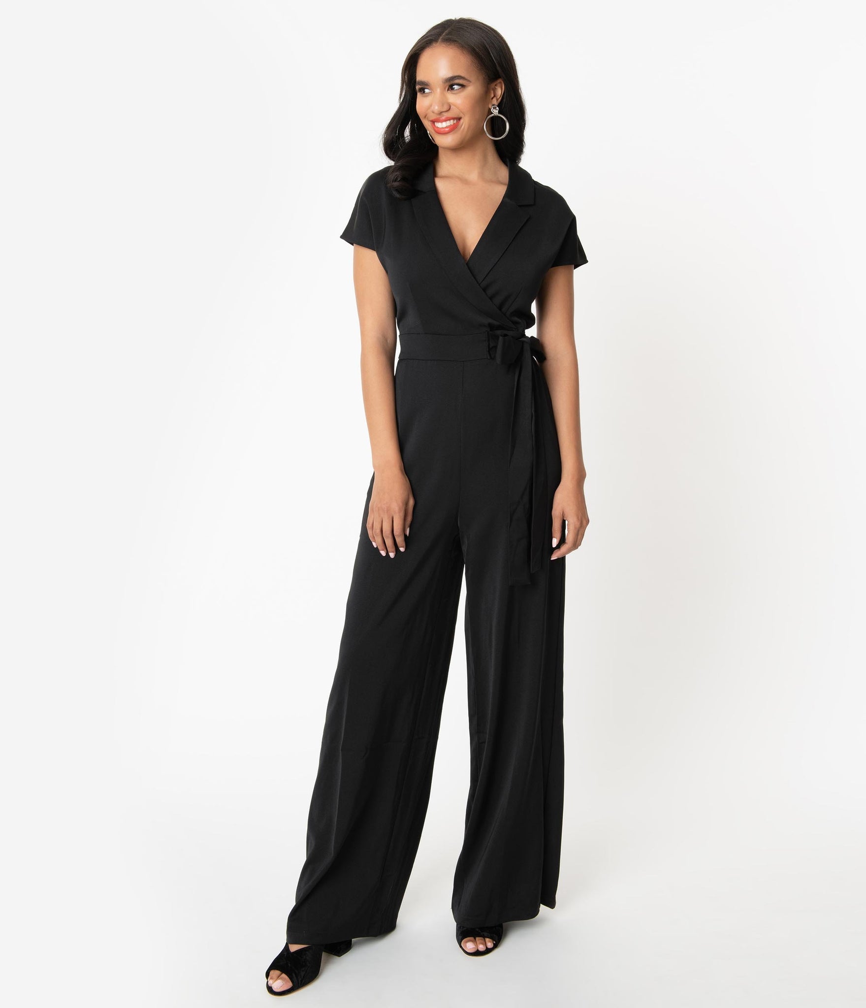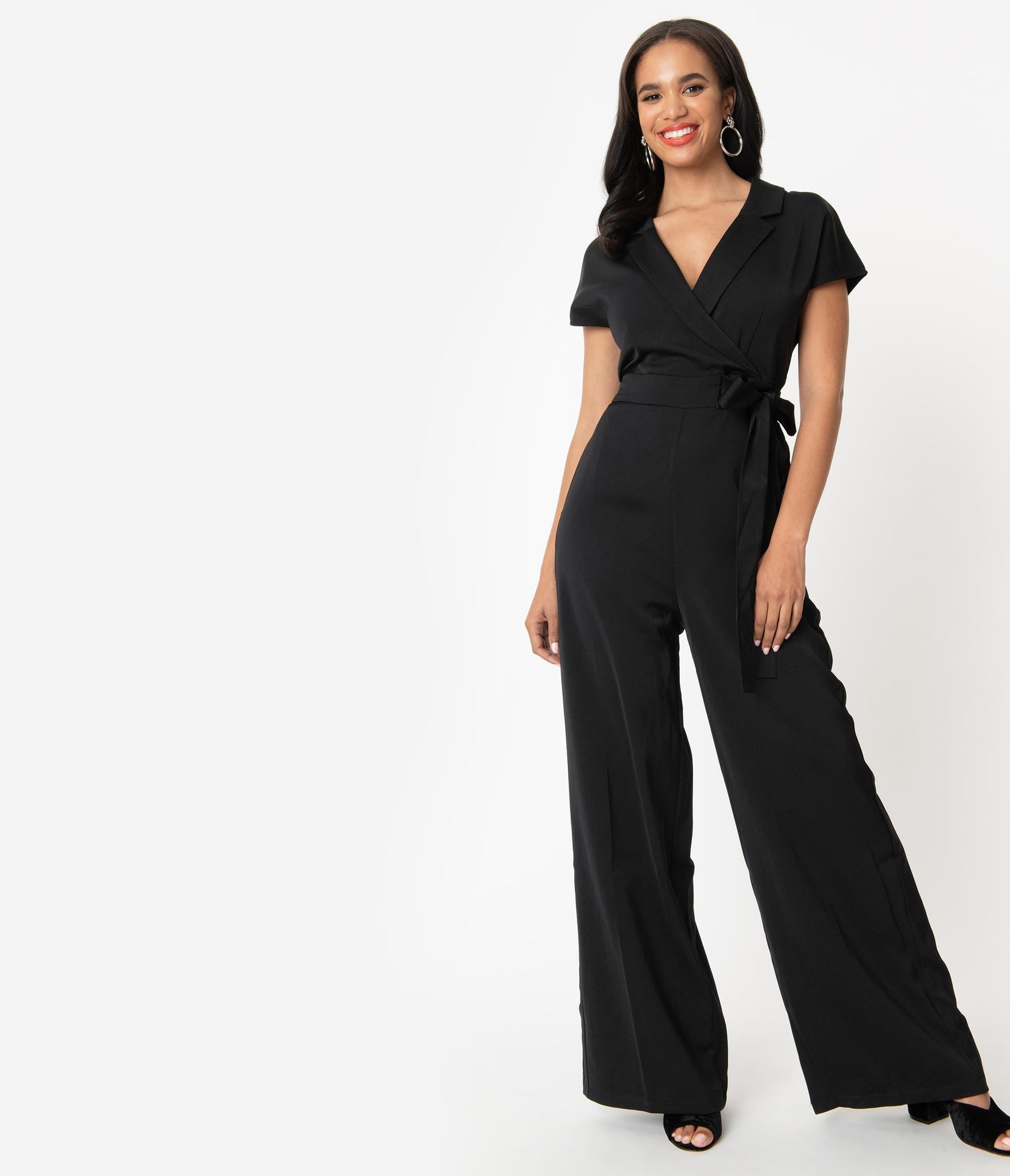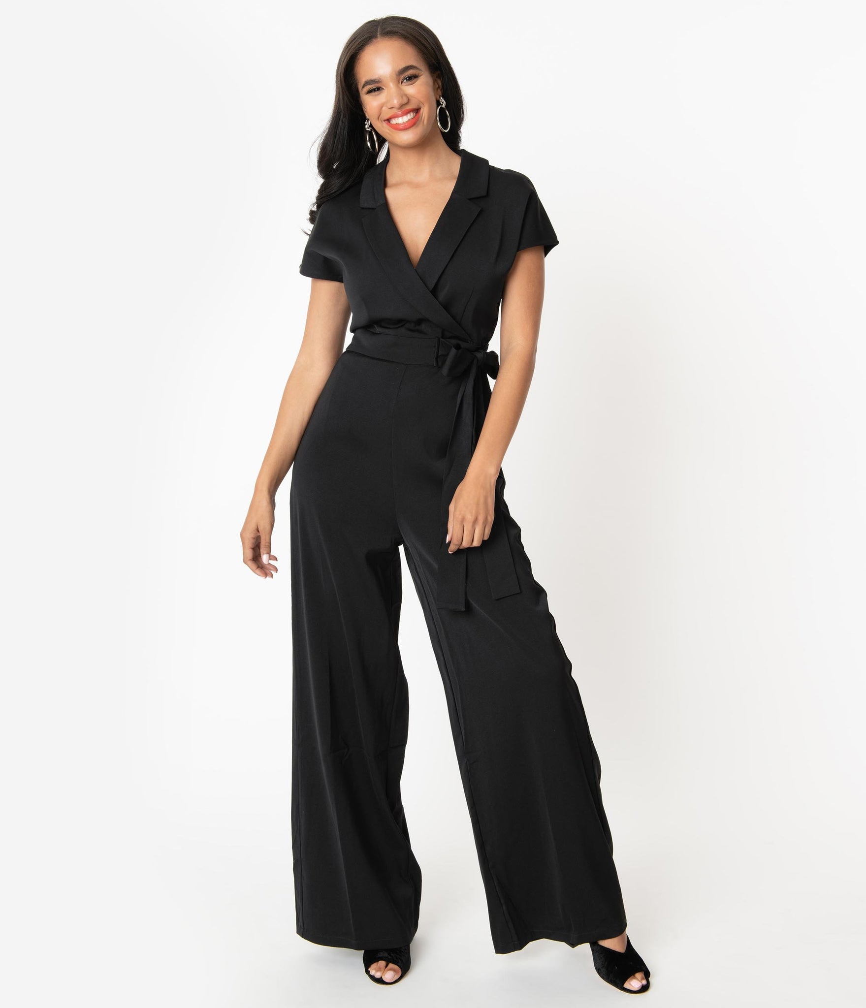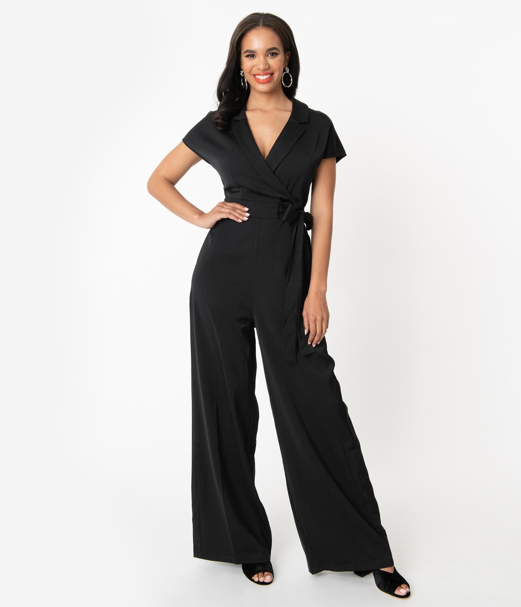 Dress how you want to be addressed, darling! An elegant jumpsuit full of vintage verve, this stunning black silhouette is crafted in a sturdy woven blend for a jaw-dropping design. The sexy surplice neckline is highlighted in a notched lapel while the dolman cap sleeves keep you comfortable through any special occasion. The darted bodice drops into a banded waist, accented with a self tie bow on the hip, and breathtaking wide legs that maintain those retro vibes. Outfitted with side pockets and a back zipper, finish what you started!