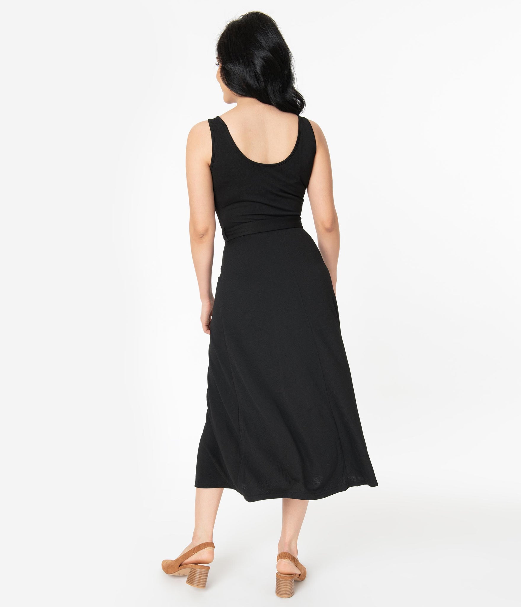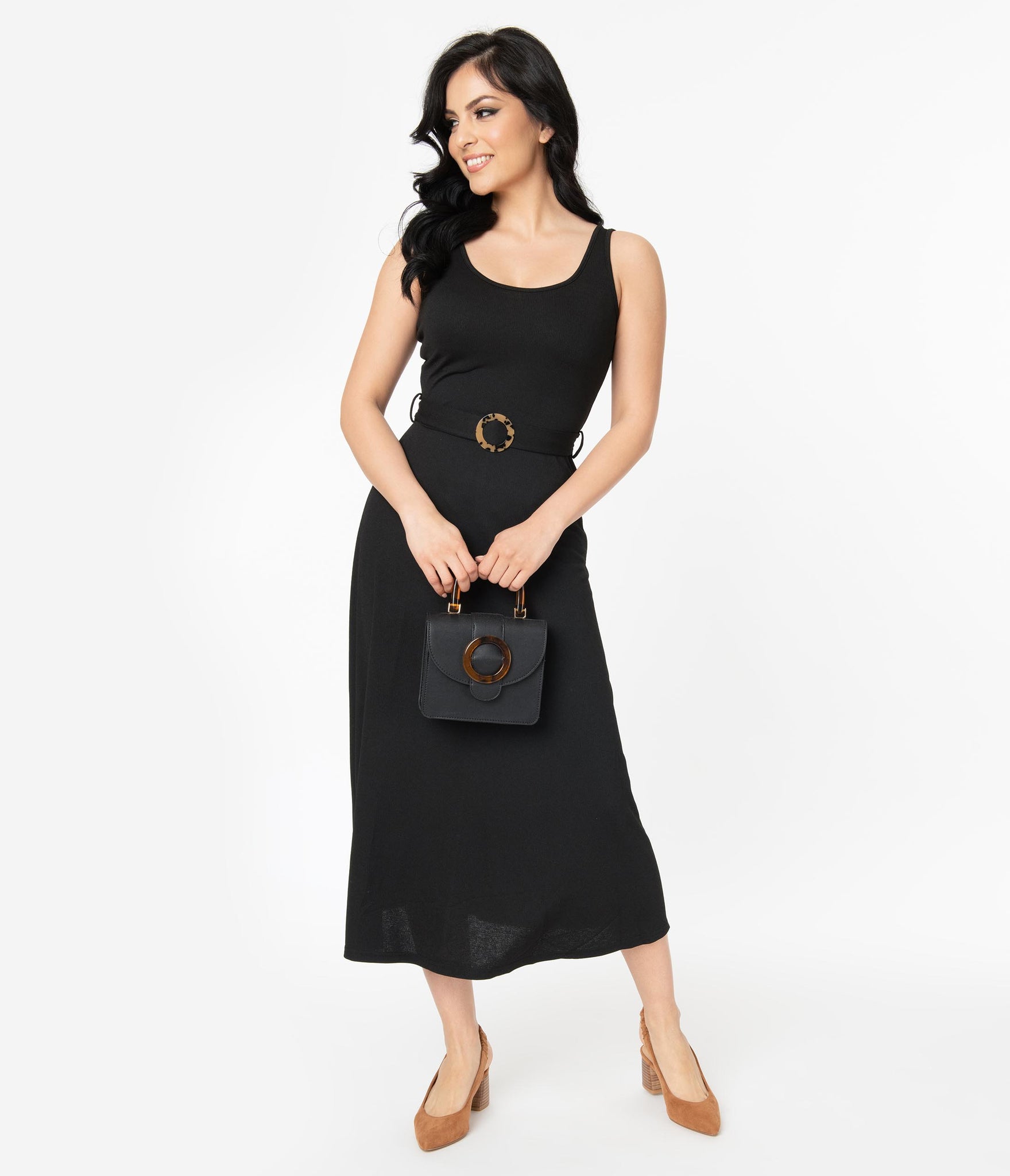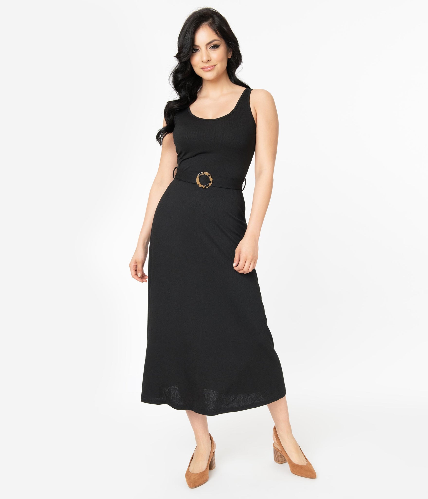 Style and comfort, darling! This rich black midi dress is cast in a thick stretch material perfect for that transition between seasons. A removable self-tie belt is finished with a light tortoiseshell round belt buckle to amp up this piece. This sultry midi length frock is balanced out with the sleeveless style and scoop neckline both back and front. Make a statement and hit the dance floor, babe!
