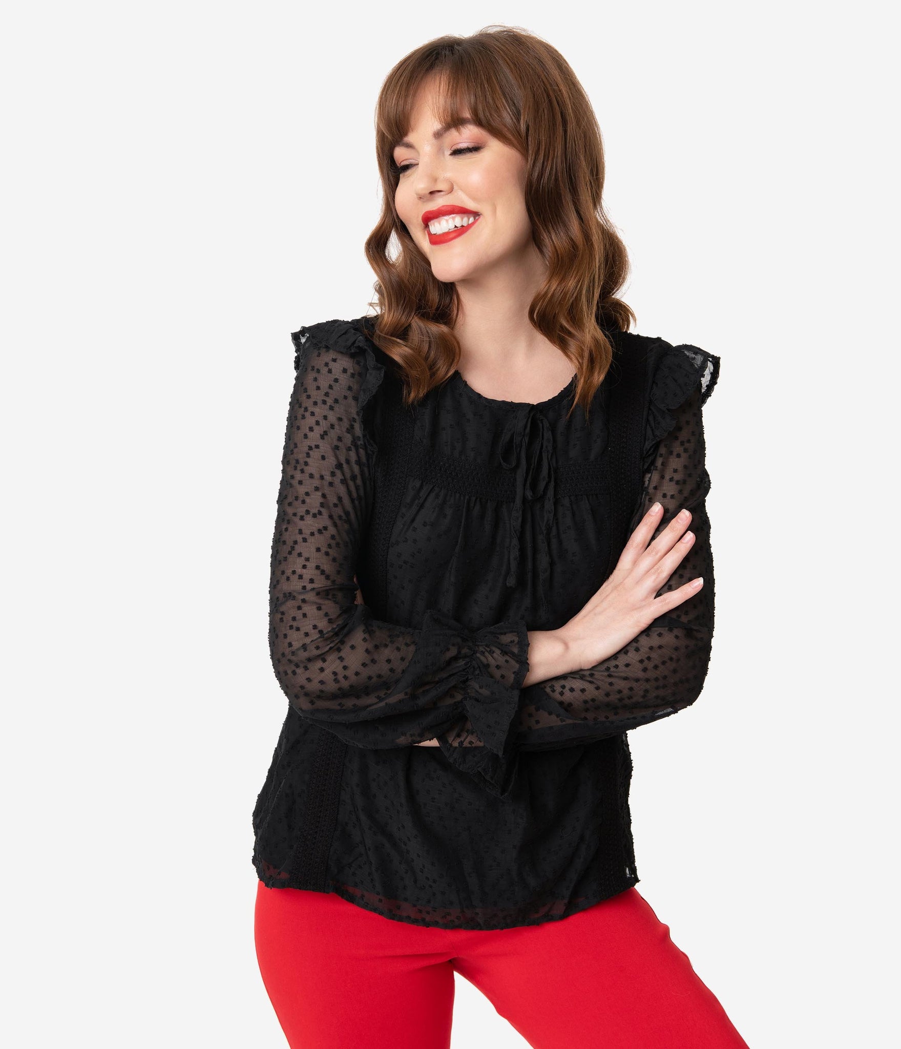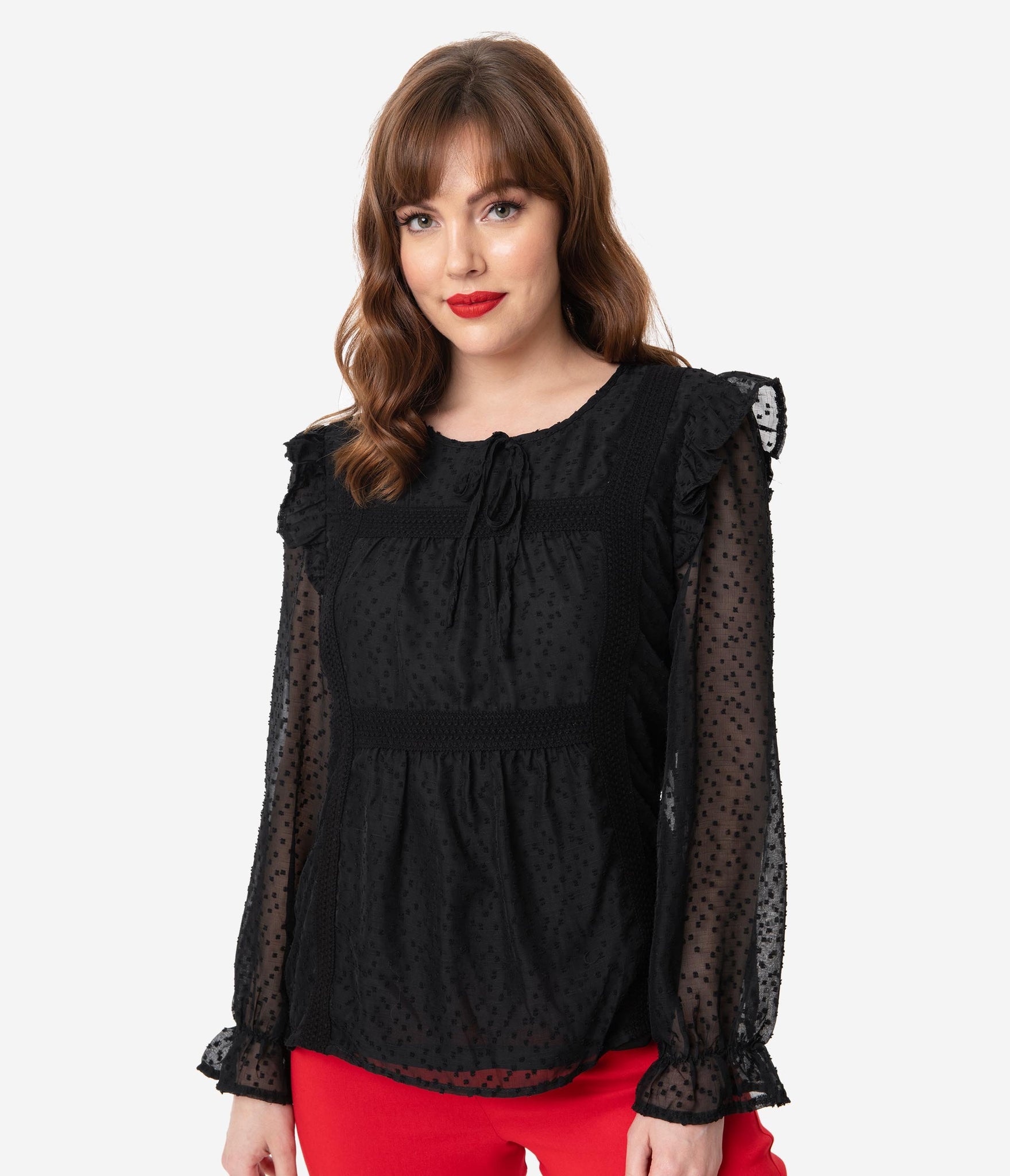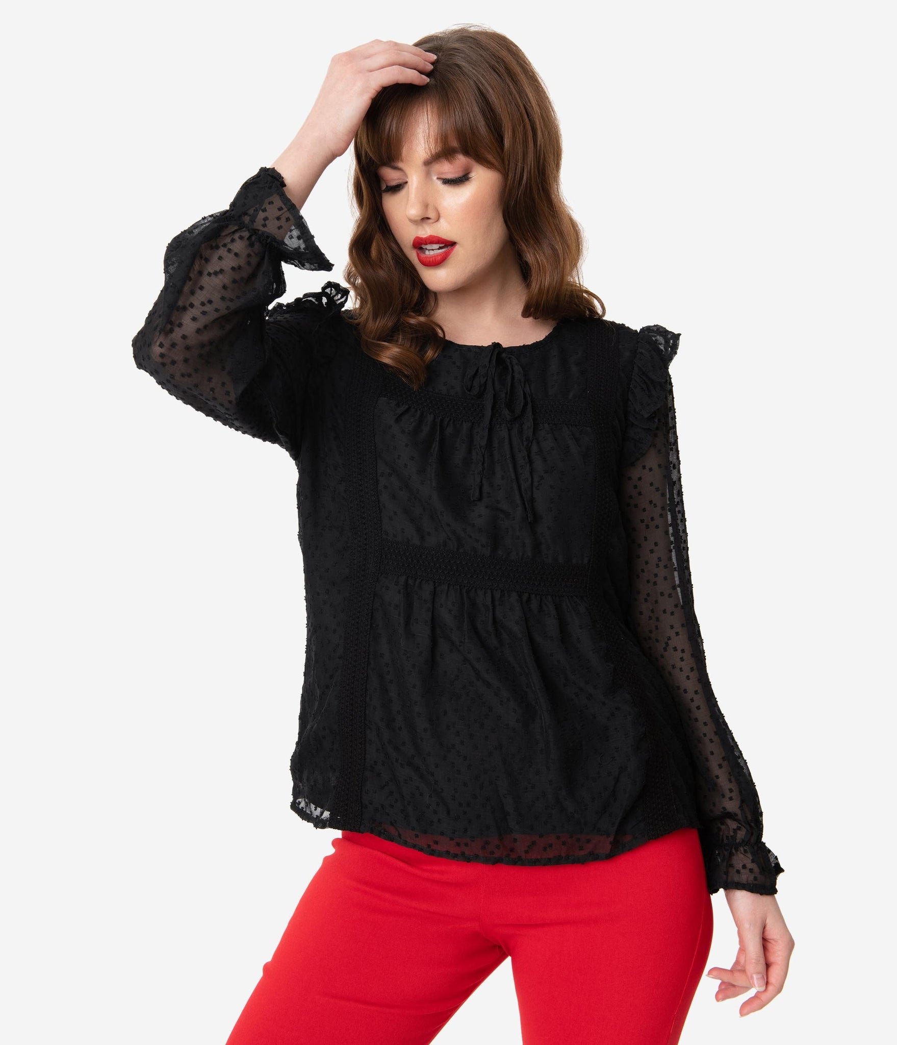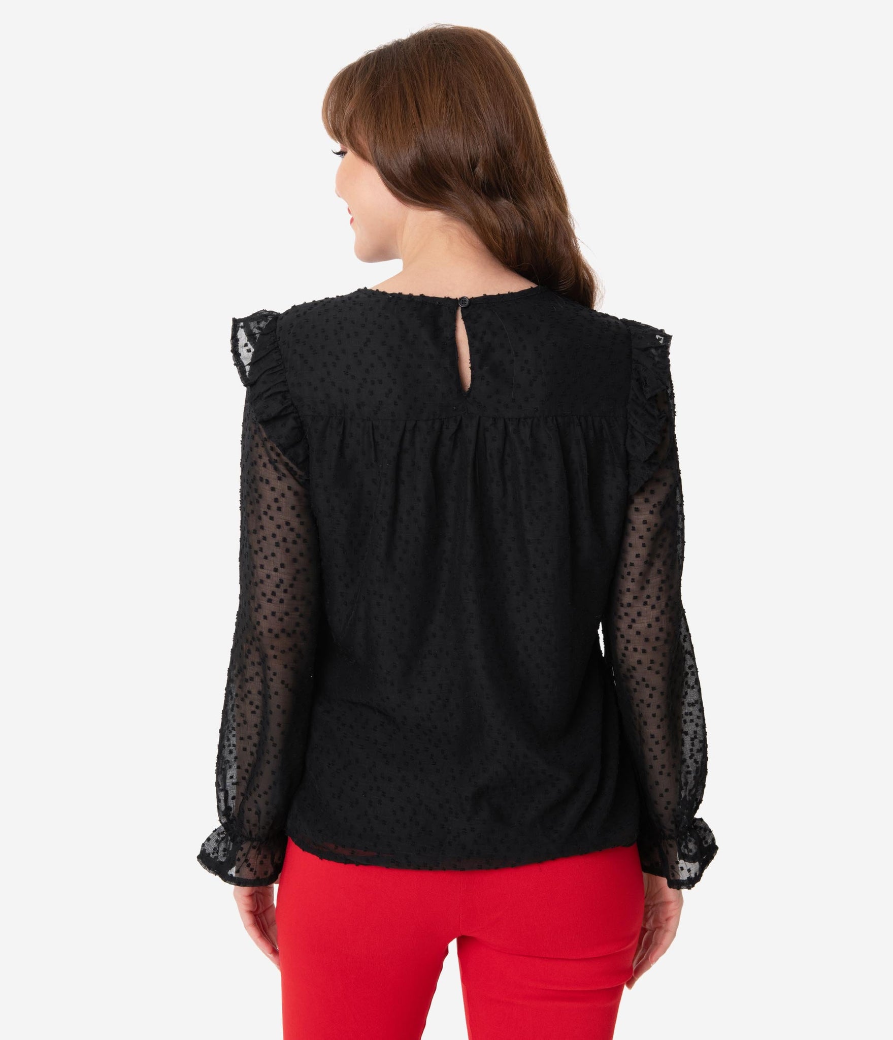 A retro stunner, gals! This gorgeous black separate is crafted in a lightweight, woven fabric for a breezy spirit. The Swiss dotted, sheer fabric overlays a semi-sheer knit lining while sweet embroidered accents provide vintage vibes. The scoop neckline is secured in the back with a button keyhole while the graceful long sleeves are embellished with shoulder ruffles and drop into an elastic cuff. Complete with a back yoke, make them lightheaded!