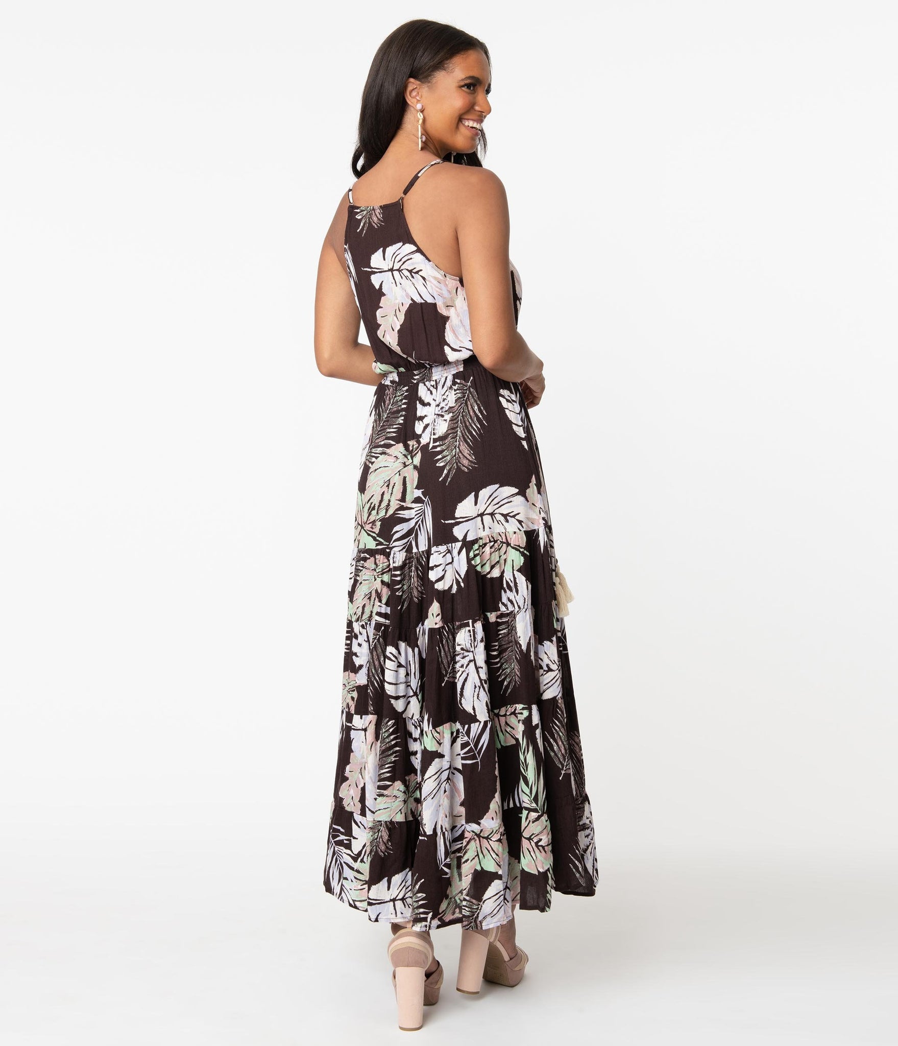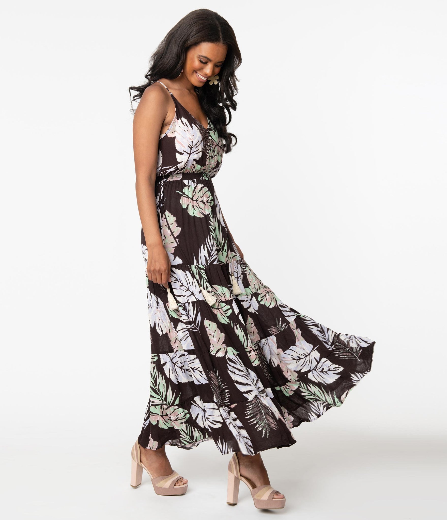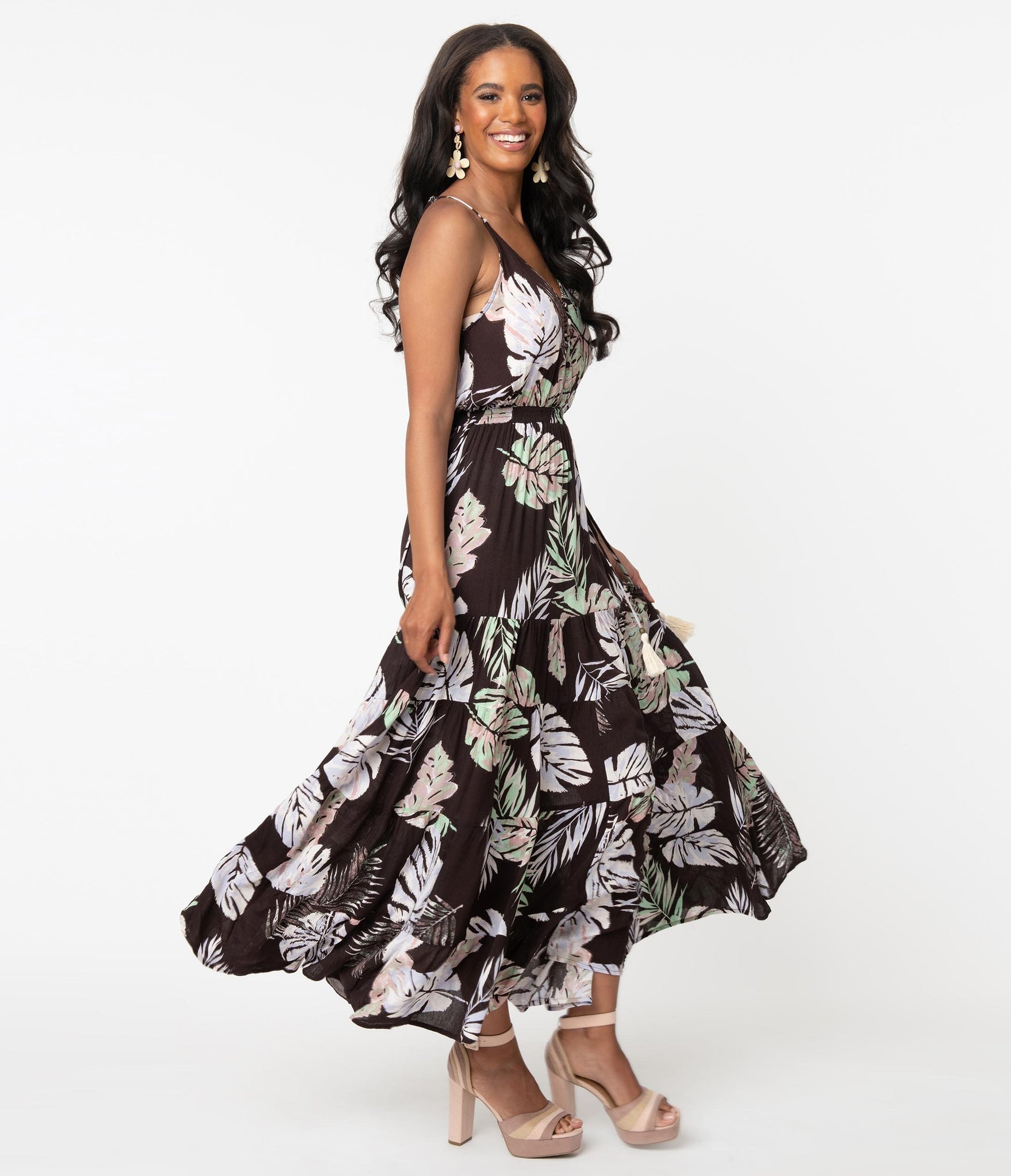 Ramp up the tropical vibes, gals! Boasting a gorgeous purple, green, and ivory tropical palm leaf print throughout the lightweight black backdrop, this sweeping summer frock is crafted in a soft woven fabric. The sultry V-neckline is secured with a button up bodice and adjustable spaghetti straps for a comfortable fit. The elastic banded waist cinched in your form while attached ties dance around your hips. Complete a tiered maxi skirt, it’s a perfect casual summer vibe!